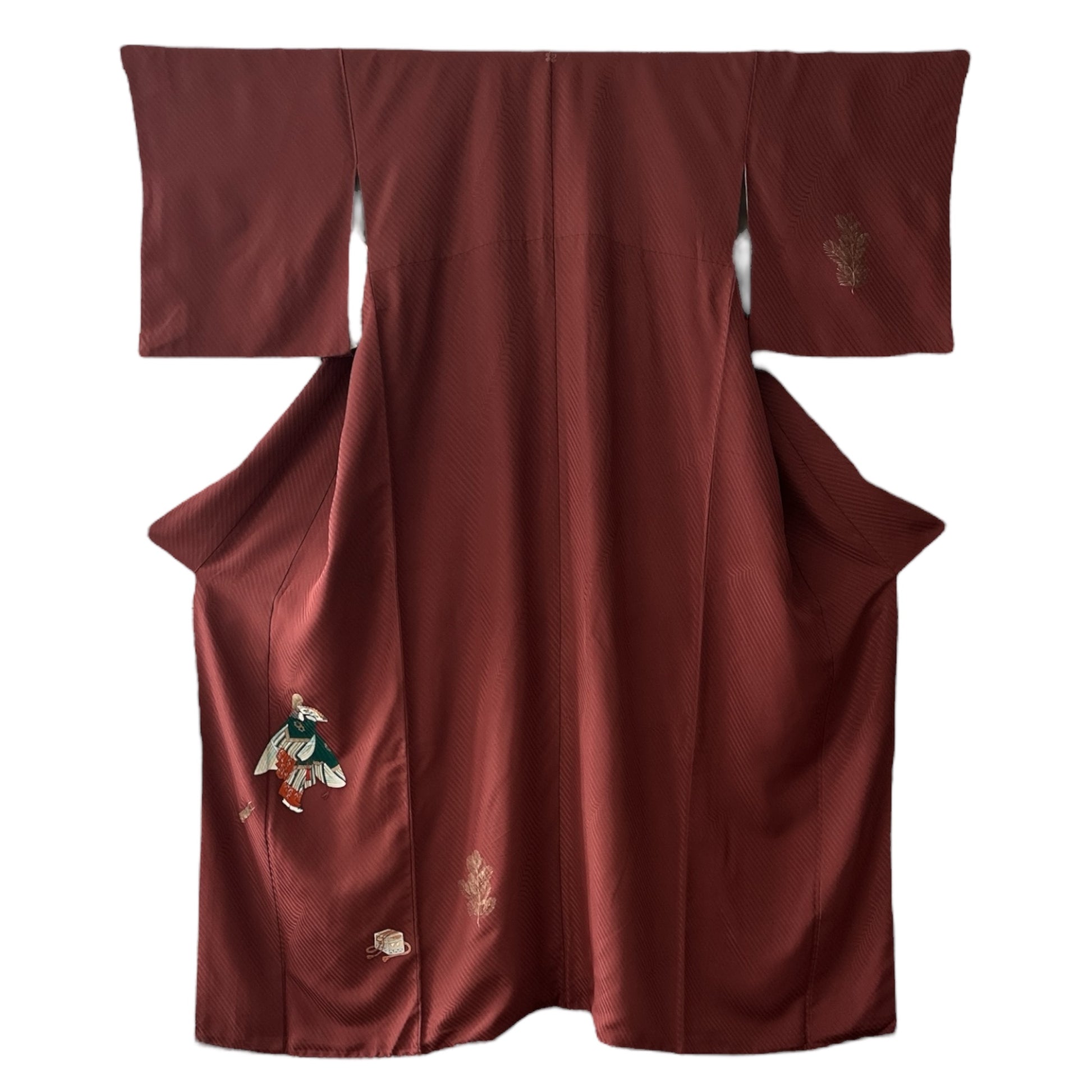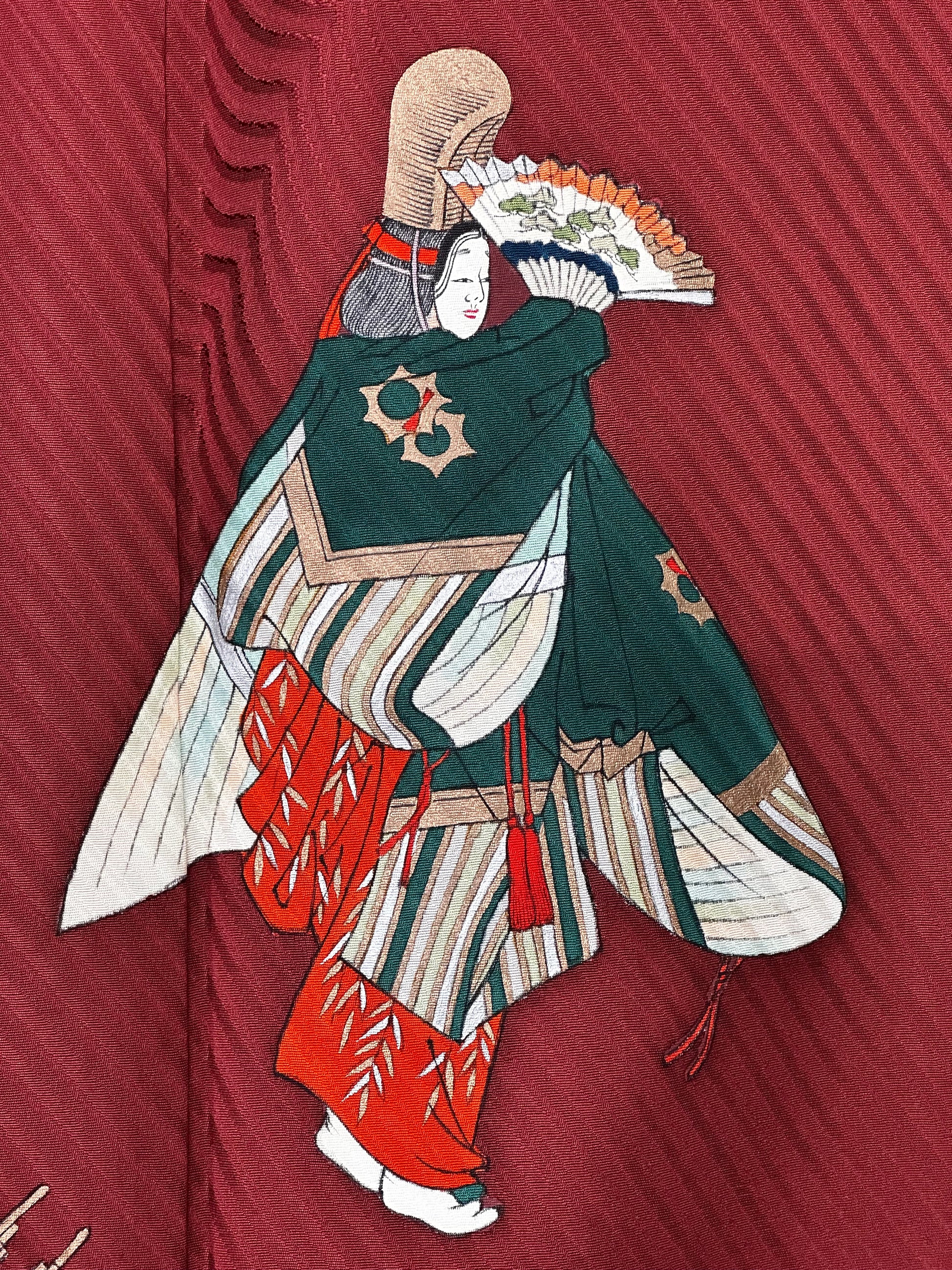 Kuvaus : Tässä tyylikkäässä tsukesage- kimonossa on hienostunut käsinmaalattu muotoilu, jossa on Noh-teatterin esiintyjä, käsirumpu ( tsuzumi ) ja tyylitelty männyn oksa, joka symboloi pitkäikäisyyttä ja kulttuuriperintöä. Huolellisesti sijoitettu taideteos lisää sen siroa vetovoimaa, joten se on hienostunut valinta puolimuodollisiin tilaisuuksiin.