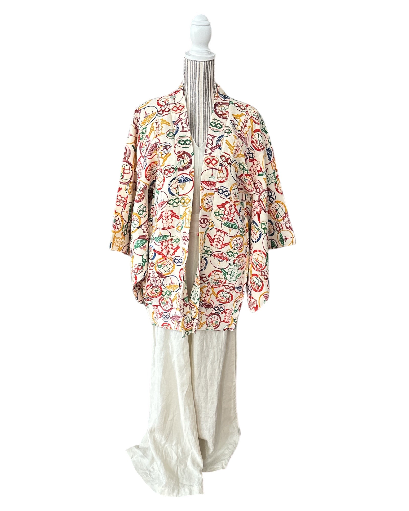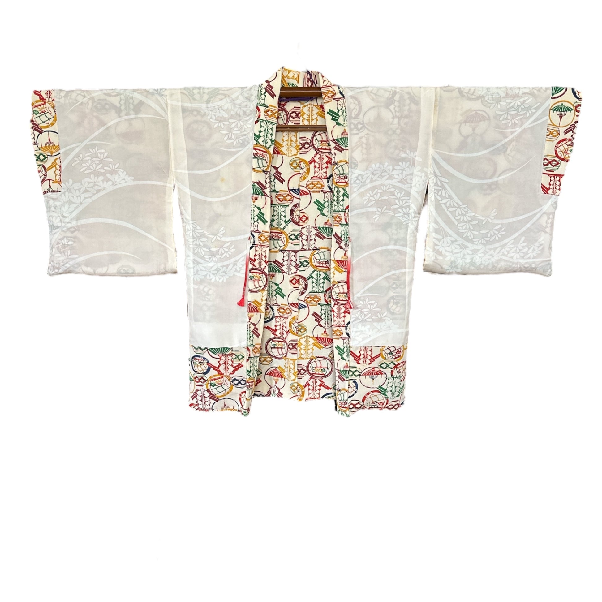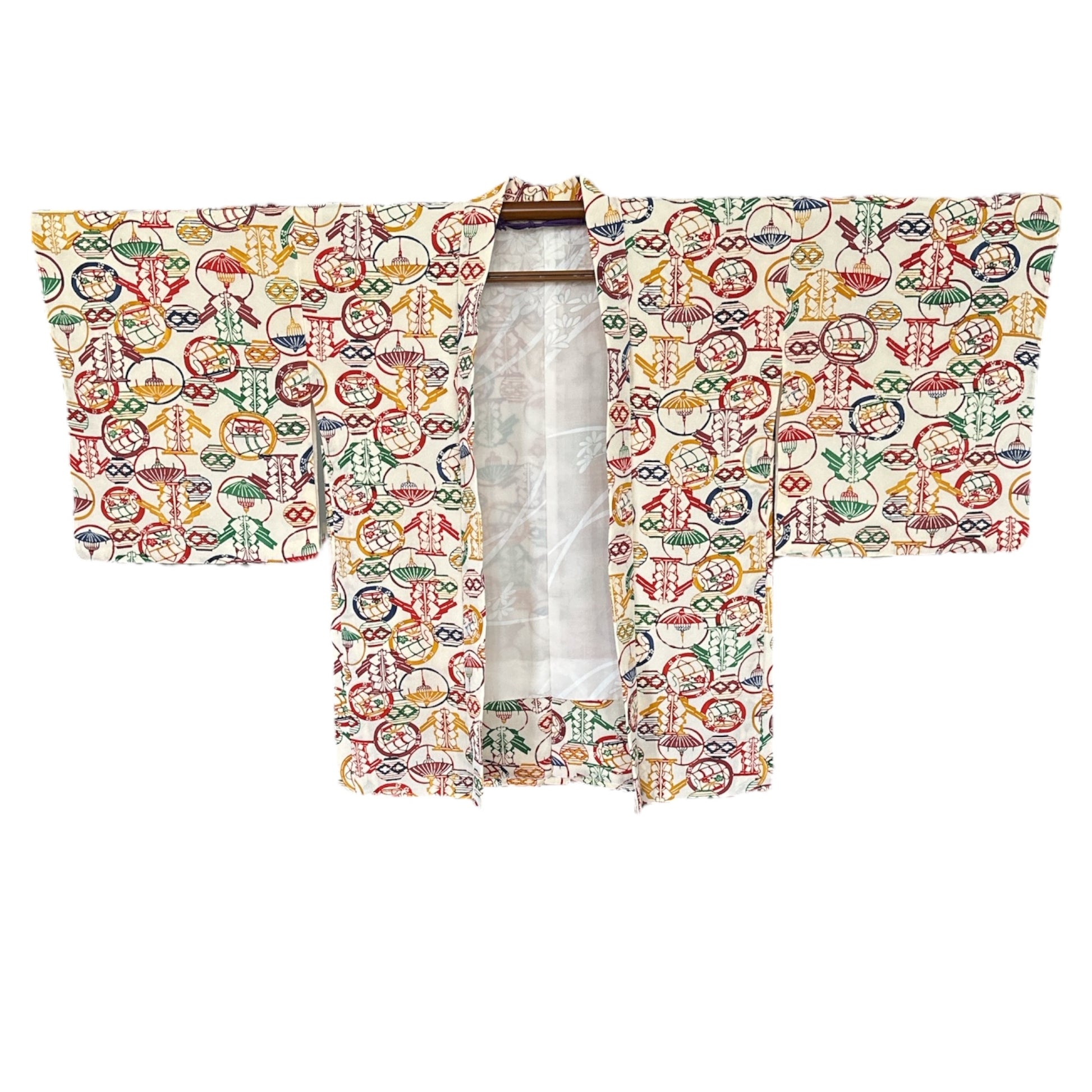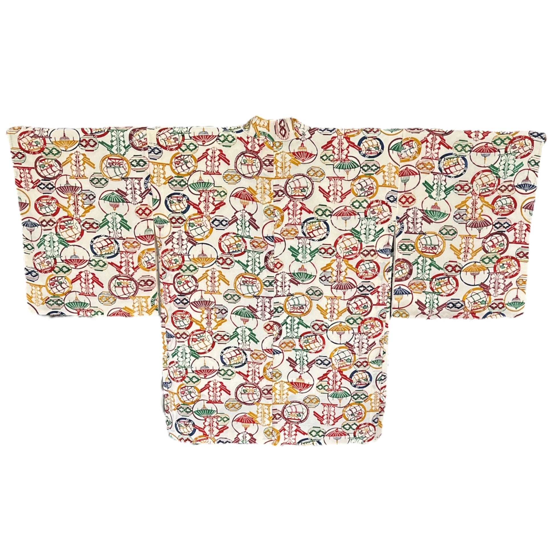Kuvaus: Tämä naisten haorissa on kirkas valkoinen pohja, jota koristaa eloisa, toistuva kuvio värikkäistä pyöreistä kuvioista, jotka esittelevät perinteisiä japanilaisia symboleja, kuten sateenvarjoja, tuulettimia, tsuzumi-rumpuja ja muita kulttuuriesineitä. Rohkeat ja eloisat punaisen, keltaisen, vihreän ja sinisen sävyt luovat leikkisän ja energisen muotoilun, joka on täydellinen lisäämään ripauksen hauskuutta ja perinteitä mihin tahansa asuun.