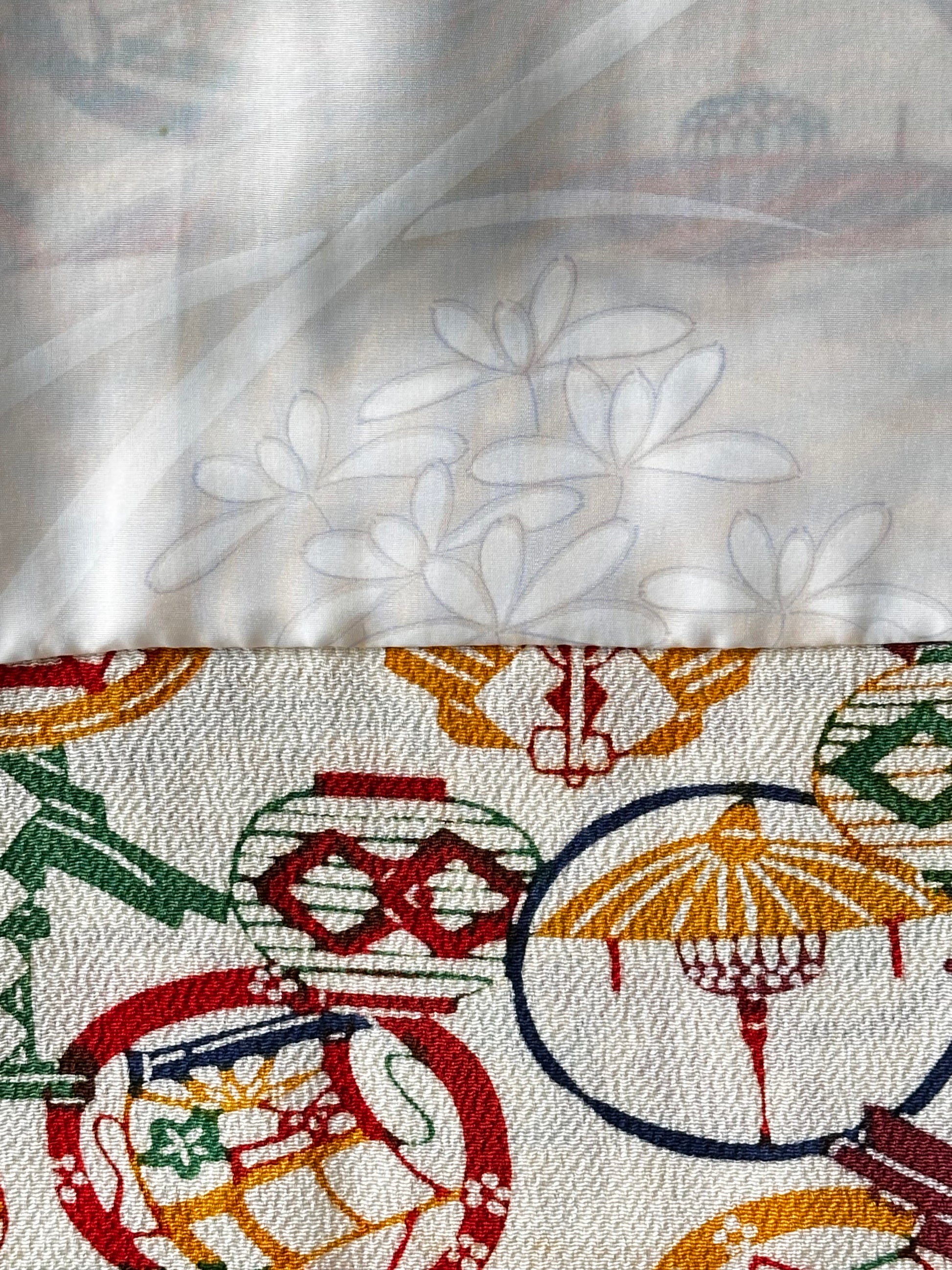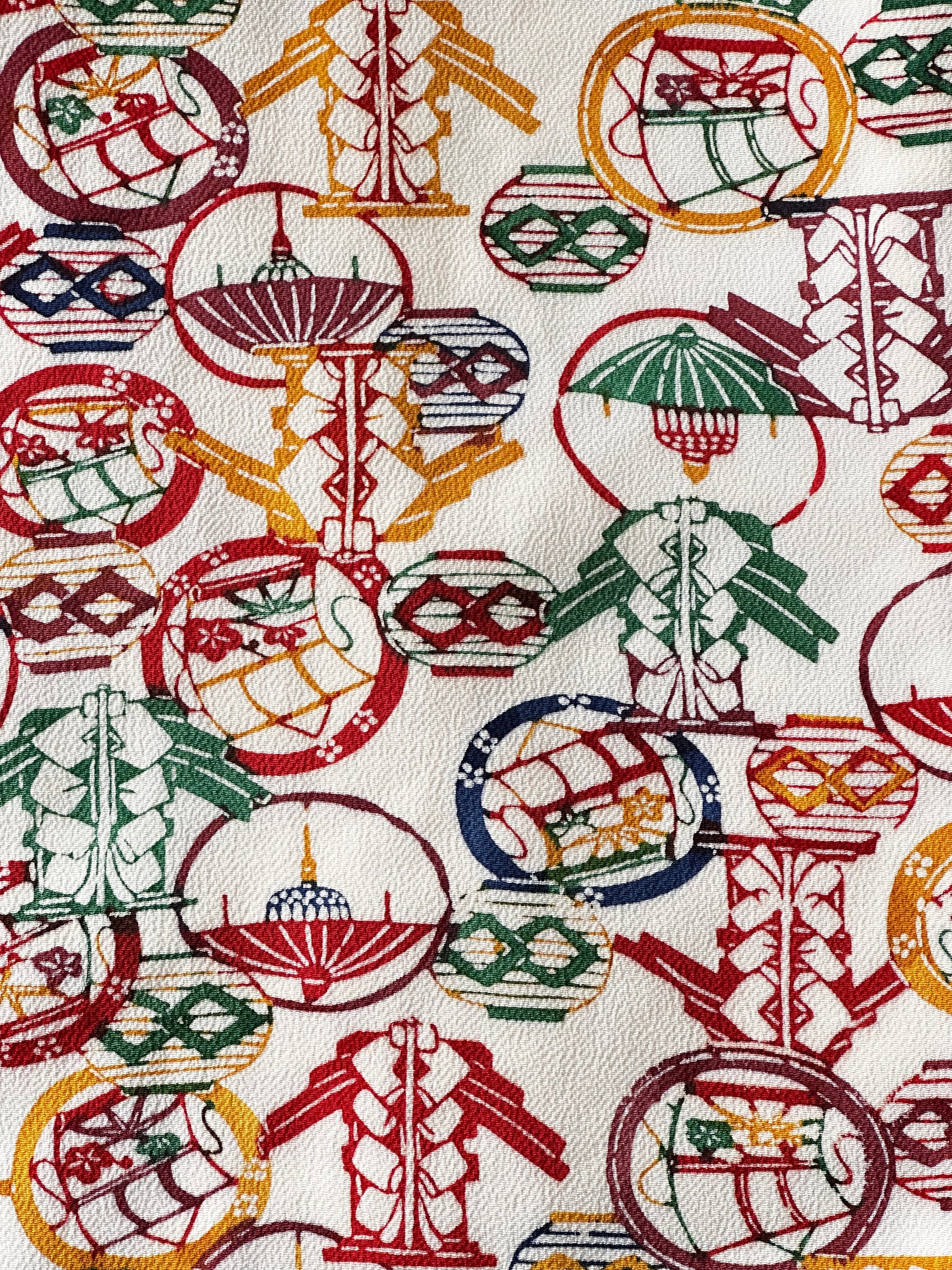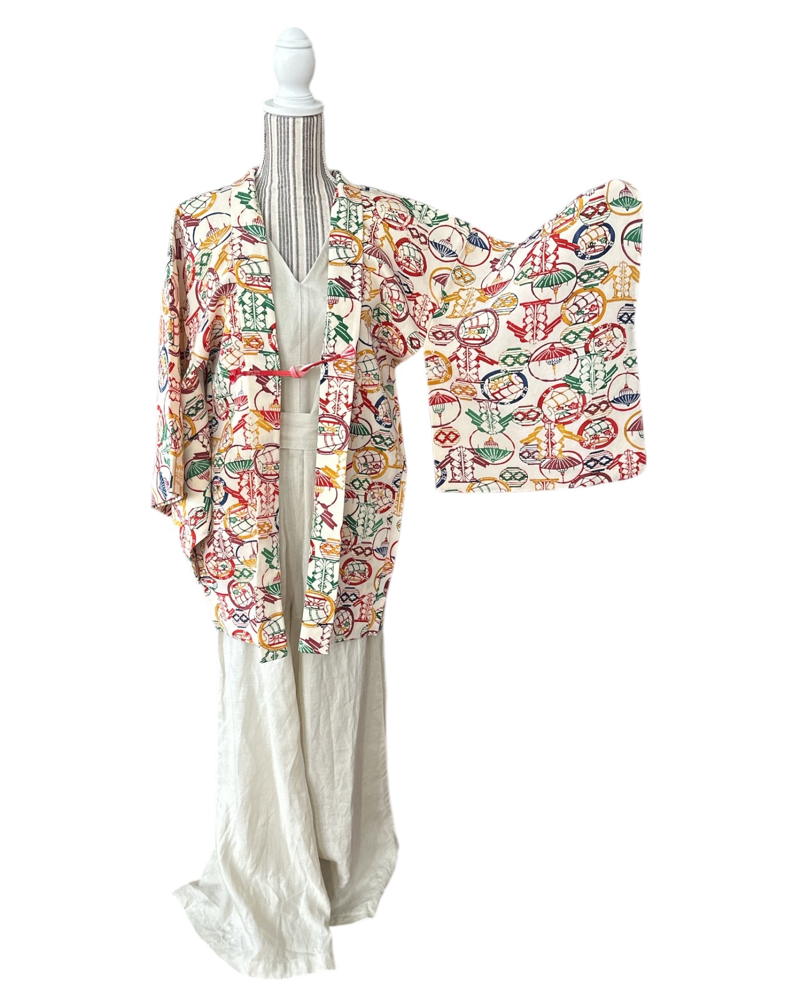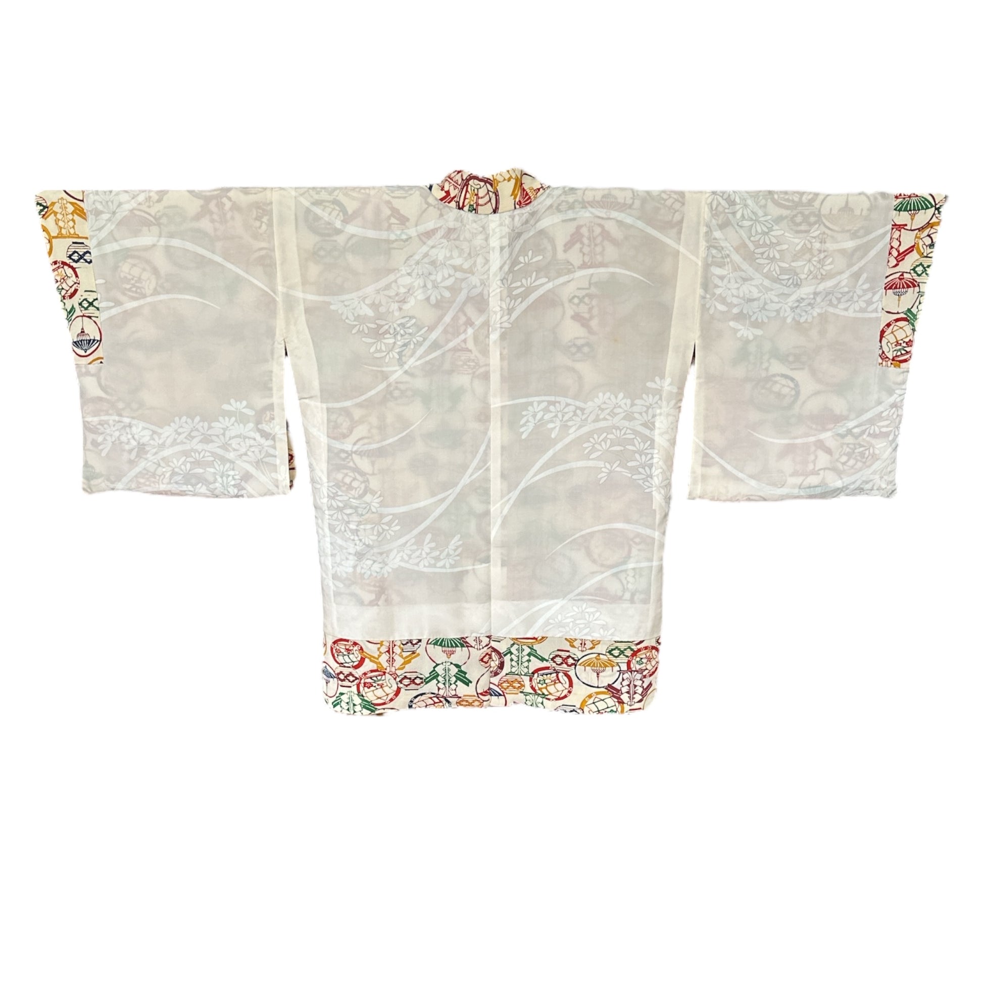 Kuvaus: Tämä naisten haorissa on kirkas valkoinen pohja, jota koristaa eloisa, toistuva kuvio värikkäistä pyöreistä kuvioista, jotka esittelevät perinteisiä japanilaisia symboleja, kuten sateenvarjoja, tuulettimia, tsuzumi-rumpuja ja muita kulttuuriesineitä. Rohkeat ja eloisat punaisen, keltaisen, vihreän ja sinisen sävyt luovat leikkisän ja energisen muotoilun, joka on täydellinen lisäämään ripauksen hauskuutta ja perinteitä mihin tahansa asuun.