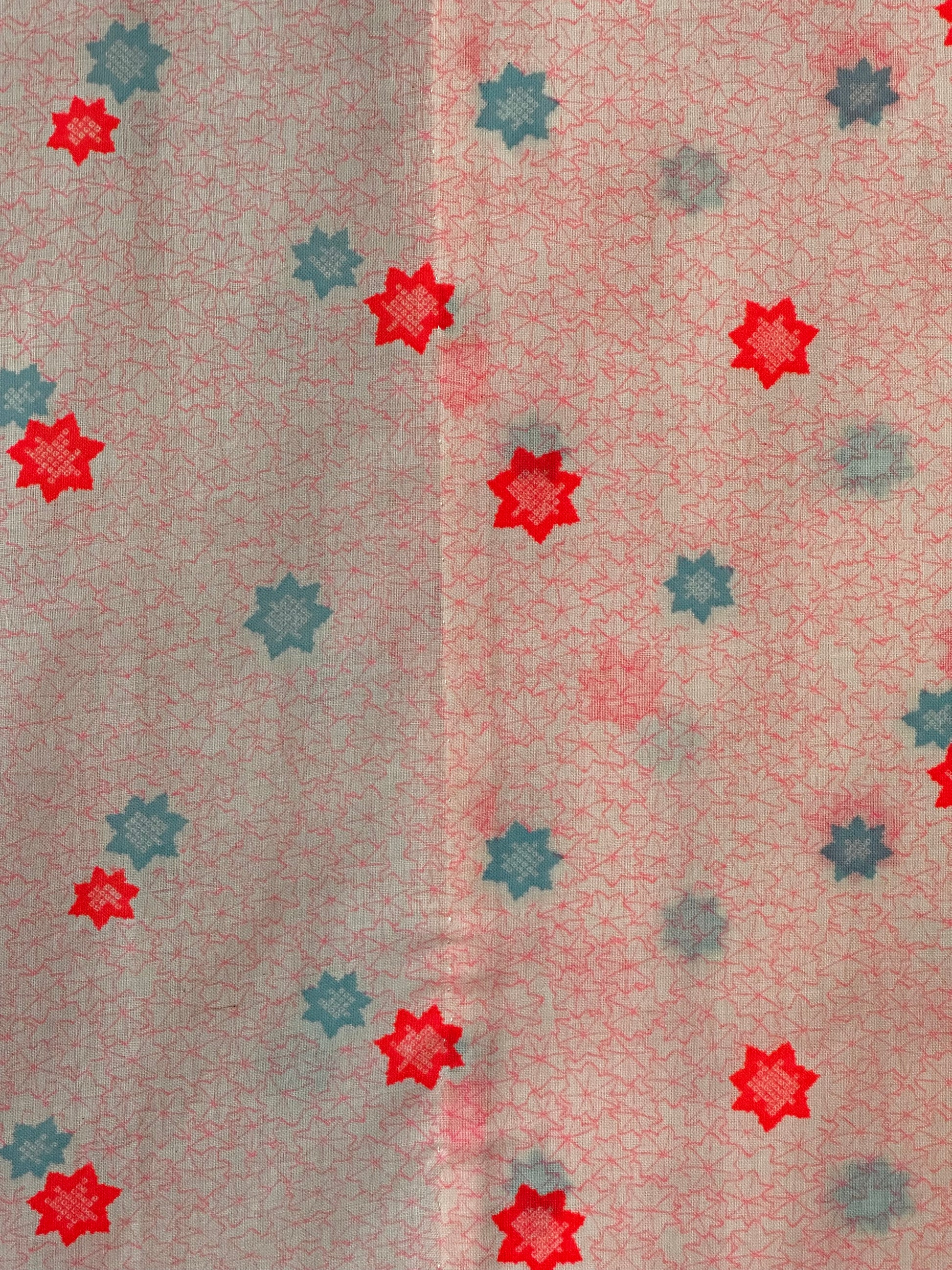 Kangas : Pehmeää, hengittävää puuvillaa, jossa on elävä vaaleanpunainen pohjaväri ja syvä momiji (vaahteranlehti) komon-kuvio rikkaissa syksyisissä sävyissä.