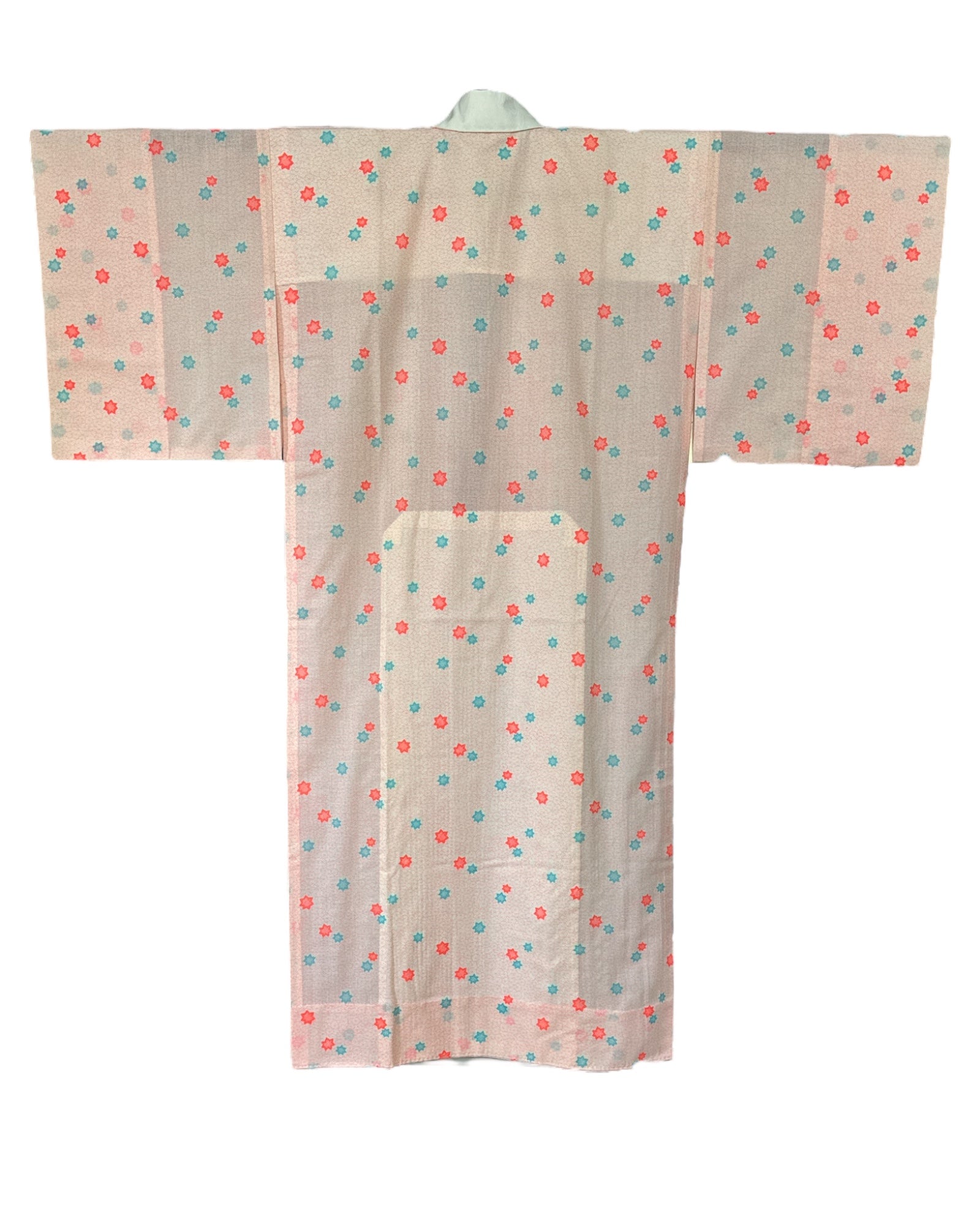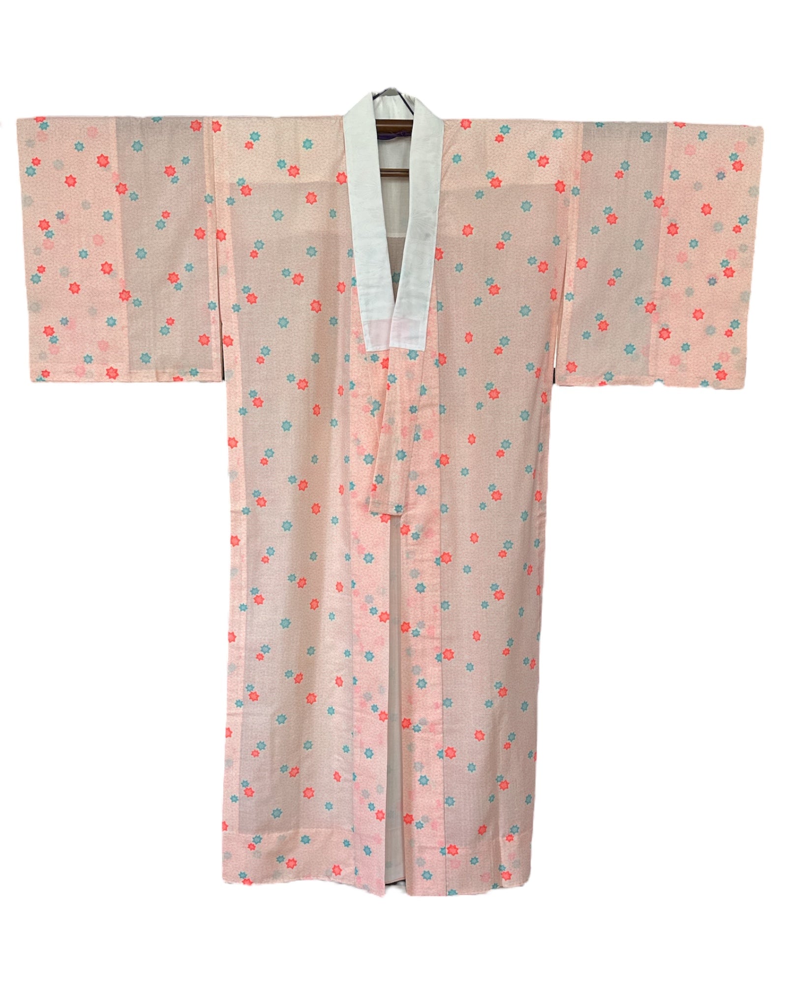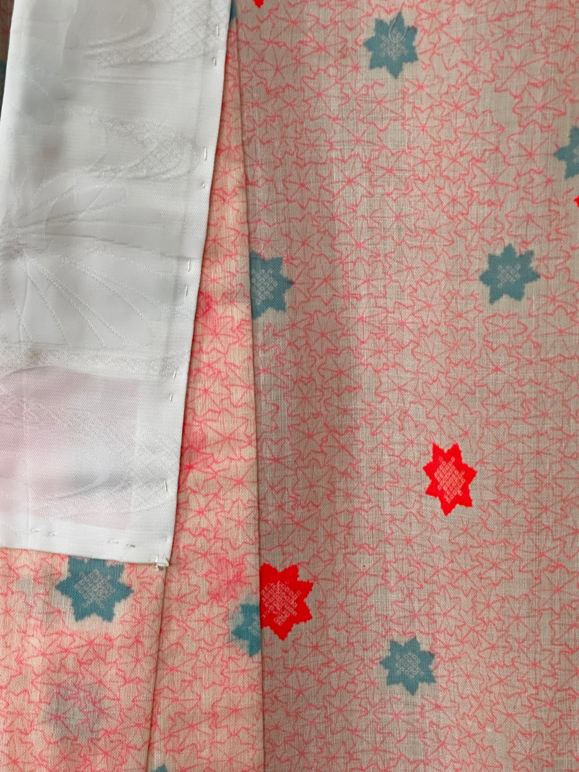 Kuvaus : Tämä viehättävä naisten nagajuban on täydellinen sekoitus perinteistä eleganssia ja modernia käytännöllisyyttä, ihanteellinen kitsukeen . Valmistettu pehmeästä, hengittävästä puuvillasta, se esittelee kirkkaan vaaleanpunaisen perusvärin, joka huokuu lämpöä ja eloisuutta. Kangasta koristaa upea syvänpunaisen ja oranssin momijin (vaahteranlehtien) komon-kuvio, joka vangitsee syksyn lehtien kauneuden ja symboloi ajan kulumista ja luonnollisia kiertokulkuja. Nämä monimutkaiset, moniväriset lehdet luovat täyteläisen, dynaamisen kontrastin pehmeää vaaleanpunaista taustaa vasten, mikä tekee tästä nagajubanista todellisen ilmeen.
