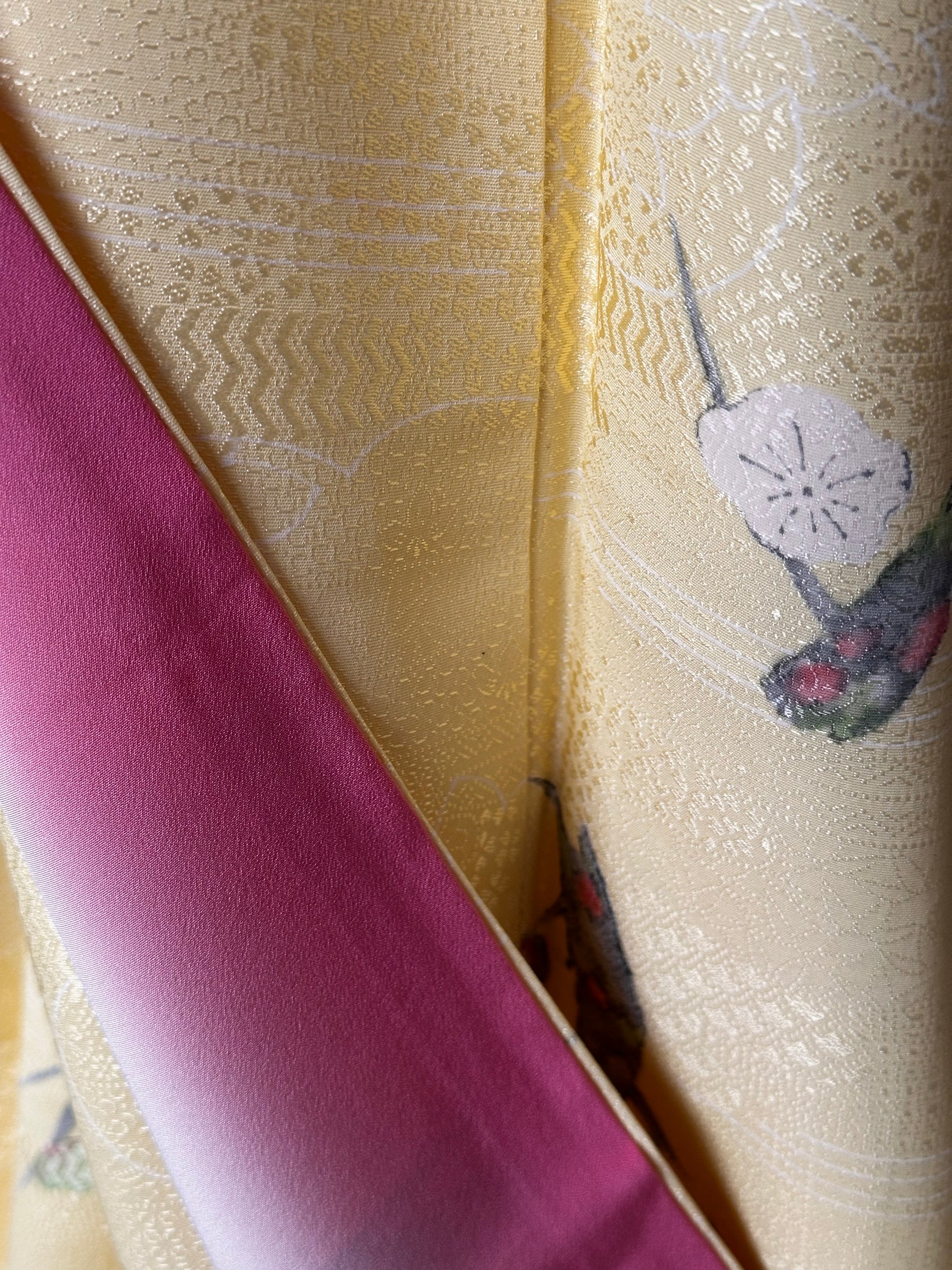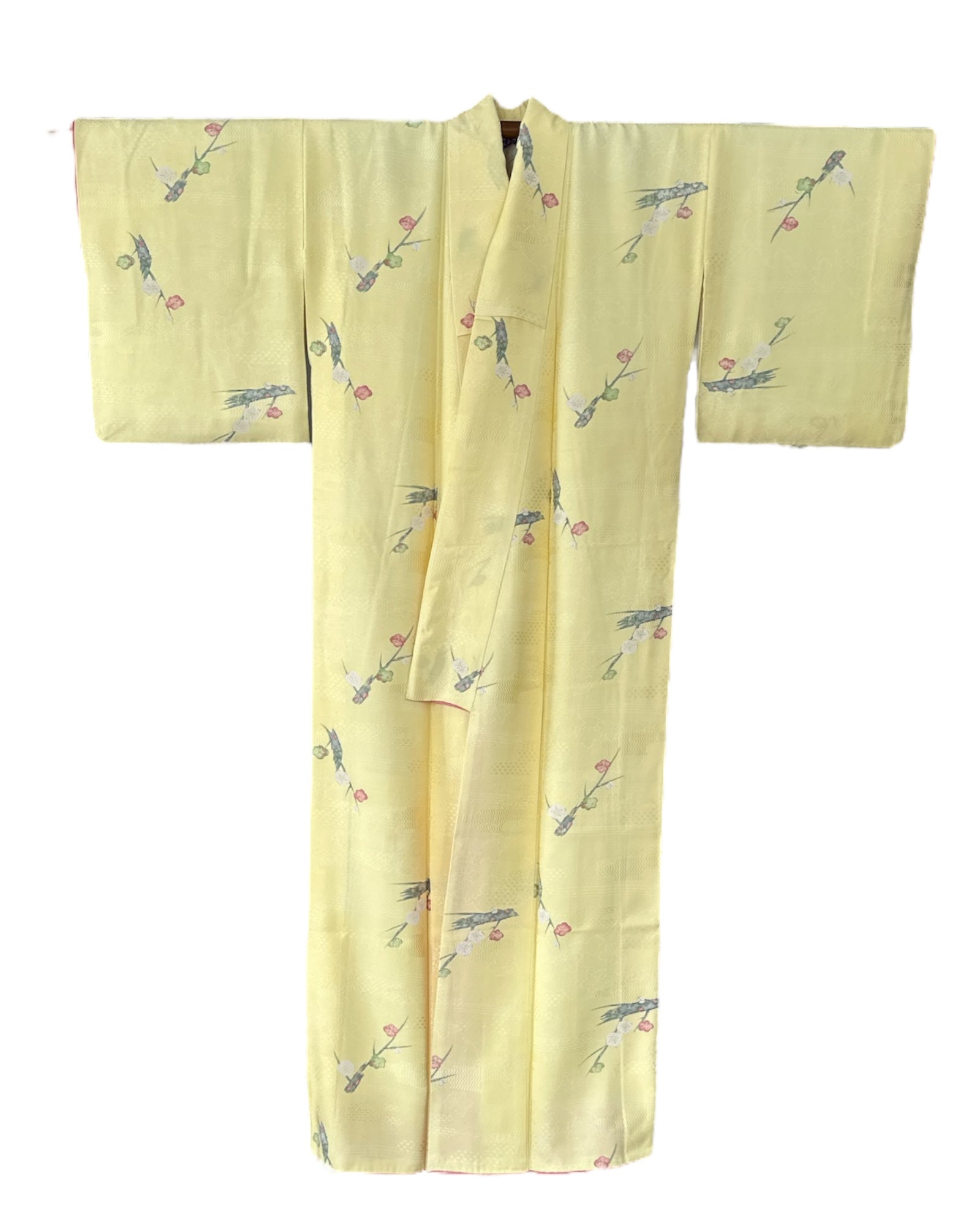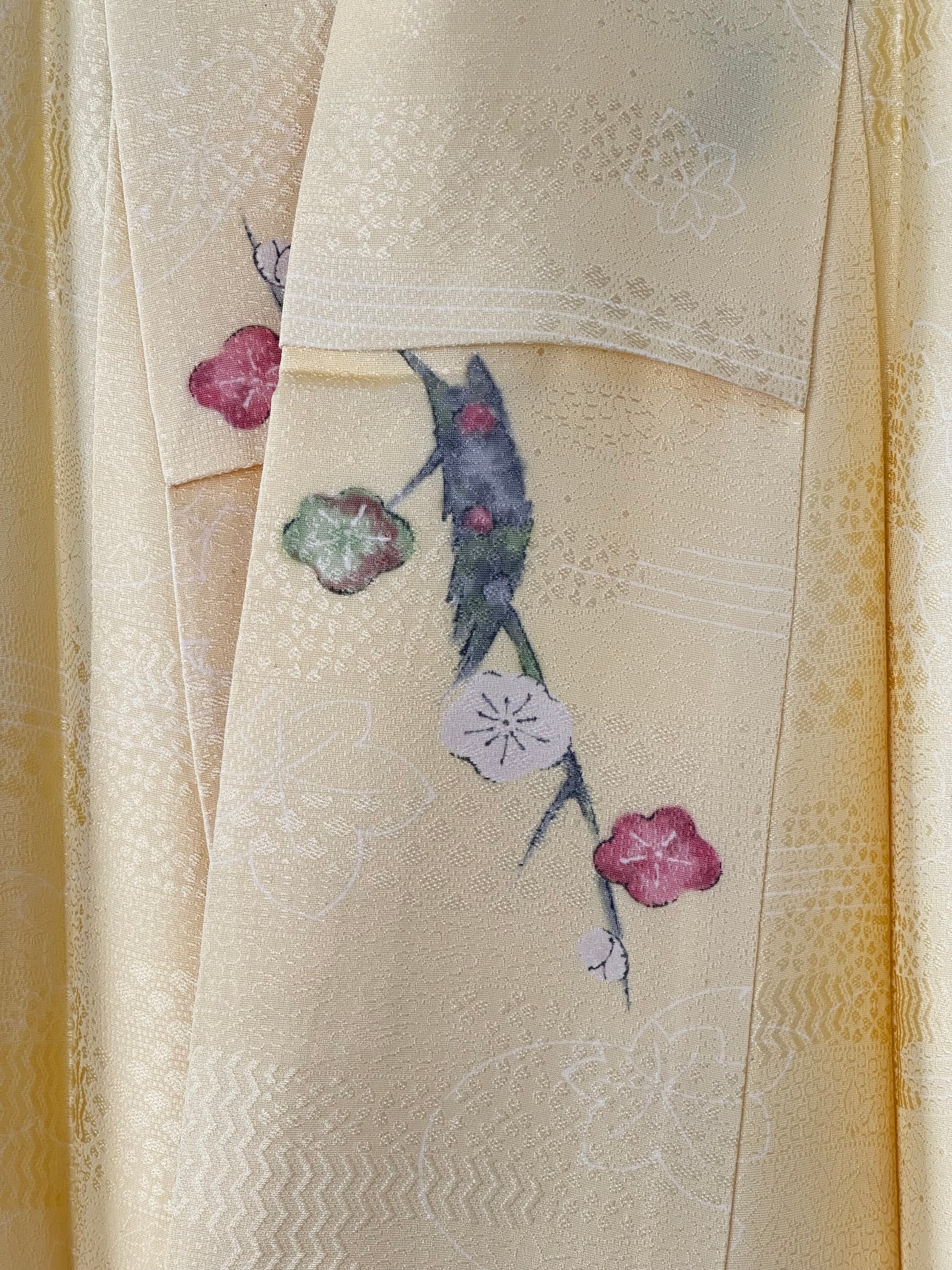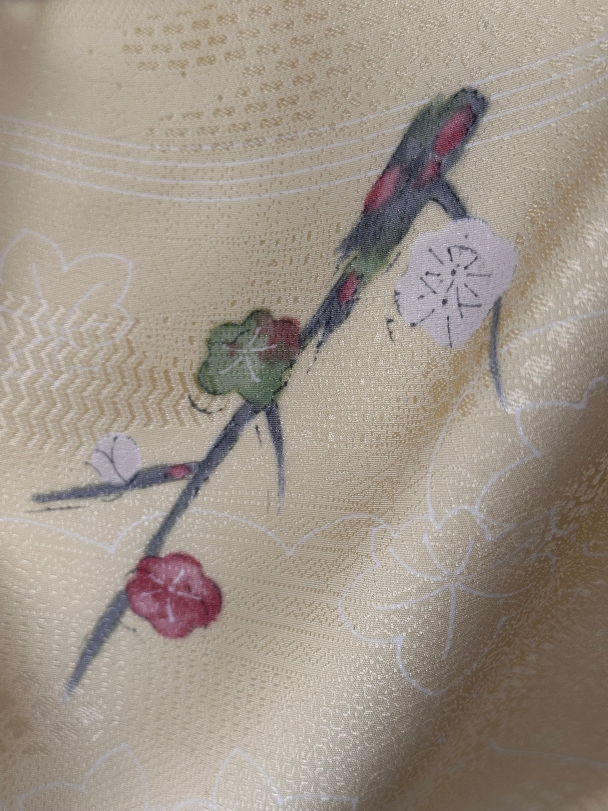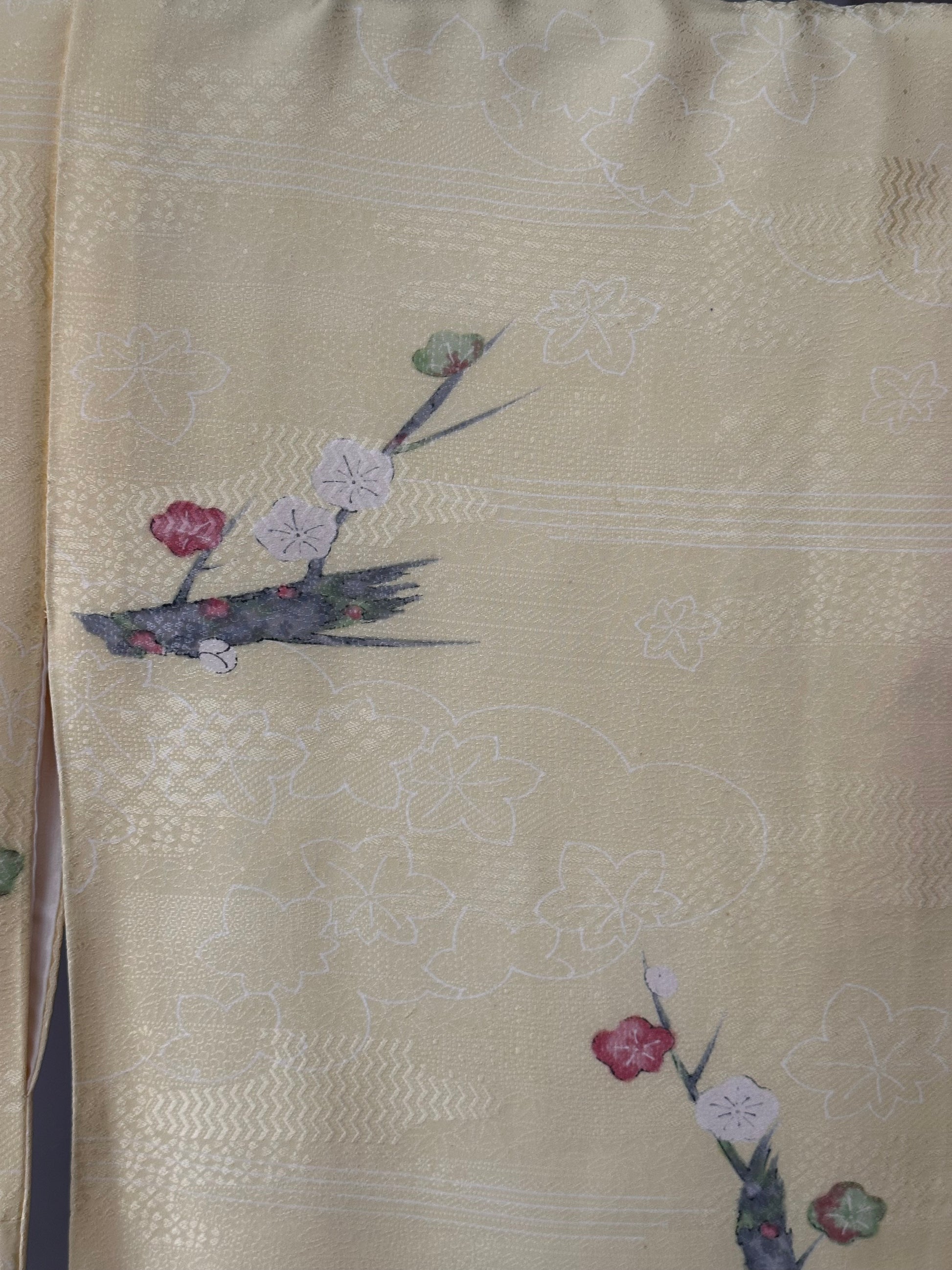 Tyyli: Tämä on komon (小紋) kimono, jolle on tunnusomaista sen tasaisesti jakautunut kuvio, mikä tekee siitä ihanteellisen rentoon ja puolimuotoiseen tilaisuuteen. Kirkas sitruunankeltainen sävy yhdistettynä herkkiin, käsinmaalattuihin luumukukkiin antaa sille raikkaan ja eloisan ulkonäön, joka sopii täydellisesti kevään ja kesän pukeutumiseen.