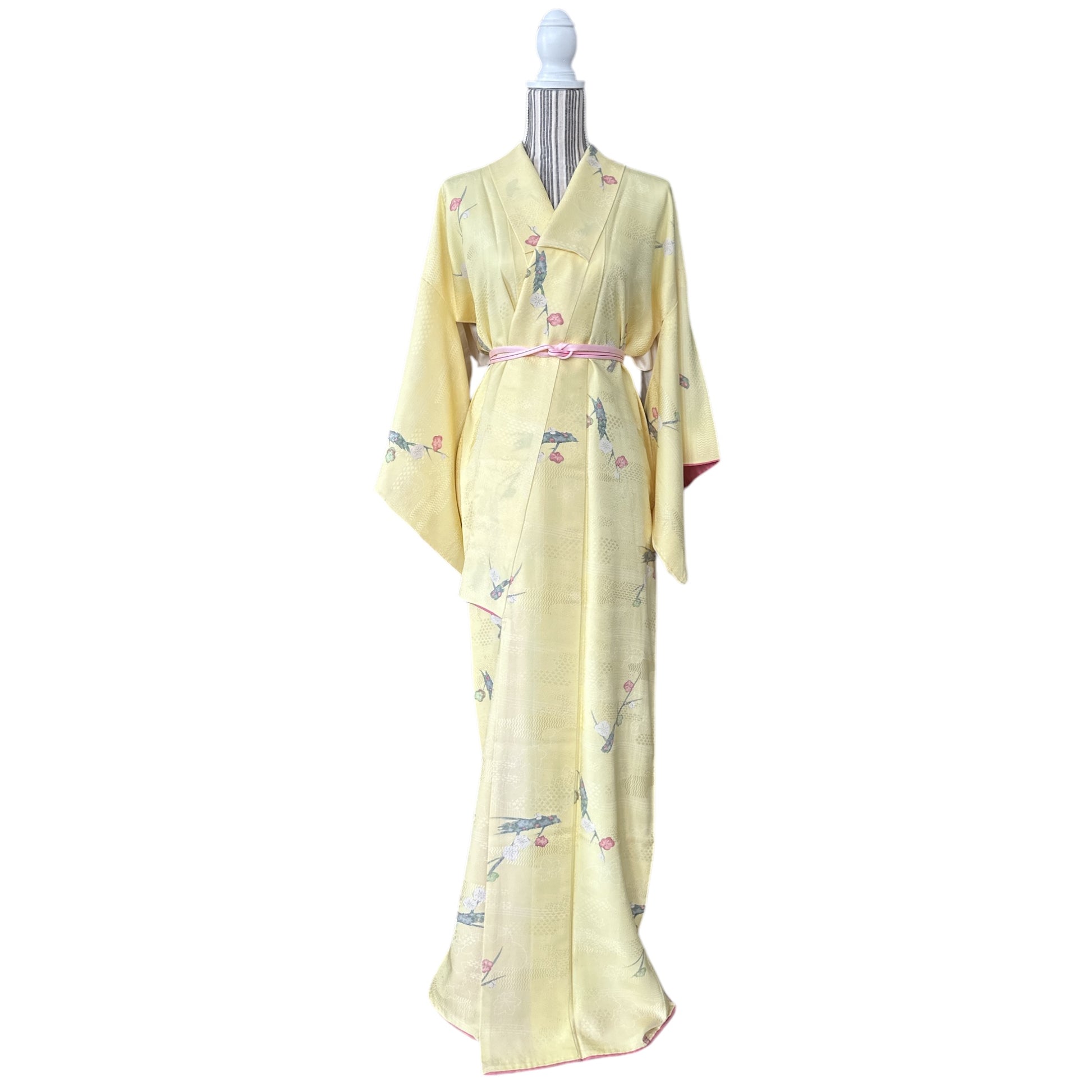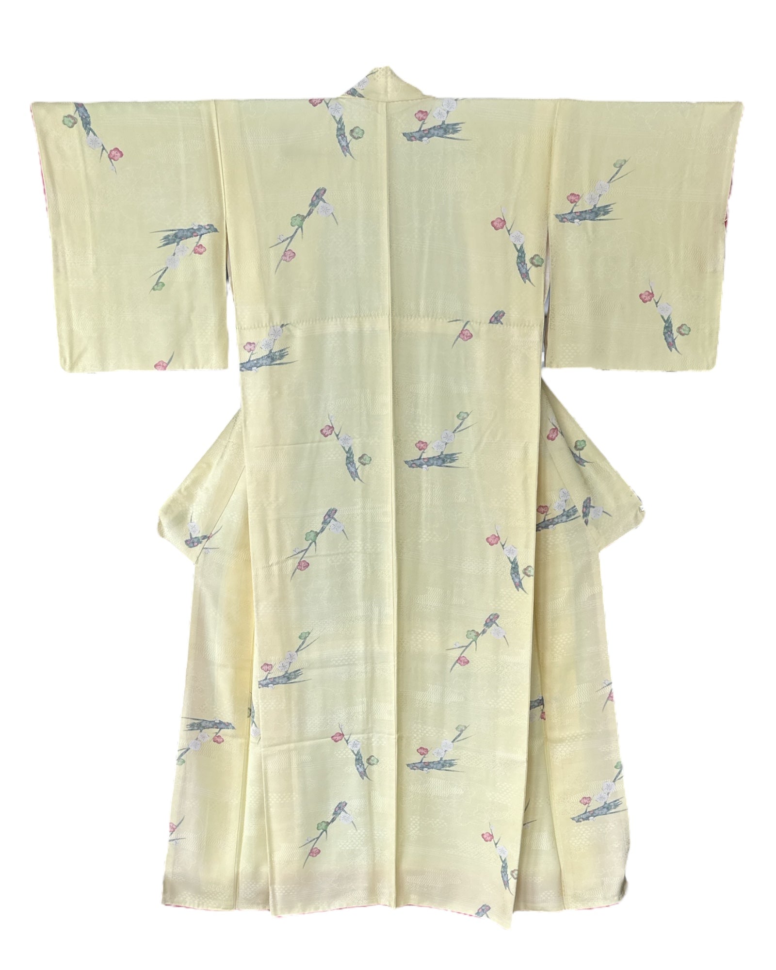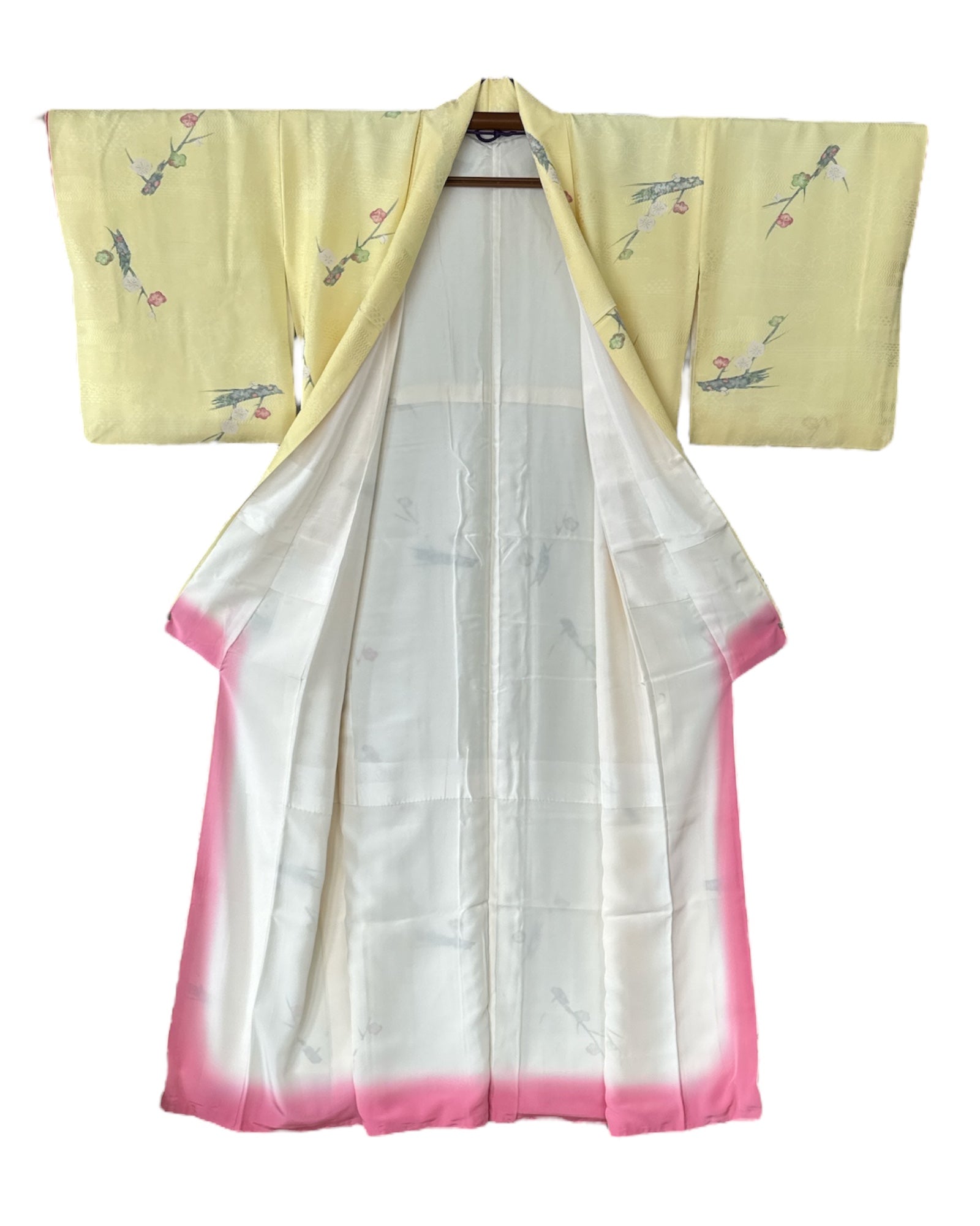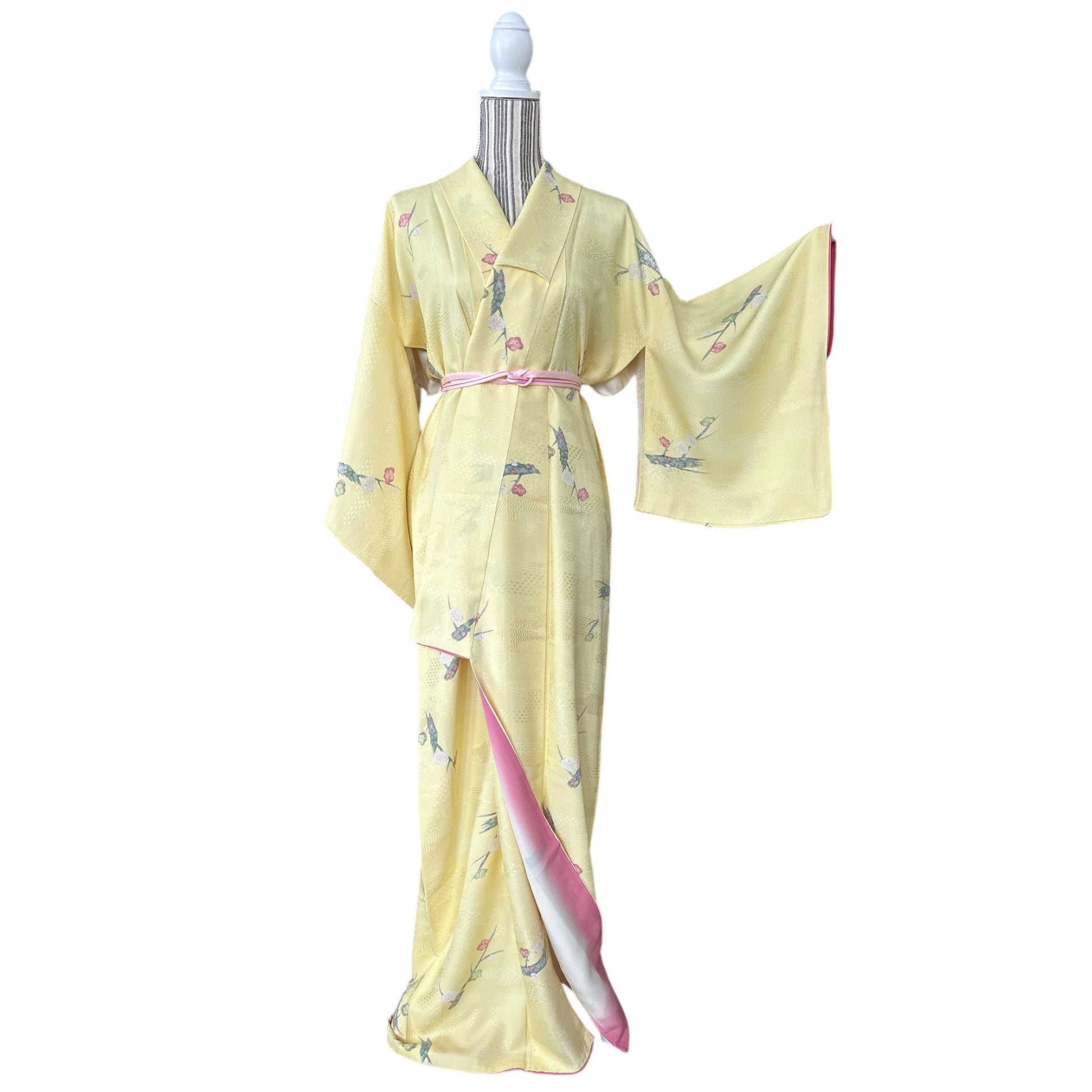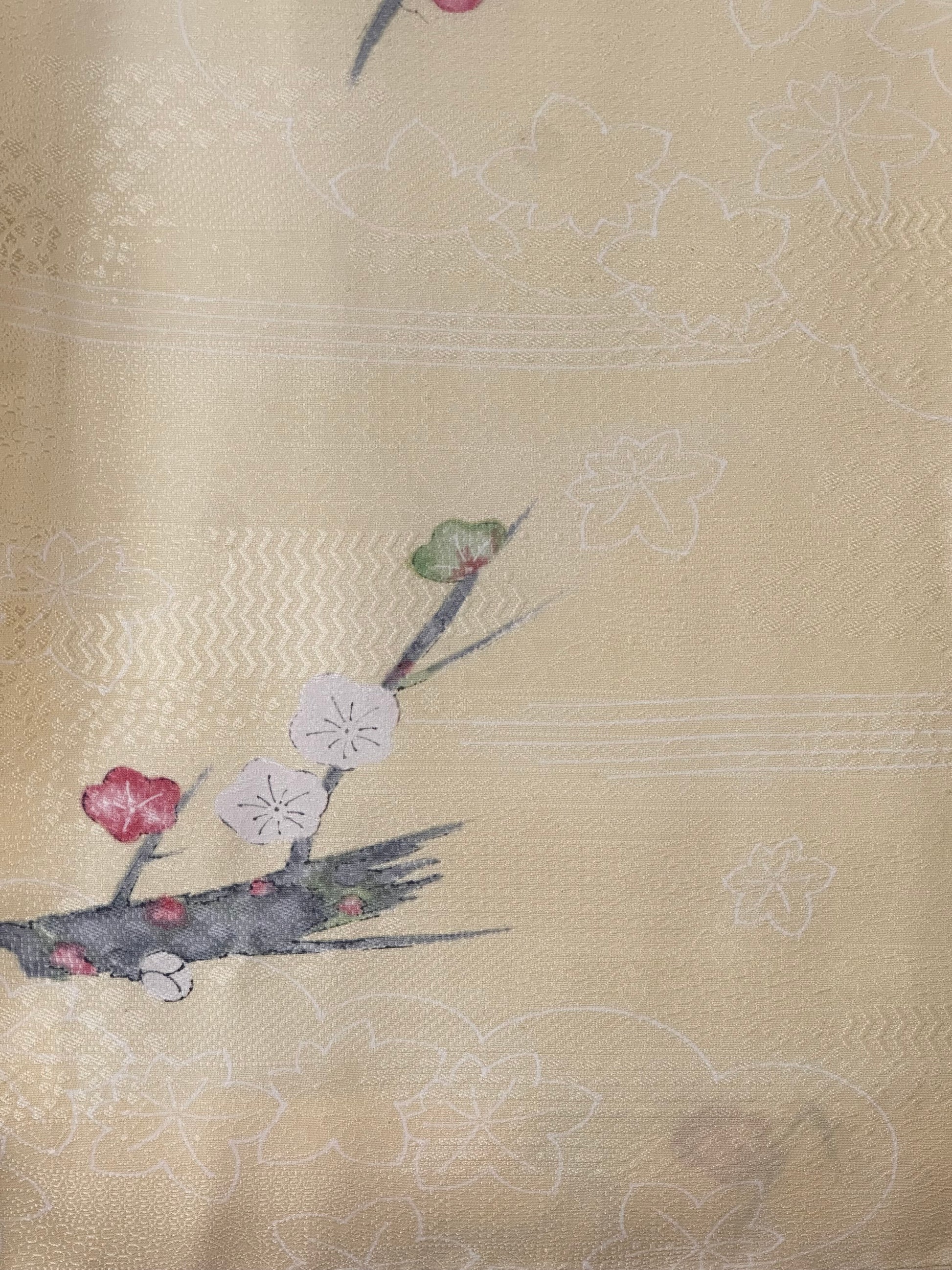 Tyyli: Tämä on komon (小紋) kimono, jolle on tunnusomaista sen tasaisesti jakautunut kuvio, mikä tekee siitä ihanteellisen rentoon ja puolimuotoiseen tilaisuuteen. Kirkas sitruunankeltainen sävy yhdistettynä herkkiin, käsinmaalattuihin luumukukkiin antaa sille raikkaan ja eloisan ulkonäön, joka sopii täydellisesti kevään ja kesän pukeutumiseen.