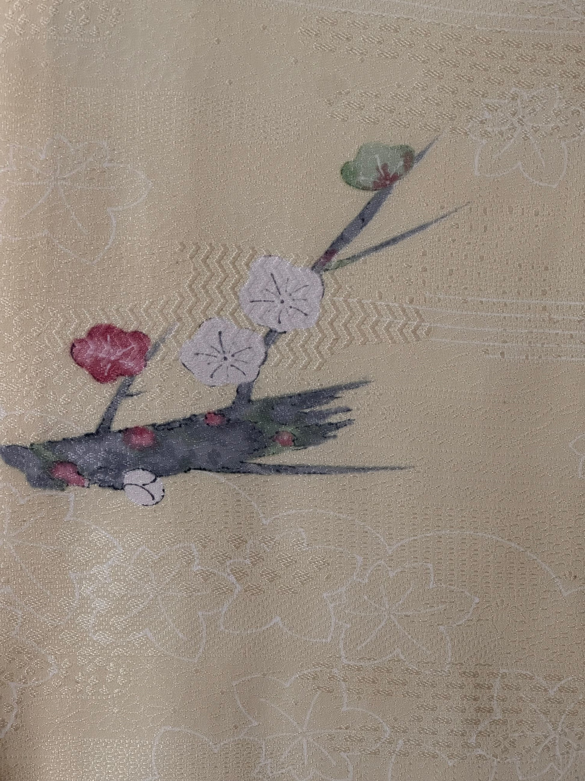 Kangas: Valmistettu synteettisestä rinzu-silkistä, tämä kimono esittelee ylellistä jacquard-kudottua kuviota, joka hohtaa hienovaraisesti valossa. Rinzu-silkki on arvostettu sen sileästä, kiiltävästä tekstuuristaan ja monimutkaisista kudotusta kuvioista, jotka tarjoavat sekä eleganssia että hienostuneen verhon. Kudotun taustan ja käsinmaalattujen kukkaisten yksityiskohtien yhdistelmä tekee tästä kimonosta hienon esimerkin perinteisestä japanilaisesta käsityöstä.