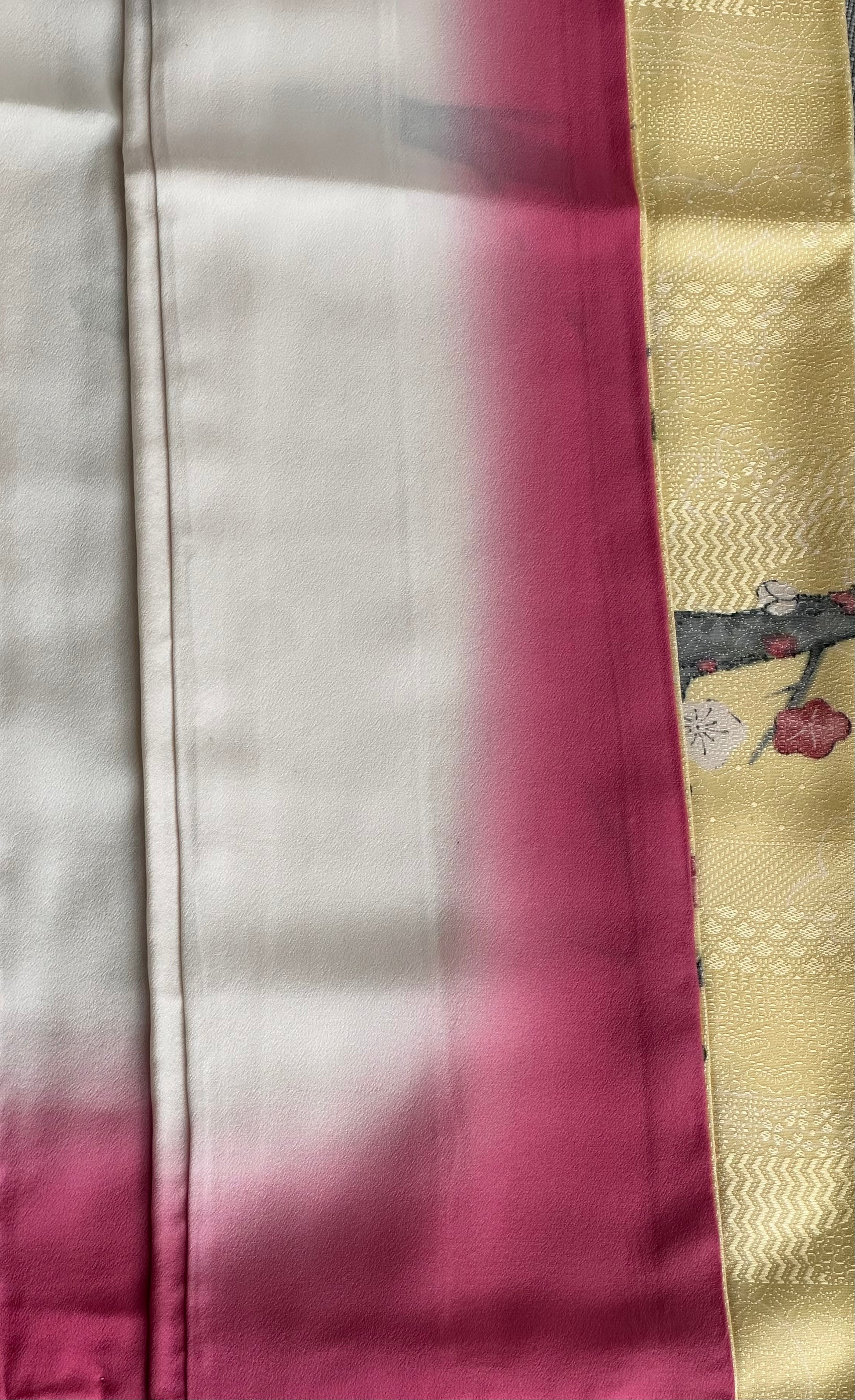 Kuvaus: Tämä on upea vintage Komon -kimono kirkkaassa sitruunankeltaisessa sävyssä, jota koristaa elegantti kukkakuvio hoikkailla oksilla. Kukat, jotka tunnetaan nimellä " ume " (梅 - luumunkukat) , on käsinmaalattu hellävaraisesti, mikä lisää esineeseen artesaania ja ainutlaatuista tunnelmaa. Kimono on täysin vuorattu, ja siinä on valkoinen sisäpuoli ja pehmeä vaaleanpunainen kaltevuus helmassa, mikä korostaa sen siroa ja naisellista vetovoimaa.