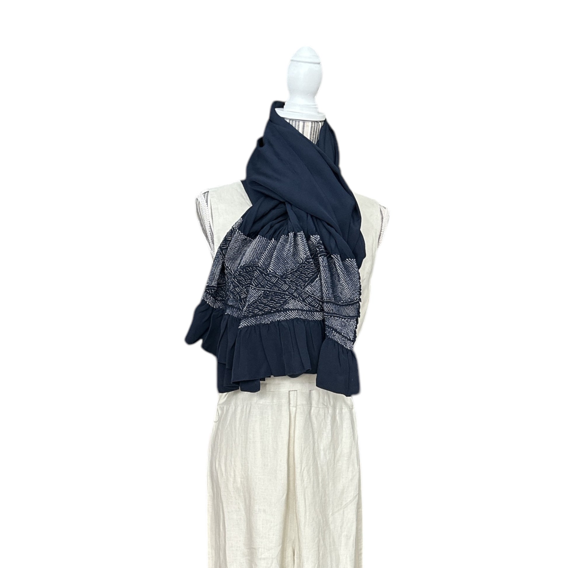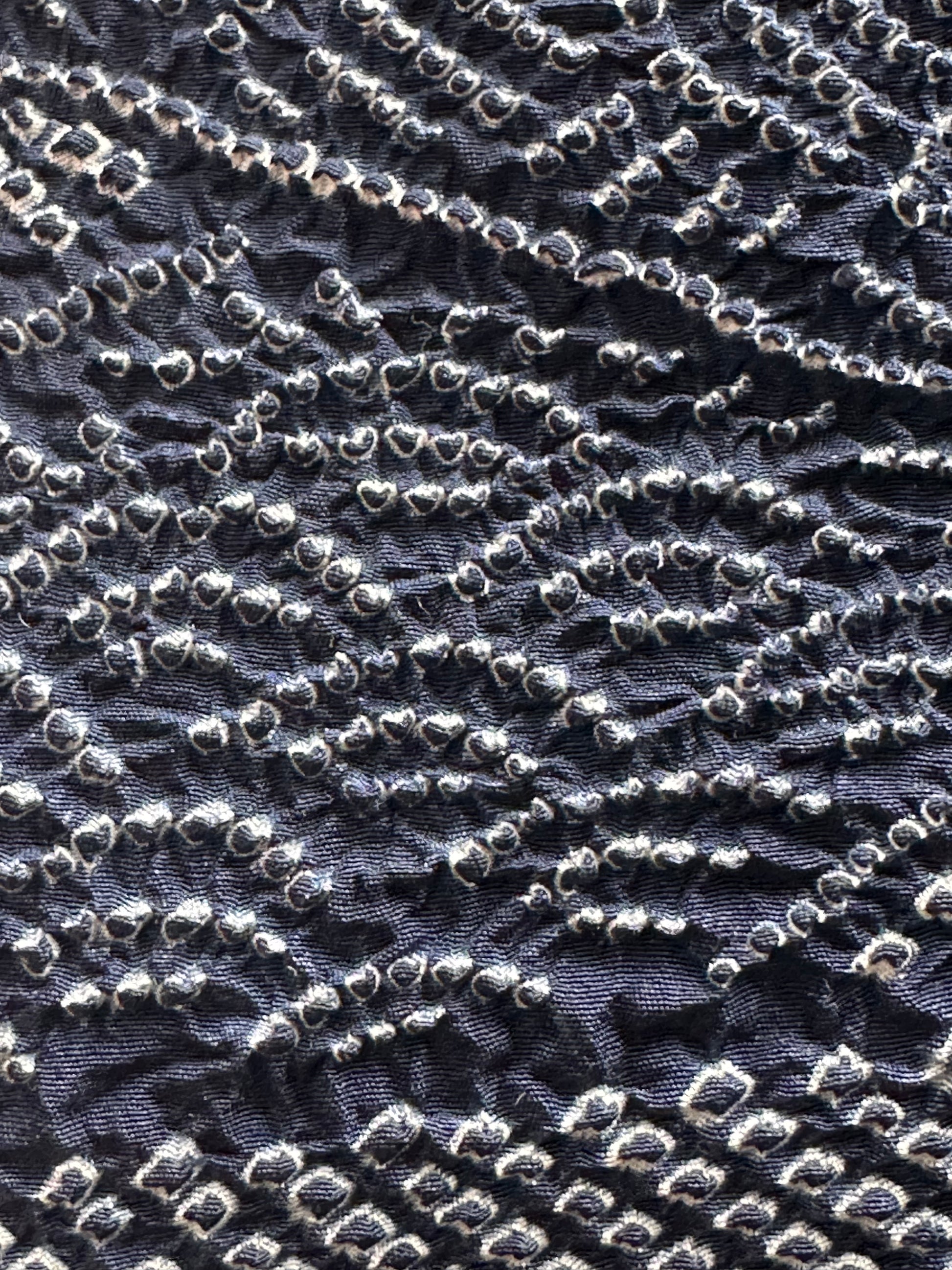 Kangas: Laadukas silkki, jossa shibori -yksityiskohdat molemmissa päissä.
