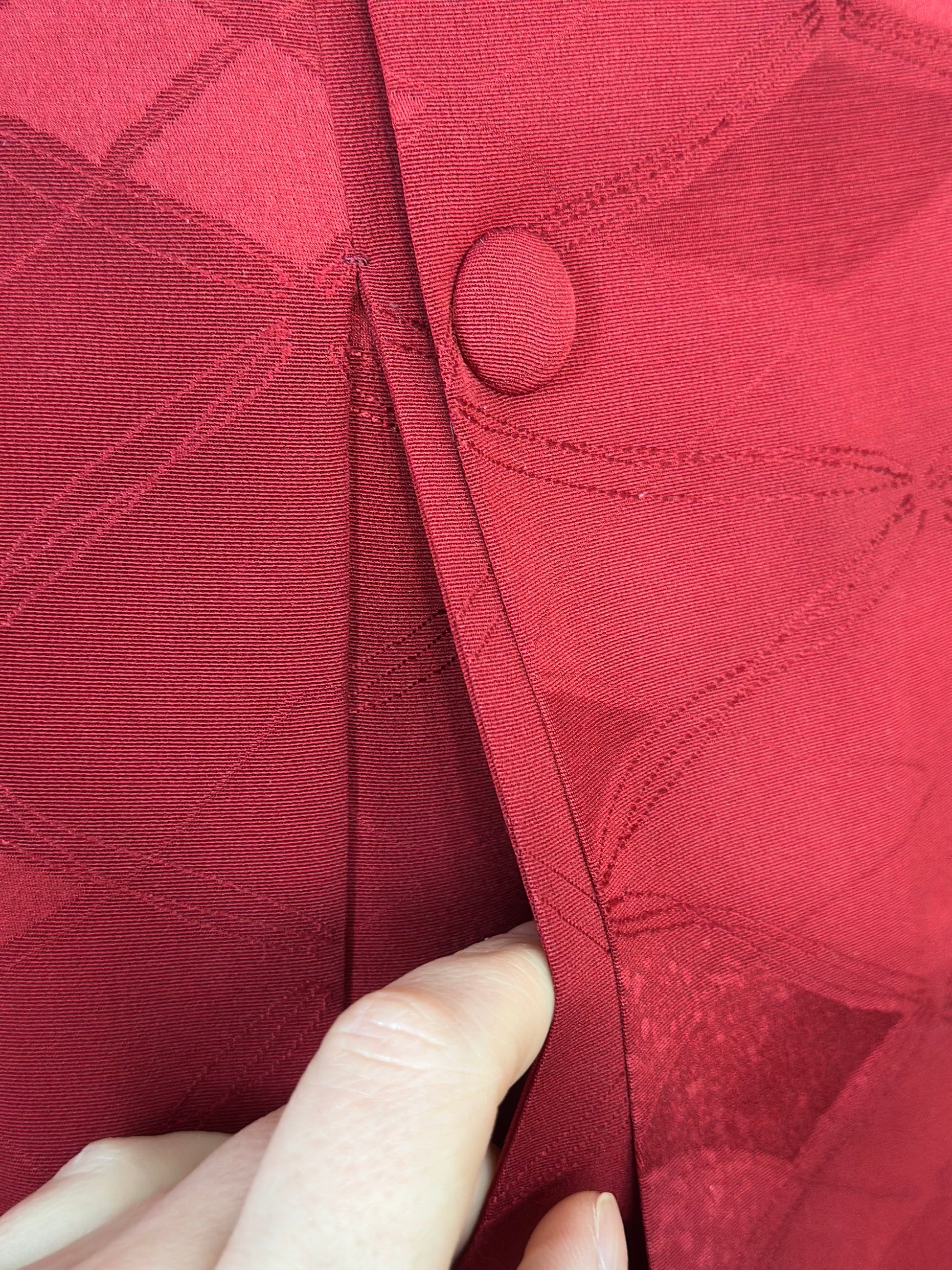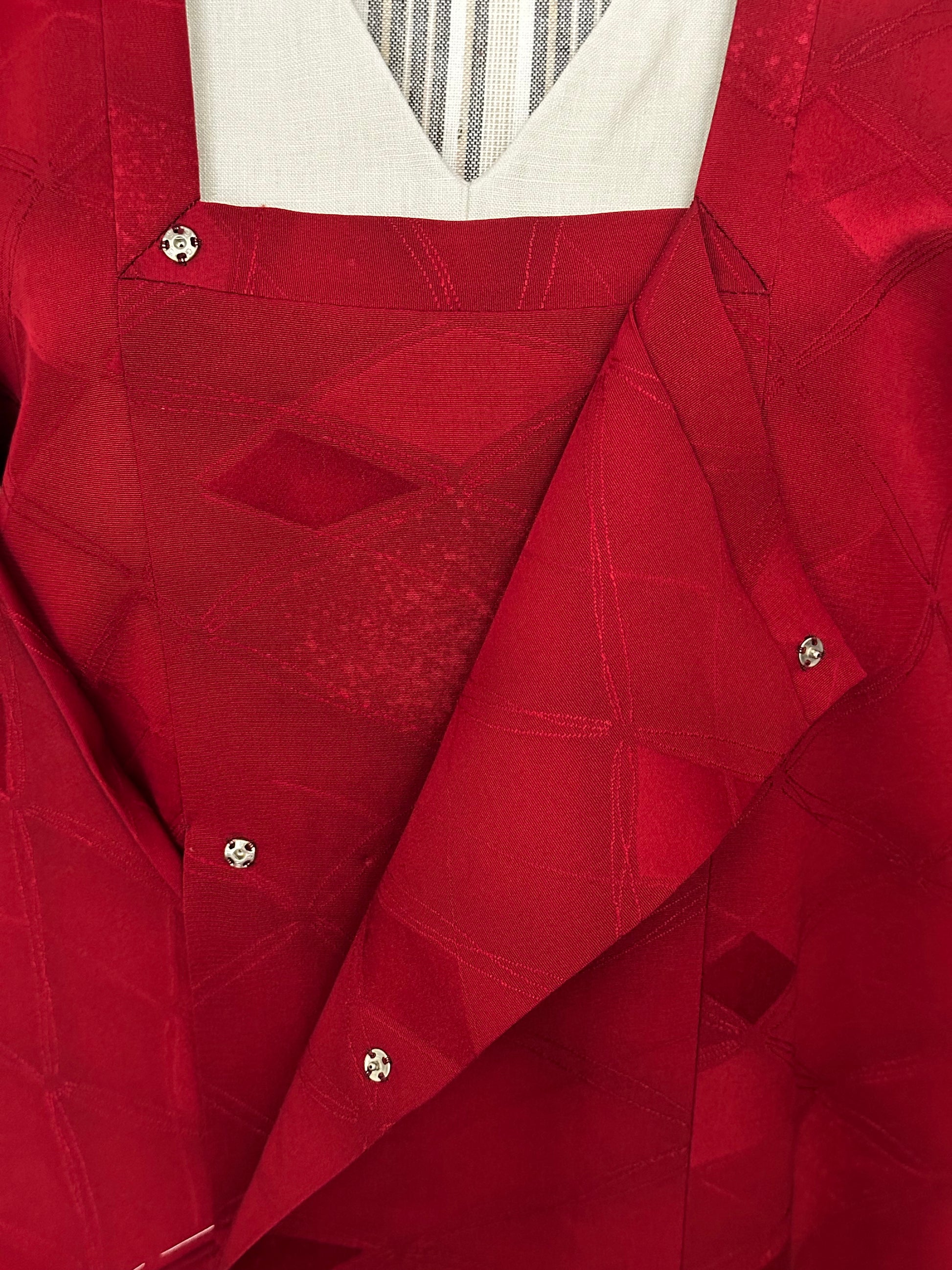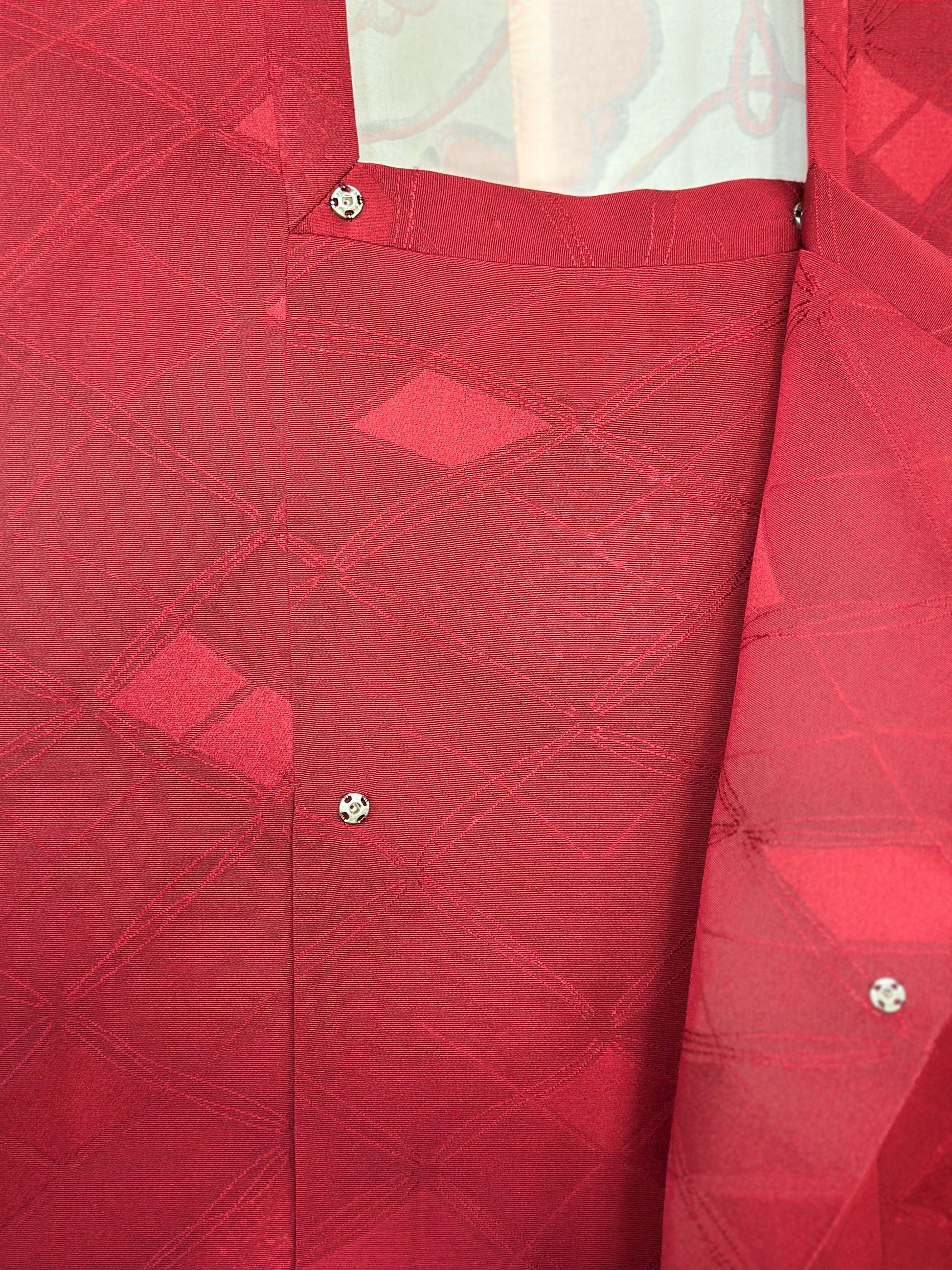 Kuvaus: Tämä tyylikäs Michiyuki- takki on hienostunut päällysvaate, joka on suunniteltu täydentämään kimonoa. Perusväri on syvä, täyteläinen tummanpunainen , joka huokuu ajatonta ja hienostunutta charmia. Takissa on hienovaraisia, eloisia aksentteja, jotka korostavat sen eloisaa ja hienostunutta ulkonäköä, mikä tekee siitä täydellisen sekä muodollisiin että juhlallisiin tilaisuuksiin. Käytännöllinen mutta tyylikäs siinä on toimiva sivutasku, ja sen suljin on kiinnitetty perinteisillä ompeluhaitteilla, jotka ovat ominaisia Michiyuki-malleille.