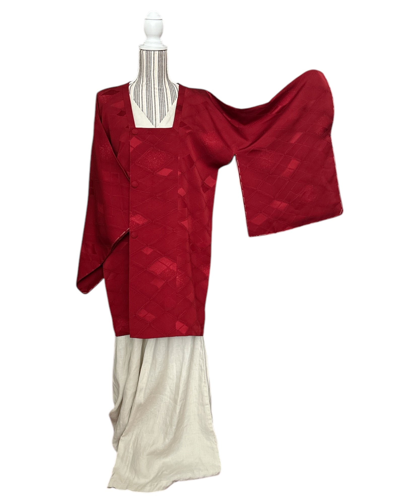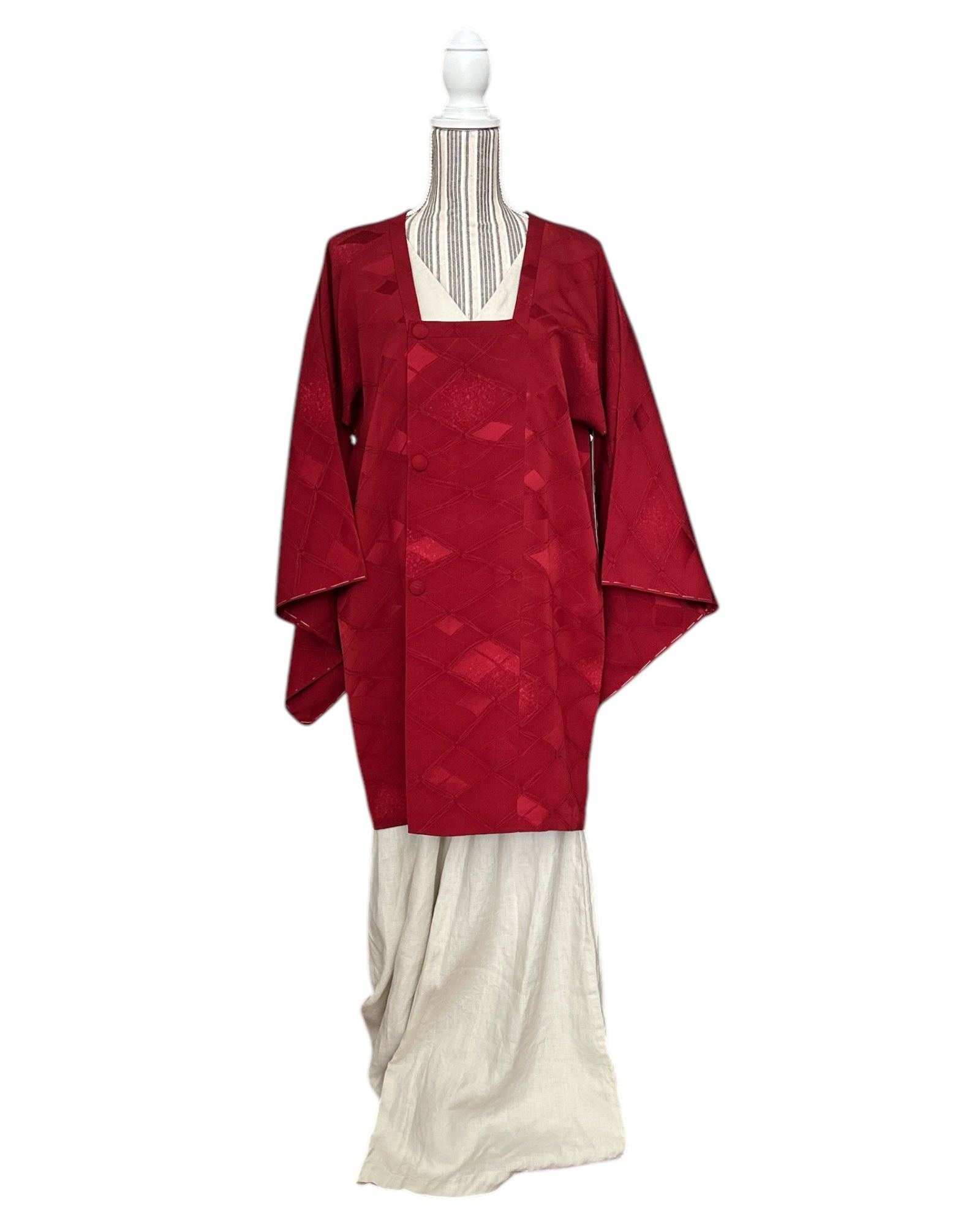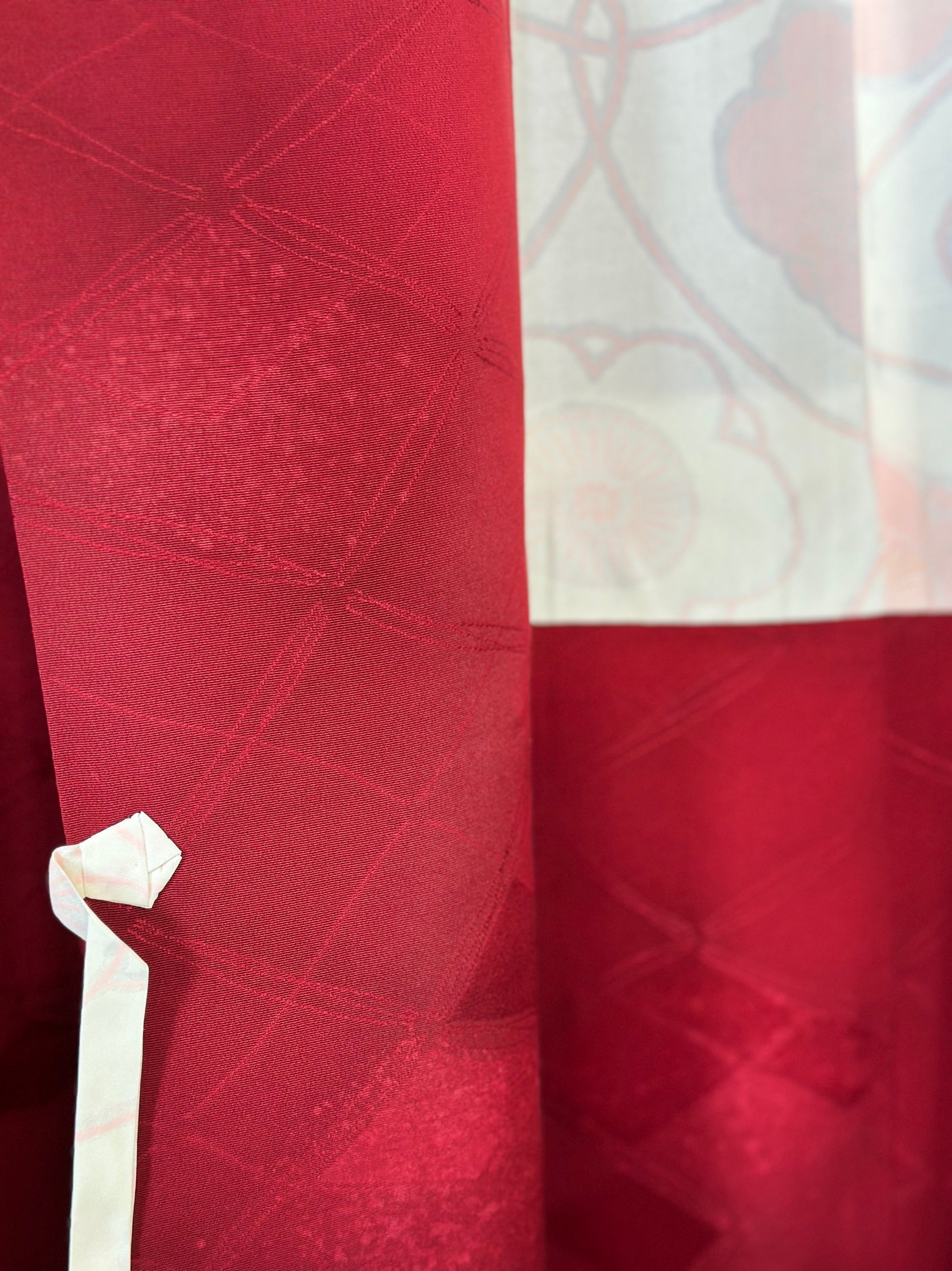 Kuvaus: Tämä tyylikäs Michiyuki- takki on hienostunut päällysvaate, joka on suunniteltu täydentämään kimonoa. Perusväri on syvä, täyteläinen tummanpunainen , joka huokuu ajatonta ja hienostunutta charmia. Takissa on hienovaraisia, eloisia aksentteja, jotka korostavat sen eloisaa ja hienostunutta ulkonäköä, mikä tekee siitä täydellisen sekä muodollisiin että juhlallisiin tilaisuuksiin. Käytännöllinen mutta tyylikäs siinä on toimiva sivutasku, ja sen suljin on kiinnitetty perinteisillä ompeluhaitteilla, jotka ovat ominaisia Michiyuki-malleille.