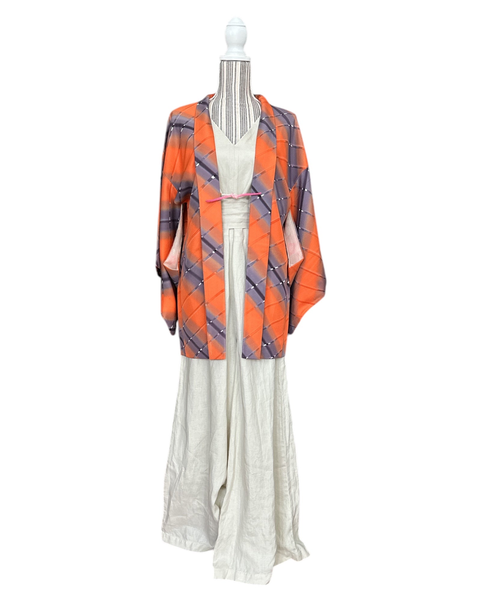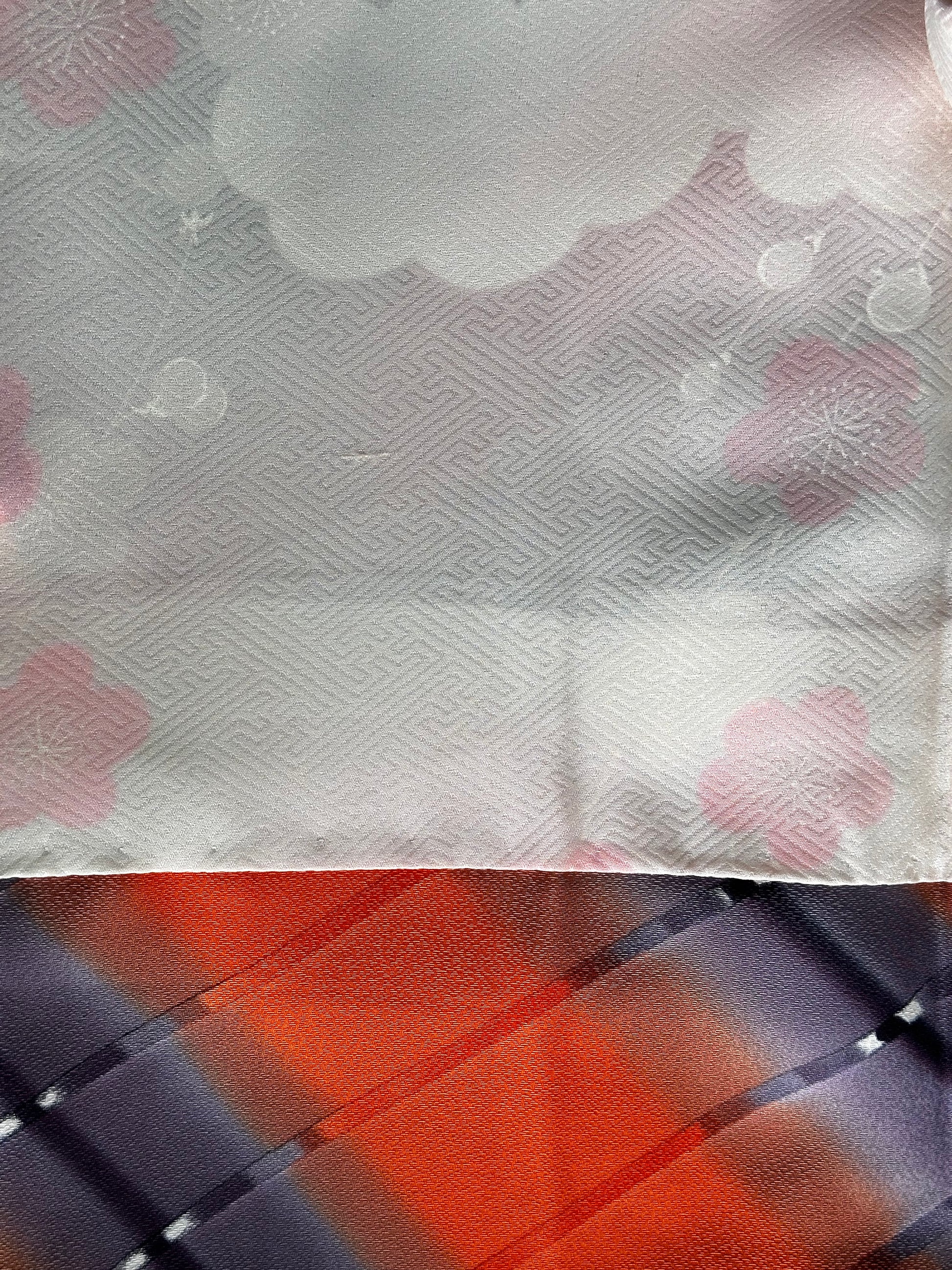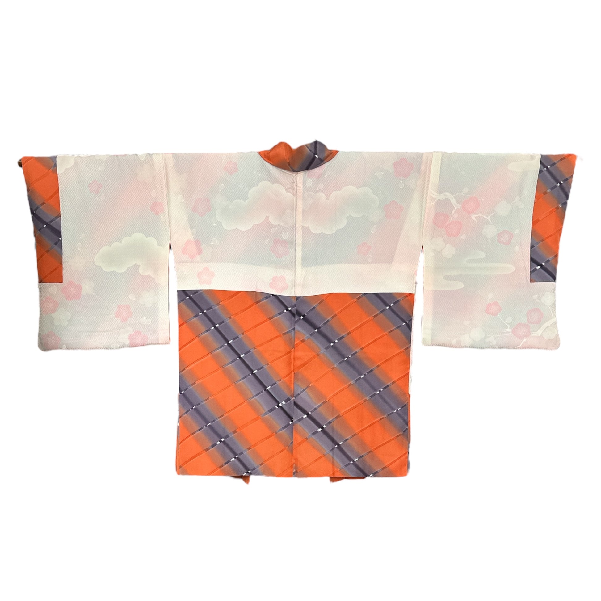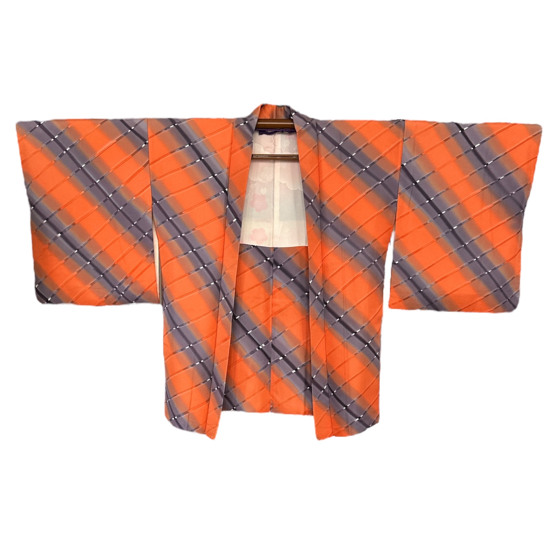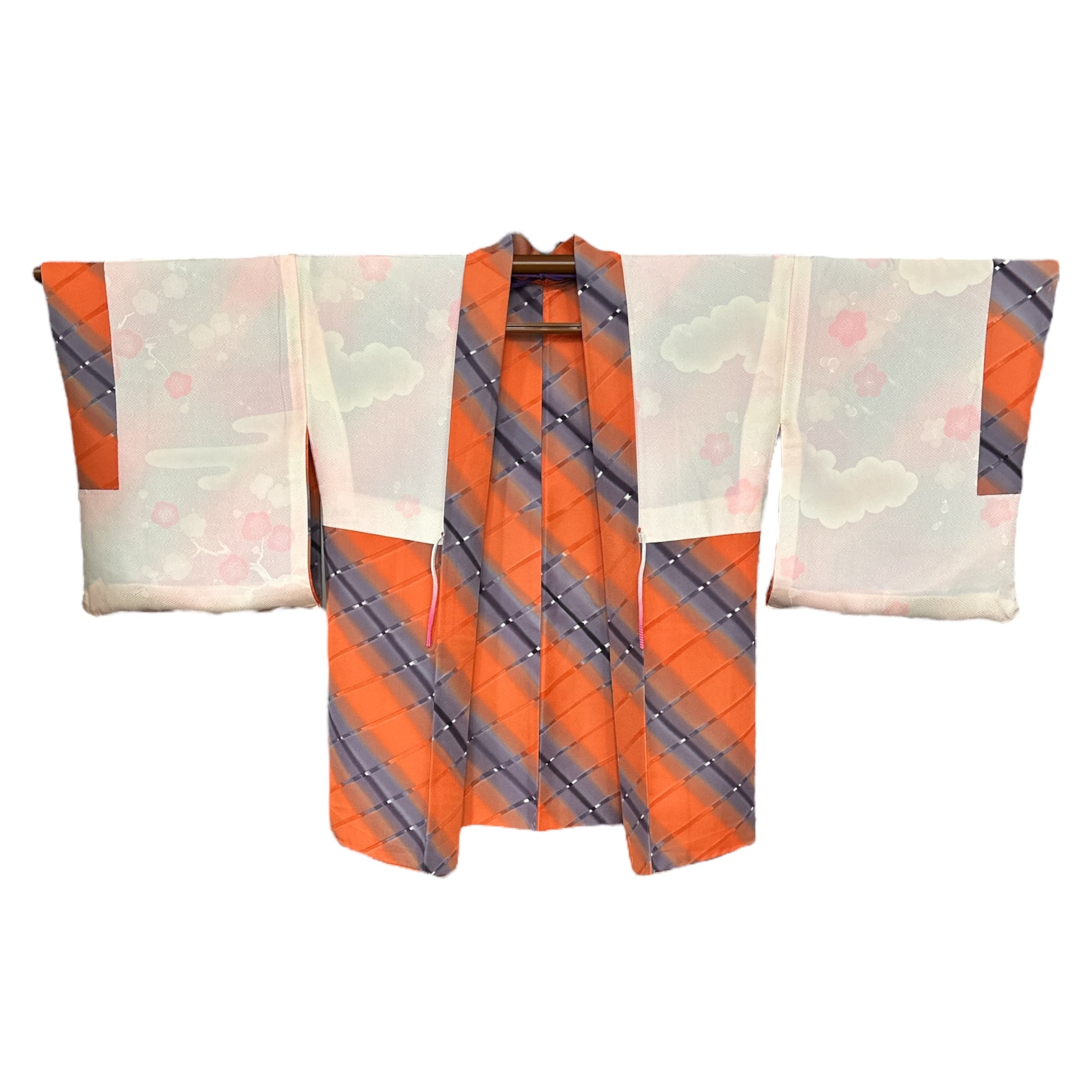 Description: Elegant women's haori crafted from high-quality polyester, featuring a striking design with diagonal ombre bands in vibrant orange and soft lavender. The seamless gradient effect creates a dynamic and visually captivating pattern. The inner lining, made of luxurious rinzu synthetic silk, showcases a delicate spring motif with hand-painted ume blossoms and drifting clouds, adding a refined seasonal touch. Ume (plum blossoms) symbolize resilience, renewal, and the arrival of spring in Japanese culture. Includes a matching haori himo for a complete and authentic look.
