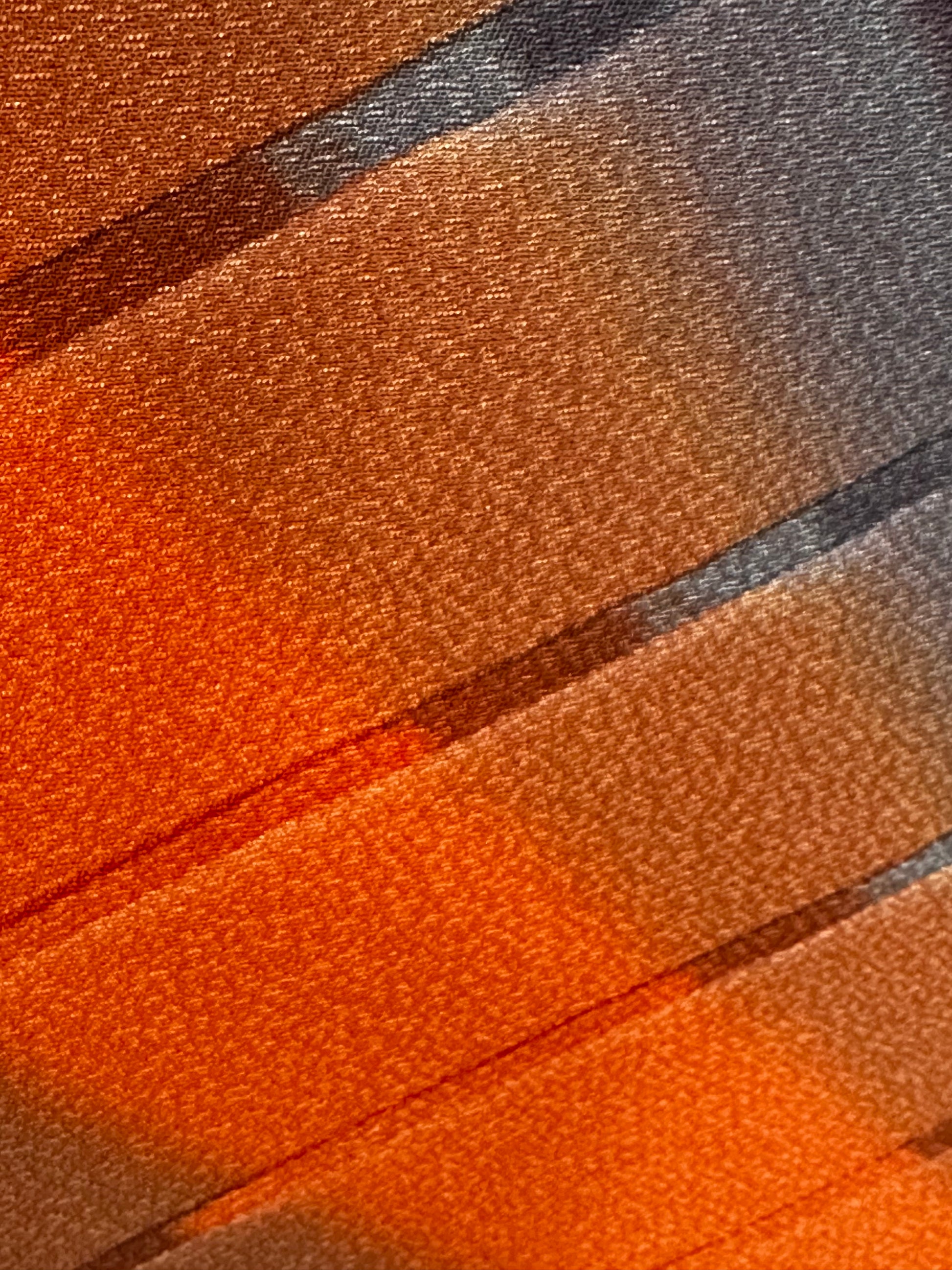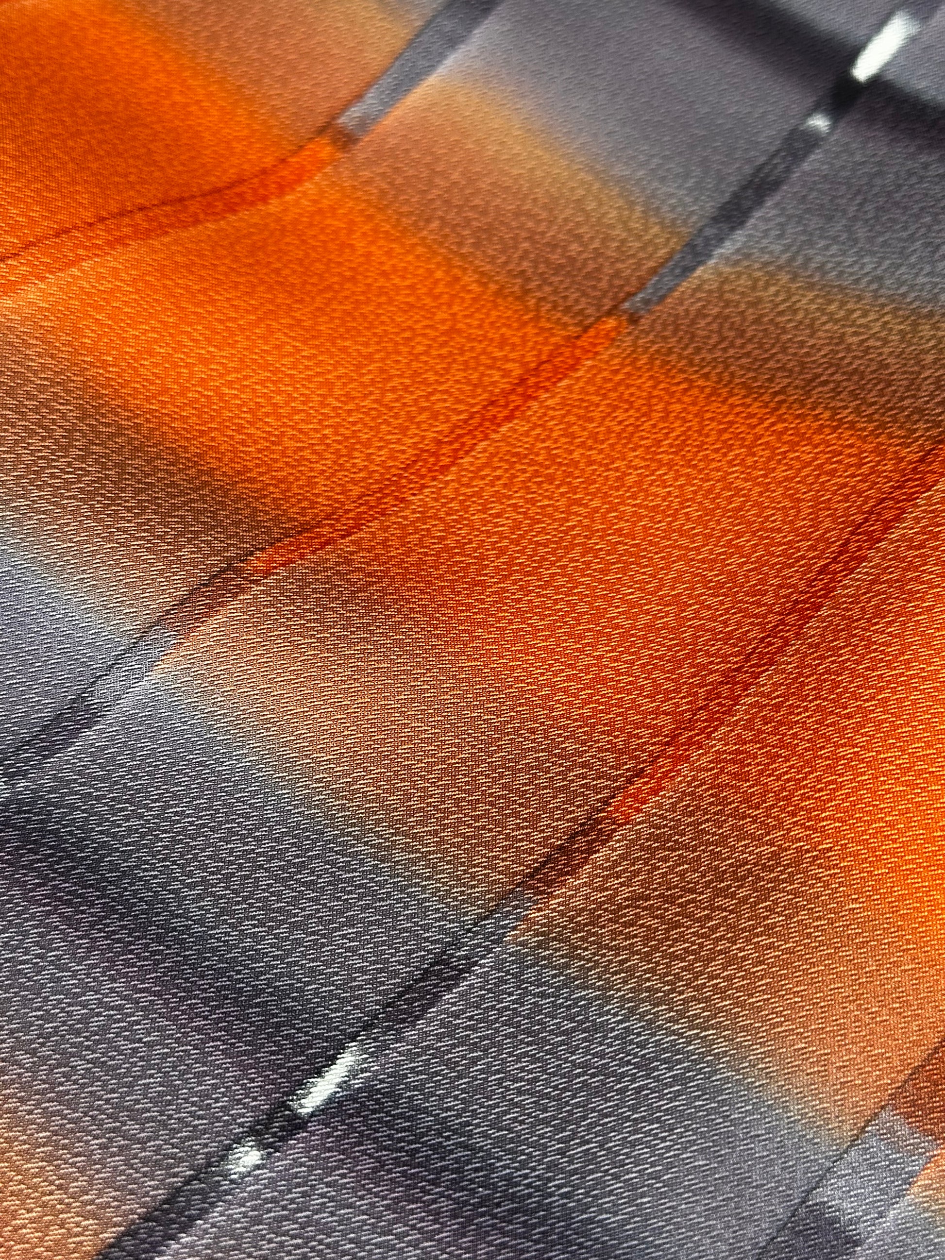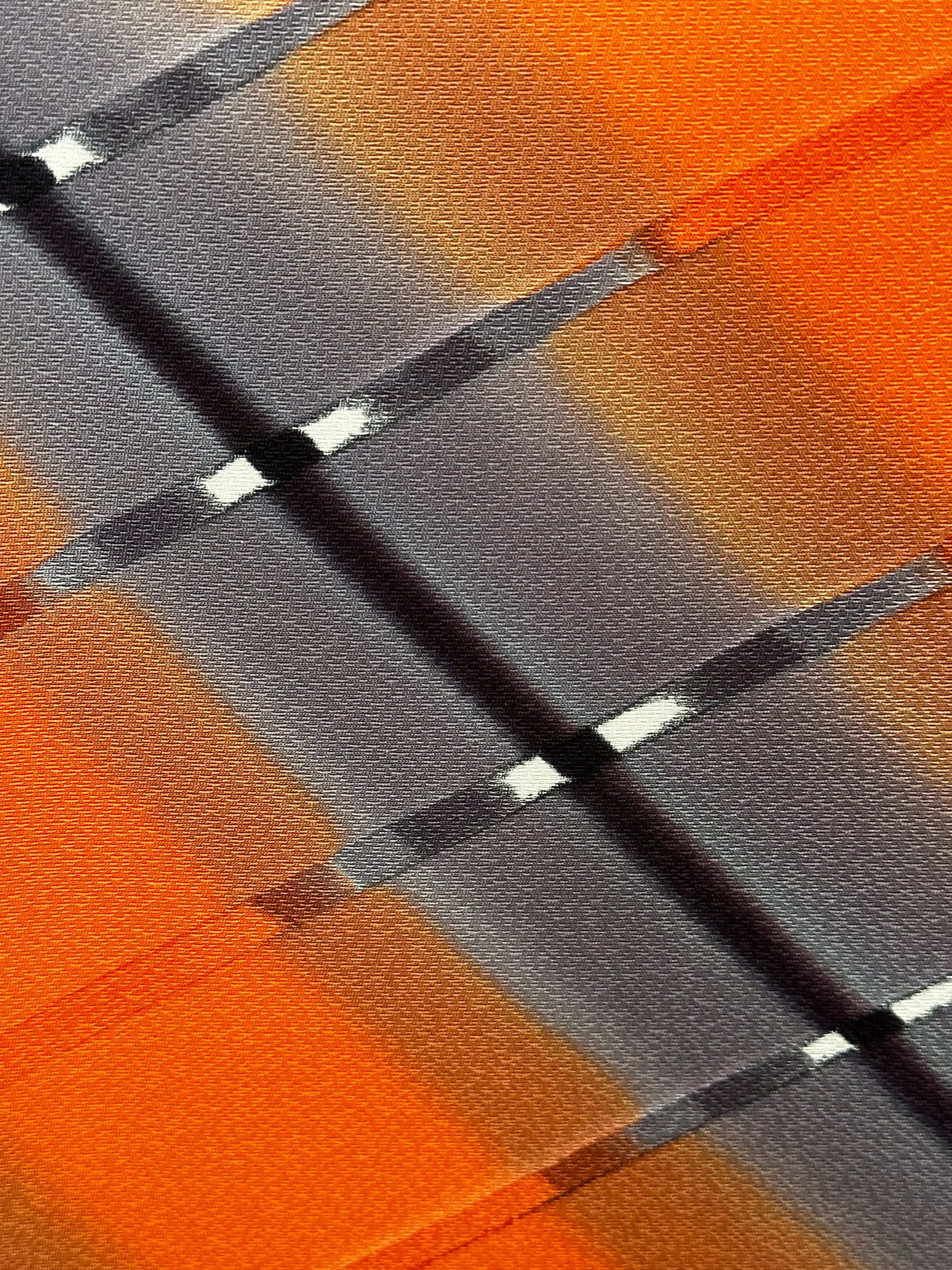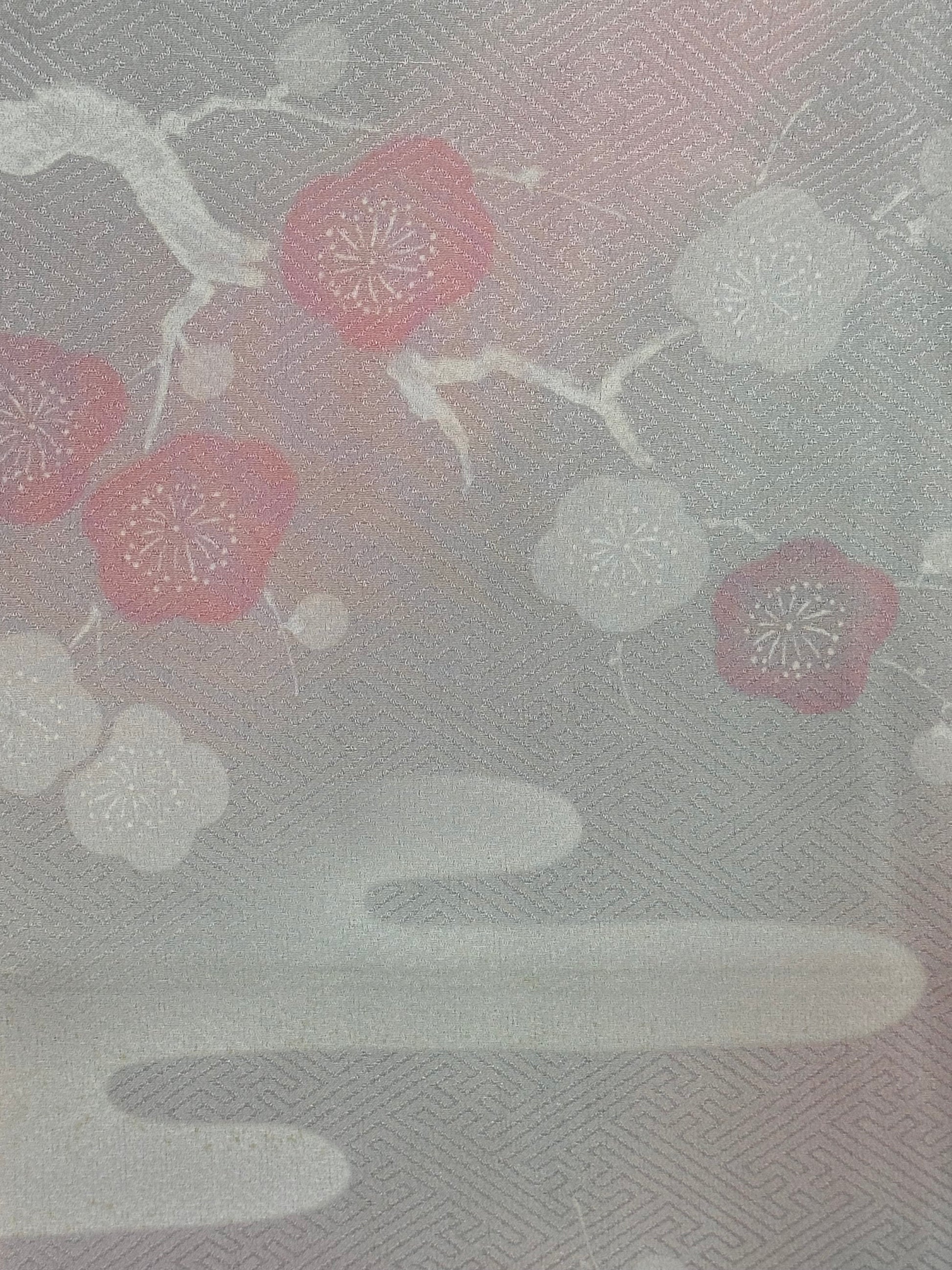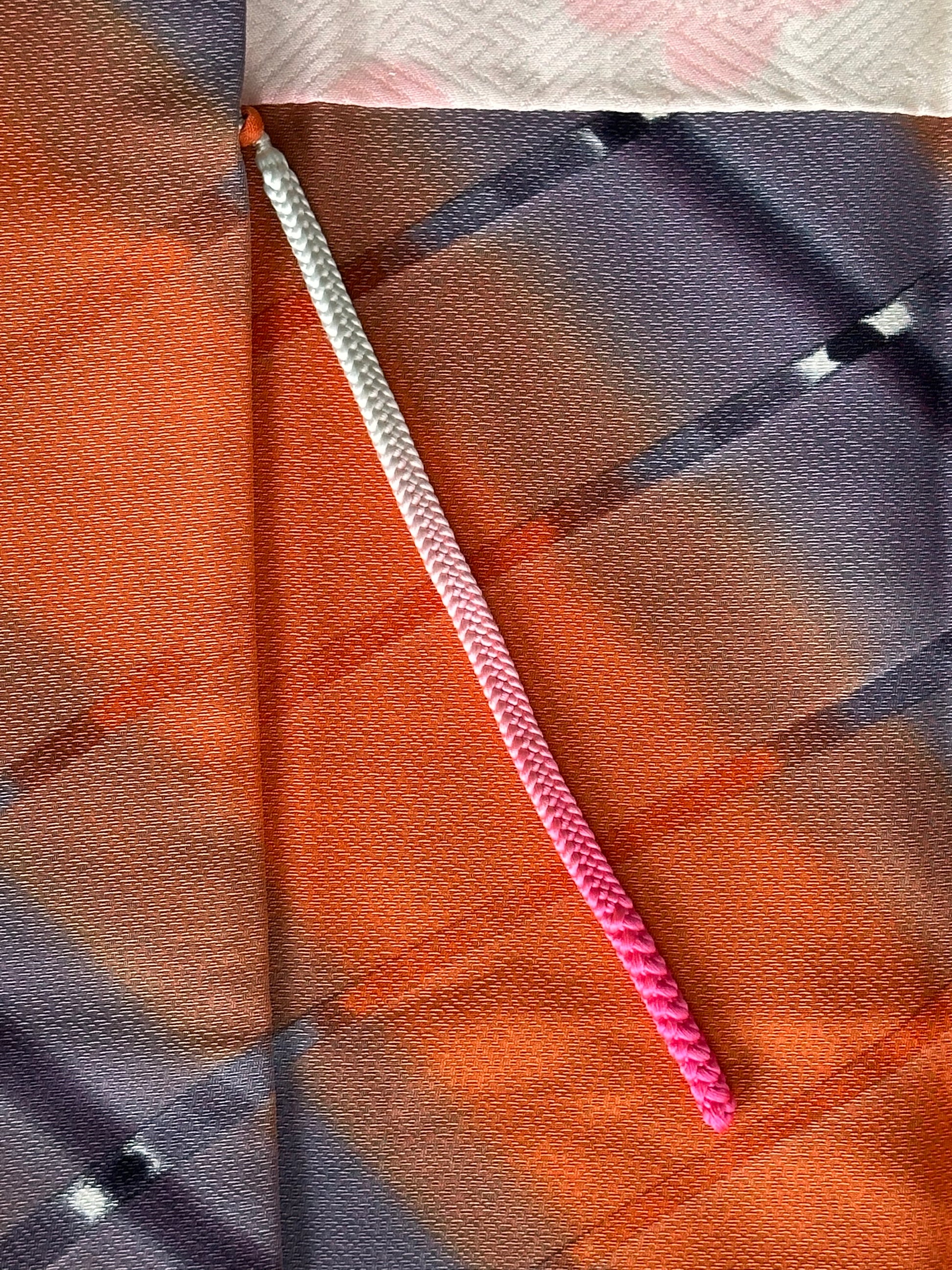 Description: Elegant women's haori crafted from high-quality polyester, featuring a striking design with diagonal ombre bands in vibrant orange and soft lavender. The seamless gradient effect creates a dynamic and visually captivating pattern. The inner lining, made of luxurious rinzu synthetic silk, showcases a delicate spring motif with hand-painted ume blossoms and drifting clouds, adding a refined seasonal touch. Ume (plum blossoms) symbolize resilience, renewal, and the arrival of spring in Japanese culture. Includes a matching haori himo for a complete and authentic look.