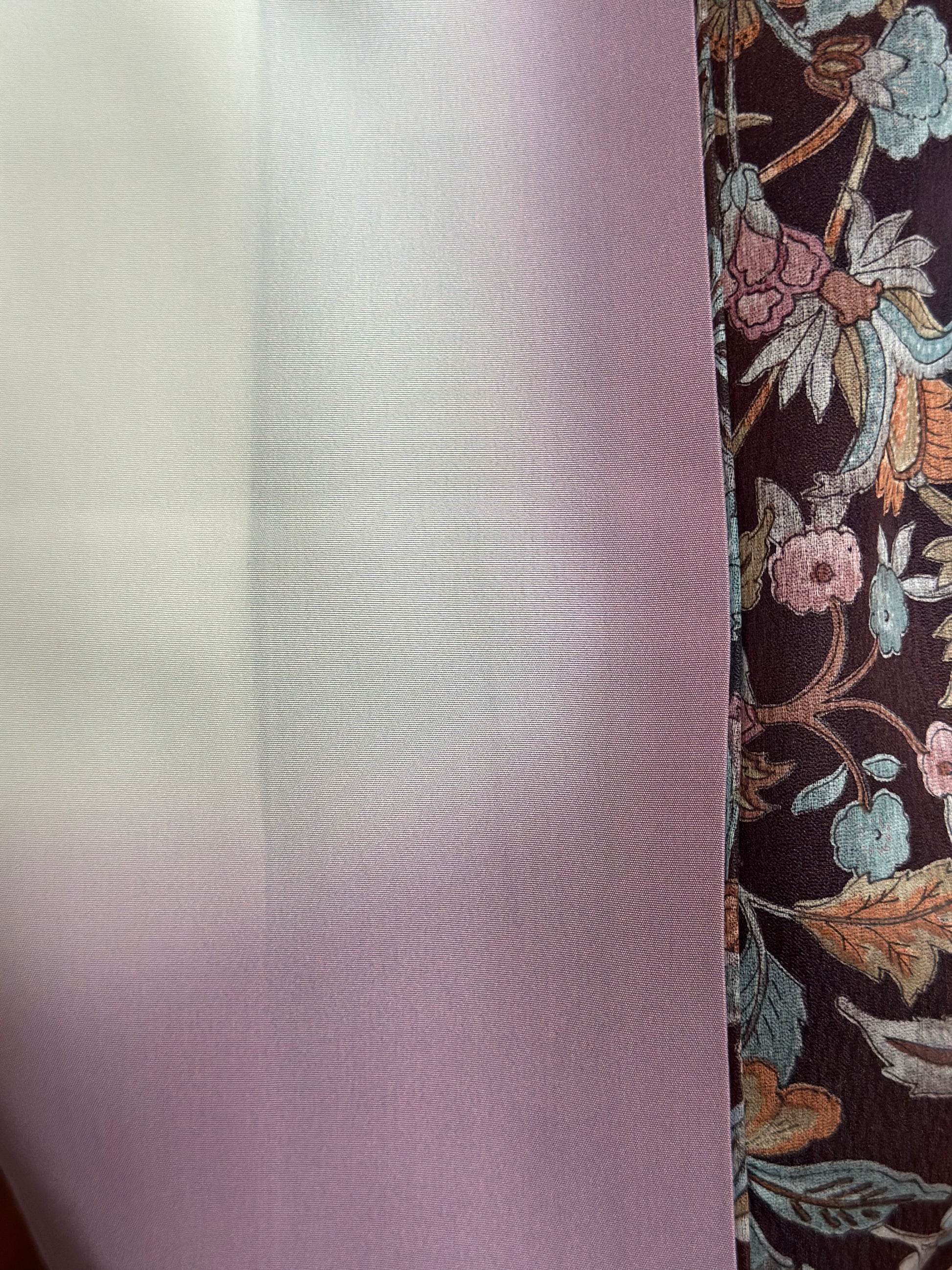 Valmistettu synteettisestä silkistä erittäin hienolla, pehmeällä kosketuksella, kangas tuntuu ylelliseltä ihoa vasten säilyttäen samalla kestävyyden. Herkän vaaleanpunaisen violetin sävyinen sisävuori lisää hienovaraista värisävyä ja korostaa kimonon eleganttia ja naisellista vetovoimaa.