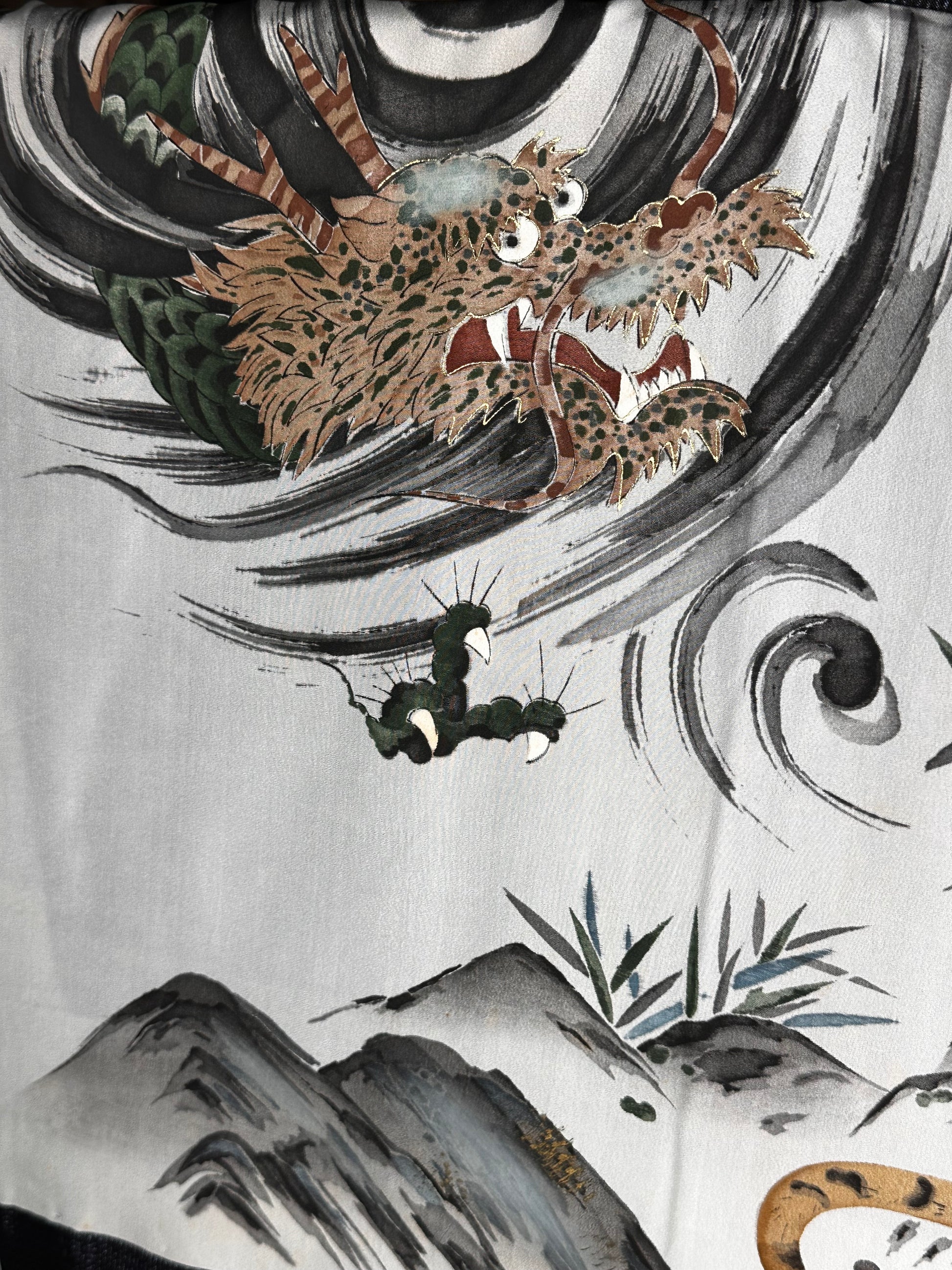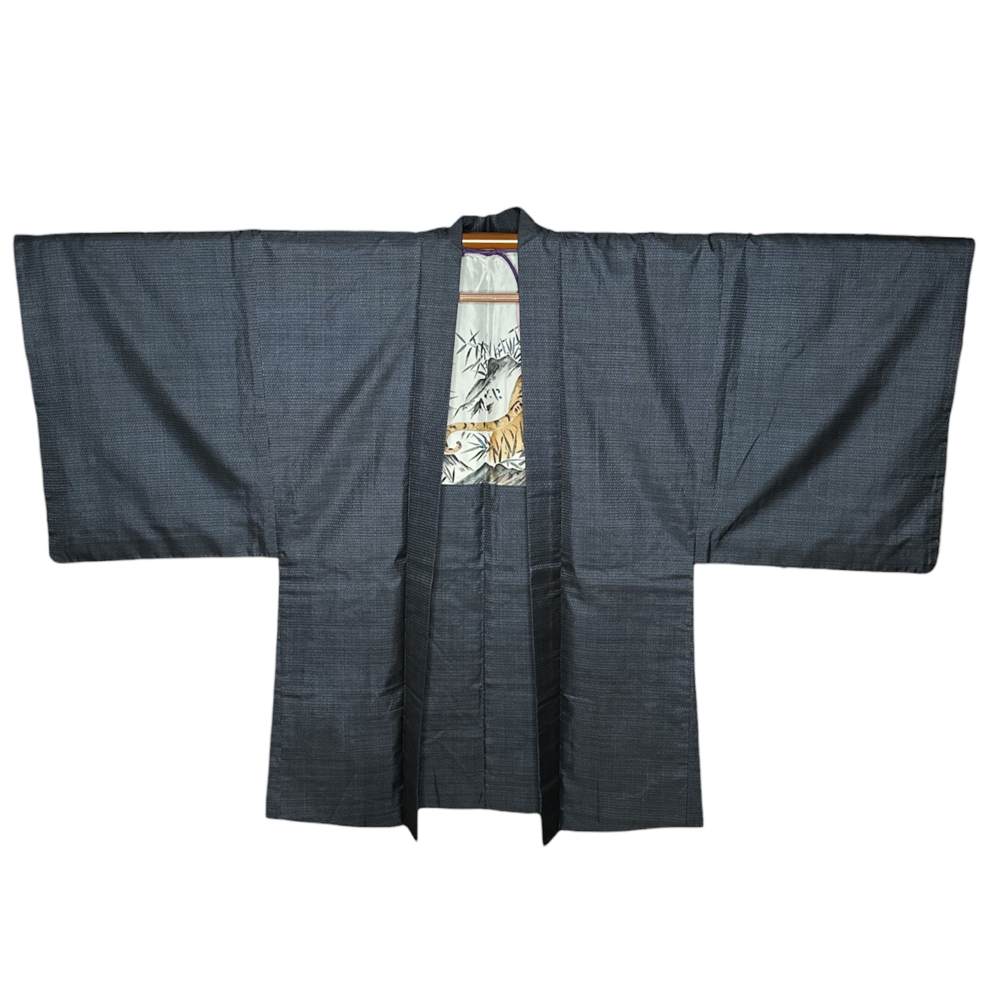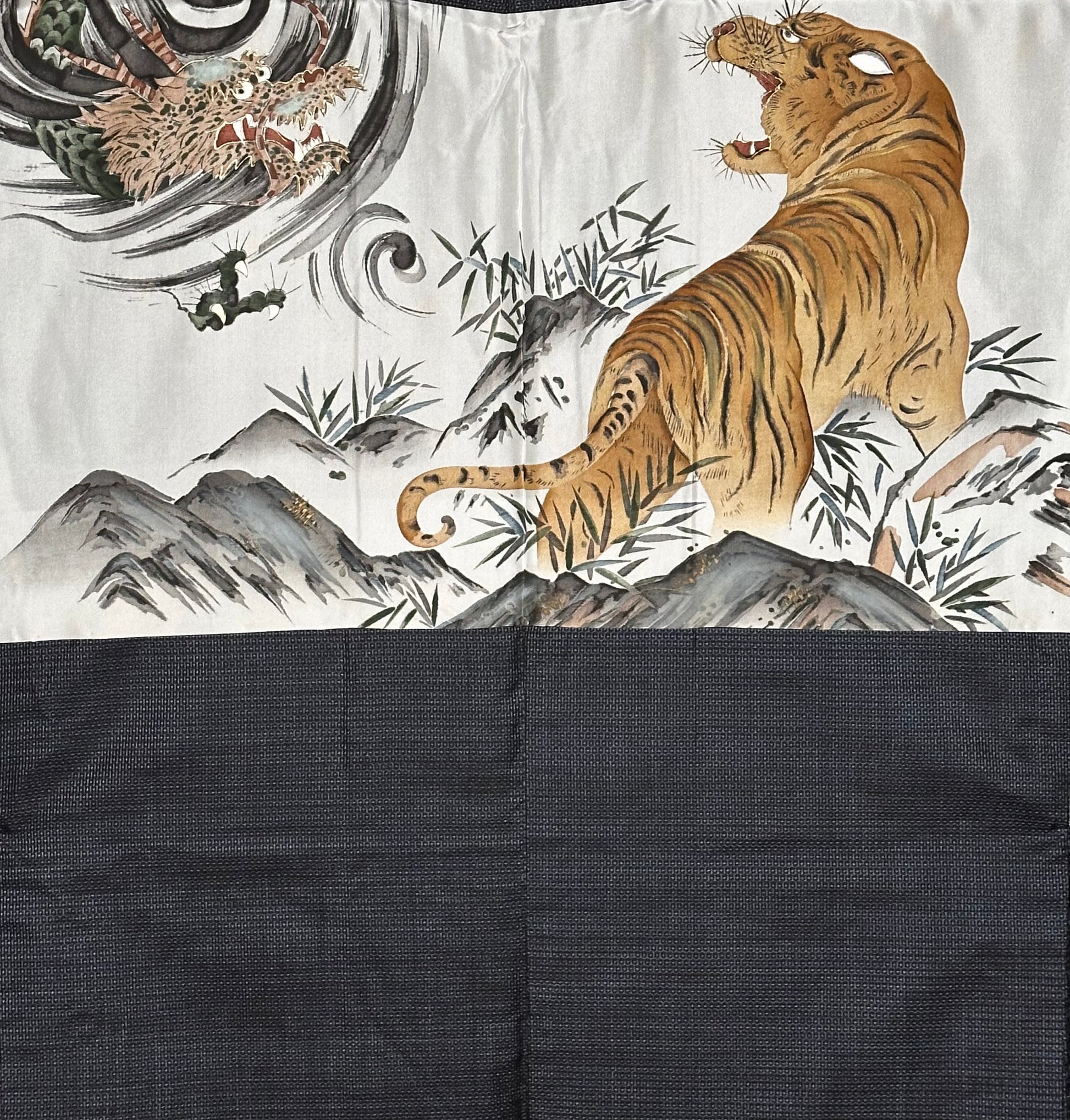 Kuvaus: Tämä miesten haori on valmistettu tsumugi-silkistä , ja siinä on hienostunut, teksturoitu ulkopinta. Sisävuori on käsinmaalattu perinteiseen Sumi-e-tyyliin , ja se kuvaa tiikeriä bambun keskellä ja lohikäärmettä vedestä vuorten taustaa vasten. Tiikeri symboloi rohkeutta, voimaa ja maallista valtaa, kun taas lohikäärme edustaa viisautta, henkistä energiaa ja suojelua. Yhdessä ne muodostavat klassisen Ryūko -aiheen, joka ilmentää vastakkaisten voimien tasapainoa, aivan kuten Yin ja Yang , luoden harmonisen ja vaikuttavan symbolin voimasta, rohkeudesta ja herruudesta sekä luonnollisessa että henkisessä maailmassa. Kultaiset yksityiskohdat korostavat tiikeriä, lohikäärmettä ja keskeisiä maisemaelementtejä, mikä parantaa taideteoksen syvyyttä ja eleganssia.