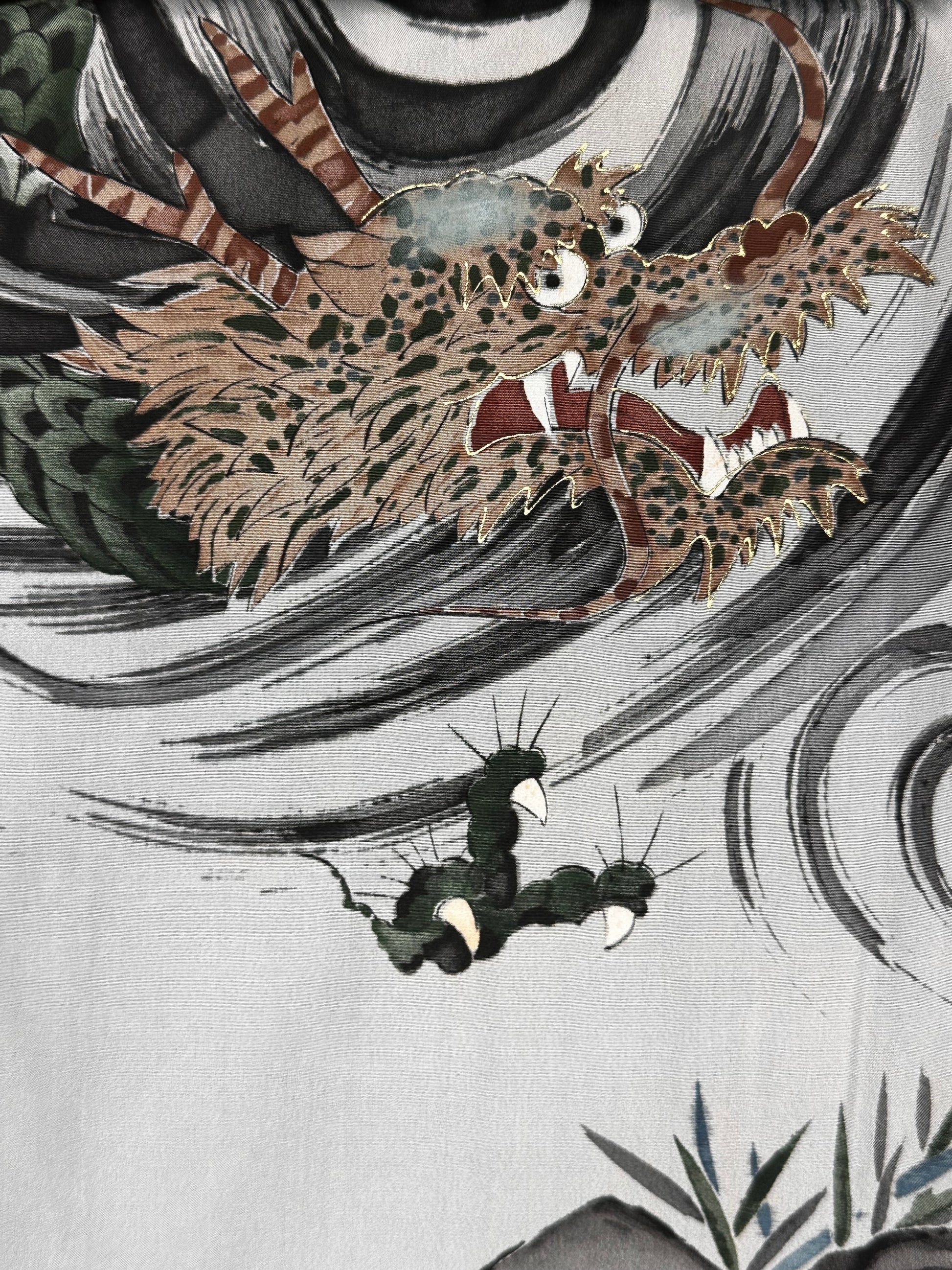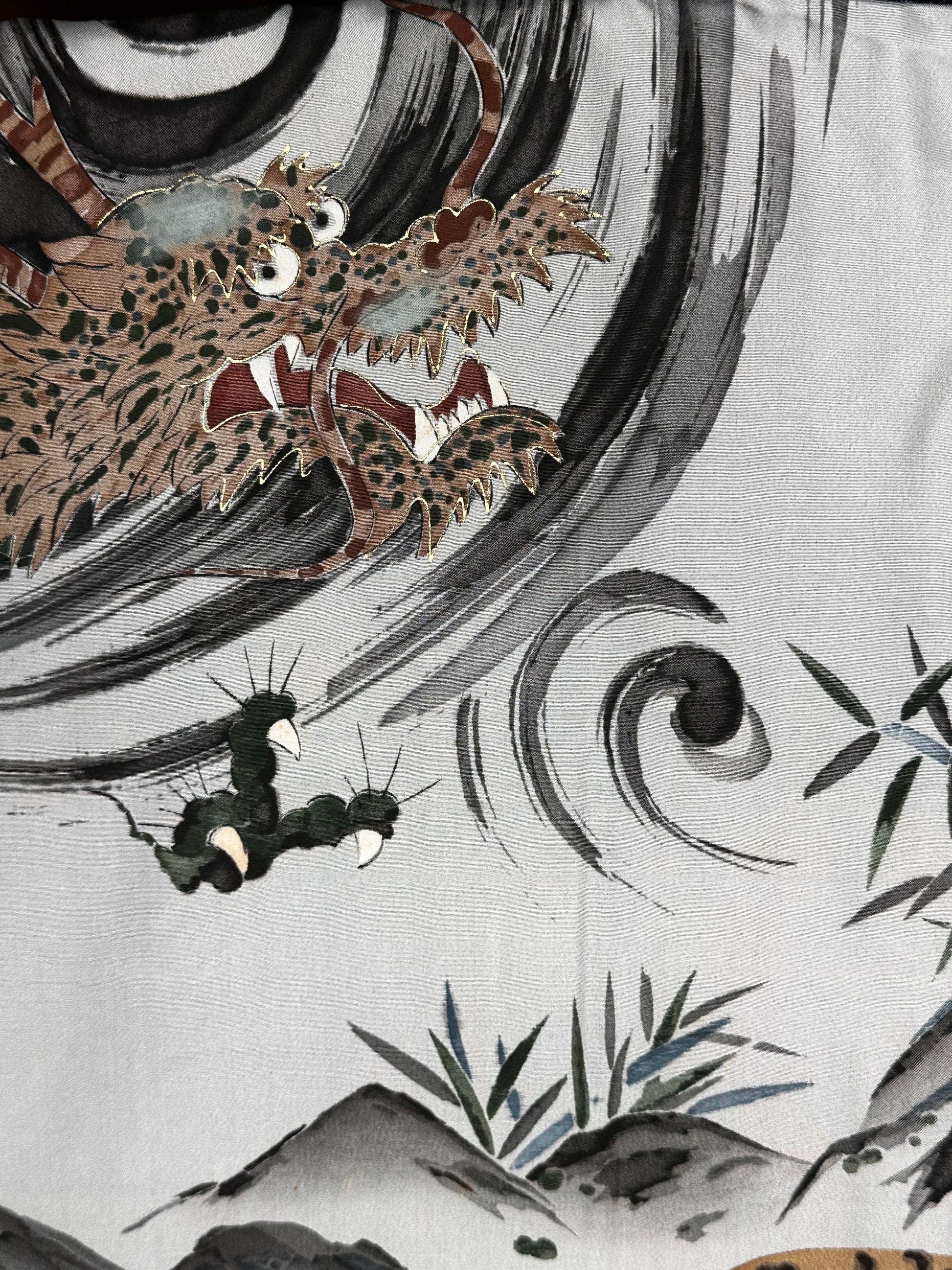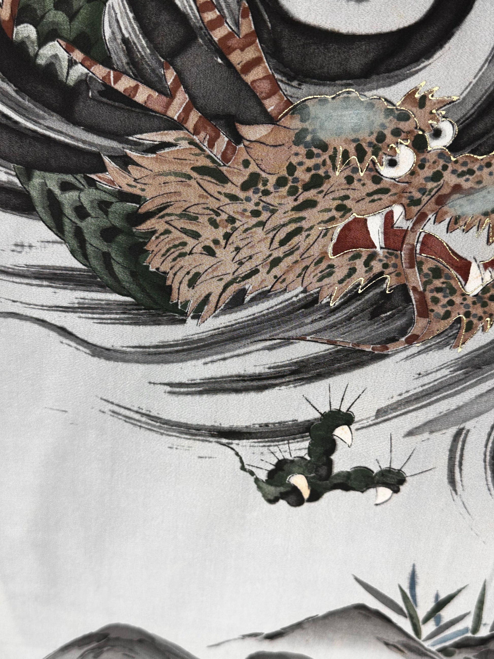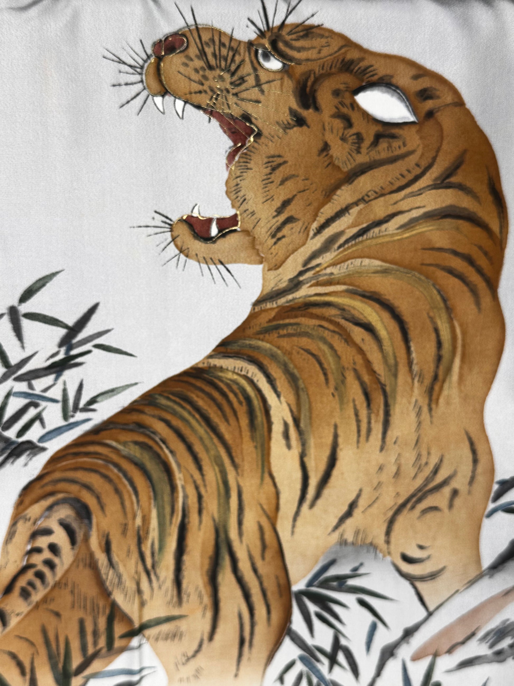 Kangas: Tsumugi-silkkipäällinen ja pehmeä, käsinmaalattu silkkivuori. Kultaiset yksityiskohdat korostavat tiikeriä, lohikäärmettä ja maisemaa, lisäten ulottuvuutta ja visuaalista rikkautta.