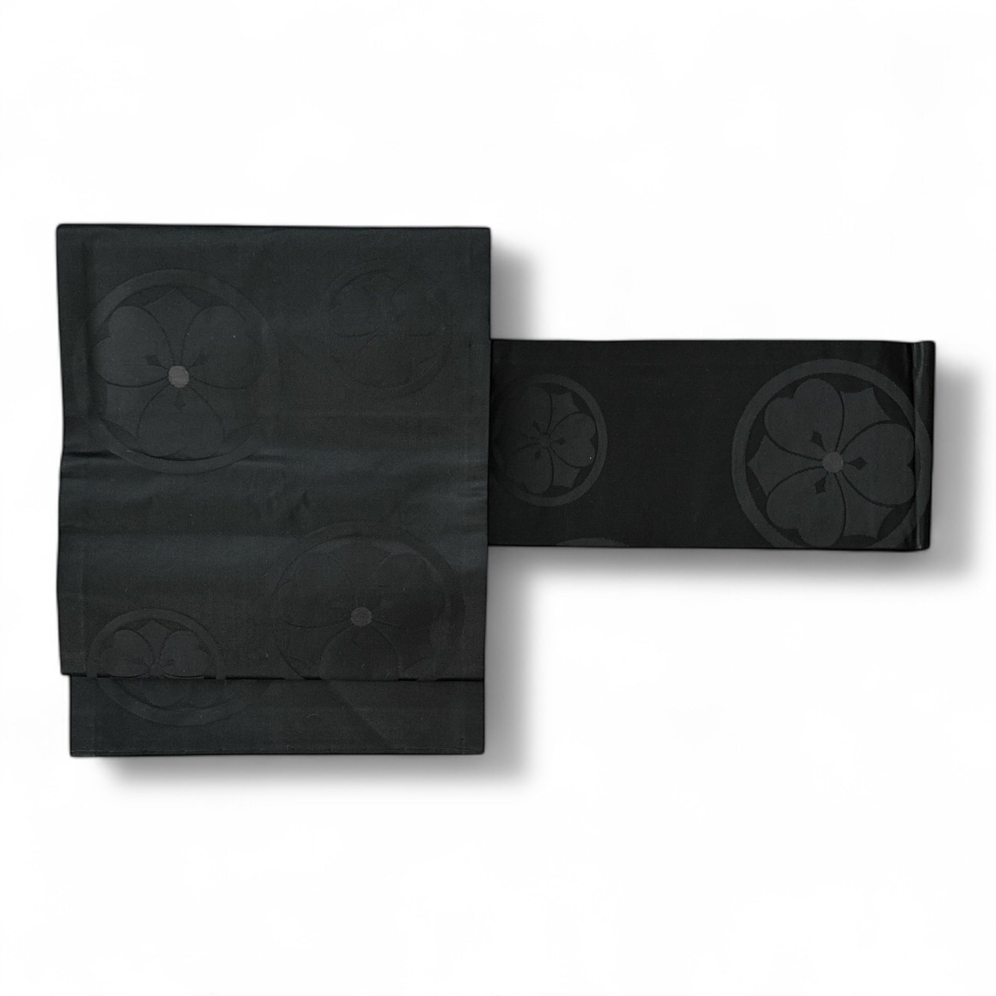 Kuvaus: Tämä upea Nagoya-obi on valmistettu hienoimmasta silkistä . Sen syvän, kiiltävän musta sävy säteilee eleganssia ja rikkautta. Sileä ja ylellinen kangas tarjoaa virheettömän taustan kauniisti kudotulle sakura- (kirsikankukka) kamonin kuviolle, joka on huolellisesti ripoteltu koko obin alueelle.