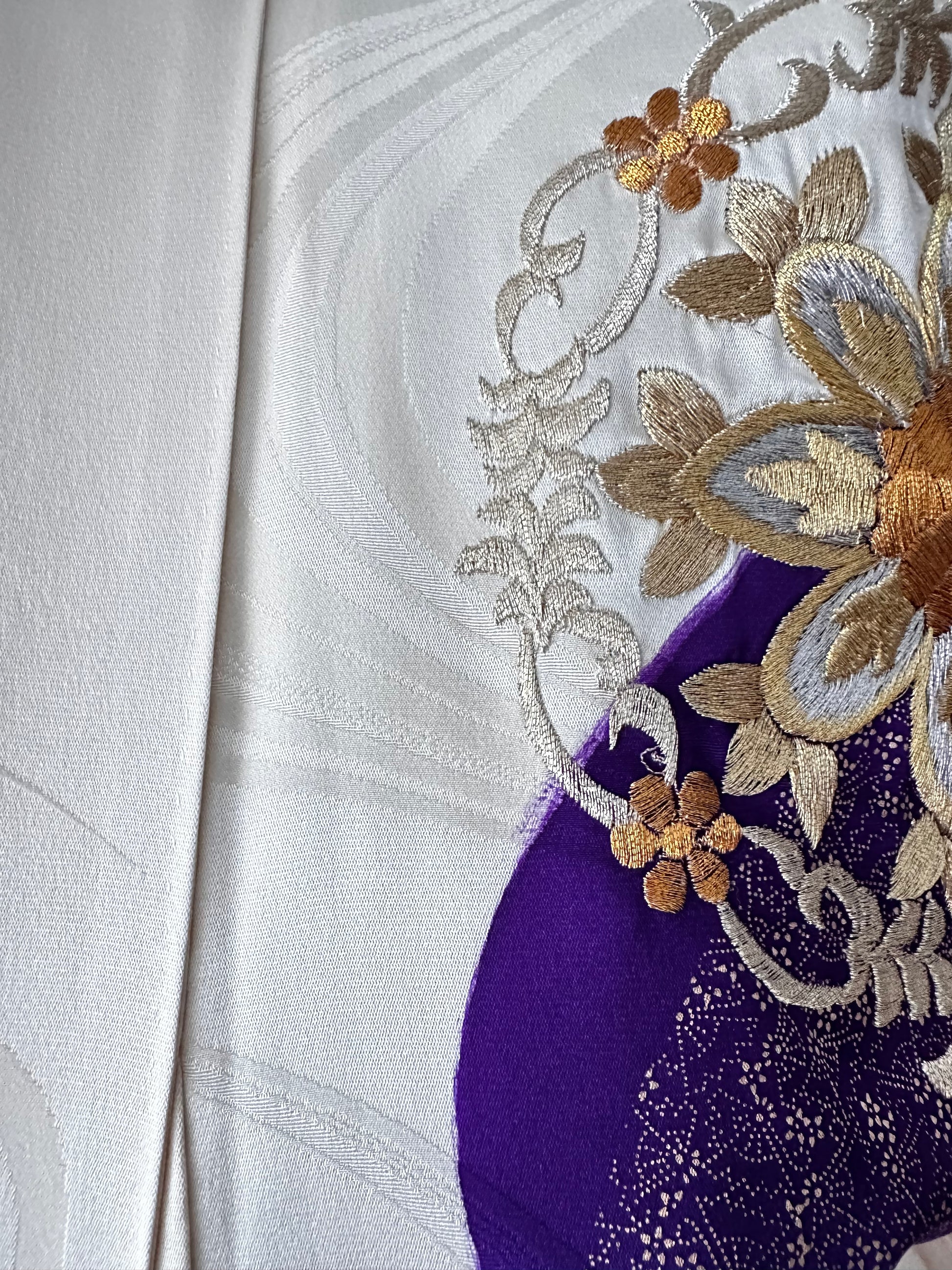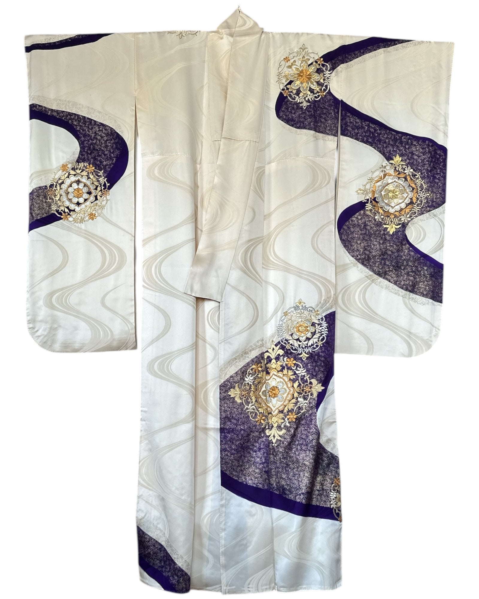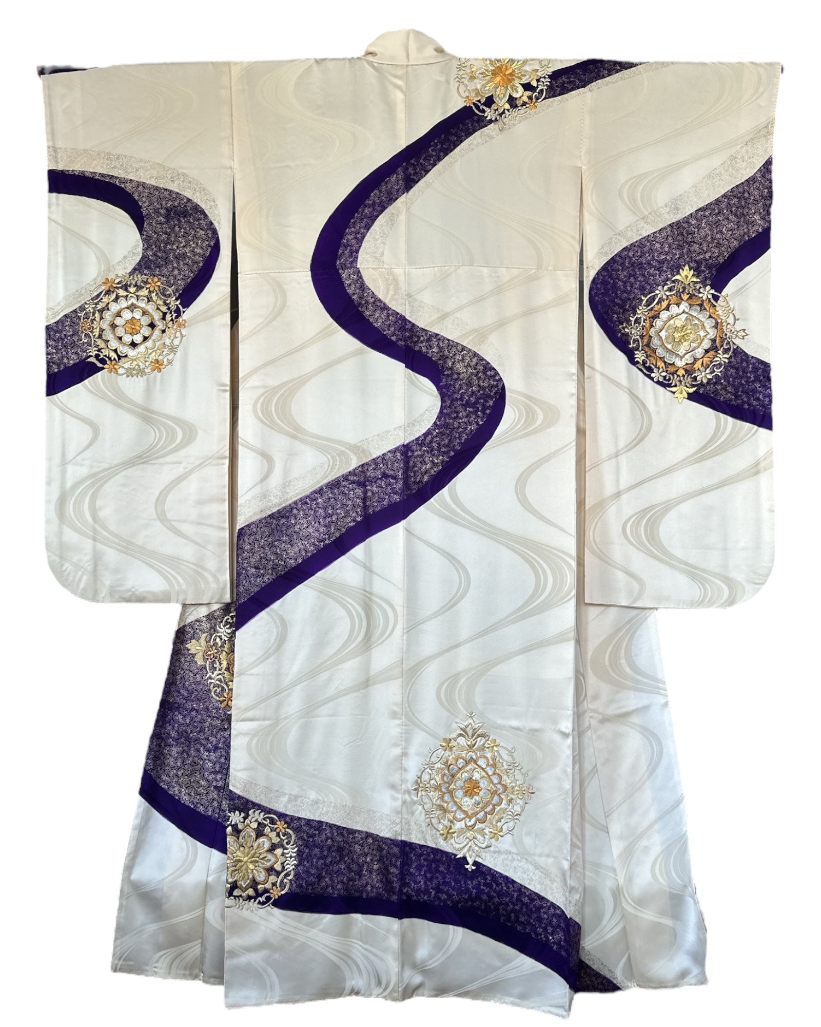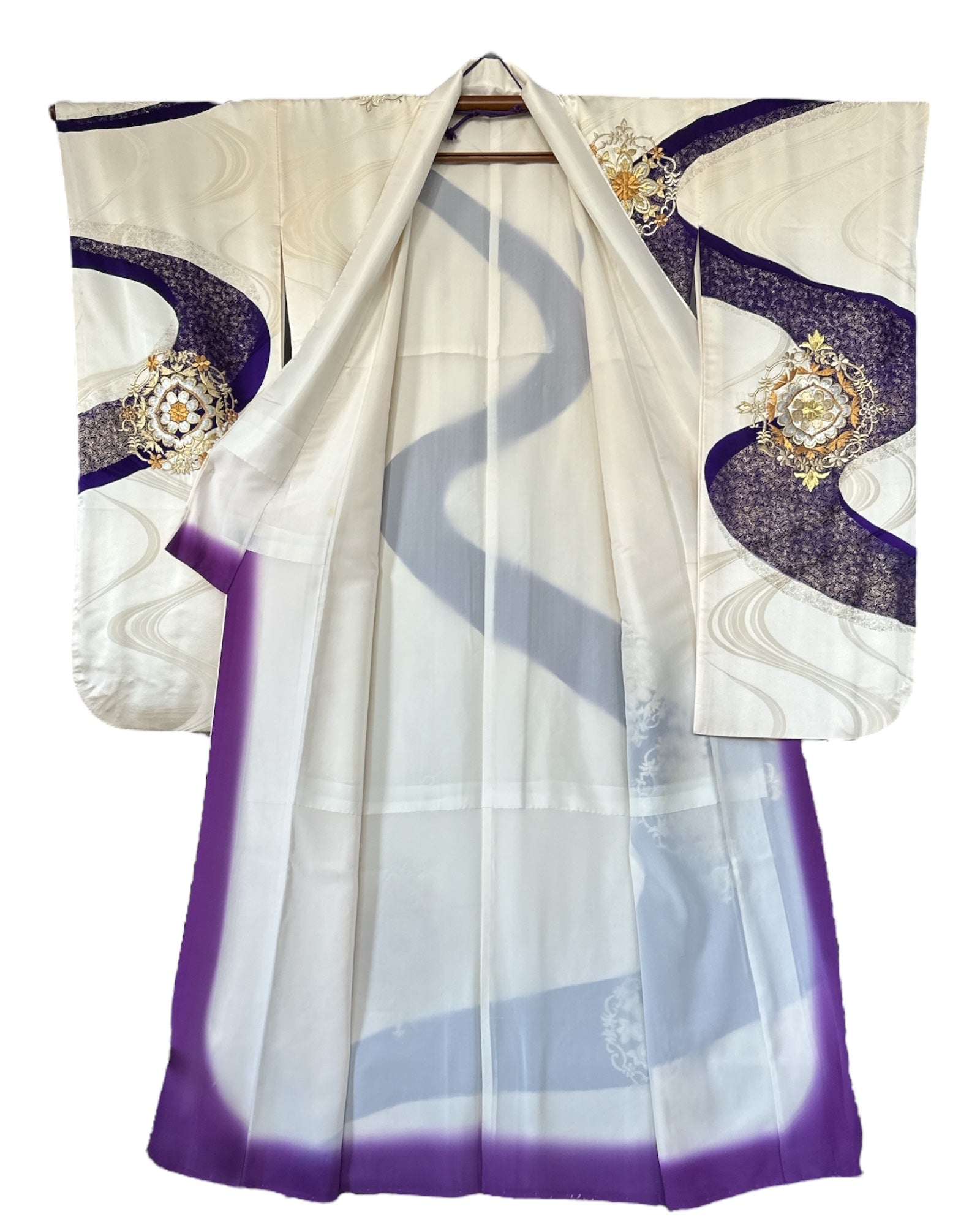 Tämä hieno naisten Furisode on upea sekoitus perinteistä käsityötaitoa ja eleganttia muotoilua. Ylellisestä rinzu-silkistä valmistettu pehmeä vaalean kermanvärinen pohja toimii täydellisenä kankaana kauniille, virtaavalle jokikuviolle, joka kulkee kankaan poikki. Rikkaan, syvän violetin värinen joki on rauhallisuuden ja jatkuvan virtauksen symboli, ja se edustaa usein elämän matkaa japanilaisessa kulttuurissa. Japanilaisessa kulttuurissa joet symboloivat ajan kulumista, elämän virtausta ja yhteyttä menneisyyden, nykyisyyden ja tulevaisuuden välillä, mikä tekee tästä motiivista erityisen merkityksellisen.