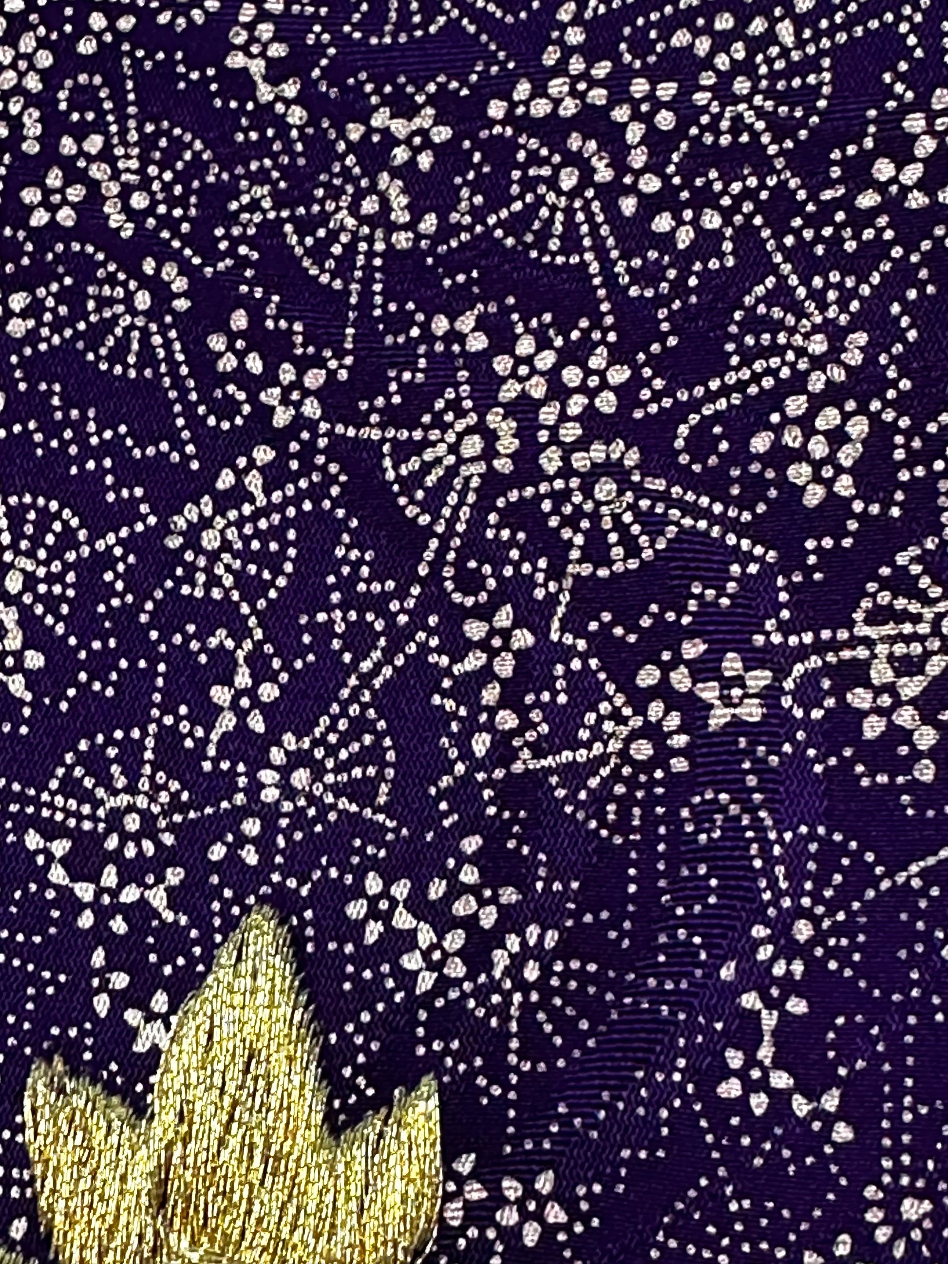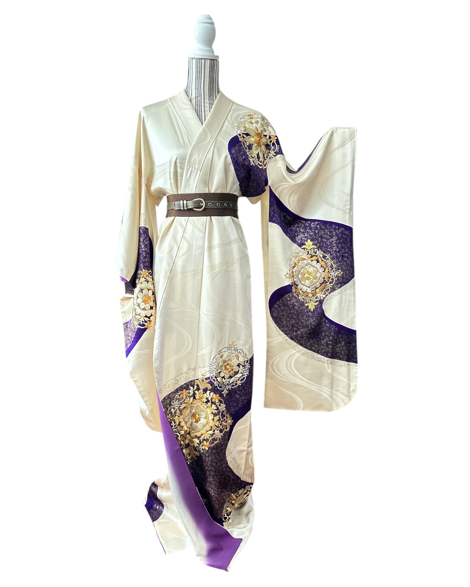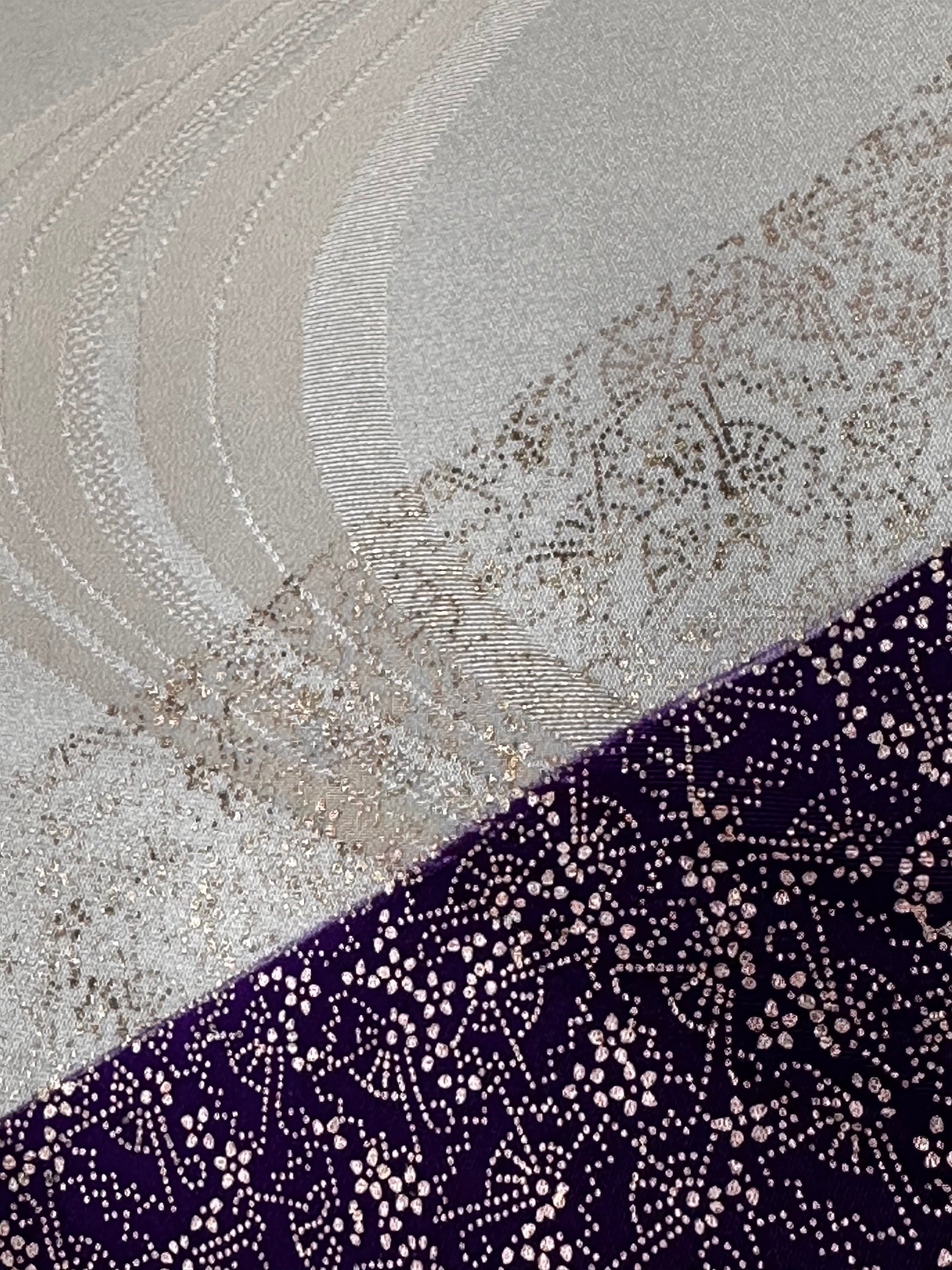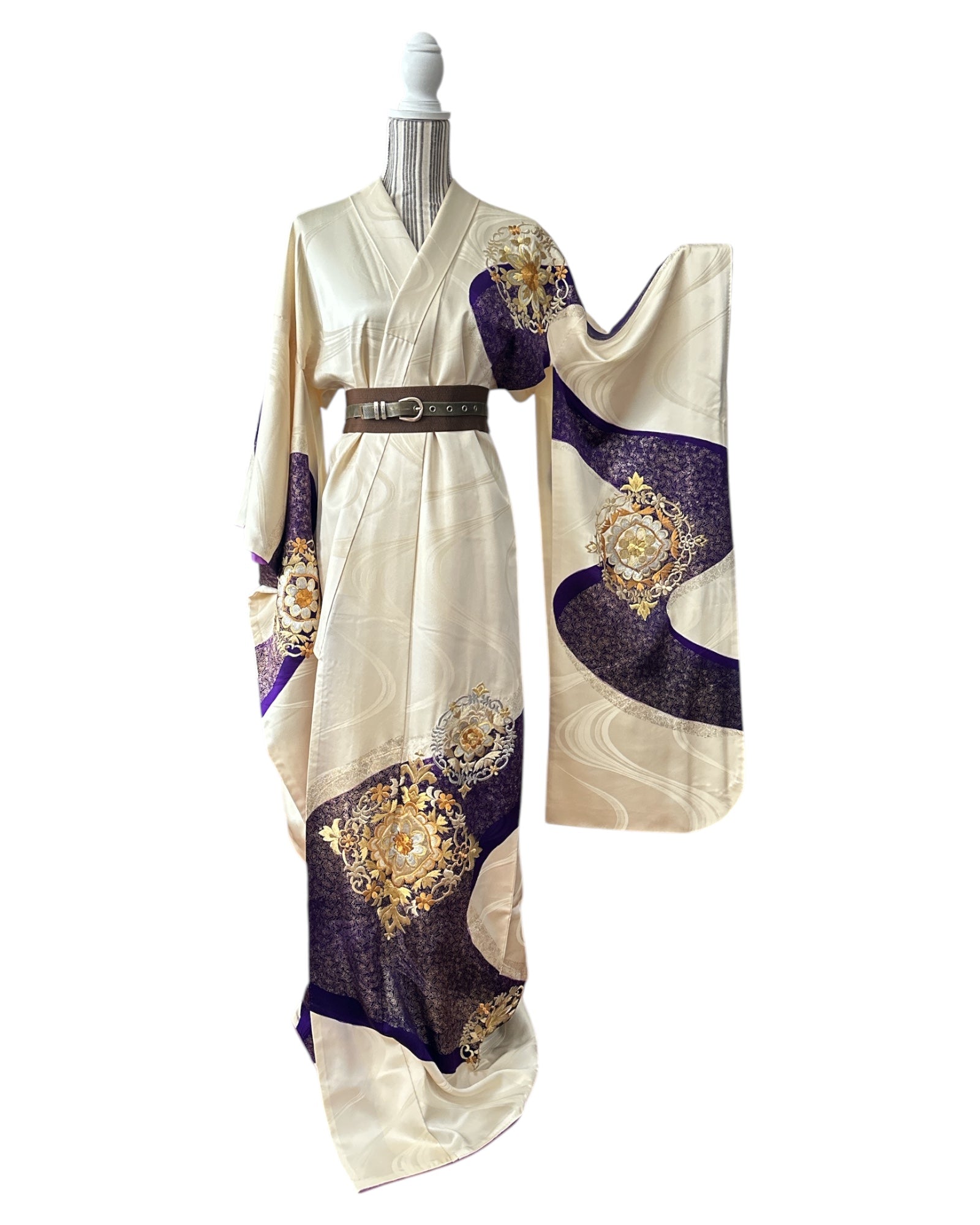 Tämä hieno naisten Furisode on upea sekoitus perinteistä käsityötaitoa ja eleganttia muotoilua. Ylellisestä rinzu-silkistä valmistettu pehmeä vaalean kermanvärinen pohja toimii täydellisenä kankaana kauniille, virtaavalle jokikuviolle, joka kulkee kankaan poikki. Rikkaan, syvän violetin värinen joki on rauhallisuuden ja jatkuvan virtauksen symboli, ja se edustaa usein elämän matkaa japanilaisessa kulttuurissa. Japanilaisessa kulttuurissa joet symboloivat ajan kulumista, elämän virtausta ja yhteyttä menneisyyden, nykyisyyden ja tulevaisuuden välillä, mikä tekee tästä motiivista erityisen merkityksellisen.