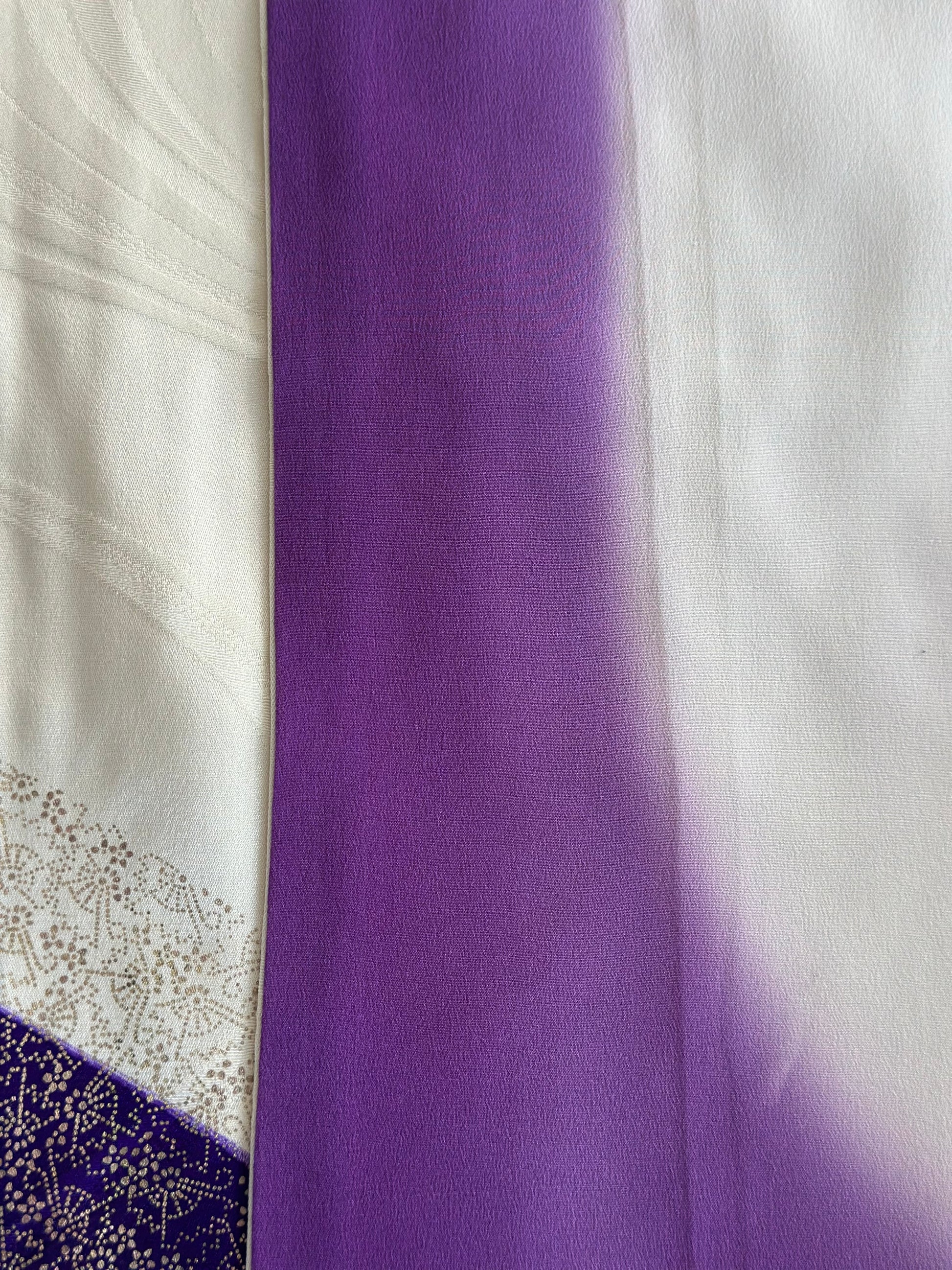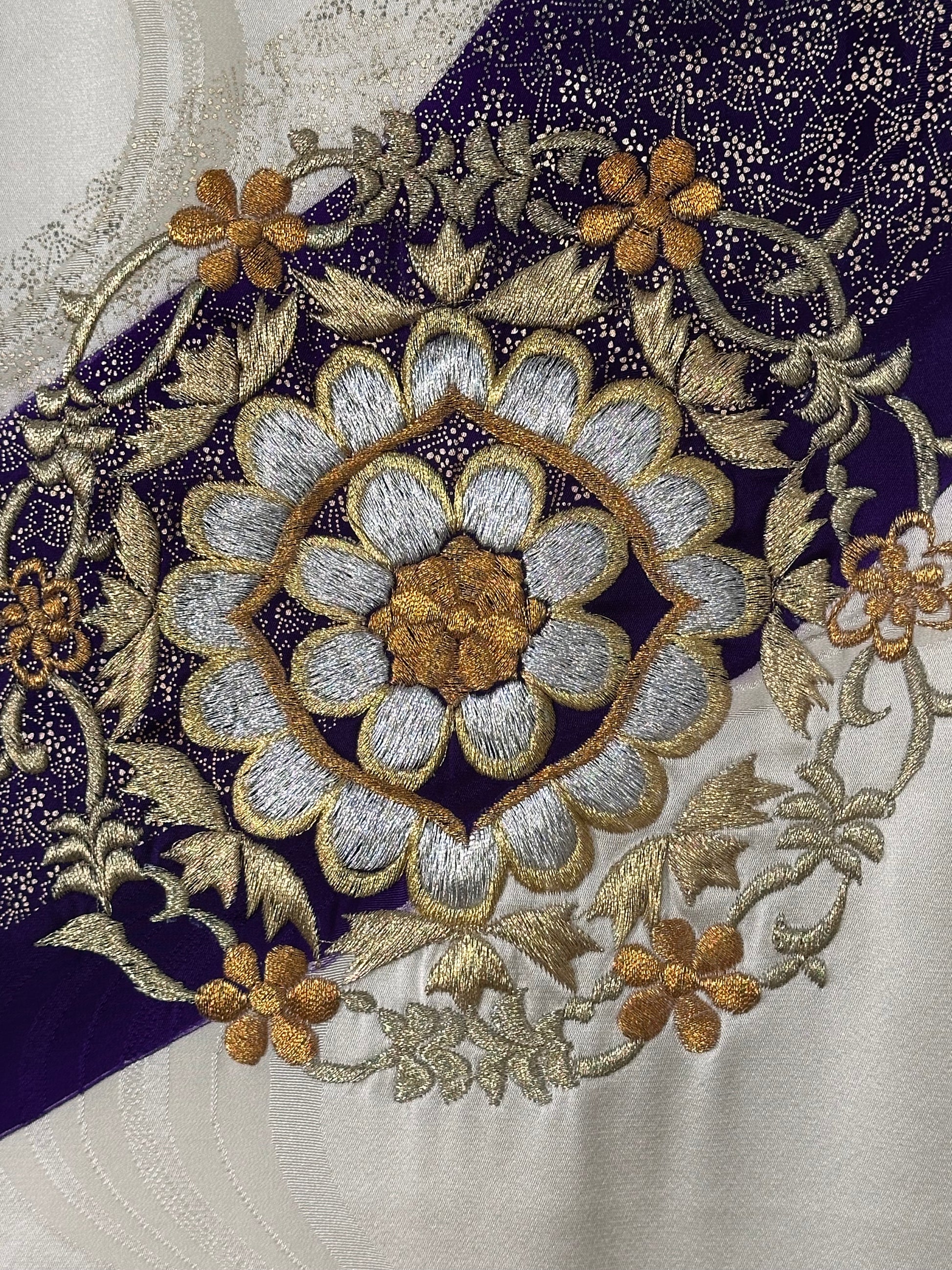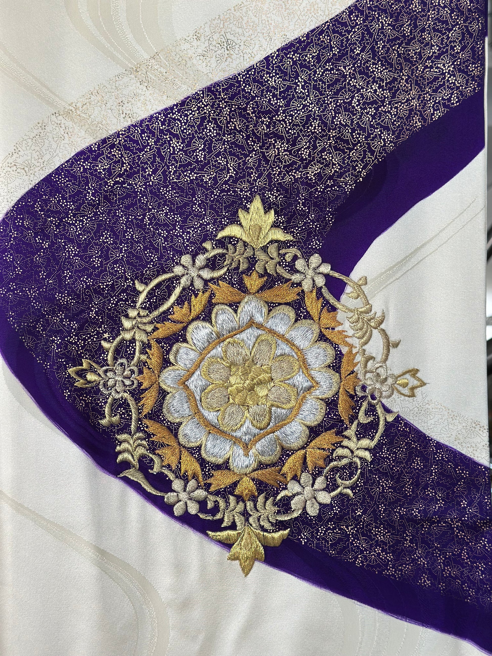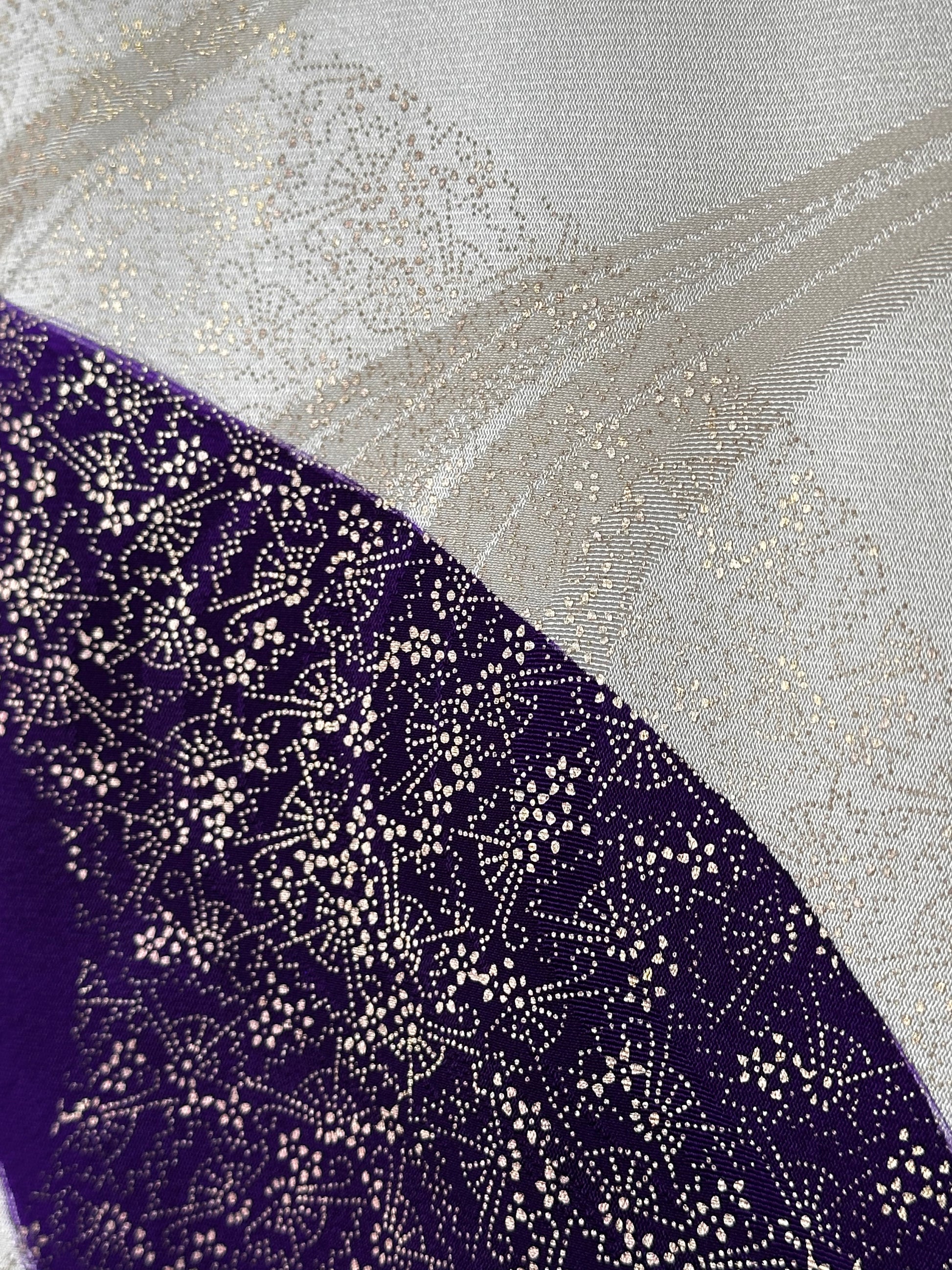 Tämä hieno naisten Furisode on upea sekoitus perinteistä käsityötaitoa ja eleganttia muotoilua. Ylellisestä rinzu-silkistä valmistettu pehmeä vaalean kermanvärinen pohja toimii täydellisenä kankaana kauniille, virtaavalle jokikuviolle, joka kulkee kankaan poikki. Rikkaan, syvän violetin värinen joki on rauhallisuuden ja jatkuvan virtauksen symboli, ja se edustaa usein elämän matkaa japanilaisessa kulttuurissa. Japanilaisessa kulttuurissa joet symboloivat ajan kulumista, elämän virtausta ja yhteyttä menneisyyden, nykyisyyden ja tulevaisuuden välillä, mikä tekee tästä motiivista erityisen merkityksellisen.