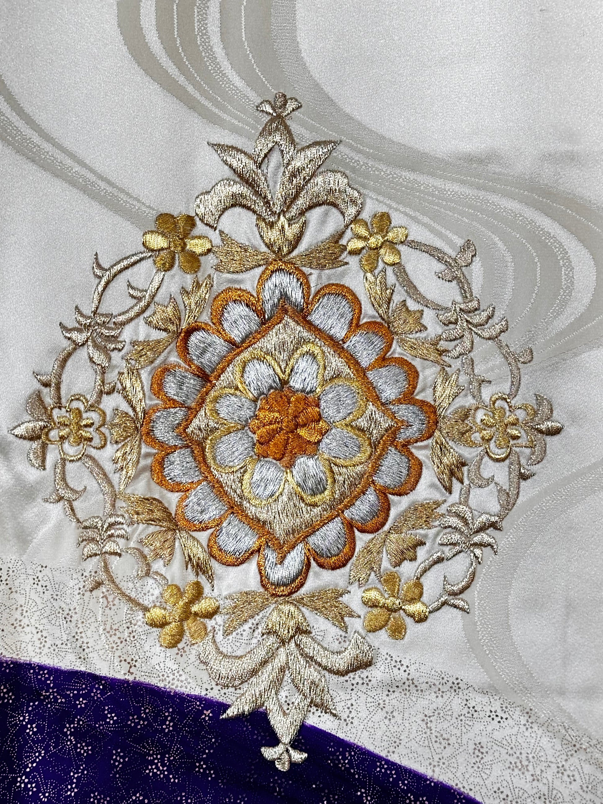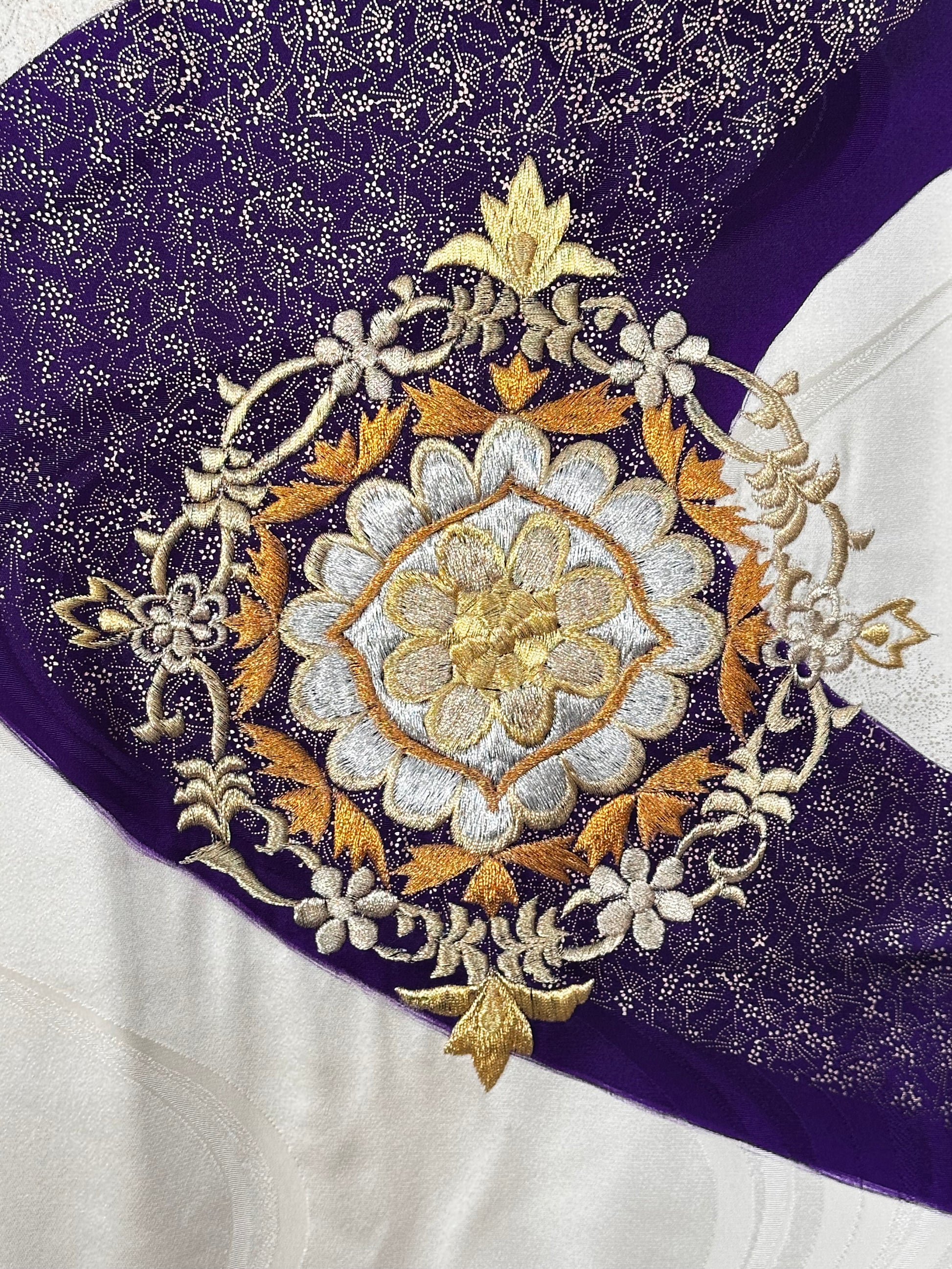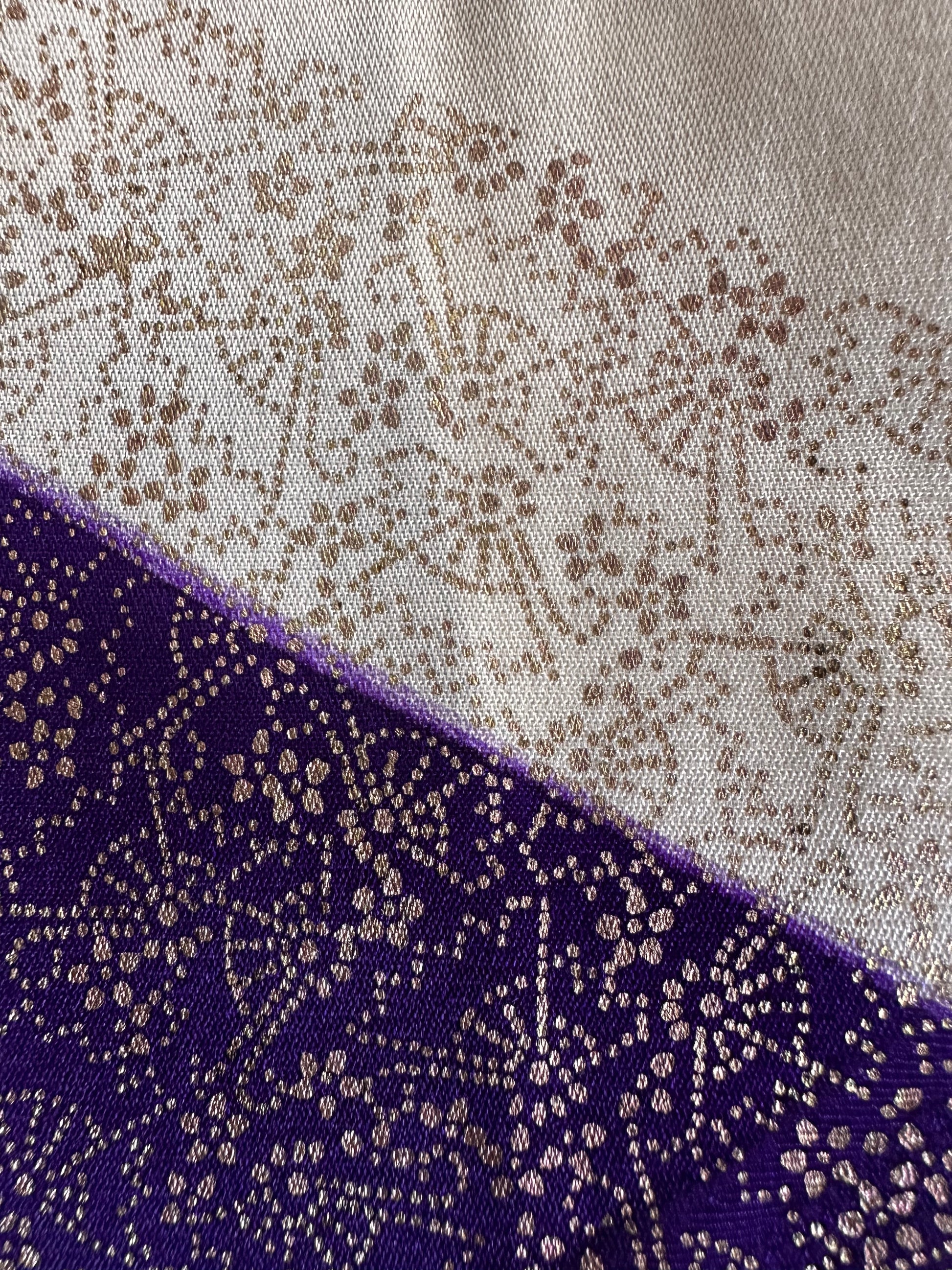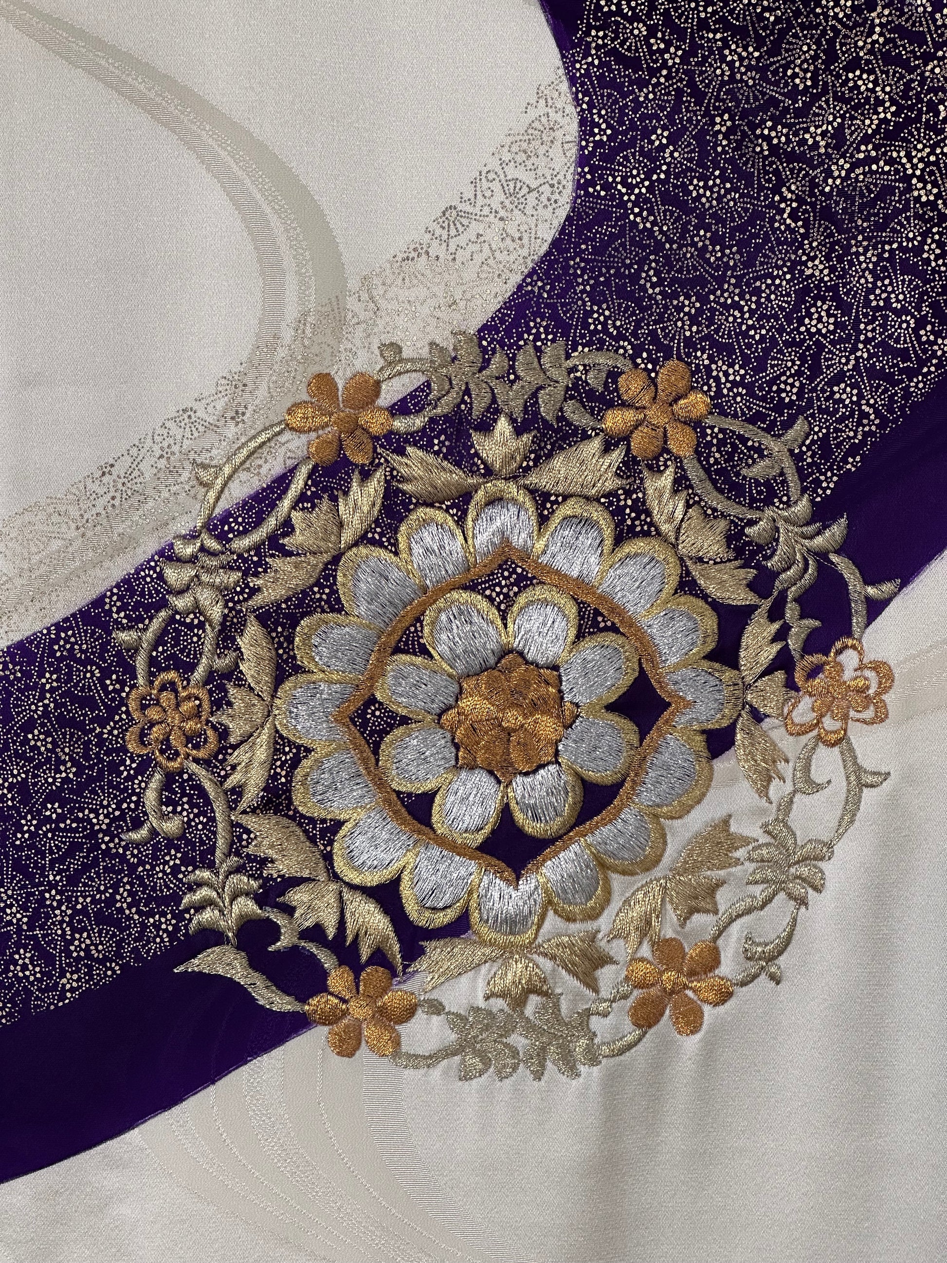 Tämä hieno naisten Furisode on upea sekoitus perinteistä käsityötaitoa ja eleganttia muotoilua. Ylellisestä rinzu-silkistä valmistettu pehmeä vaalean kermanvärinen pohja toimii täydellisenä kankaana kauniille, virtaavalle jokikuviolle, joka kulkee kankaan poikki. Rikkaan, syvän violetin värinen joki on rauhallisuuden ja jatkuvan virtauksen symboli, ja se edustaa usein elämän matkaa japanilaisessa kulttuurissa. Japanilaisessa kulttuurissa joet symboloivat ajan kulumista, elämän virtausta ja yhteyttä menneisyyden, nykyisyyden ja tulevaisuuden välillä, mikä tekee tästä motiivista erityisen merkityksellisen.
