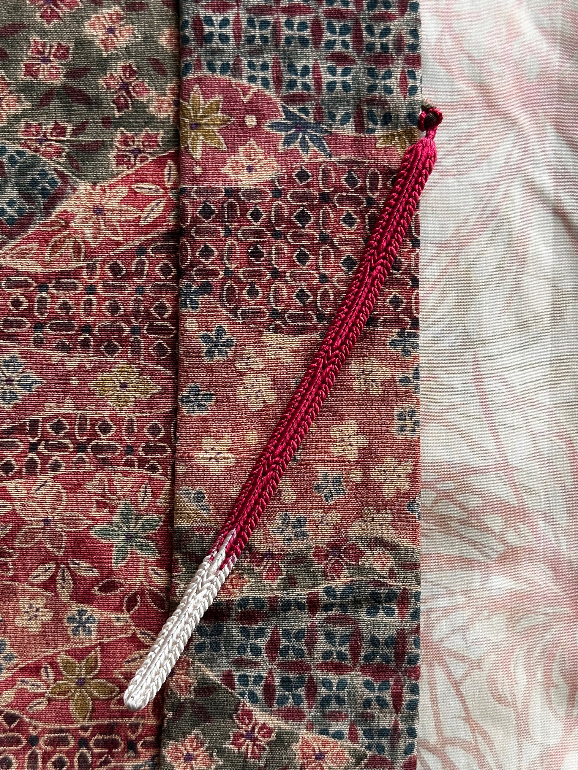 Haori on värjätty syvin, maanläheisin sävyin – tummanpunaiseksi, indigoksi, hillityksi vihreäksi ja ruskeaksi – mikä luo harmonisen ja maanläheisen paletin, joka korostaa esineen käsityötaitoa ja ajatonta eleganssia.