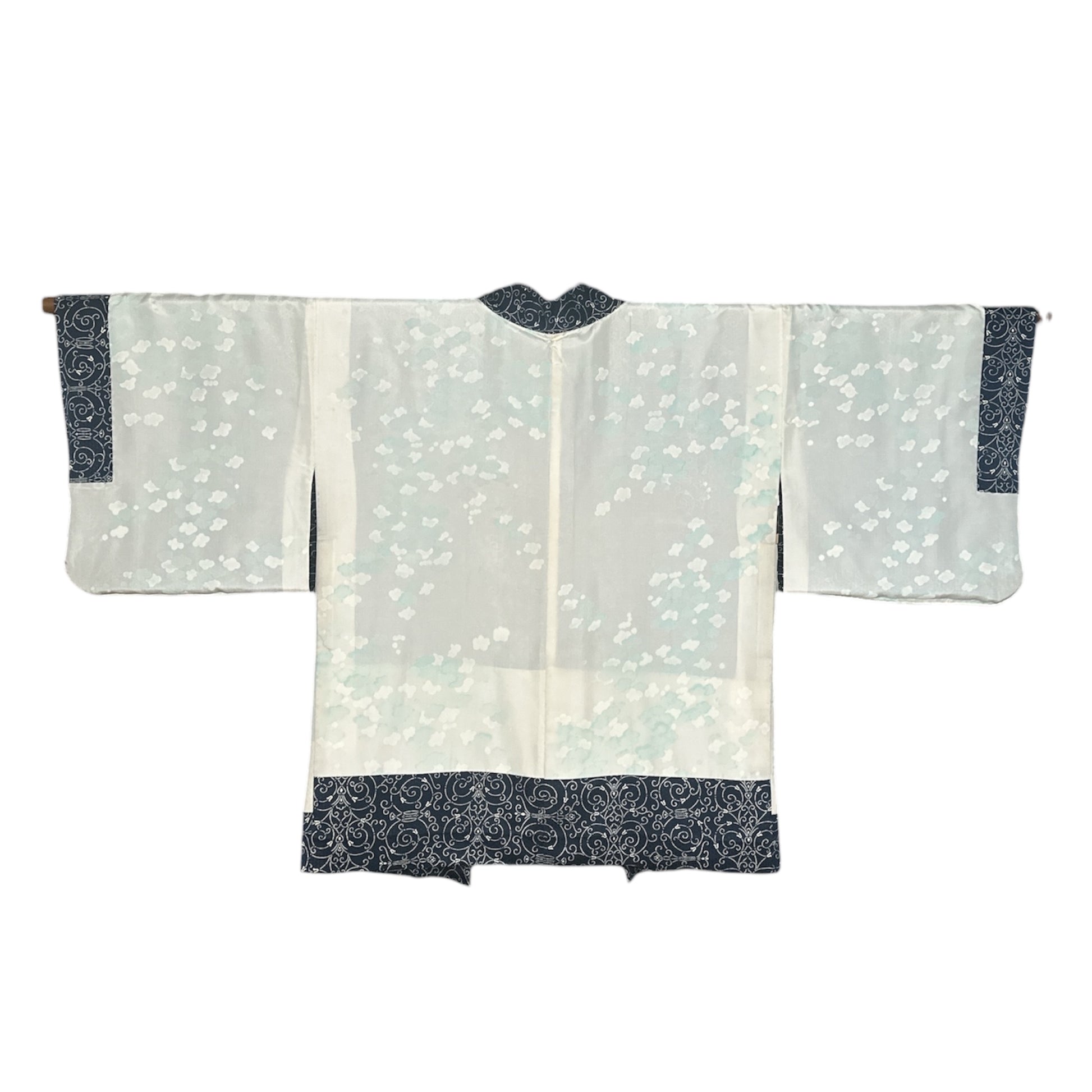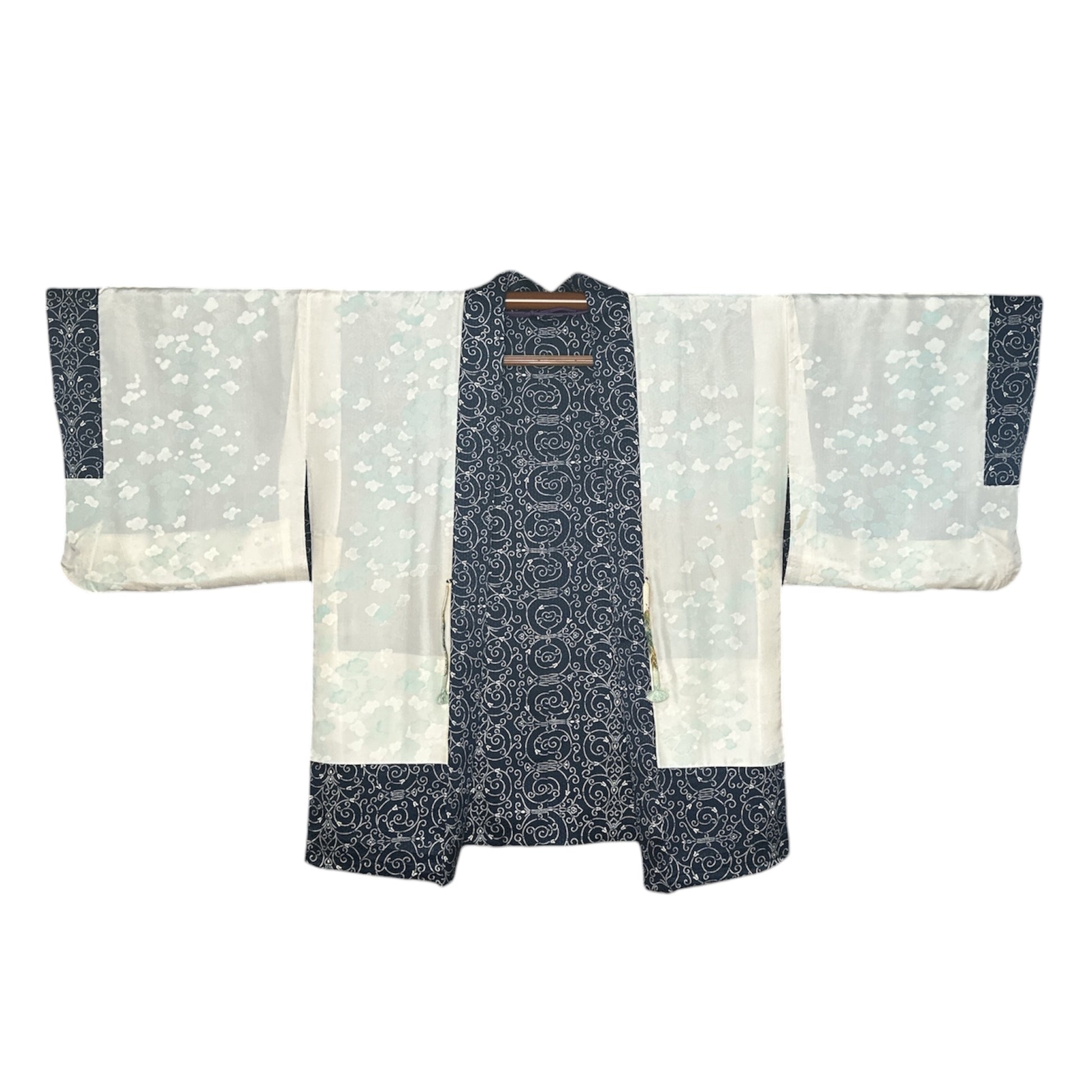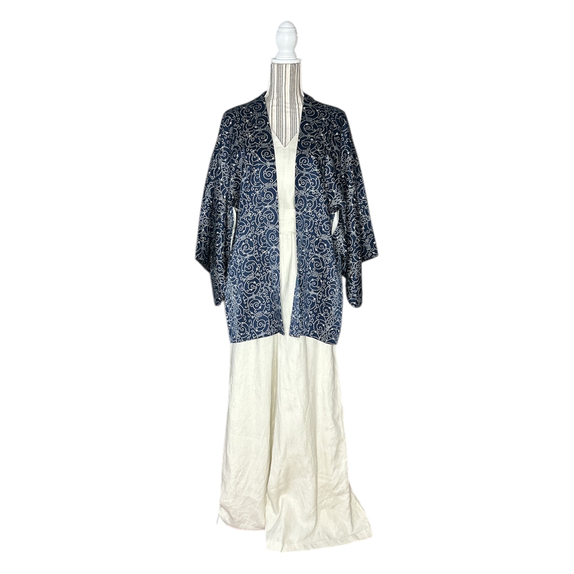 Kuvaus: Tämä naisten vintage-haori on ajaton vaatekappale, joka on valmistettu rinzu-tyylisestä synteettisestä silkistä. Sen rikas tummansininen pohja on koristeltu monimutkaisilla valkoisilla kukkakuvioilla. Hienosti yksityiskohtaiset kuviot luovat eleganssin ja hienostuneen tekstuurin tunteen, mikä tekee siitä monipuolisen kerrospukeutumisvaatteen sekä perinteiseen kimonoon että moderniin tyyliin. Vaatekappale on viimeistelty haori himolla (koristeellisilla kiinnitysnauhoilla), jotka säilyttävät sen perinteisen muodon ja toiminnon.