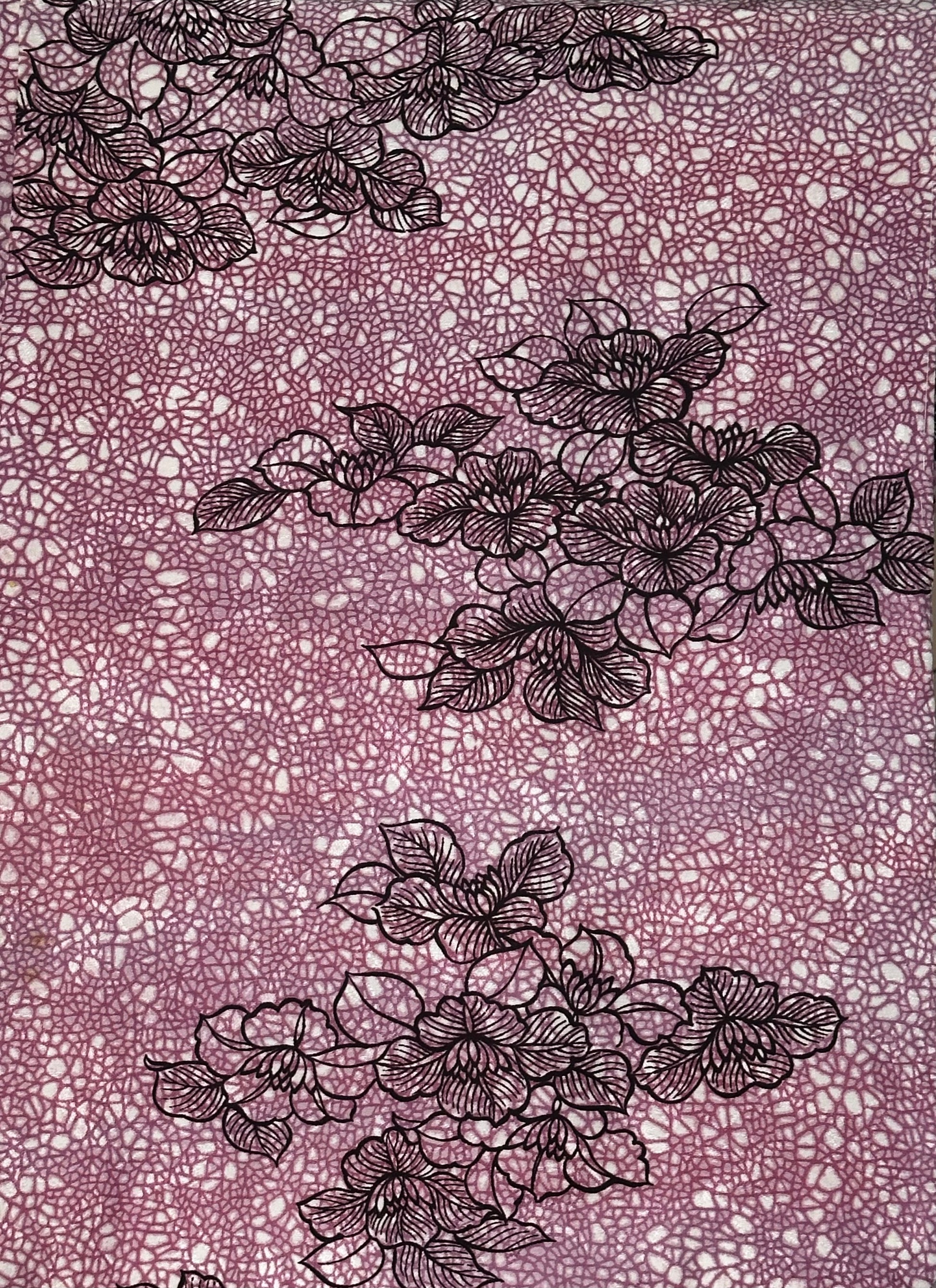Kangas: Korkealaatuinen Rinzu-silkkiä , jossa on kudottu geometrinen kuvio ja käsinmaalatut kukka-aiheet, jotka tarjoavat sekä tekstuuria että visuaalista syvyyttä.