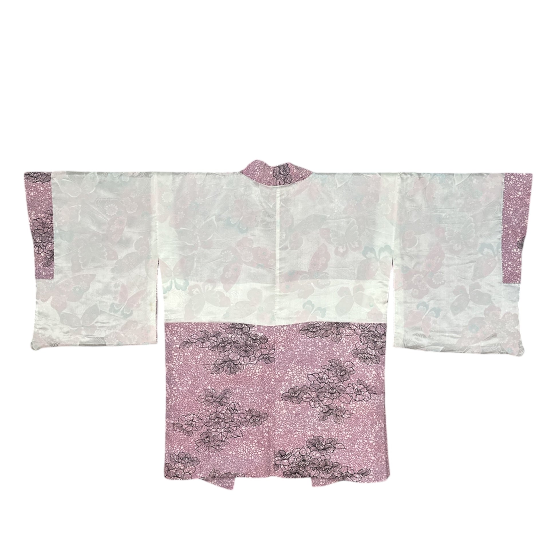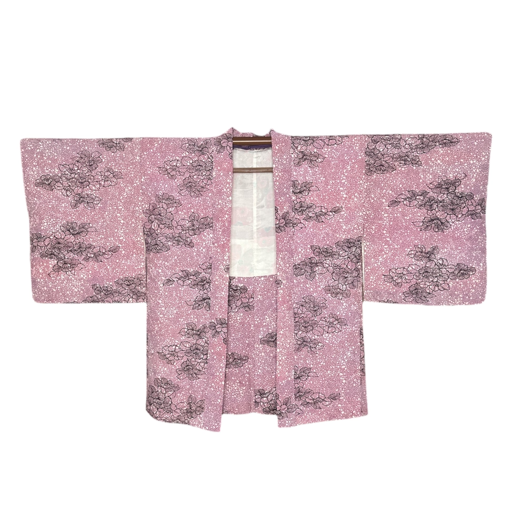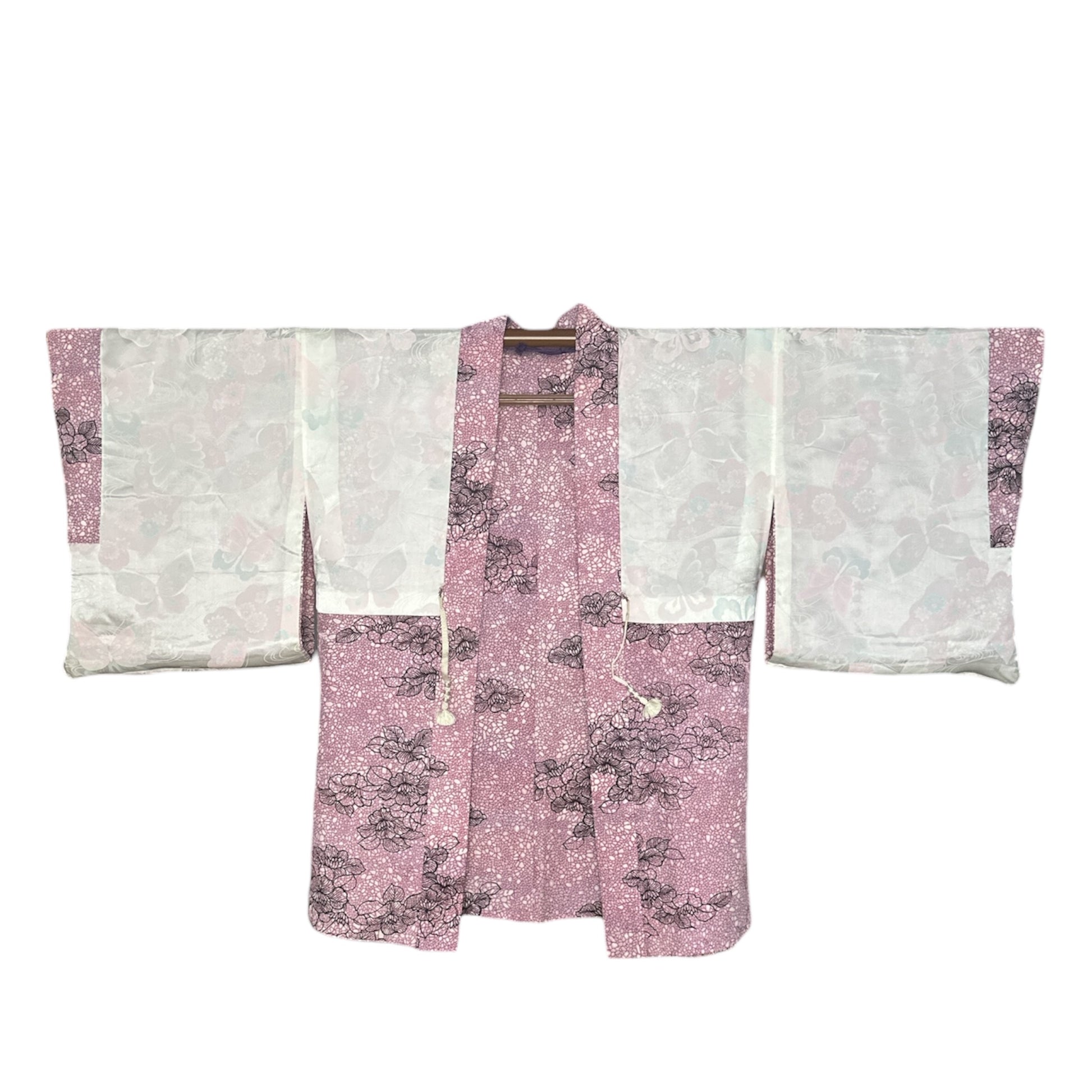 Kuvaus: Tämä naisten vintage-haori on valmistettu elegantista rinzu-silkistä , jossa hienovarainen rakenne ja rohkea muotoilu ovat tasapainossa. Rinzu-kudos luo pehmeän ja kiiltävän vaikutelman, joka heijastaa valoa kevyesti ja lisää kankaaseen syvyyttä. Pohjassa on valkoinen geometrinen kuvio vaaleanviolettia taustaa vasten, muodostaen rauhallisen ja hienostuneen taustan.