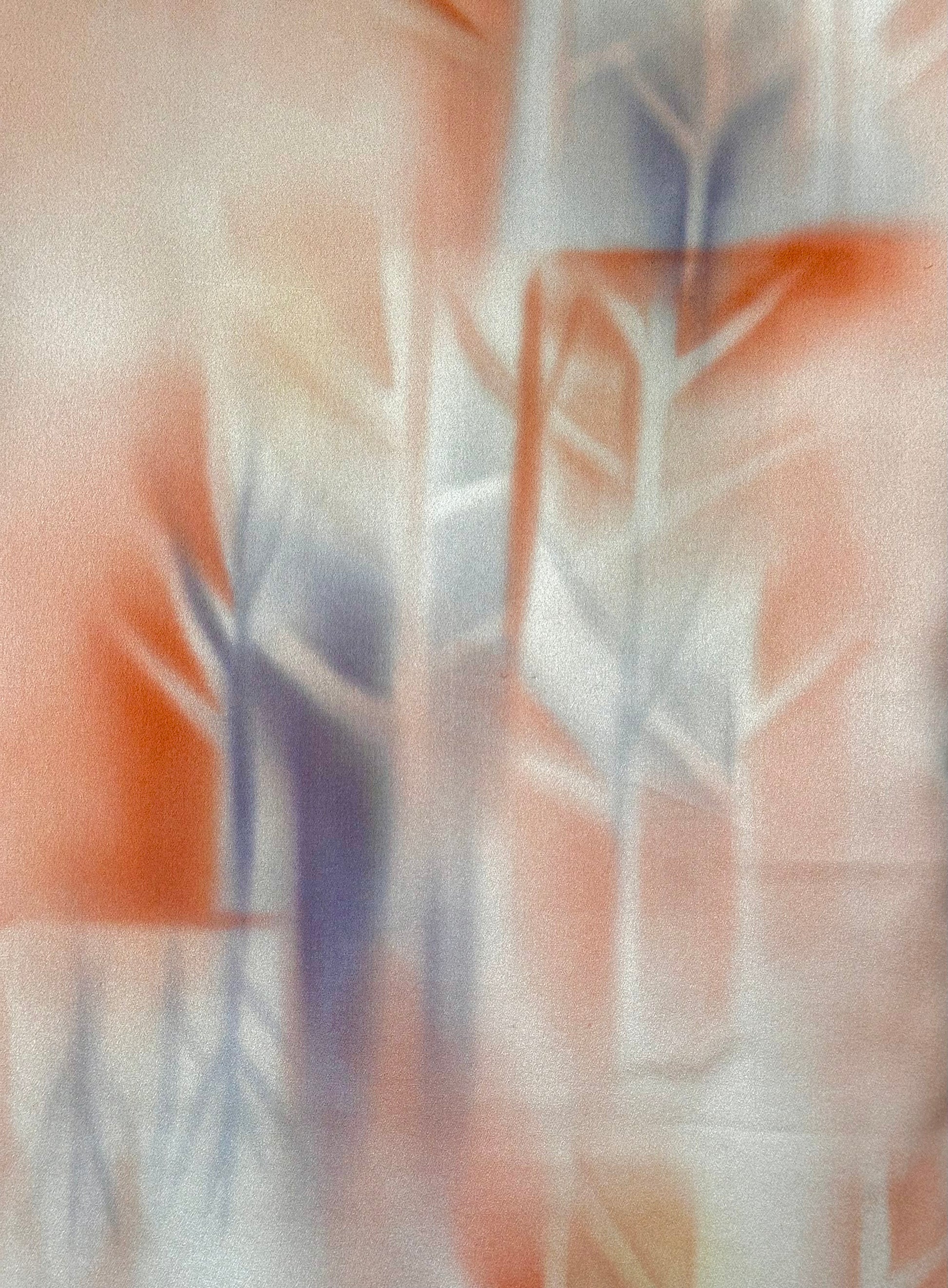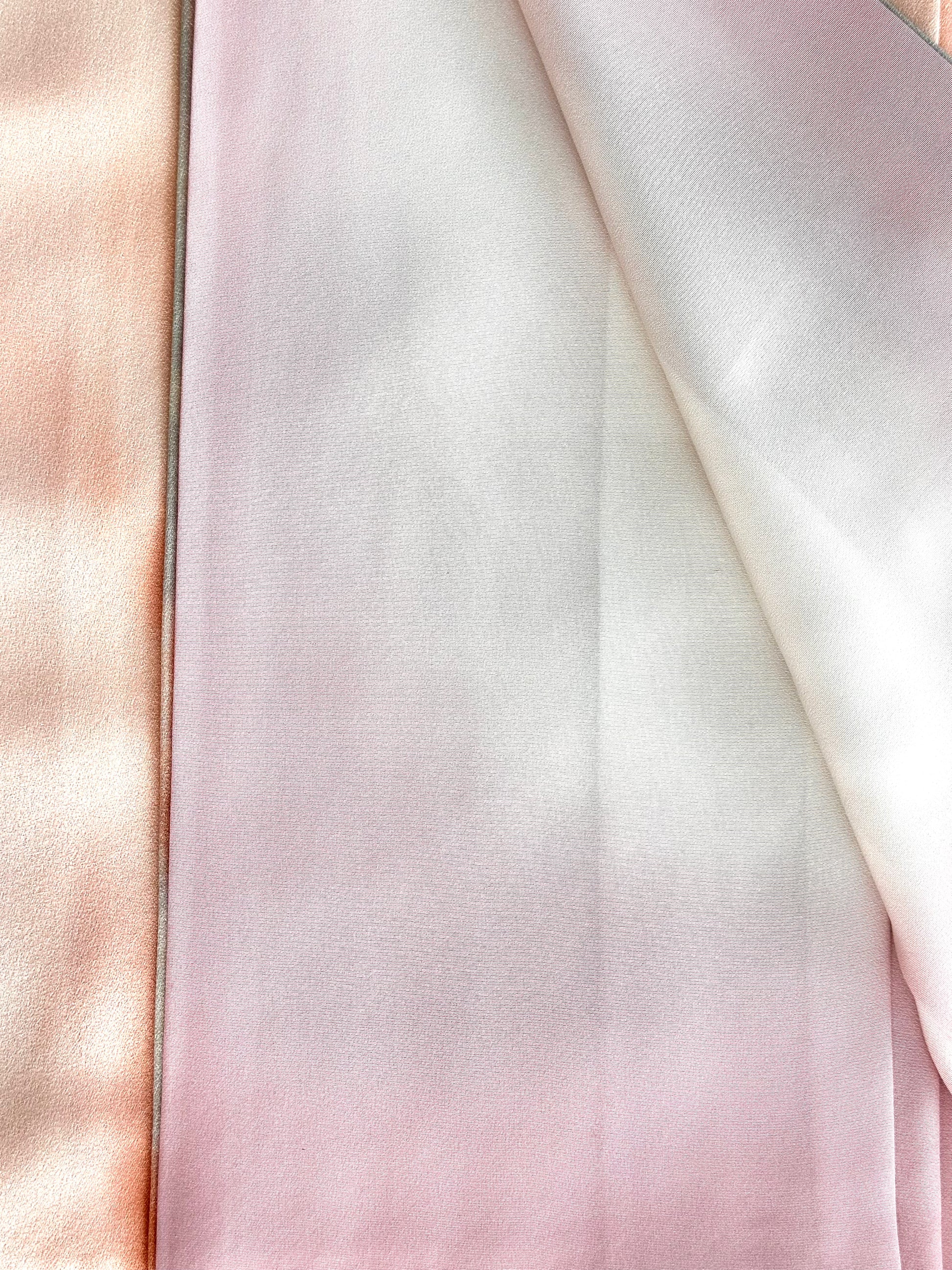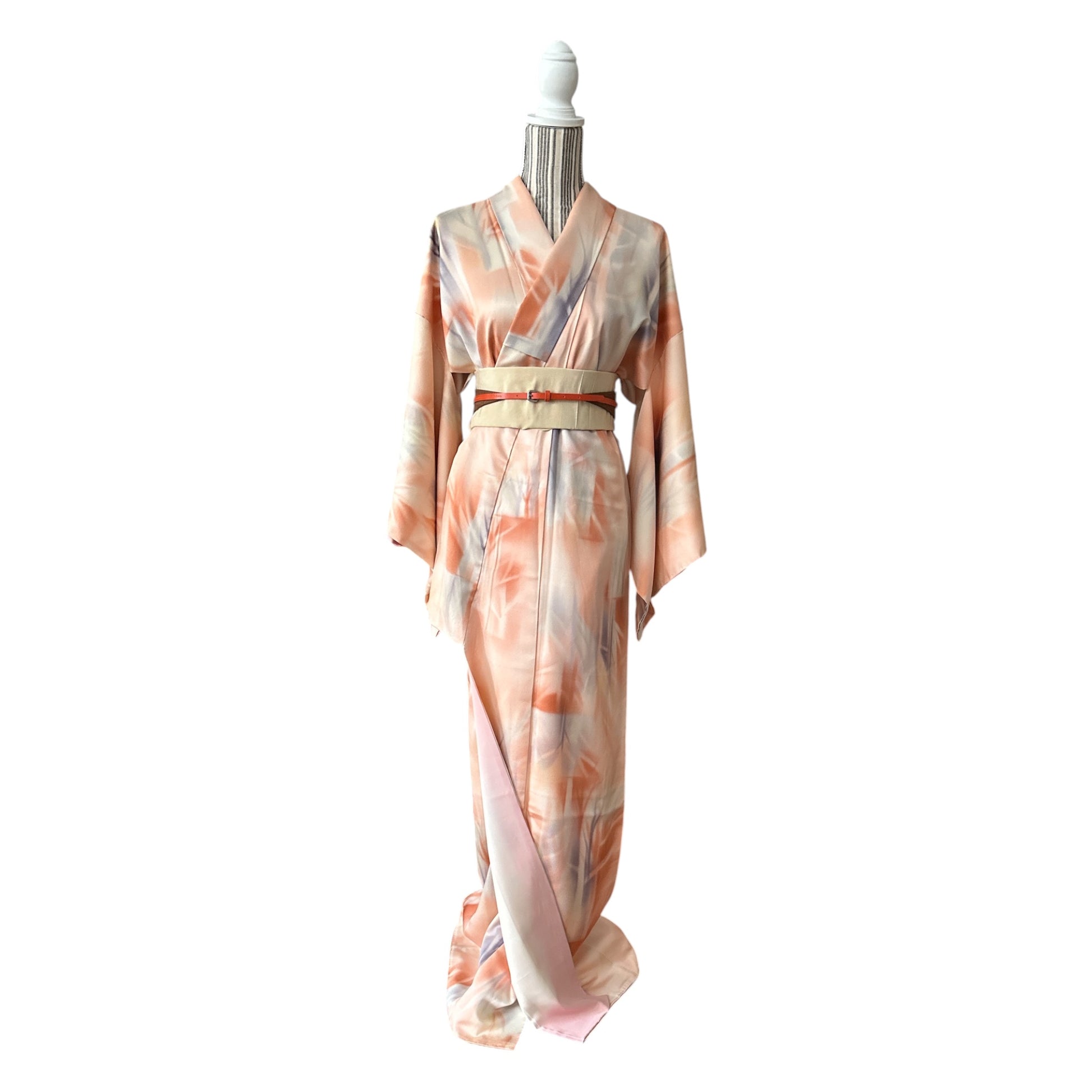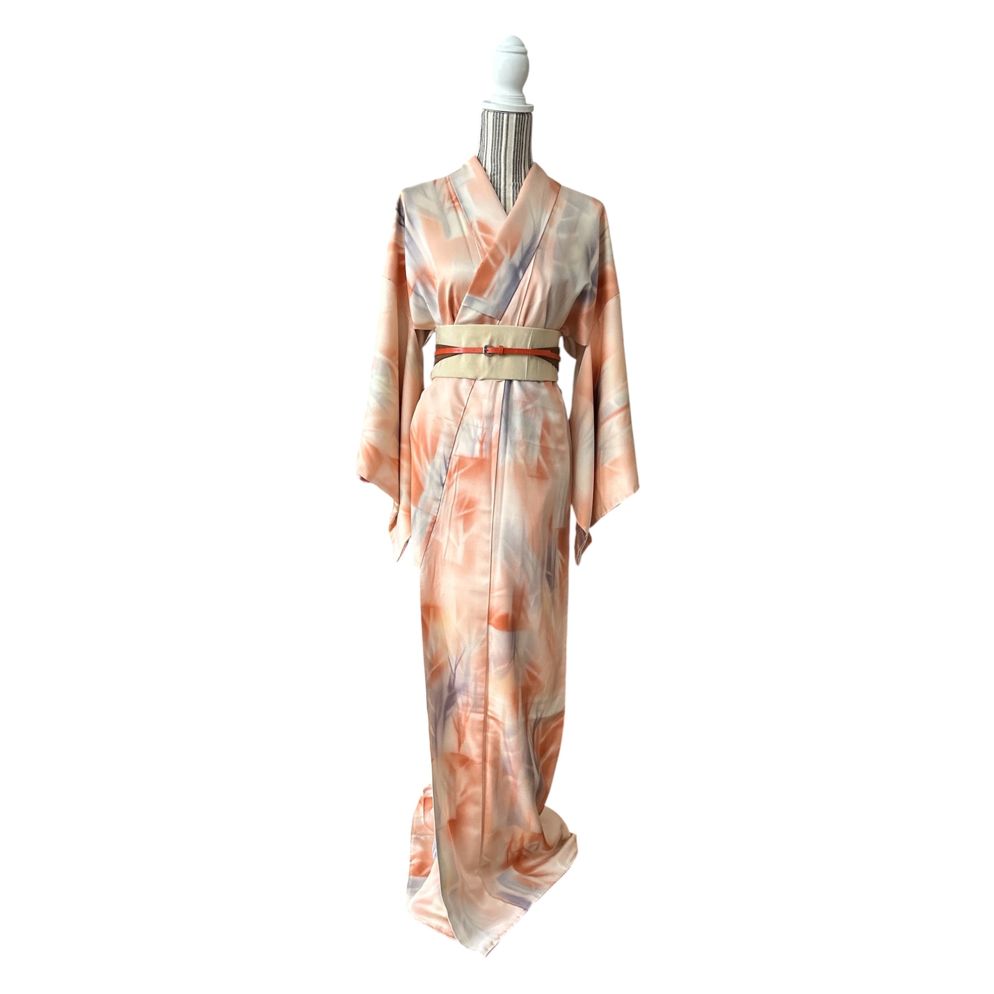 Kuvaus : Tämä hieno vintage-silkkinen Komon-kimono on unelmoivan pastellivärisävyinen, jossa on pehmeän persikan, vaalean laventelin ja taivaansinisen sävyjä. Muotoilu muistuttaa sumuun haalistuvia bambusiluetteja, jotka luovat seesteisen ja eteerisen ilmeen. Elegantti ja kevyt kimono laskeutuu kauniisti ja lisää ajatonta japanilaista eleganssia mihin tahansa vaatekaappiin tai kokoelmaan.