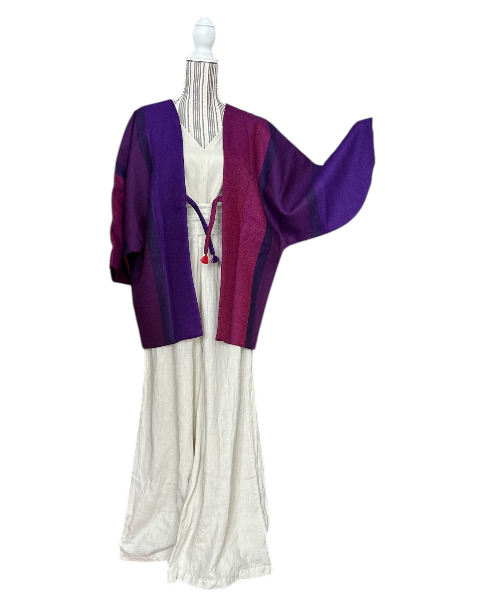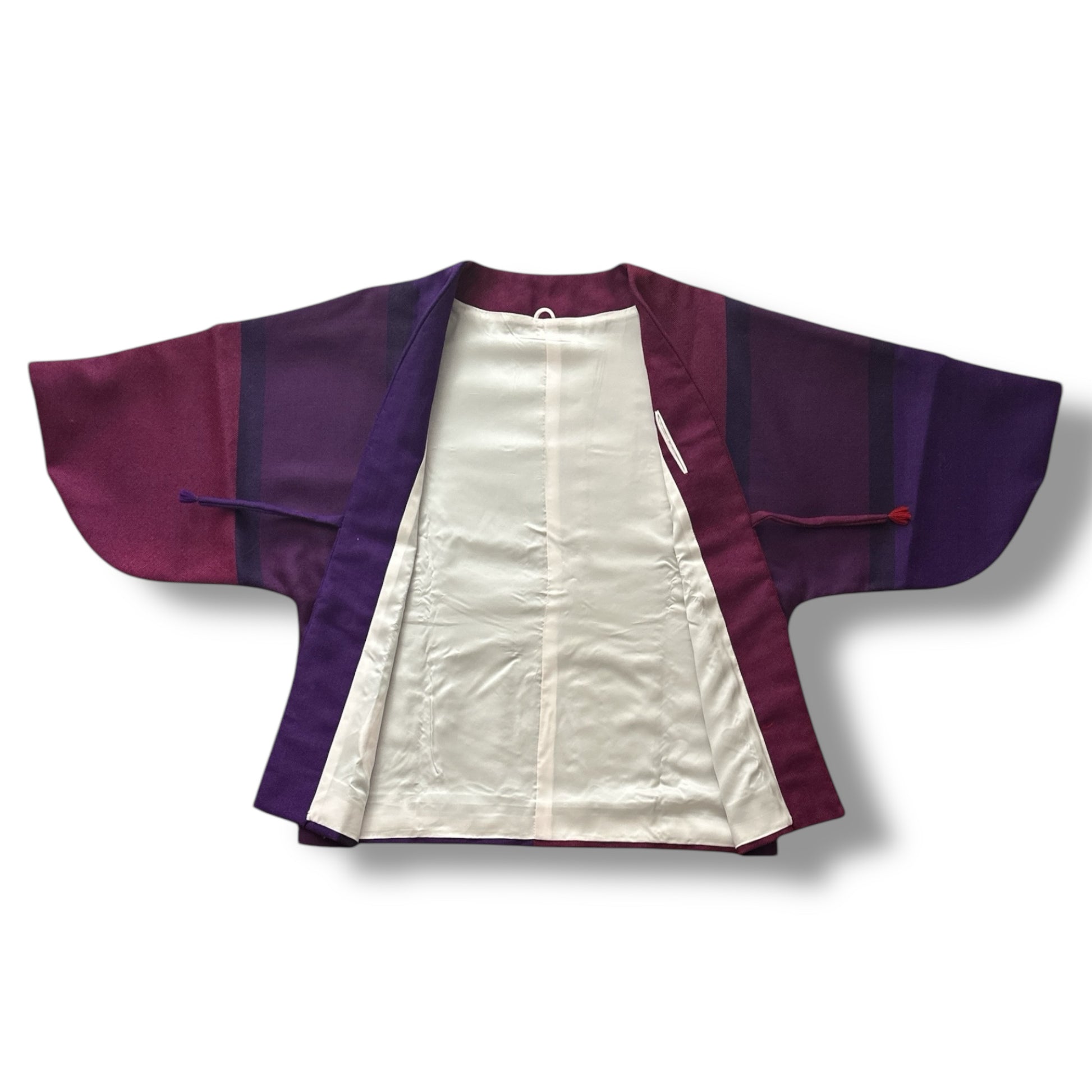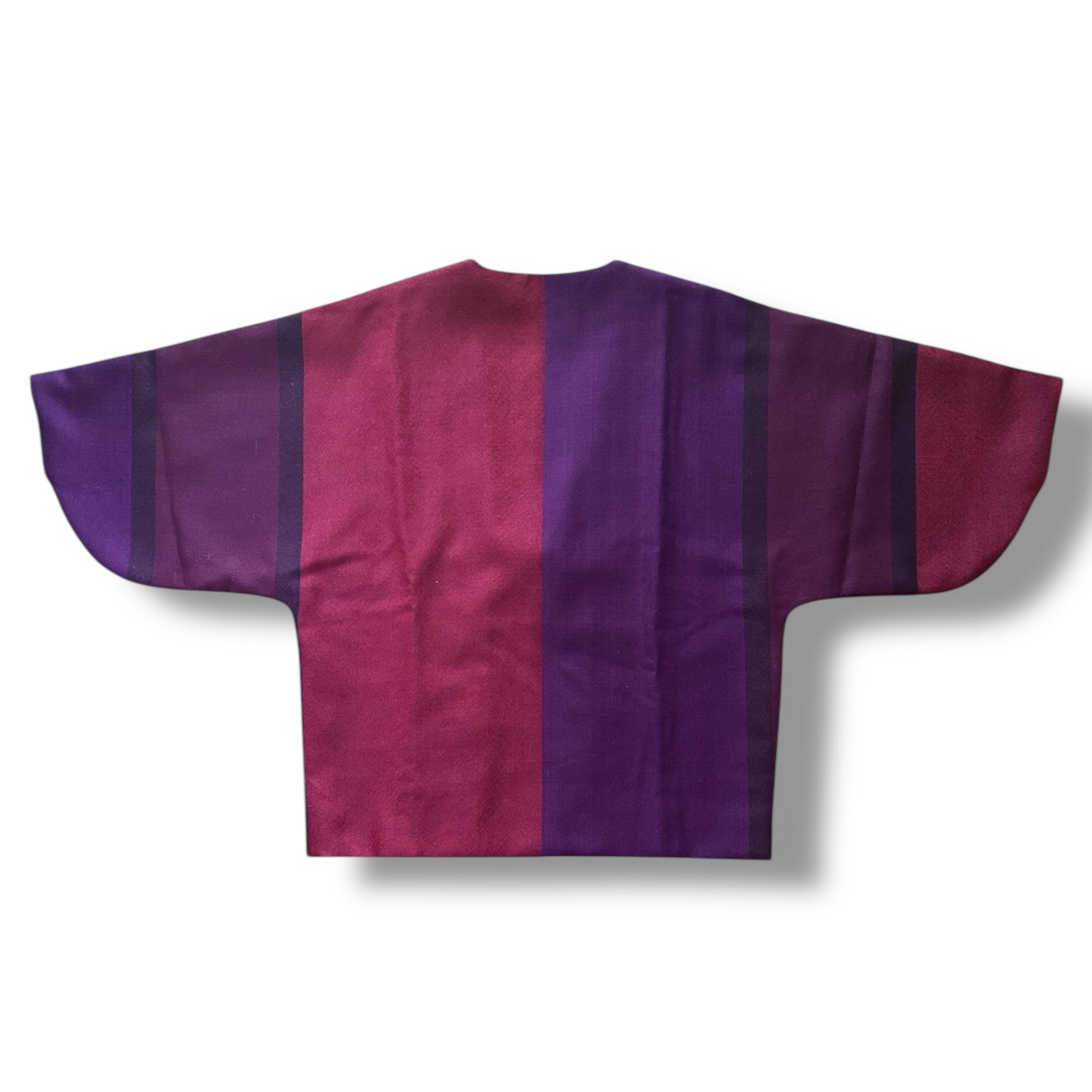 Description: This kimono coat showcases a rich color palette of deep purple and burgundy vertical stripes, exuding timeless elegance and warmth. The delicate fabric tie at the front, in matching shades of purple and red, enhances its refined silhouette.