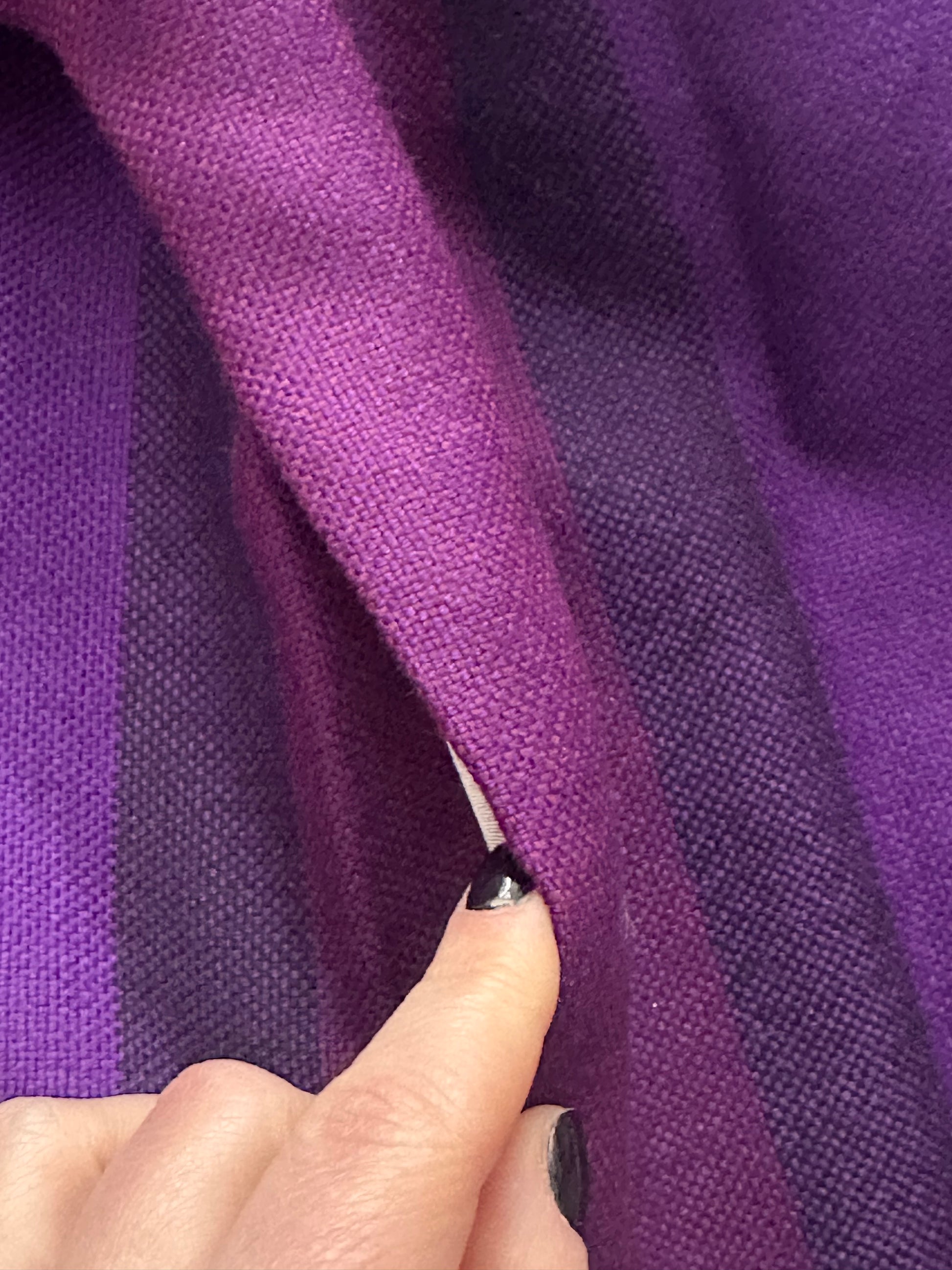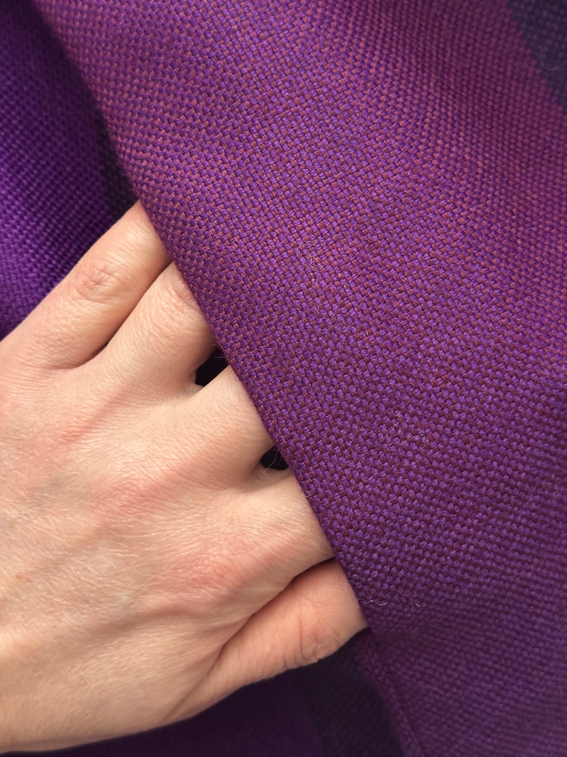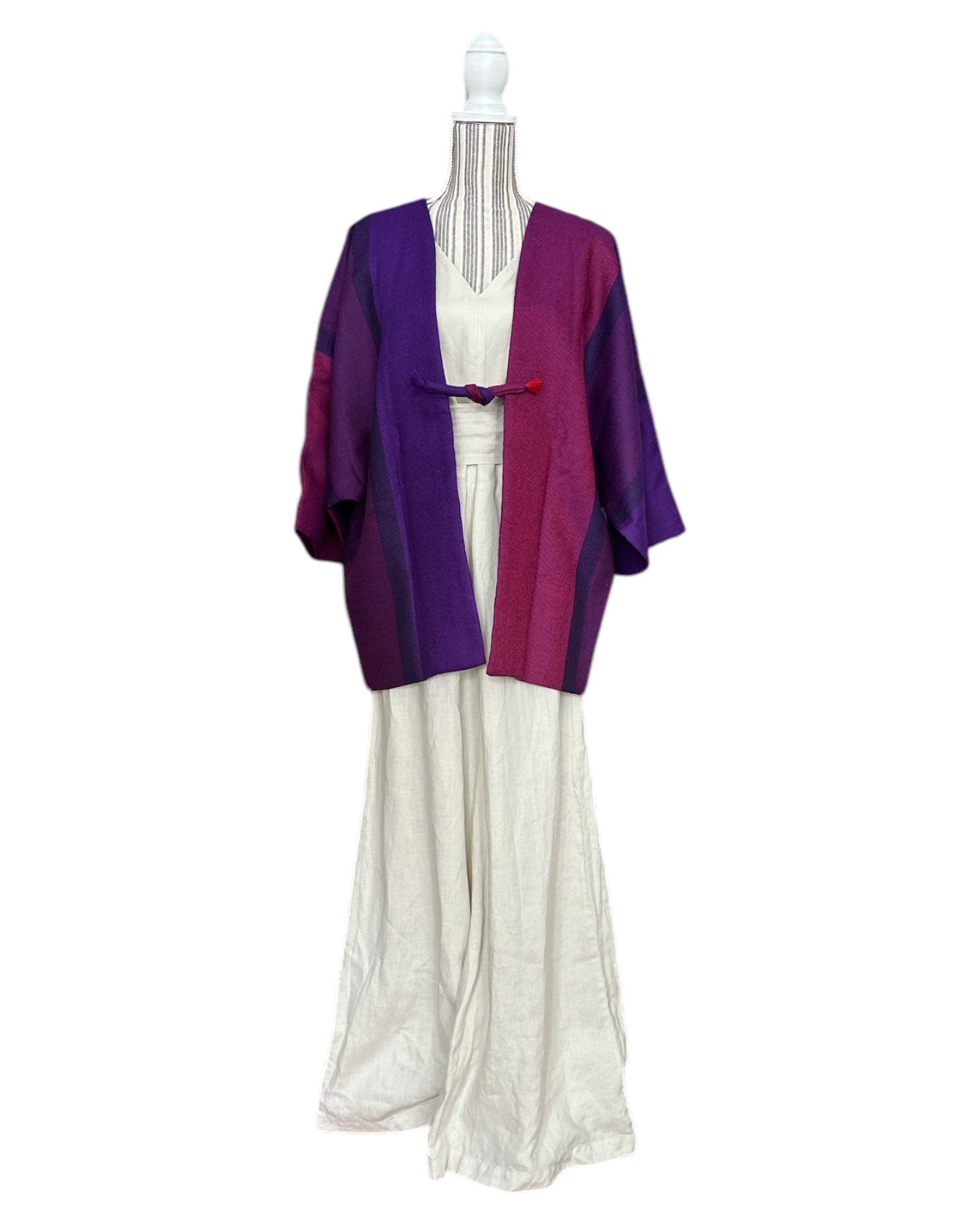 Description: This kimono coat showcases a rich color palette of deep purple and burgundy vertical stripes, exuding timeless elegance and warmth. The delicate fabric tie at the front, in matching shades of purple and red, enhances its refined silhouette.