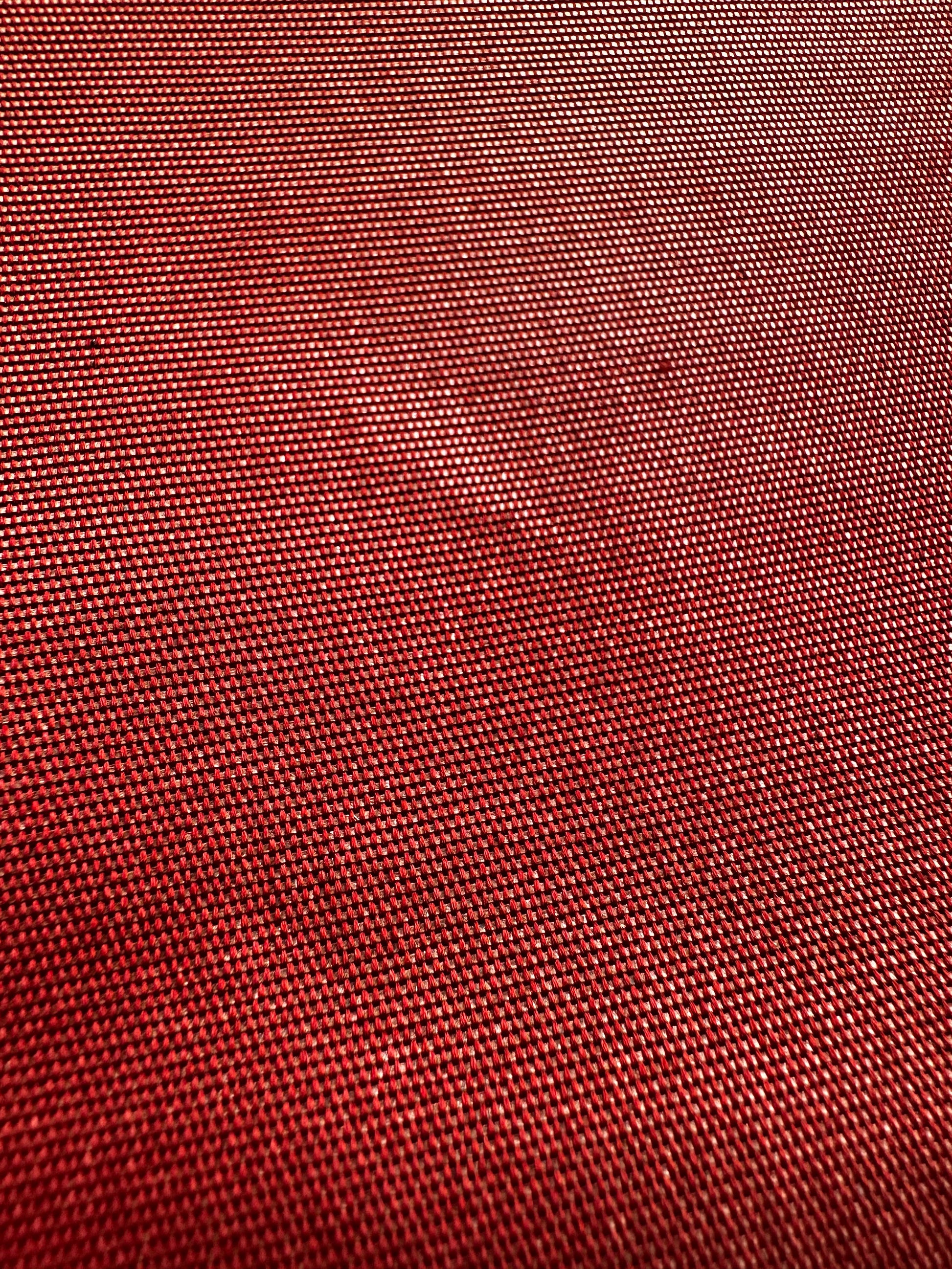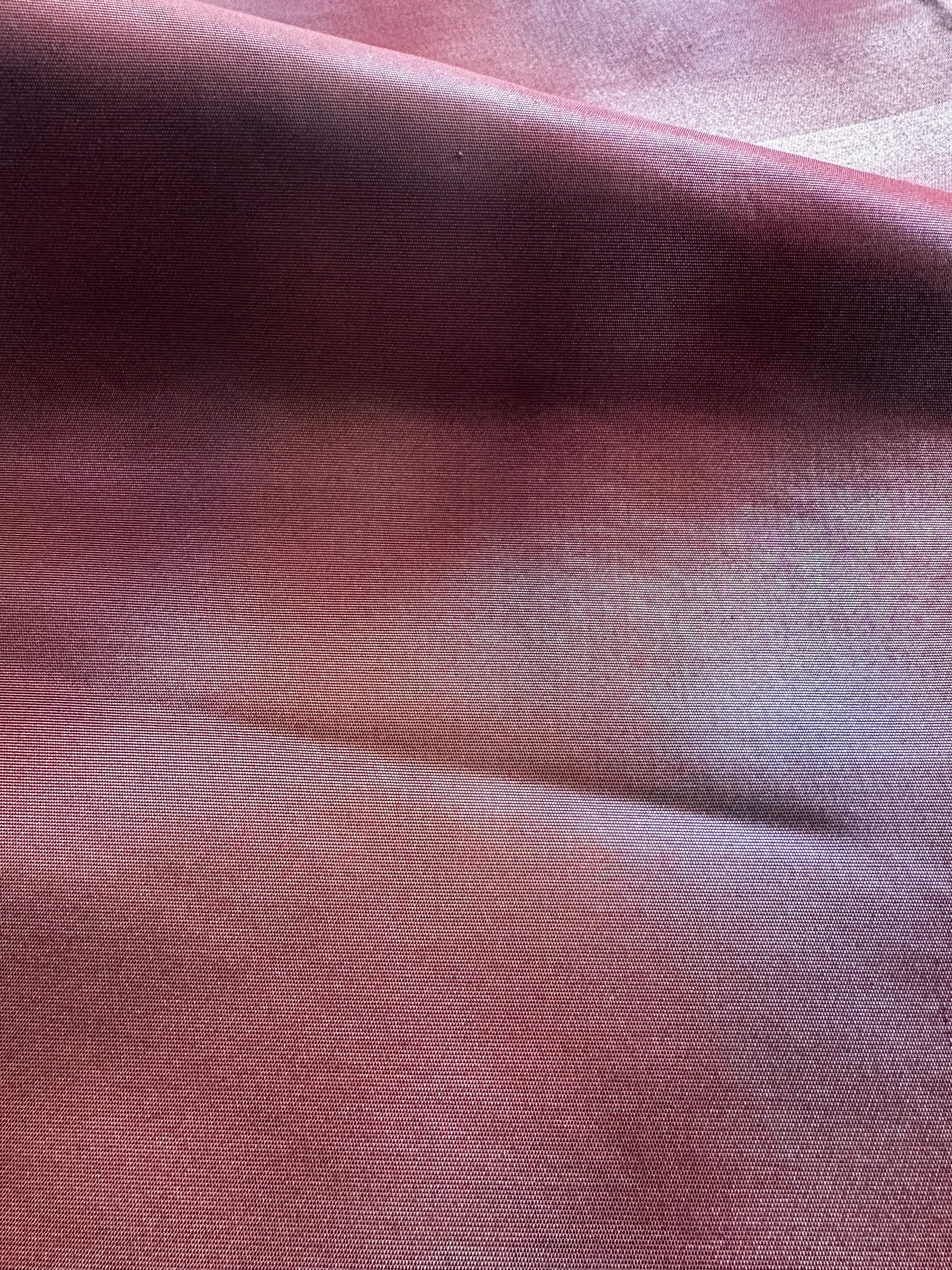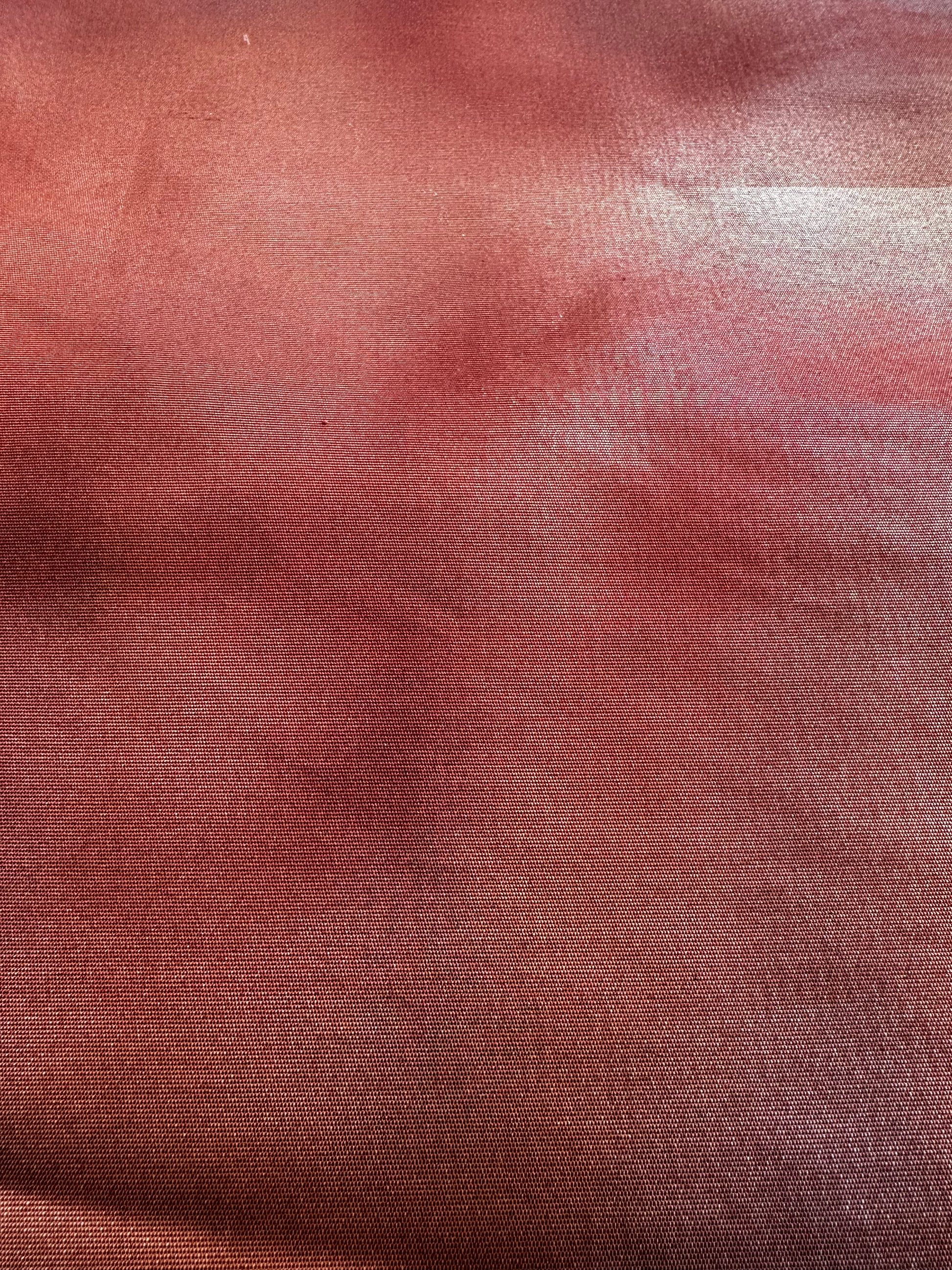 Fabric: Silk with metallic threads in copper and bronze, creating a shimmering effect on one side, and a matte terracotta red on the reverse.