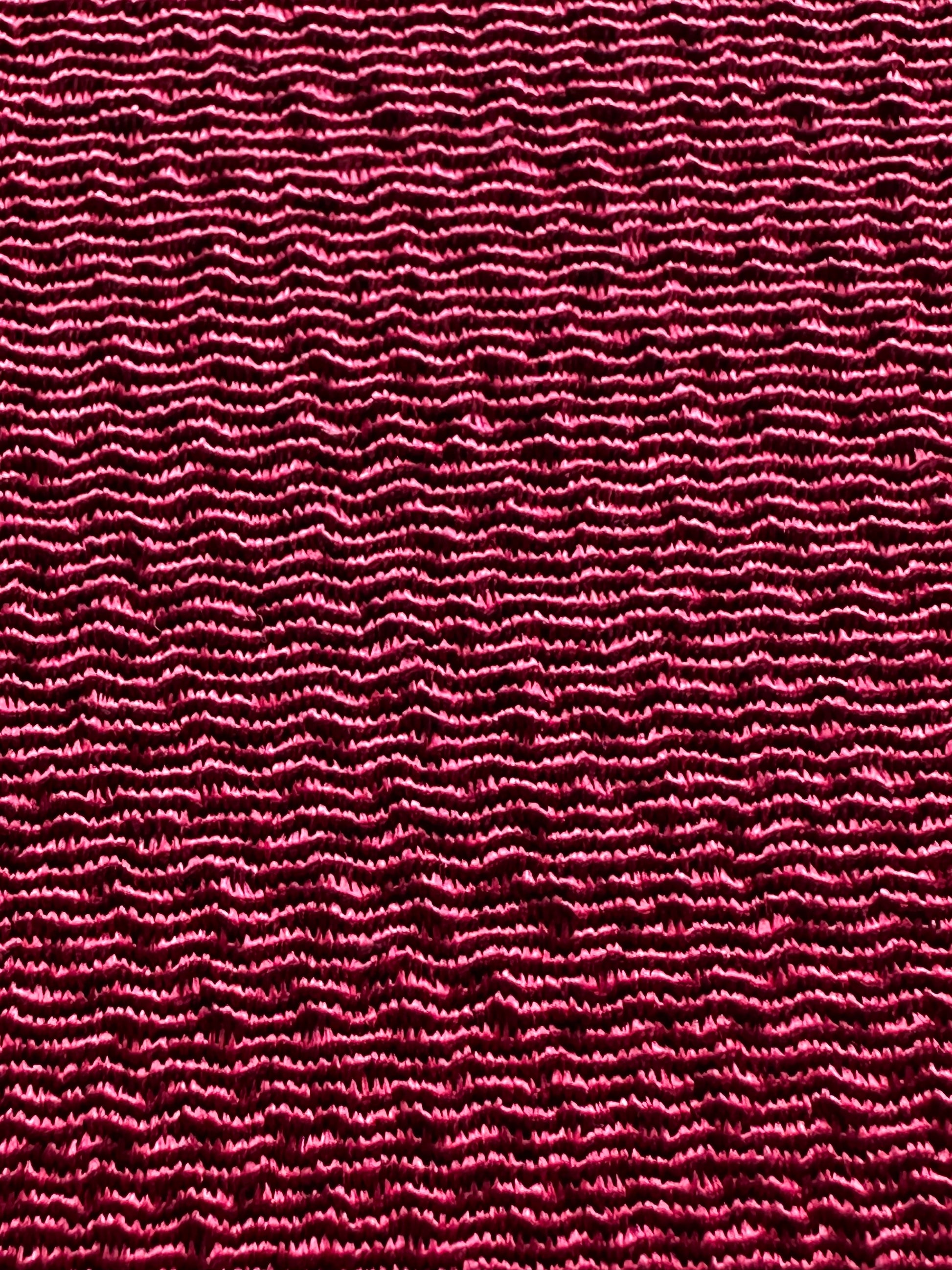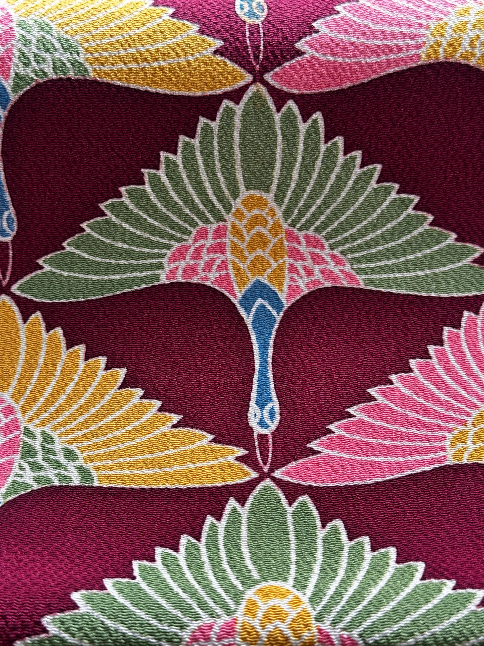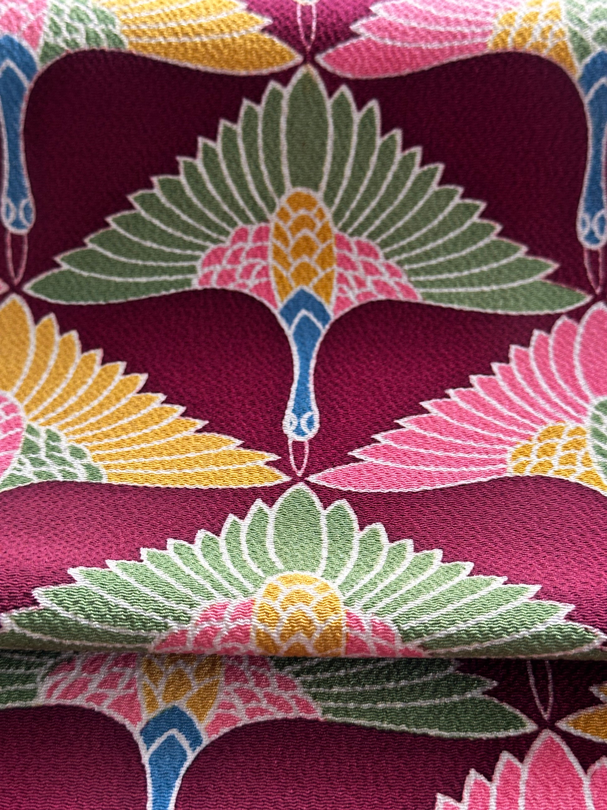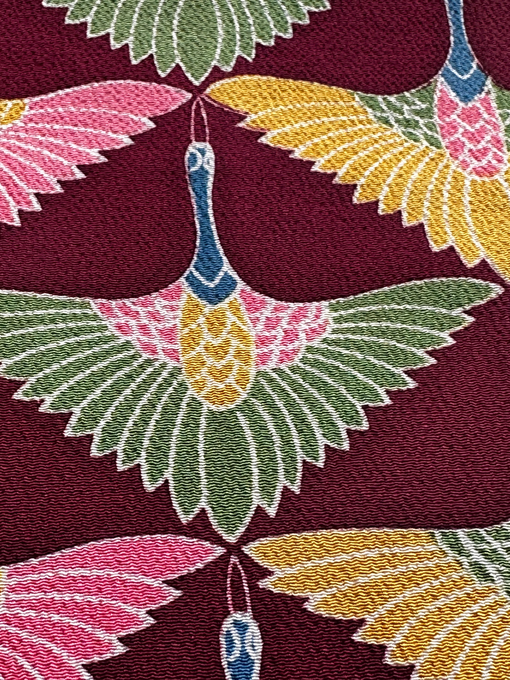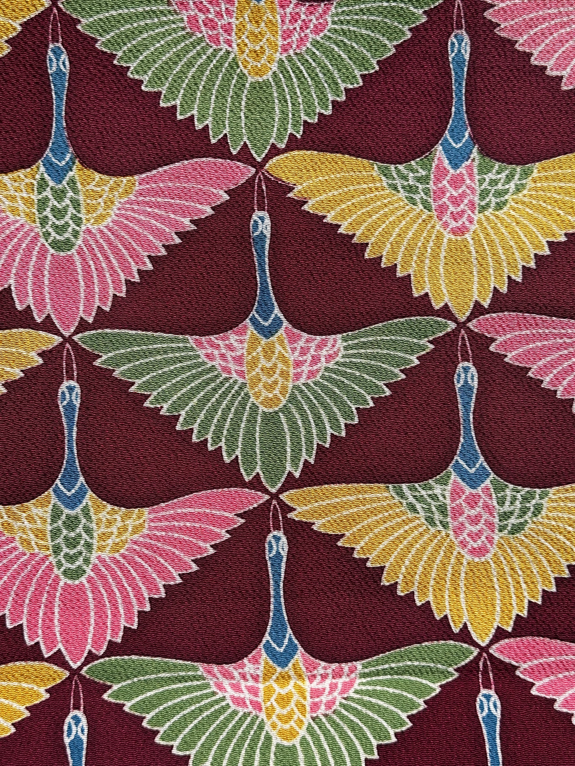 Fabric: Silk with a symmetrical pattern of stylised cranes, featuring a combination of warm pink, yellow, green, and blue against a deep maroon (warm red) background.