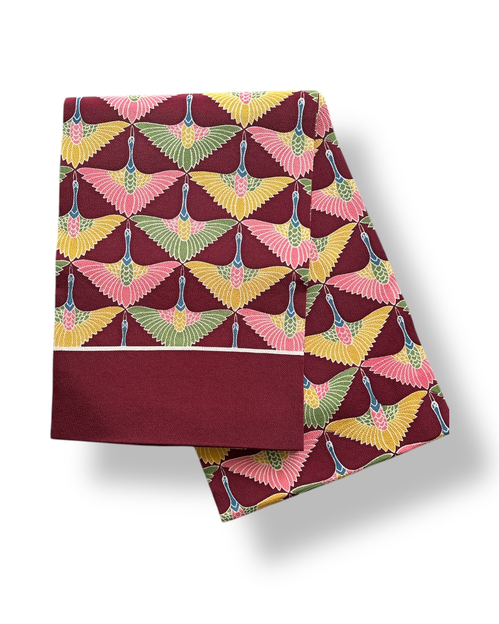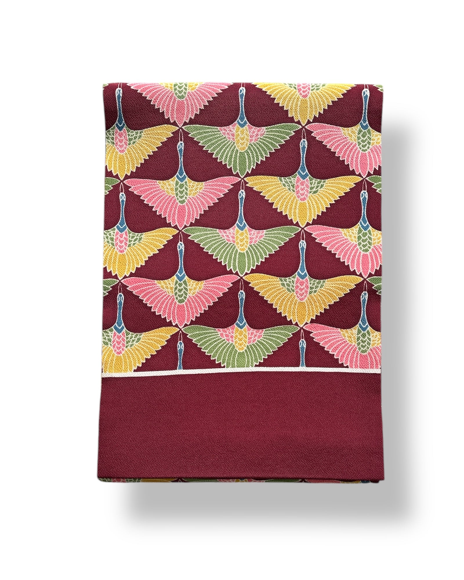 Description: This Women’s Fukuro Obi is a beautiful antique piece, crafted from luxurious silk and featuring a stunning, symmetrical design of stylised cranes with their wings fully spread. The pattern forms a striking V-shape, almost geometric in its precision, showcasing the graceful elegance of the cranes in flight. The deep maroon (warm red) base color provides a rich backdrop, while the cranes are adorned in a beautiful combination of warm pink, yellow, green, and blue, giving the design a vibrant, yet harmonious feel.