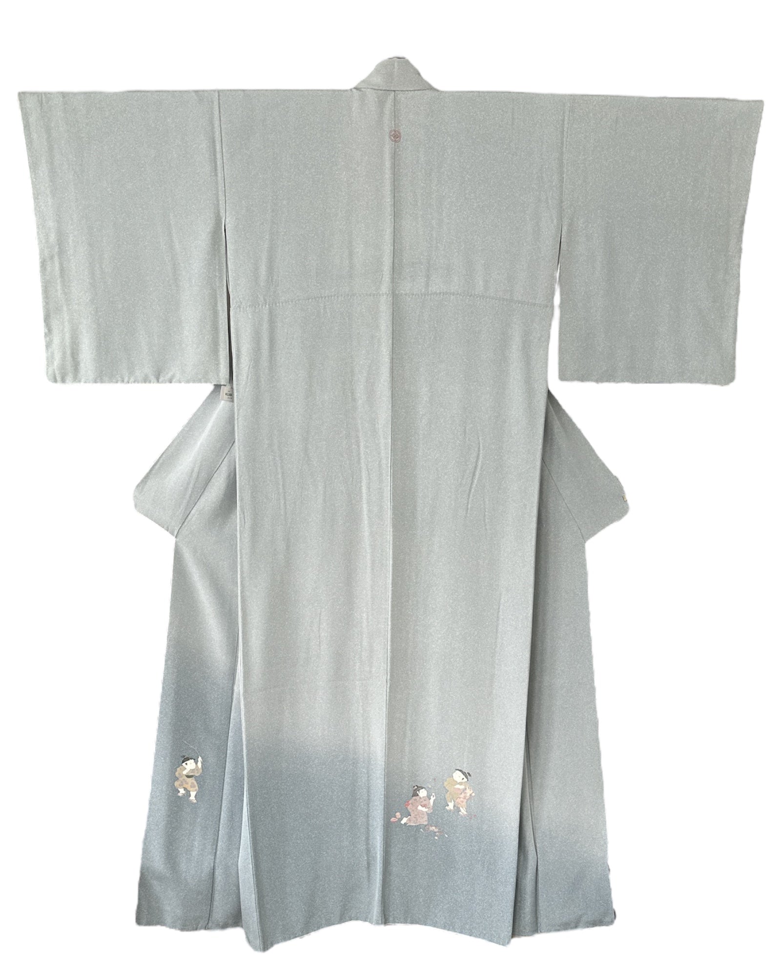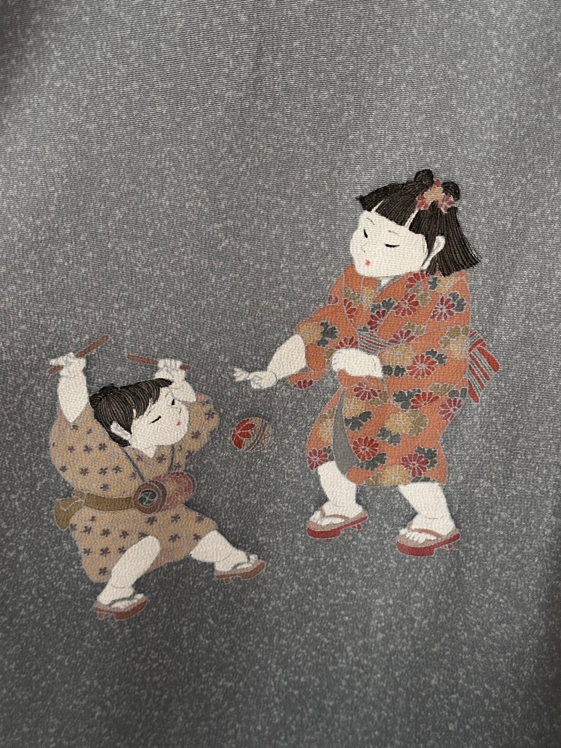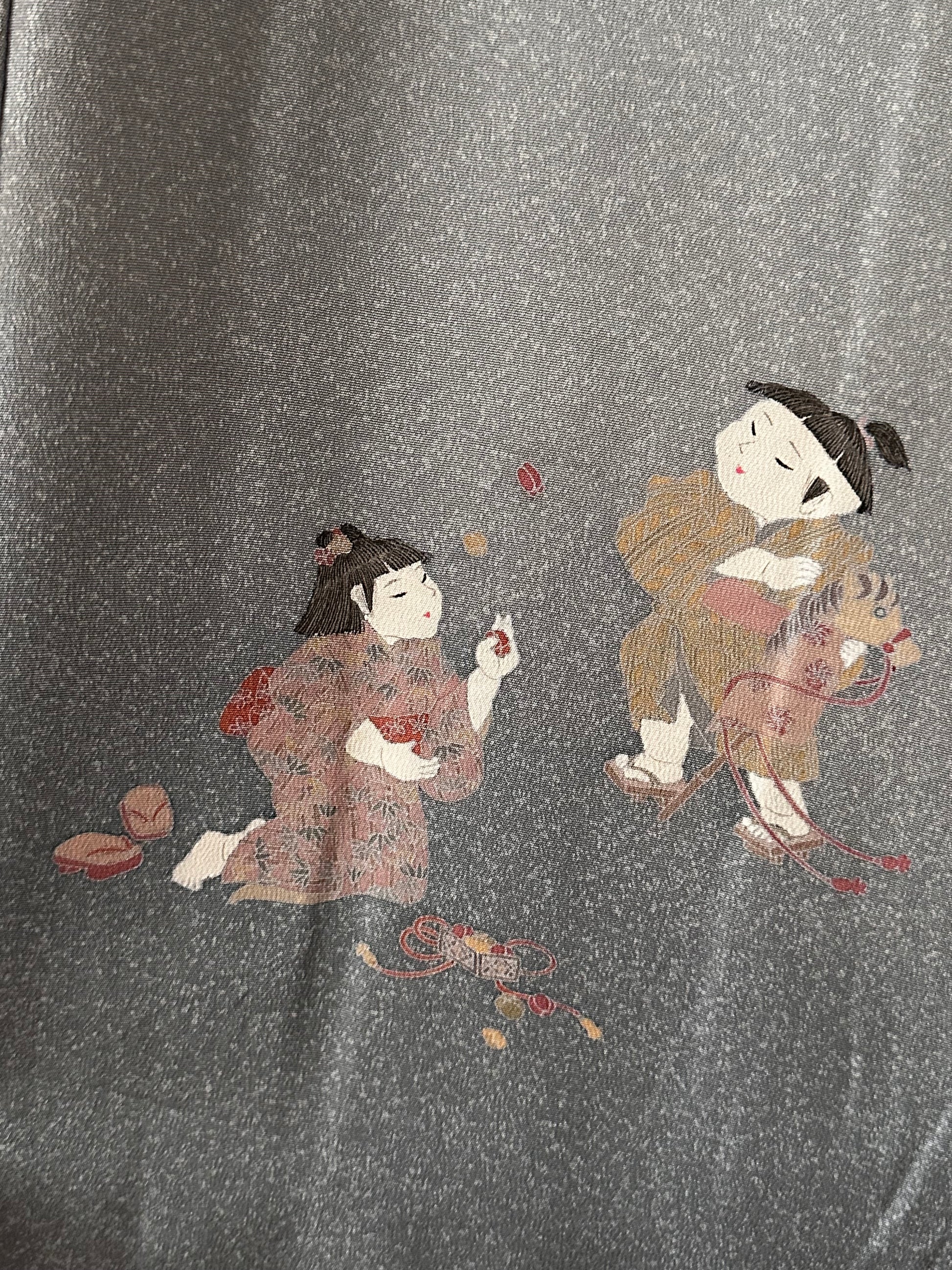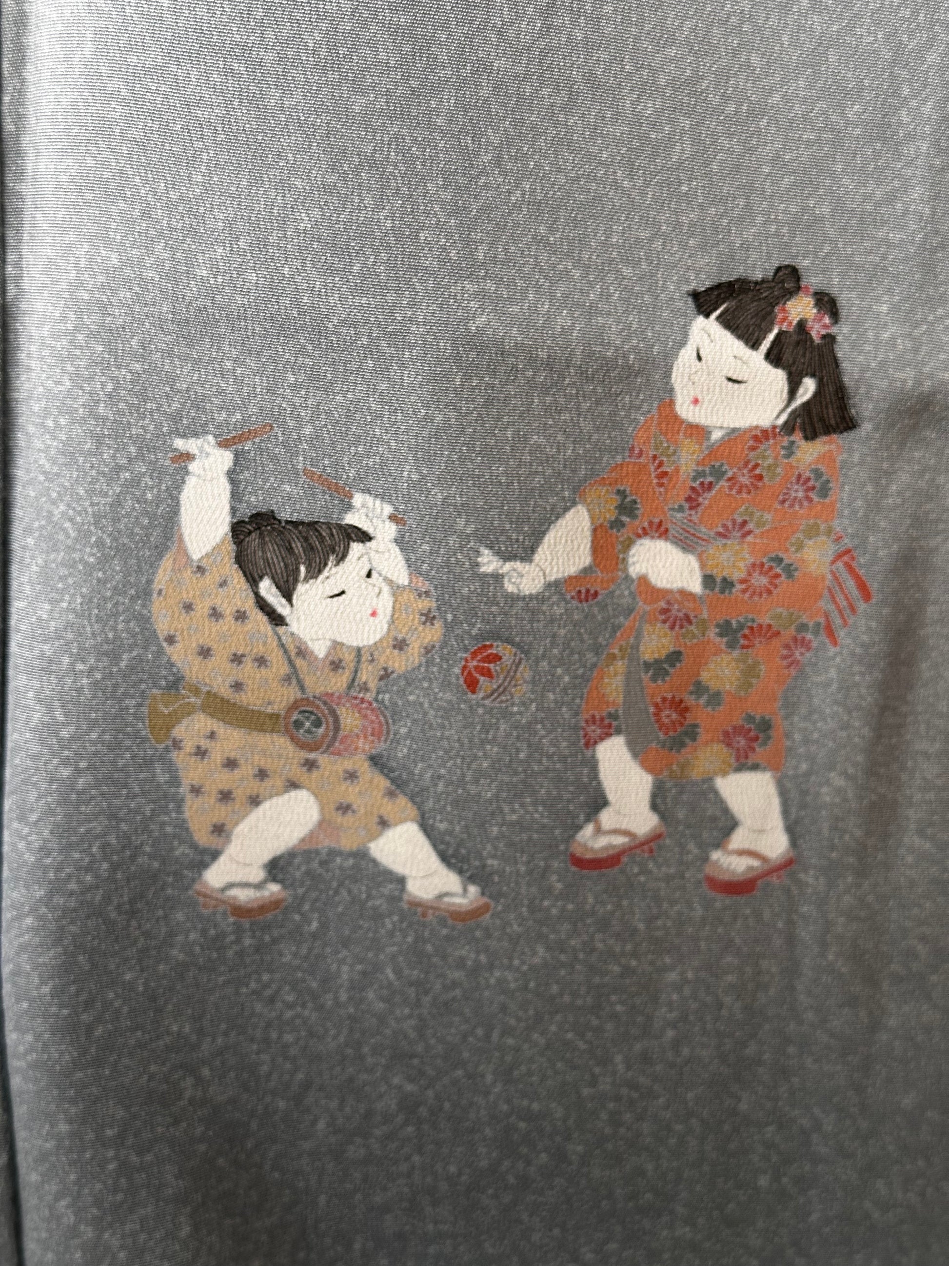 Description: This tsugesake kimono features the “kodomo asobi” motif, depicting children joyfully playing outdoors in summer. A symbol of happiness and well-being, this design conveys wishes for children’s health and prosperity. The warm hand-painted colors add vibrancy and depth to the playful scenes. An embroidered family crest on the back enhances its traditional elegance.