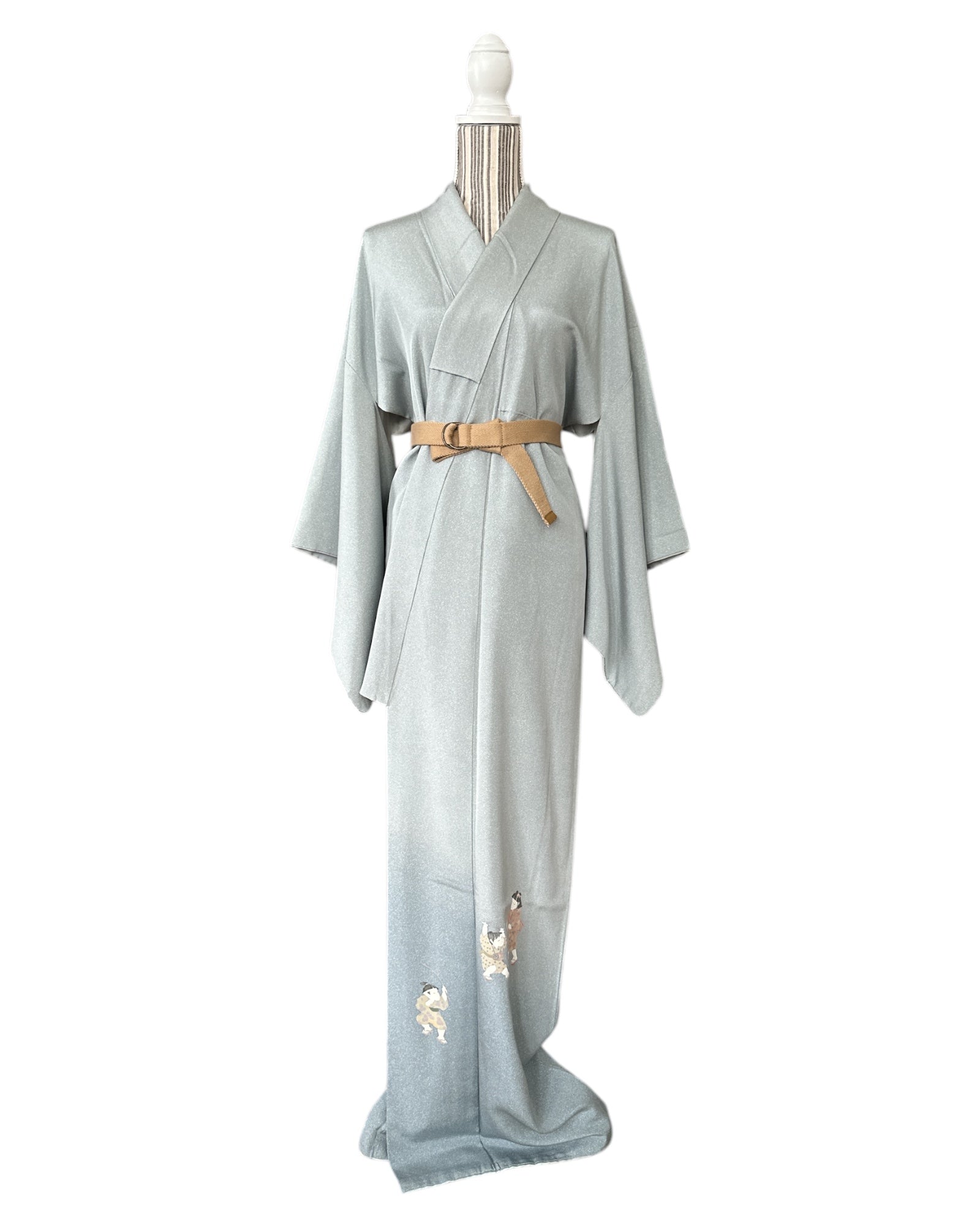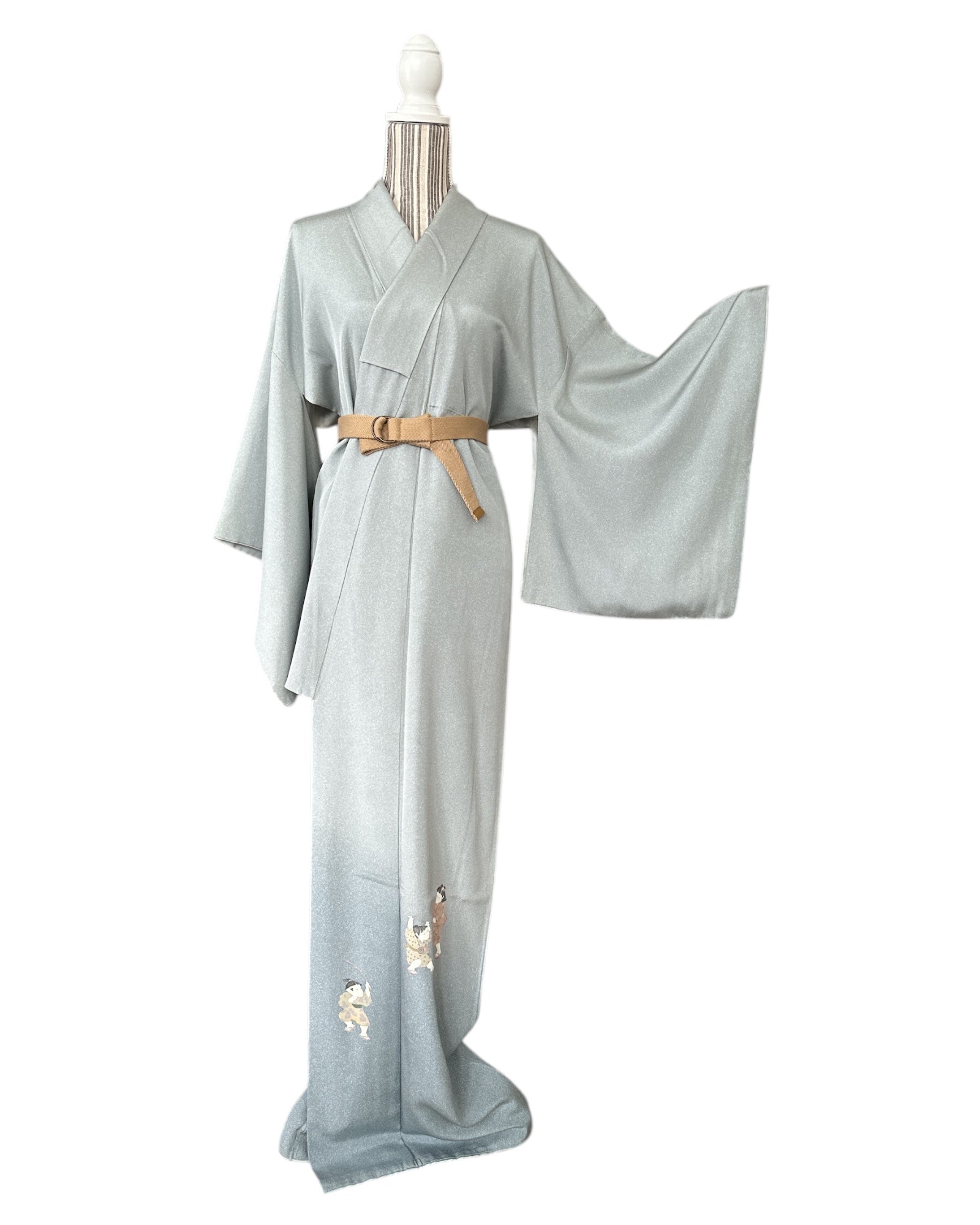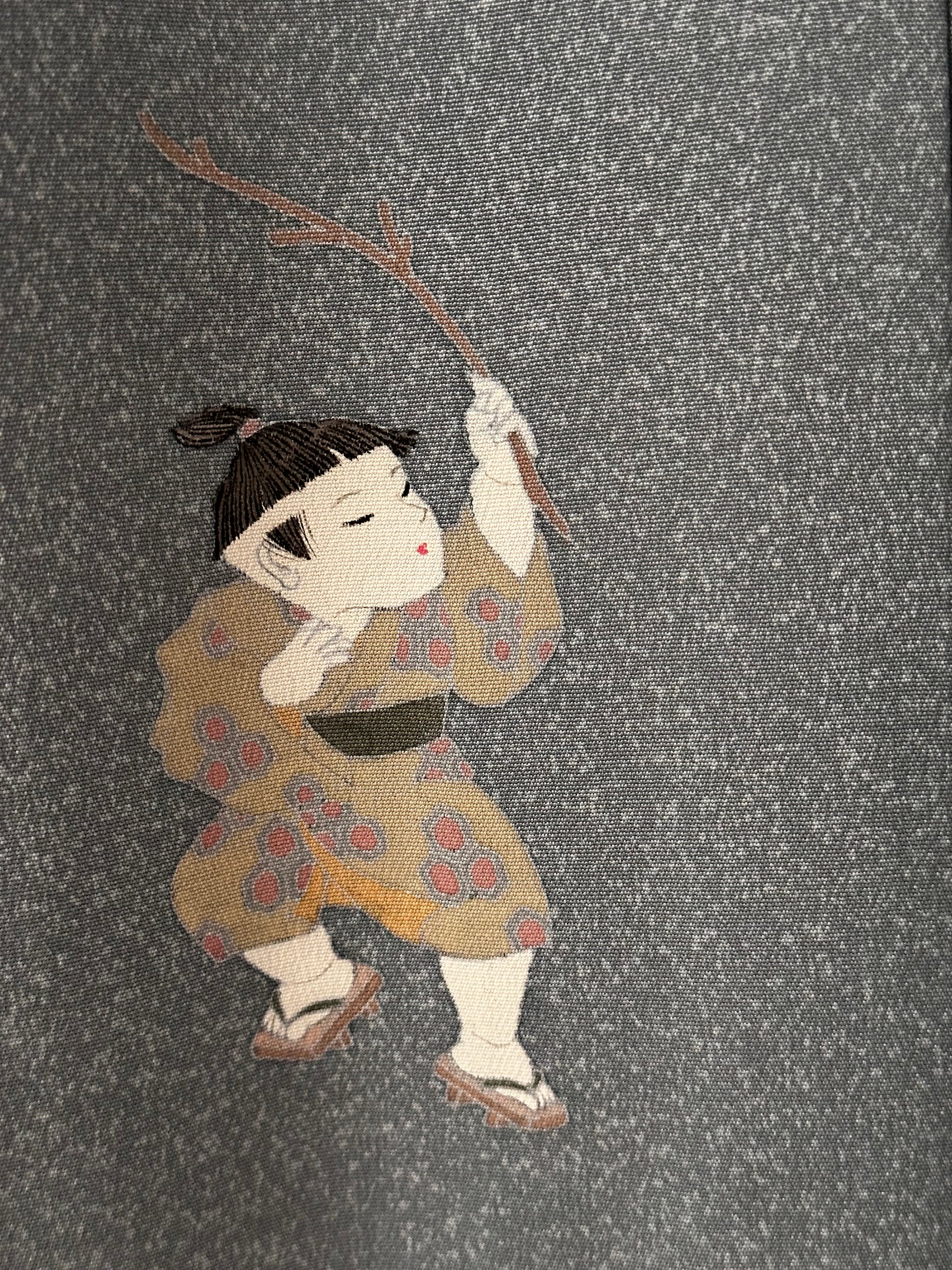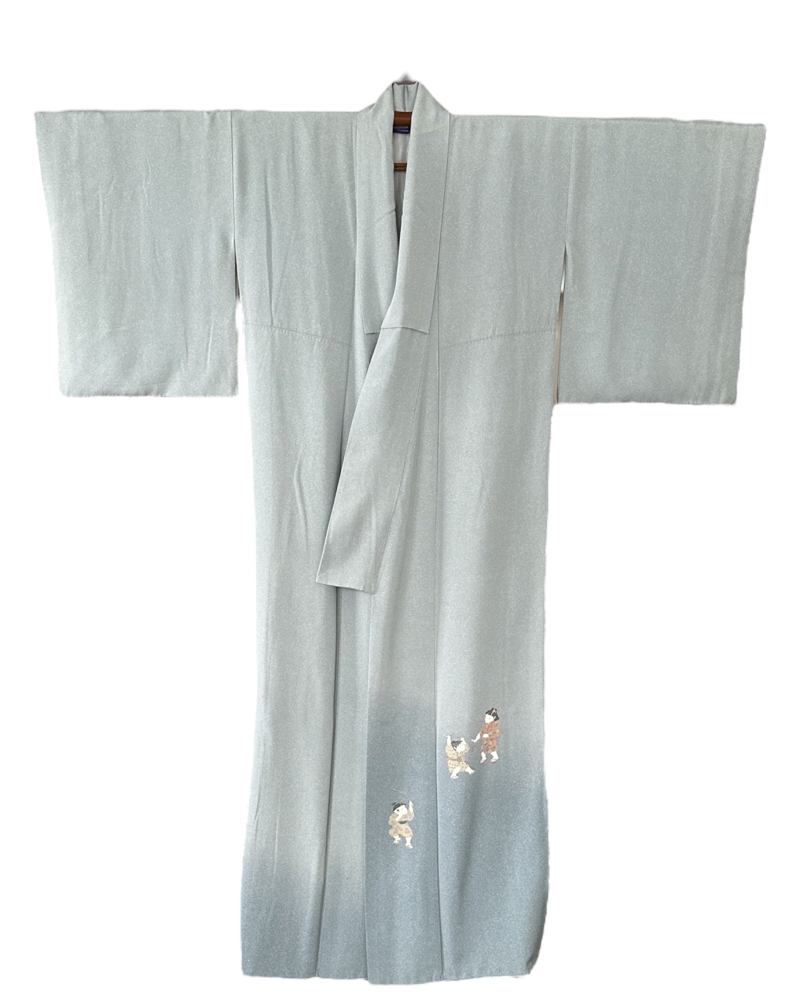 Description: This tsugesake kimono features the “kodomo asobi” motif, depicting children joyfully playing outdoors in summer. A symbol of happiness and well-being, this design conveys wishes for children’s health and prosperity. The warm hand-painted colors add vibrancy and depth to the playful scenes. An embroidered family crest on the back enhances its traditional elegance.