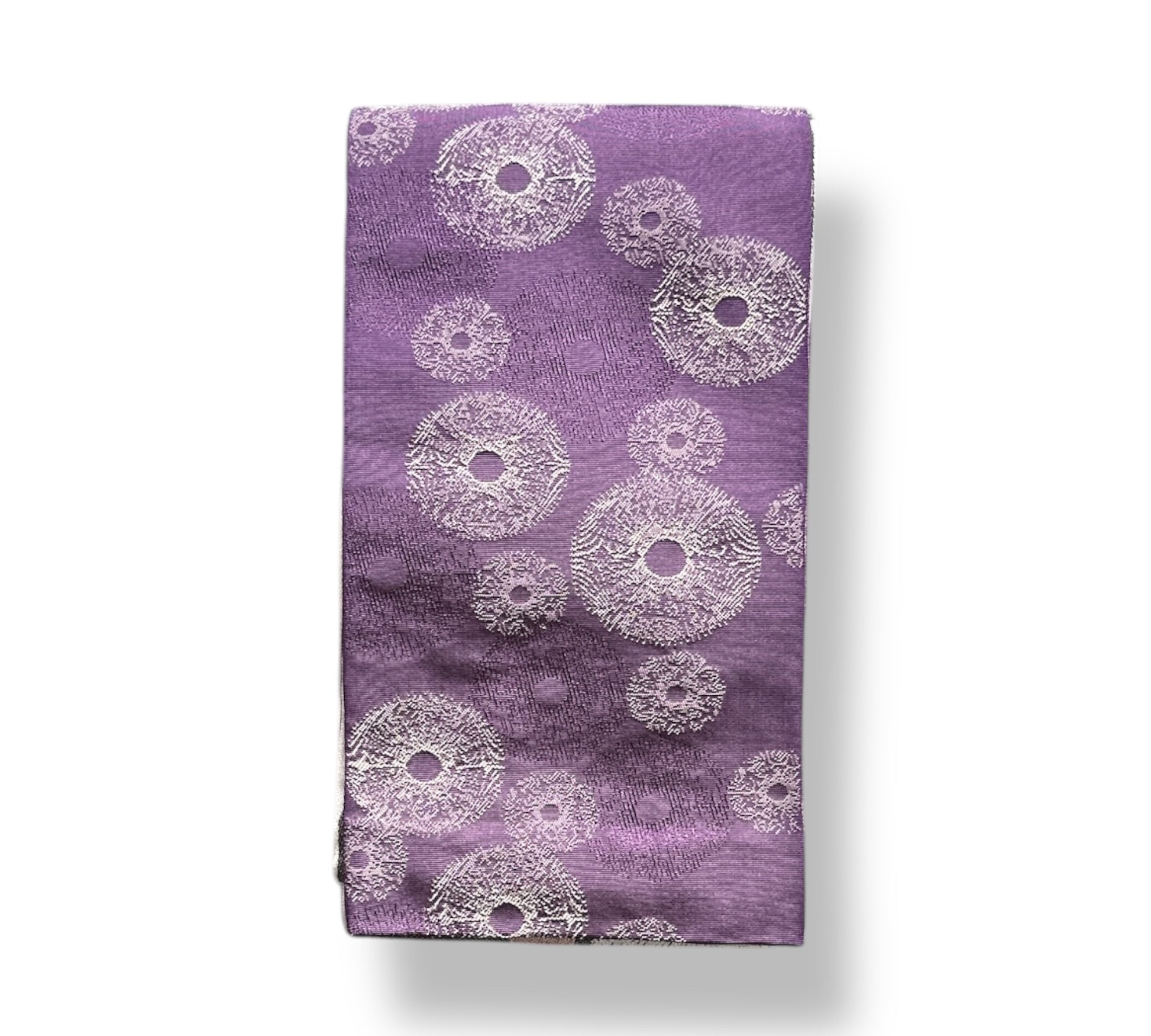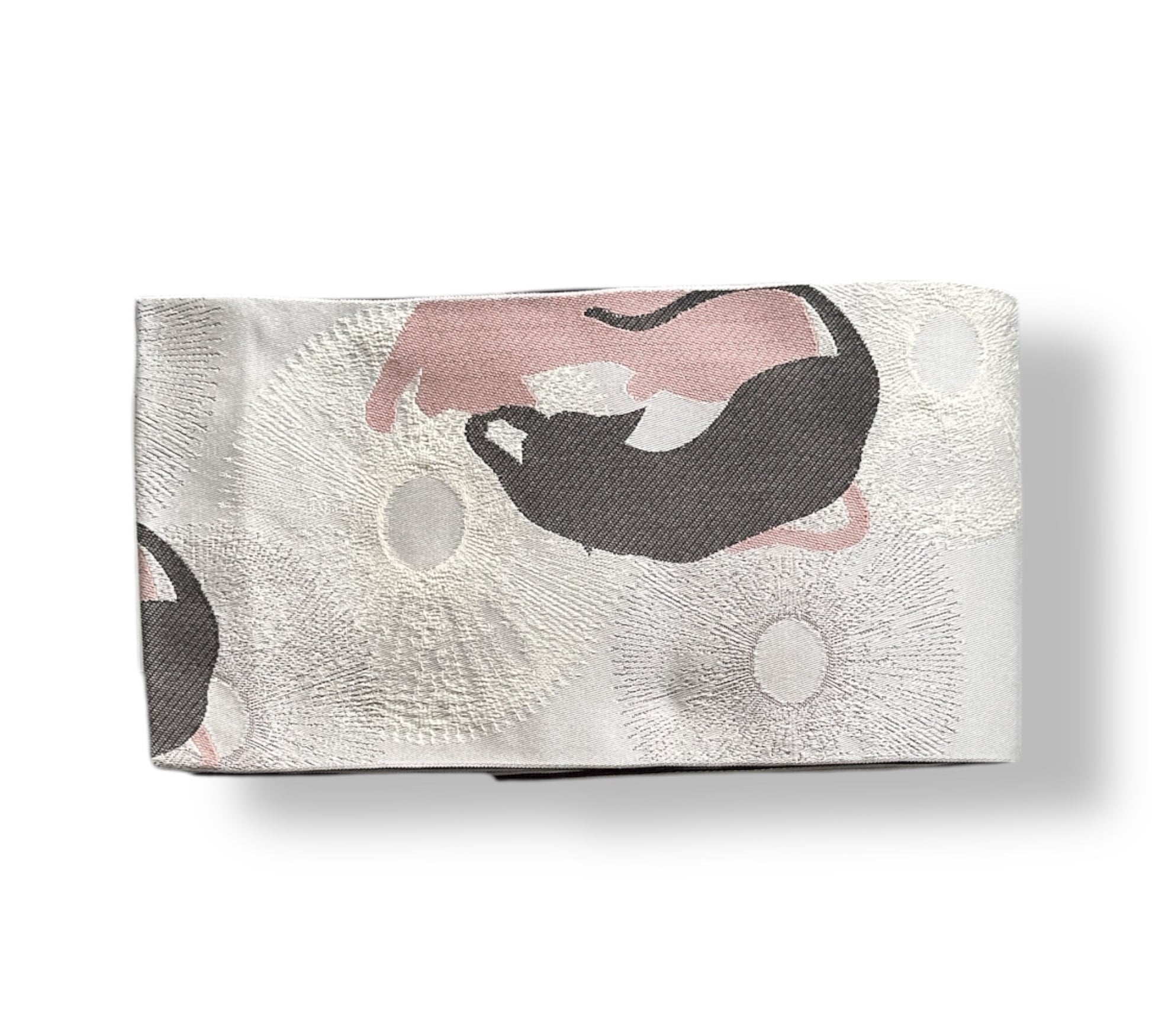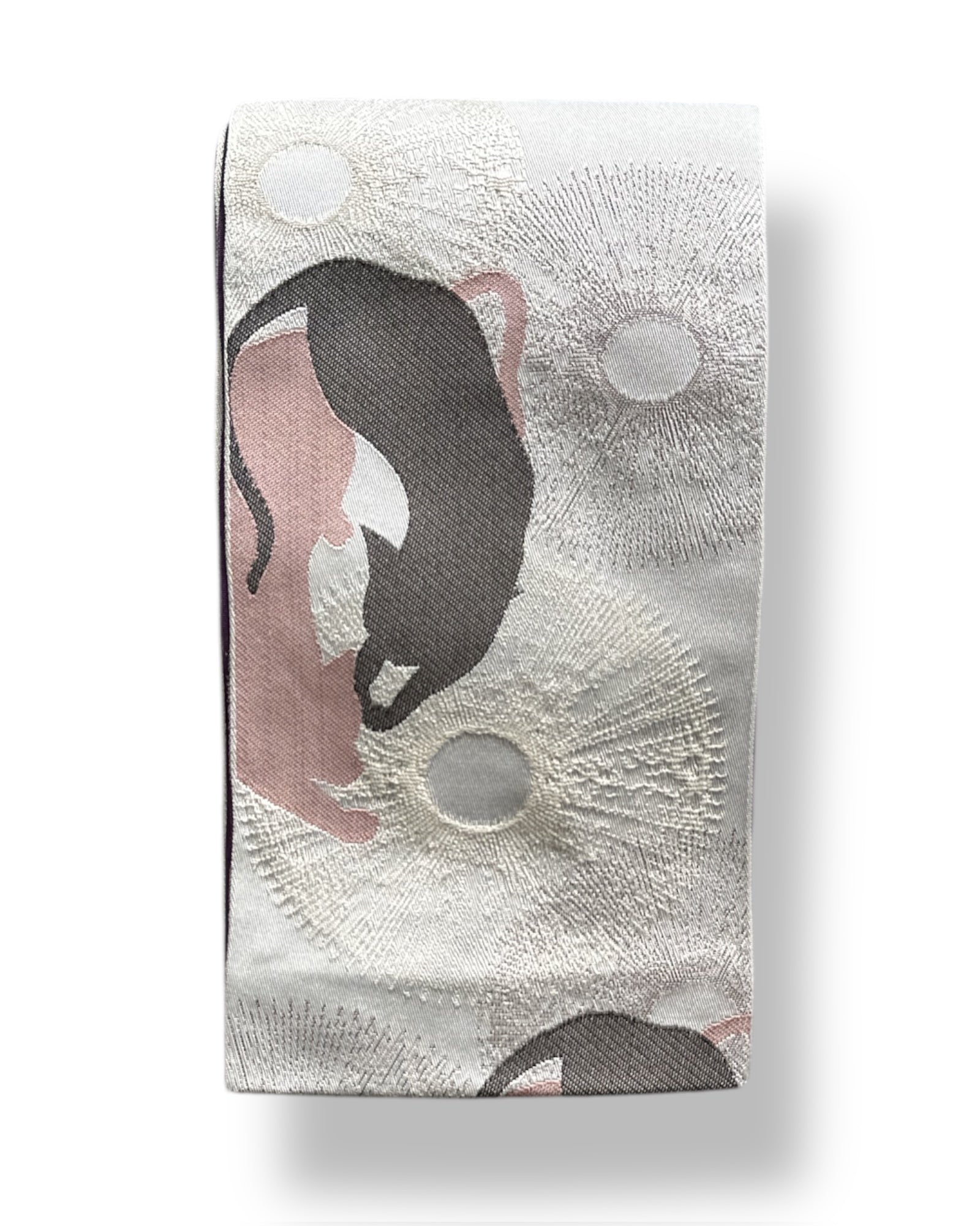 Description: This Women's Hanhaba Obi (Half-Width Obi) is a charming and versatile accessory, perfect for casual wear or pairing with a yukata. Crafted from durable polyester with a soft synthetic silk texture, it is lightweight, comfortable, and easy to tie. Both sides feature intricate woven designs: one side showcases a playful repeating pattern of cats in muted shades of gray, pink, and white, adding a fun and whimsical touch, while the reverse side displays an elegant woven pattern of round motifs that may represent stylised chrysanthemums (kiku) in muted purple and white. With its reversible design, this obi offers multiple styling options, making it a delightful and practical addition to any wardrobe. A brand-new piece, it promises to be enjoyed for many years to come.
