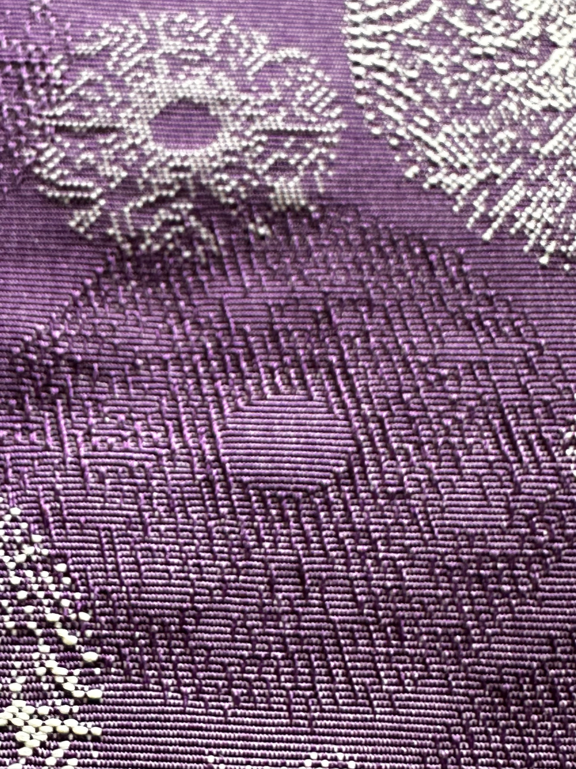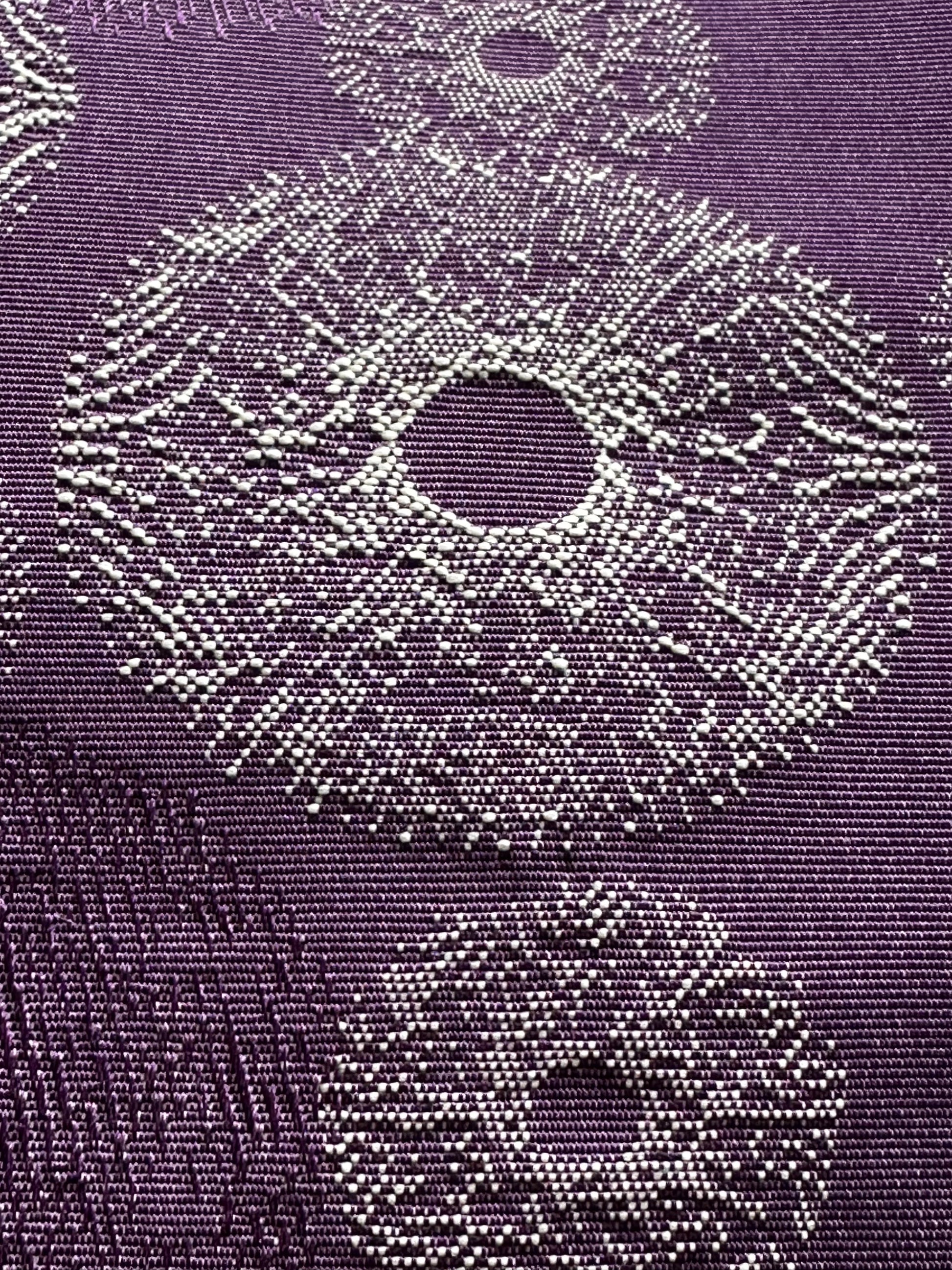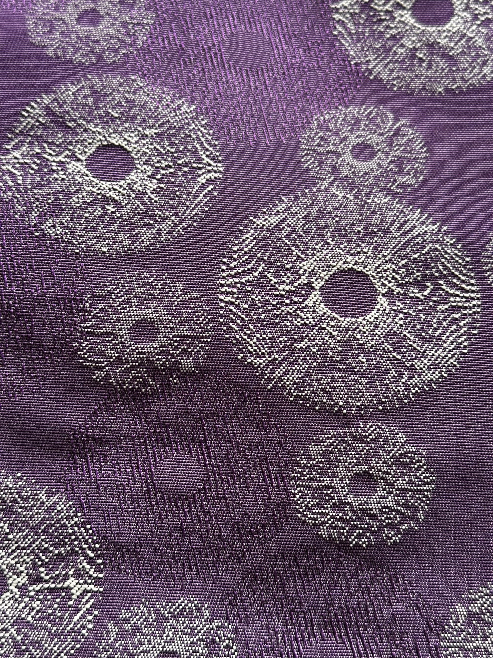 Description: This Women's Hanhaba Obi (Half-Width Obi) is a charming and versatile accessory, perfect for casual wear or pairing with a yukata. Crafted from durable polyester with a soft synthetic silk texture, it is lightweight, comfortable, and easy to tie. Both sides feature intricate woven designs: one side showcases a playful repeating pattern of cats in muted shades of gray, pink, and white, adding a fun and whimsical touch, while the reverse side displays an elegant woven pattern of round motifs that may represent stylised chrysanthemums (kiku) in muted purple and white. With its reversible design, this obi offers multiple styling options, making it a delightful and practical addition to any wardrobe. A brand-new piece, it promises to be enjoyed for many years to come.