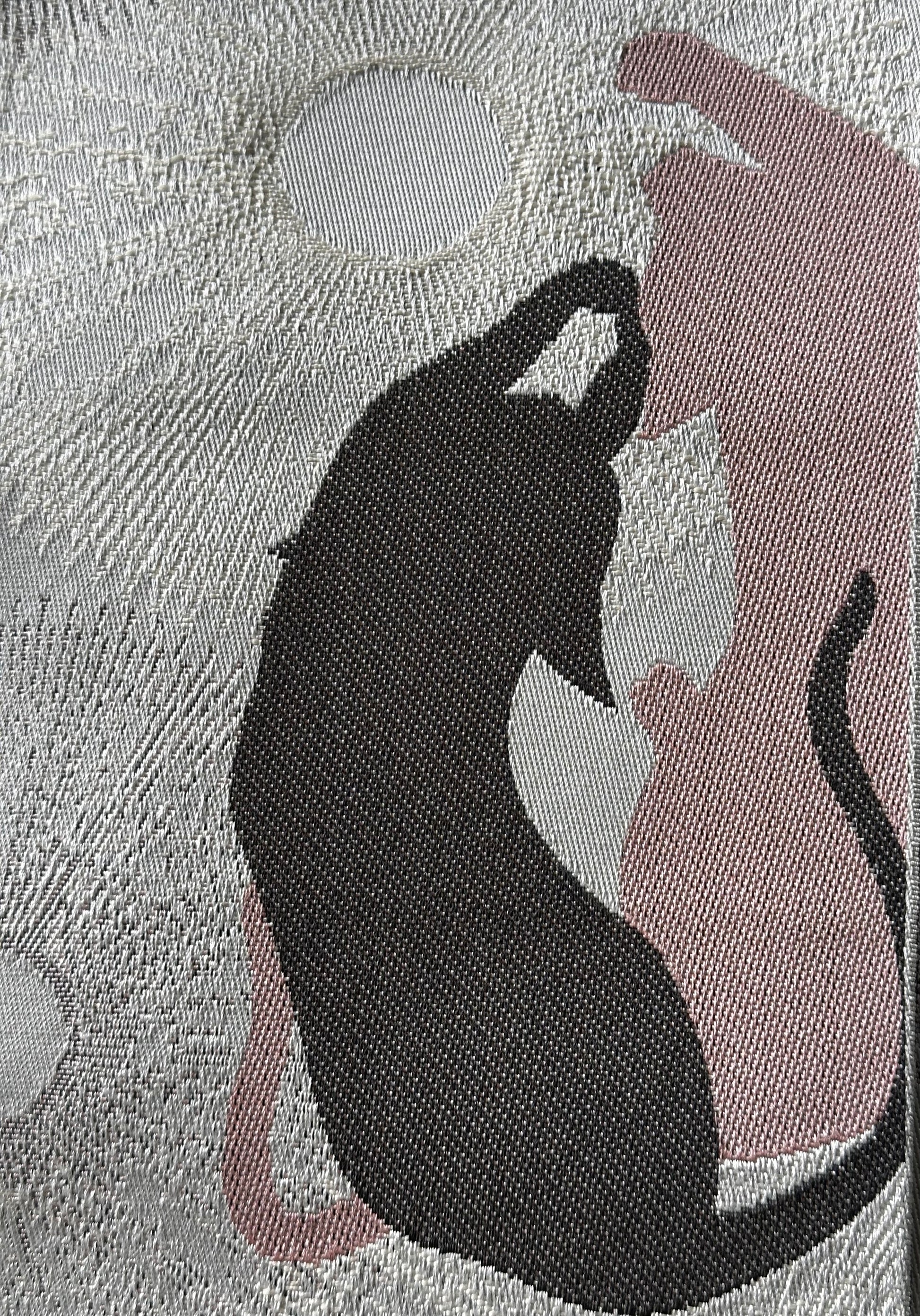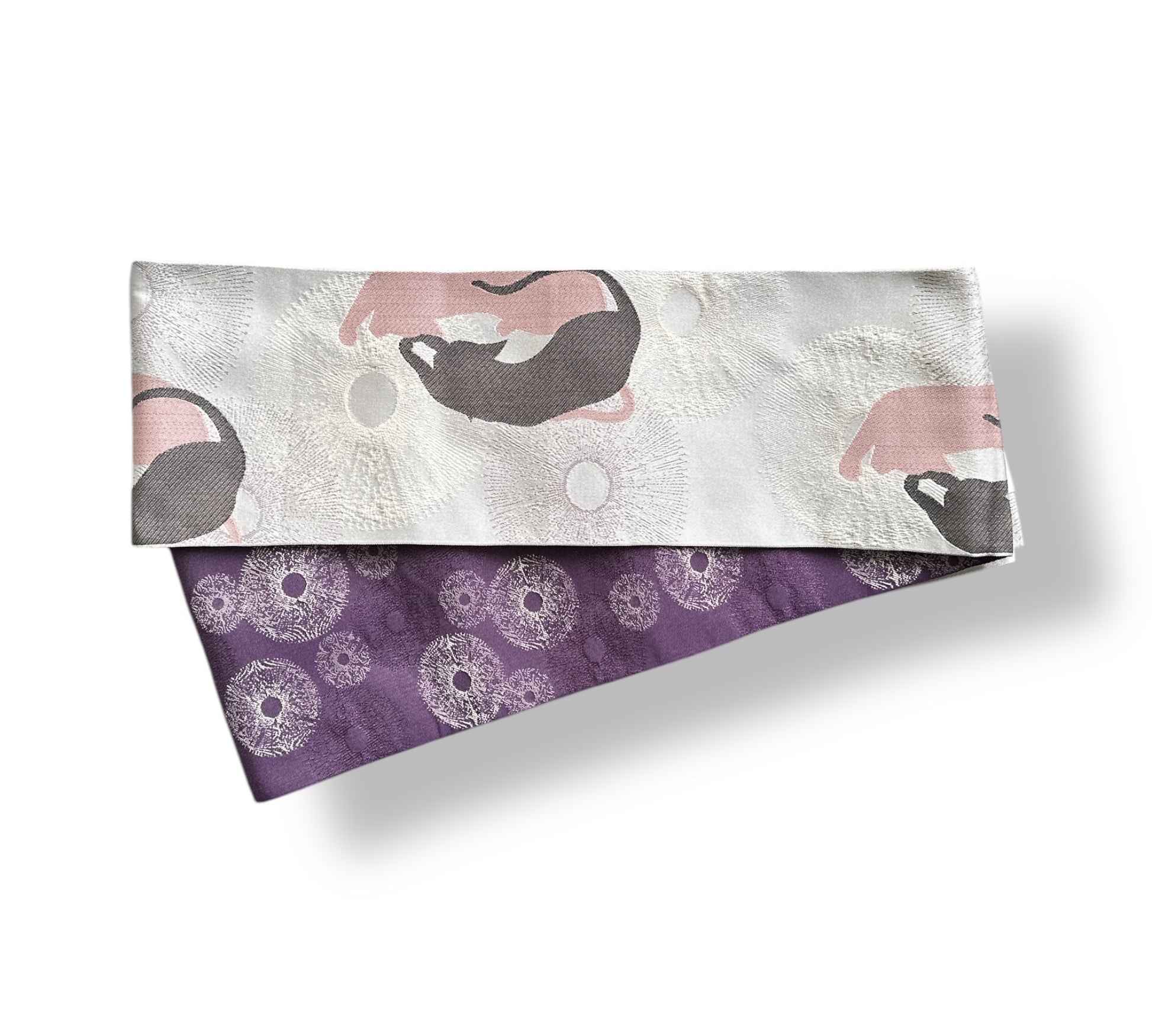 Style: Reversible Women's Half-Width Obi, featuring a playful cat pattern on one side and a refined chrysanthemum-inspired woven design on the other. Ideal for casual outfits or yukata, with easy styling options for a personalised look.