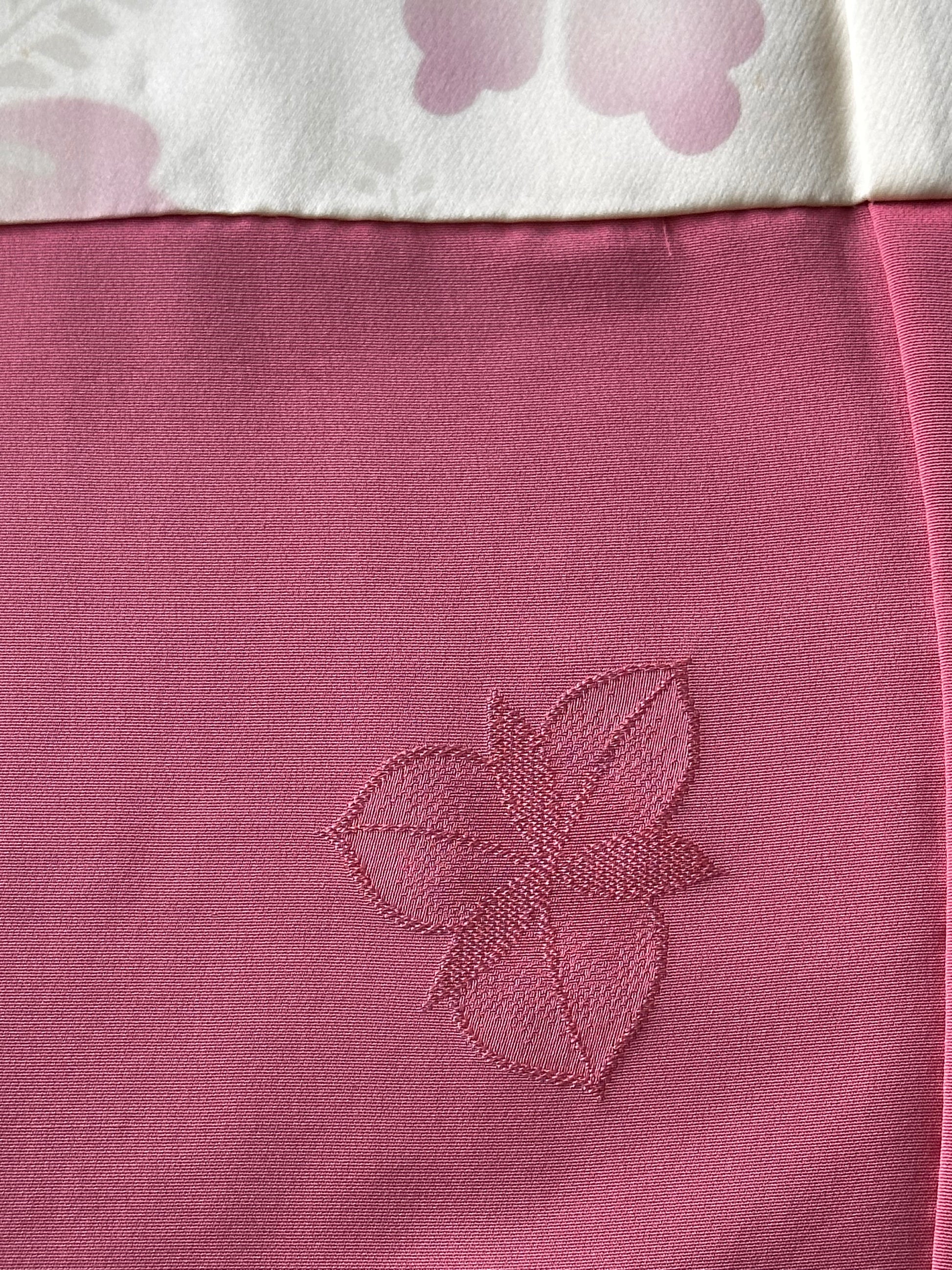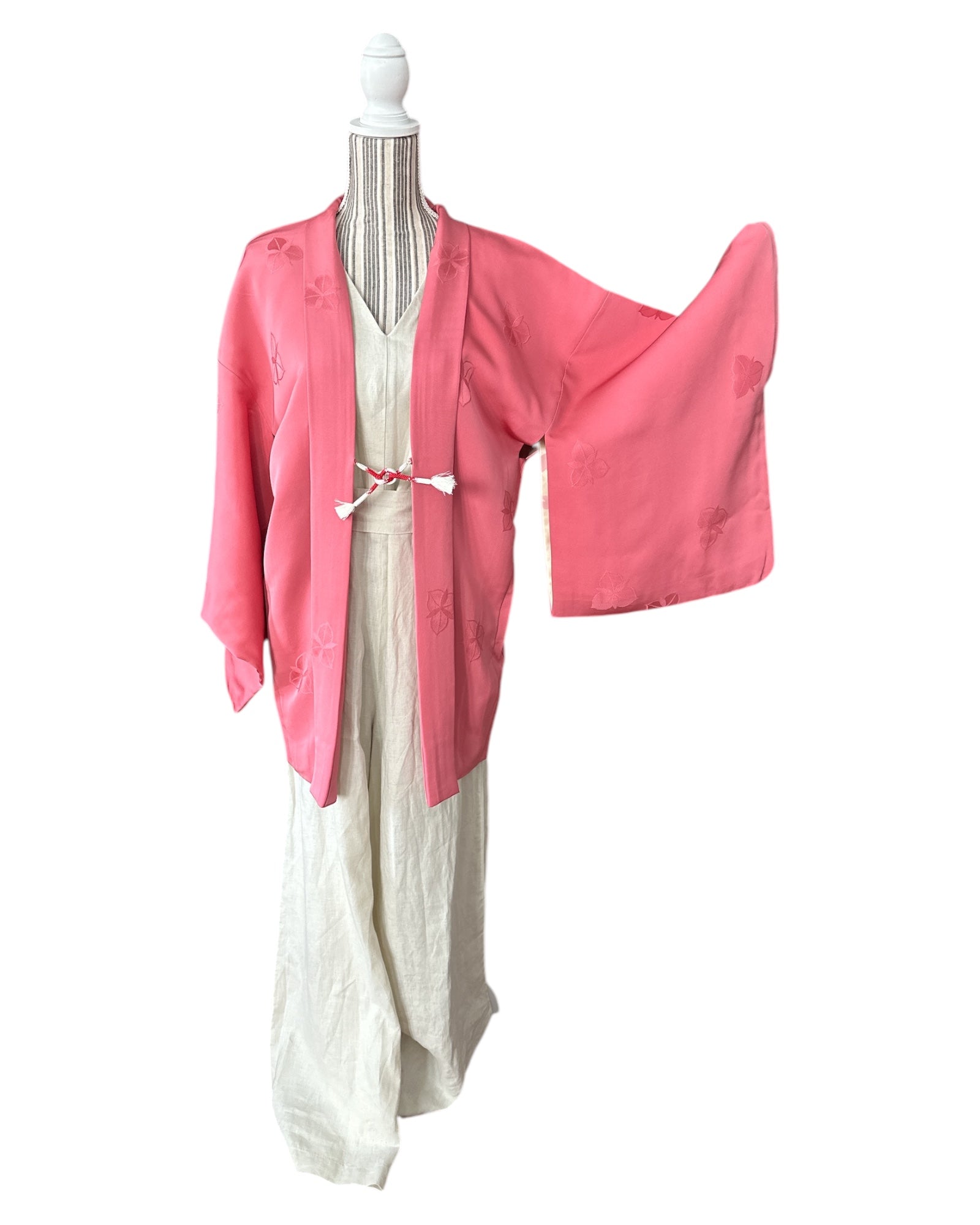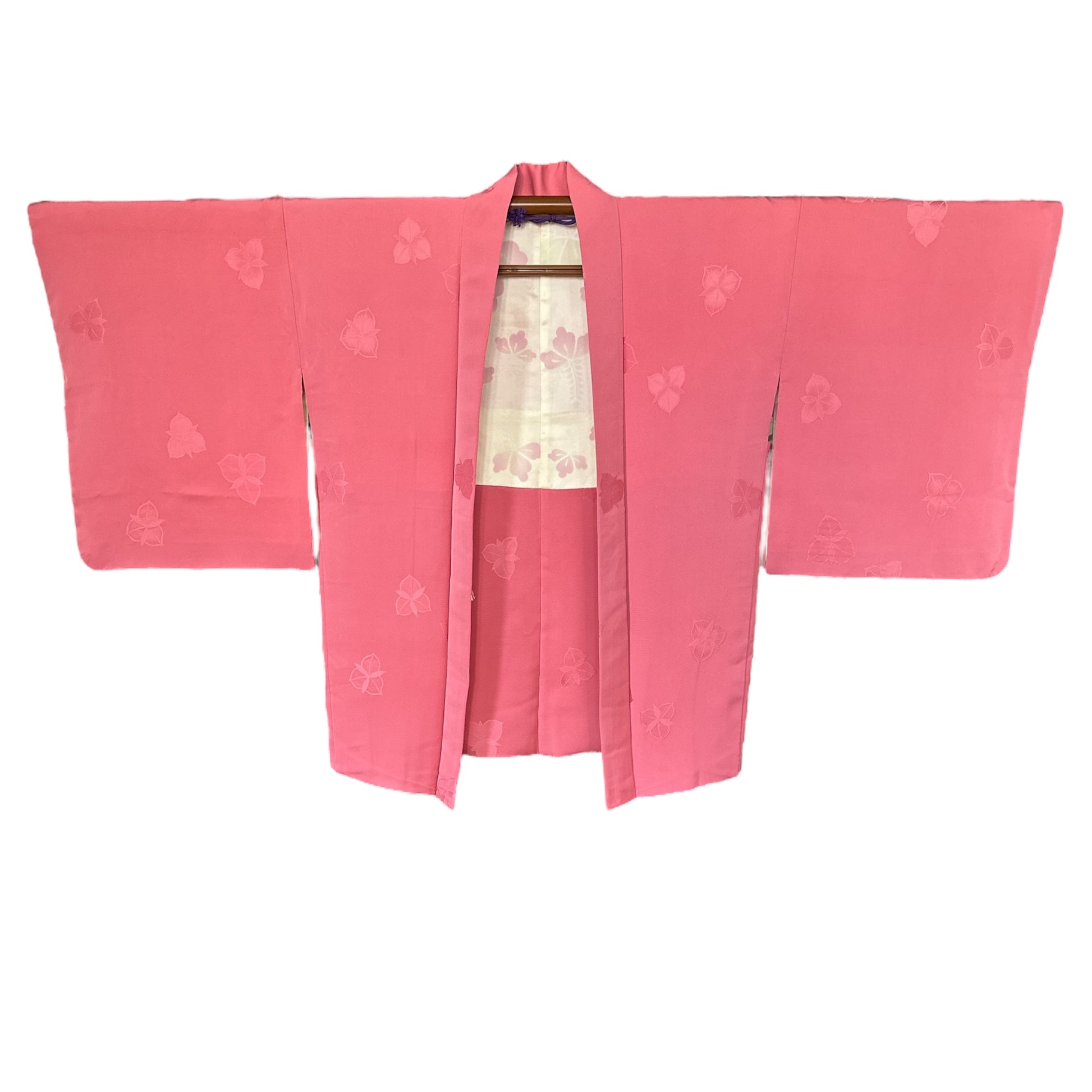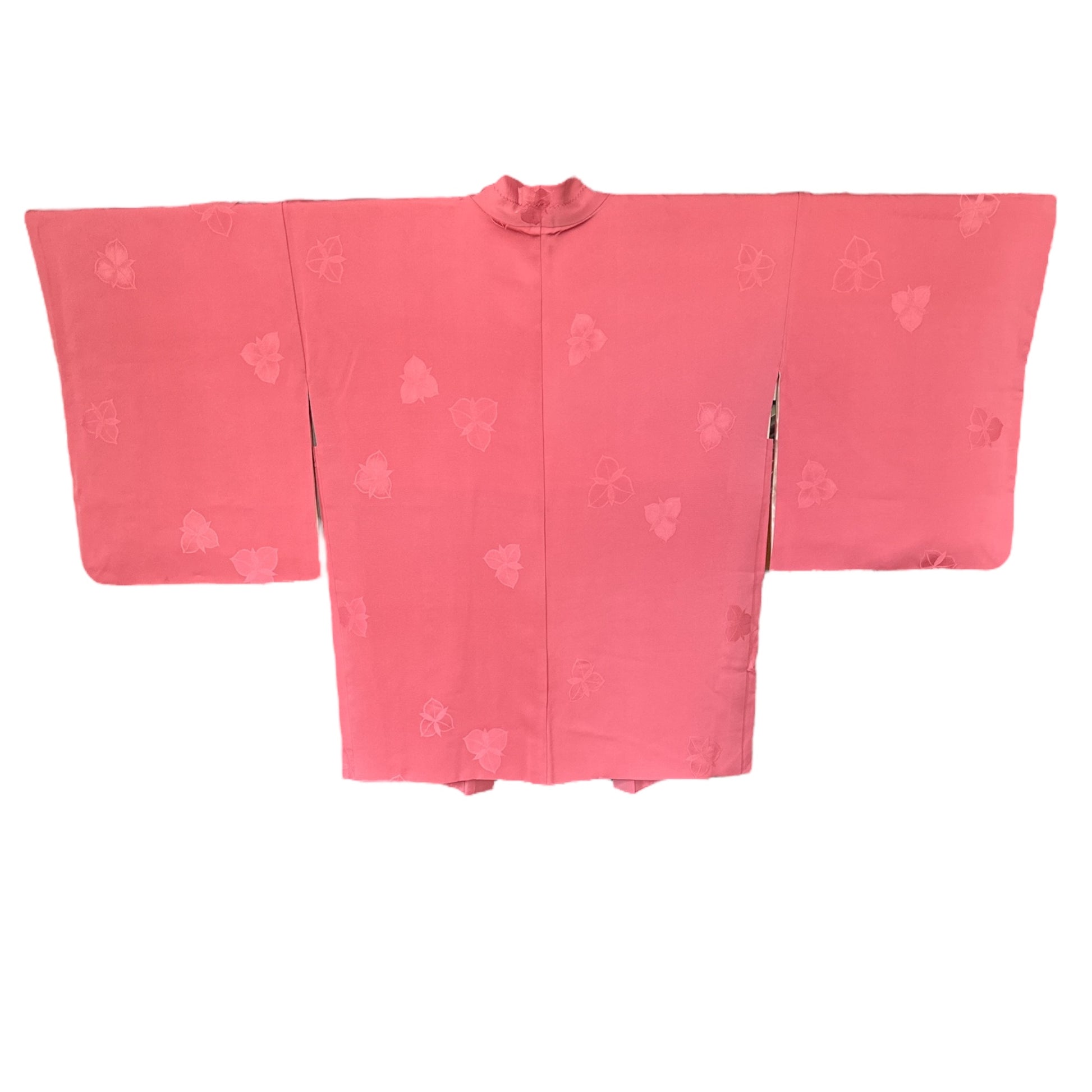 Description: This elegant women’s haori is made from warm pink silk, woven with a delicate pattern of stylised momiji (maple leaves). The design adds a soft, refined texture that enhances the piece’s understated beauty, offering timeless appeal and traditional charm.