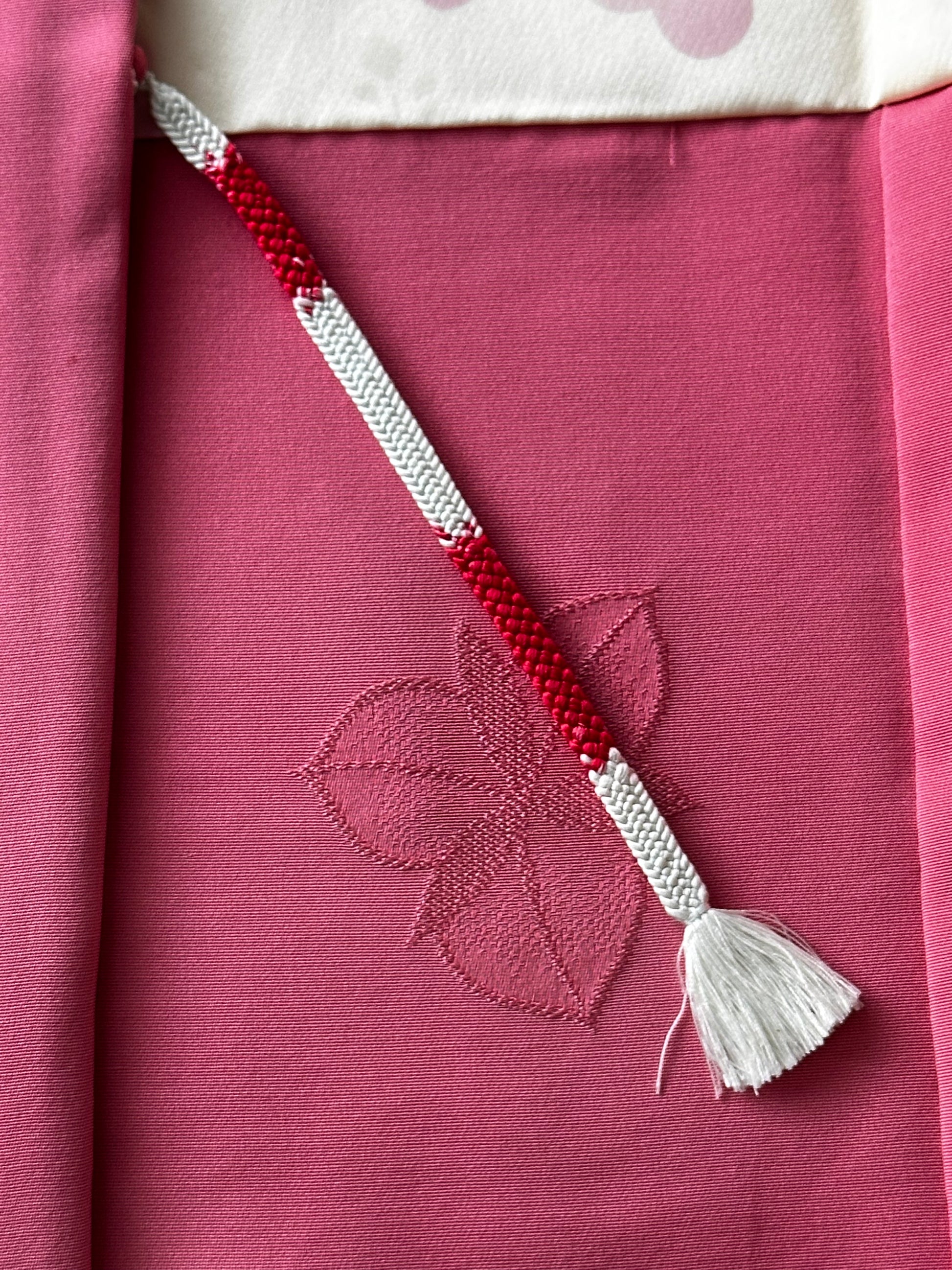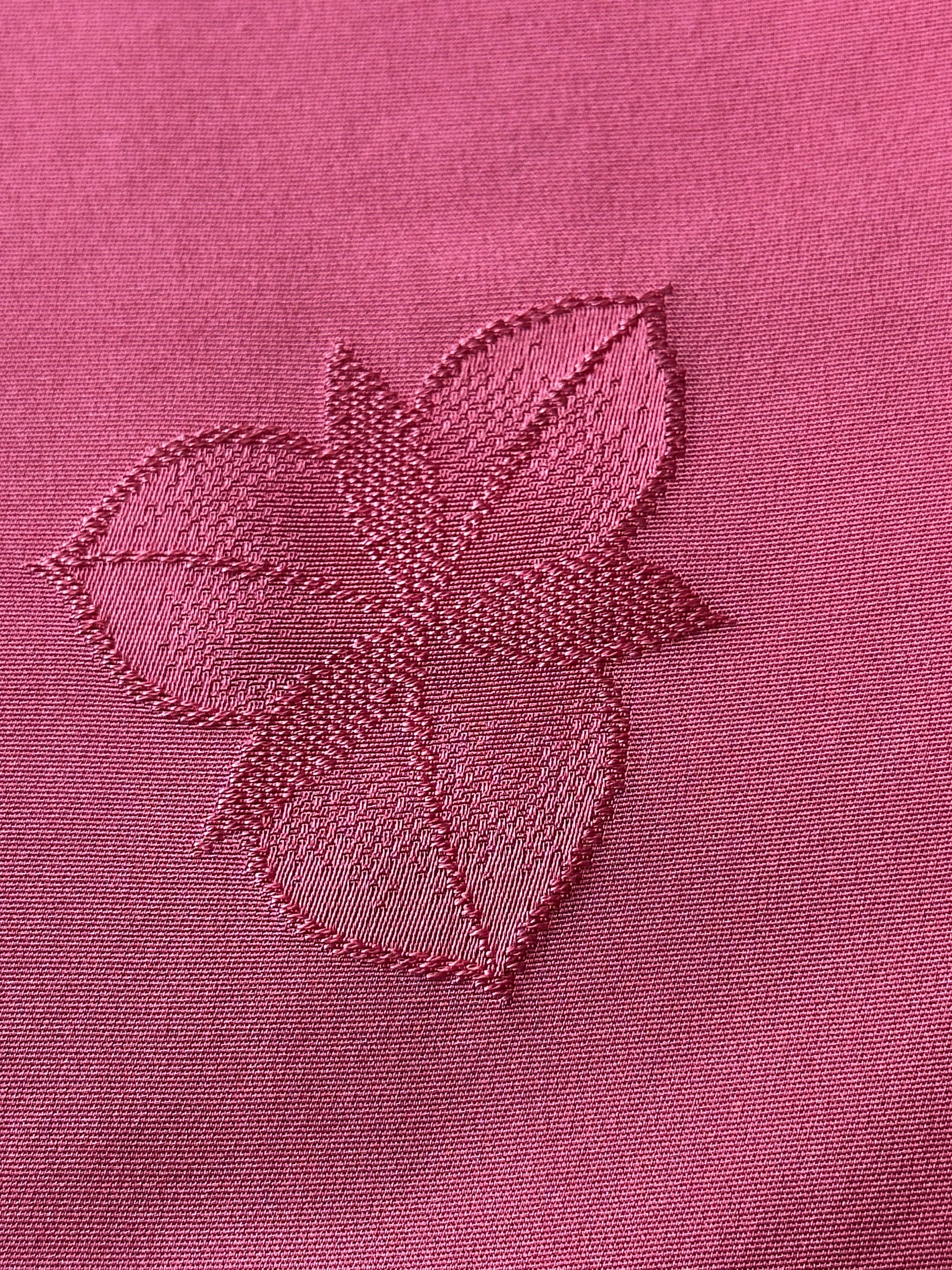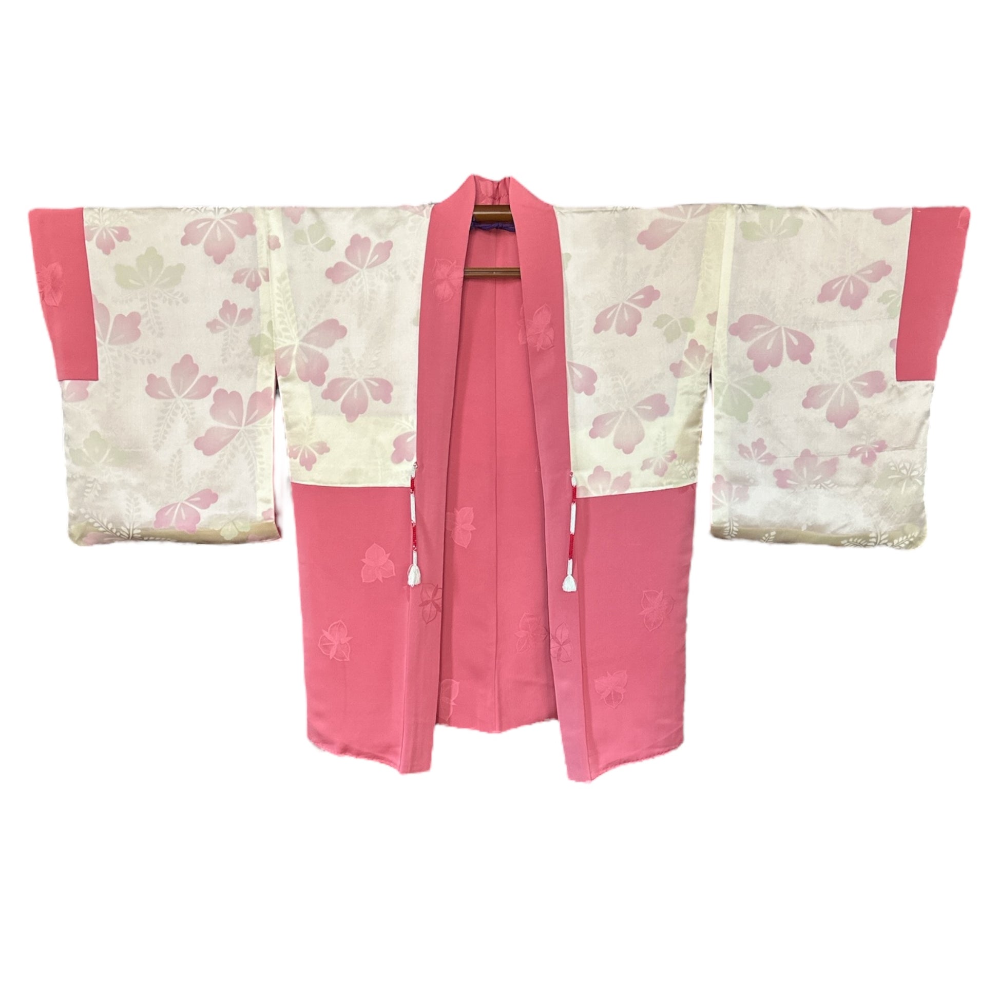 Description: This elegant women’s haori is made from warm pink silk, woven with a delicate pattern of stylised momiji (maple leaves). The design adds a soft, refined texture that enhances the piece’s understated beauty, offering timeless appeal and traditional charm.