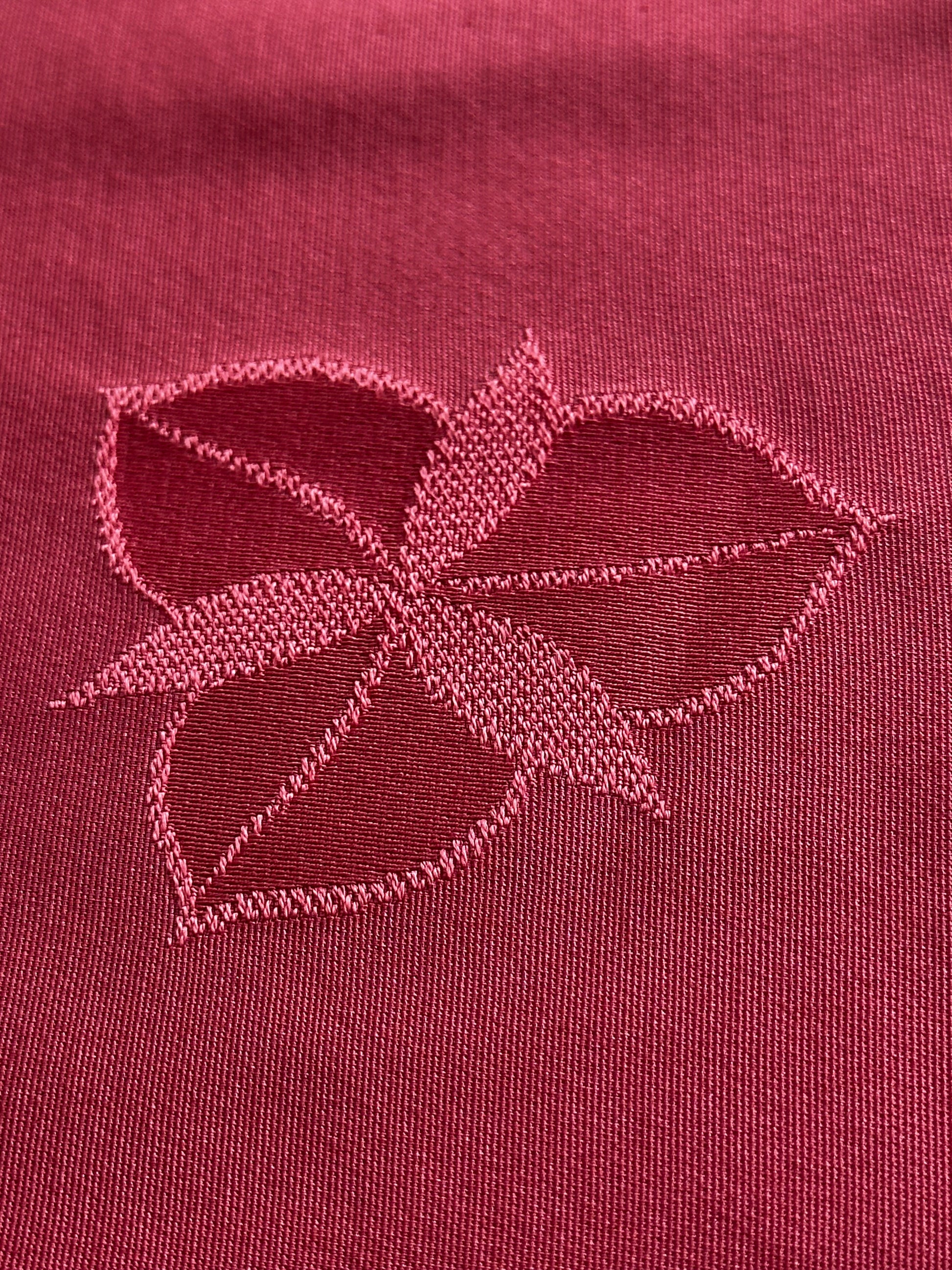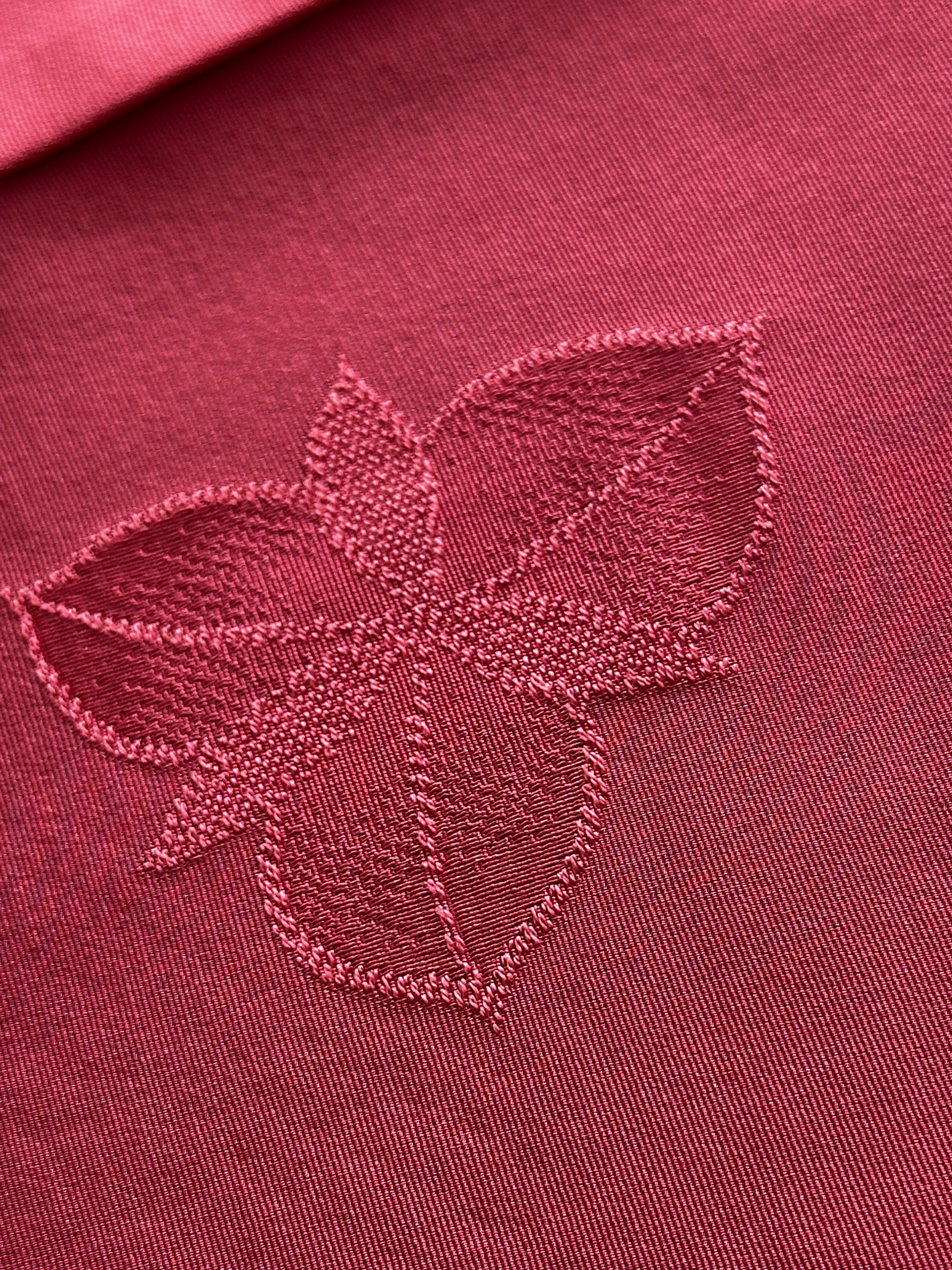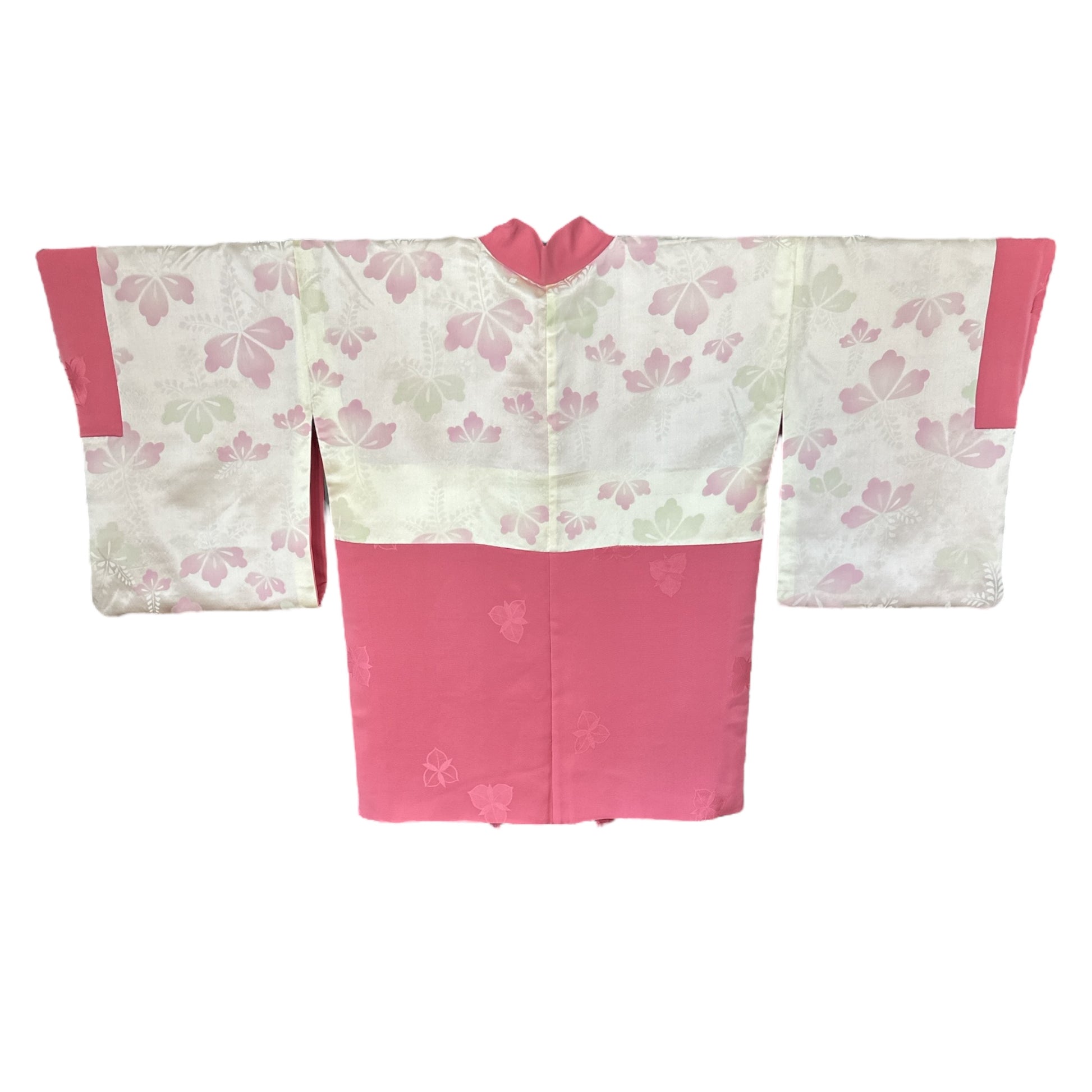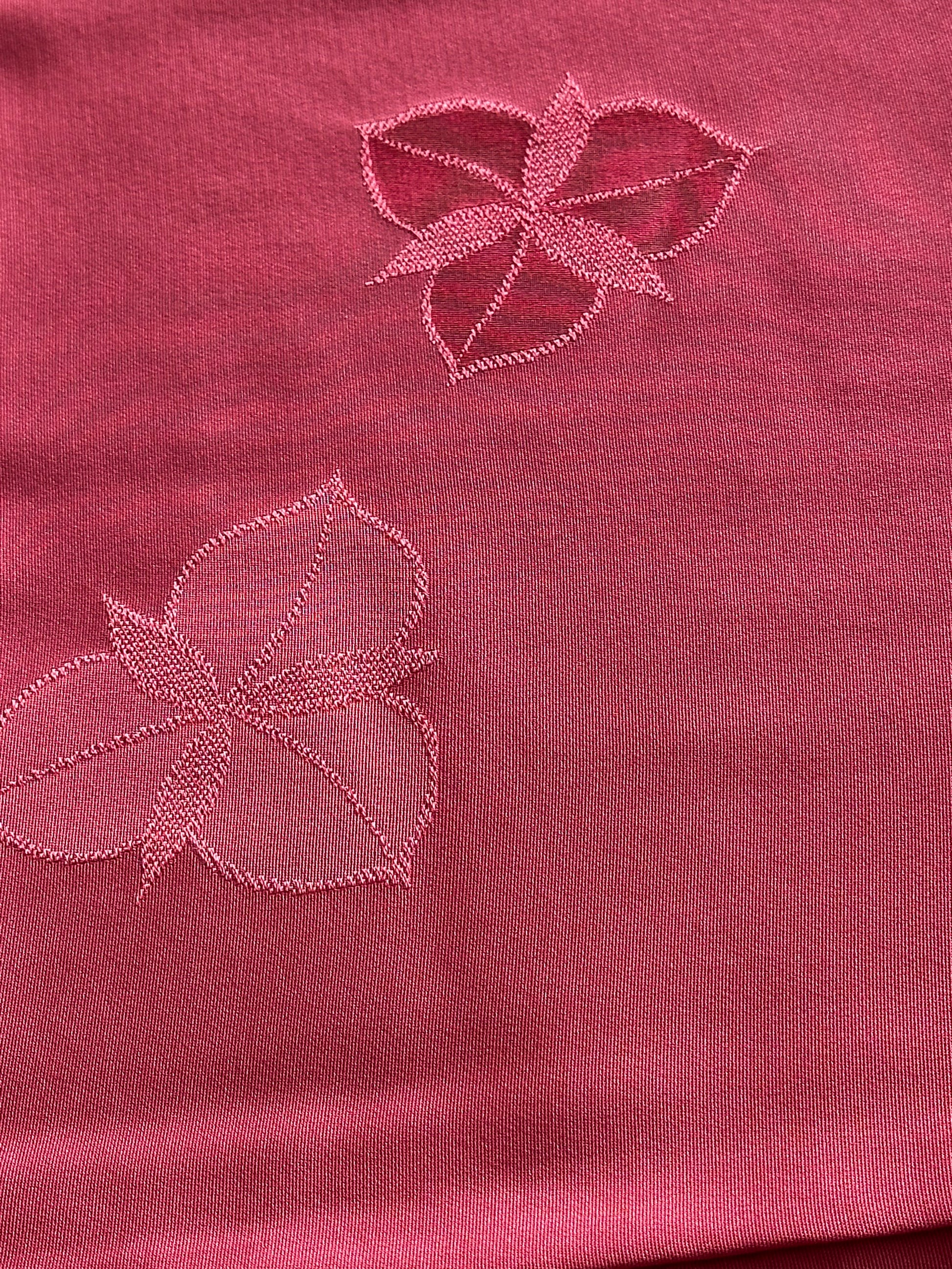 Description: This elegant women’s haori is made from warm pink silk, woven with a delicate pattern of stylised momiji (maple leaves). The design adds a soft, refined texture that enhances the piece’s understated beauty, offering timeless appeal and traditional charm.