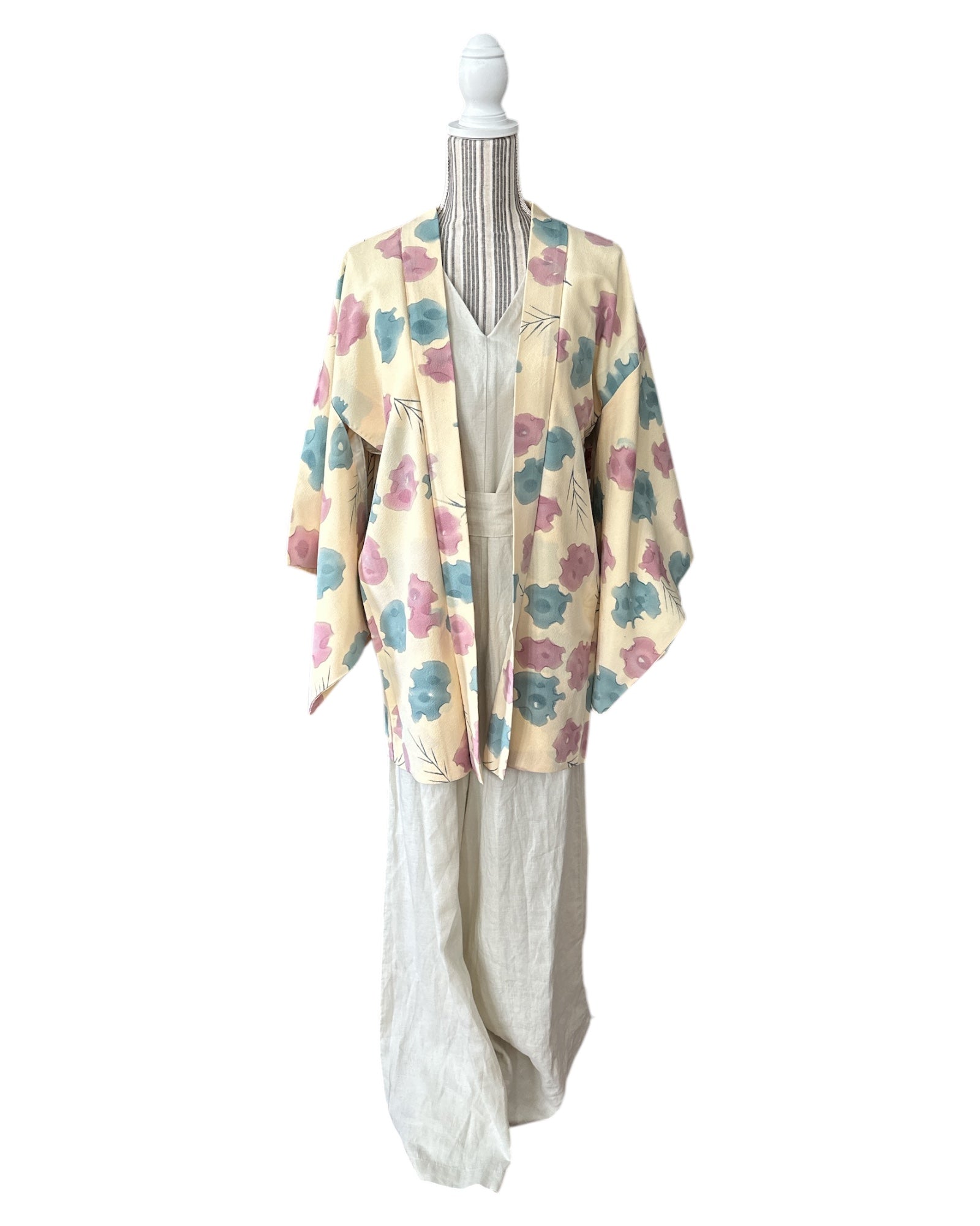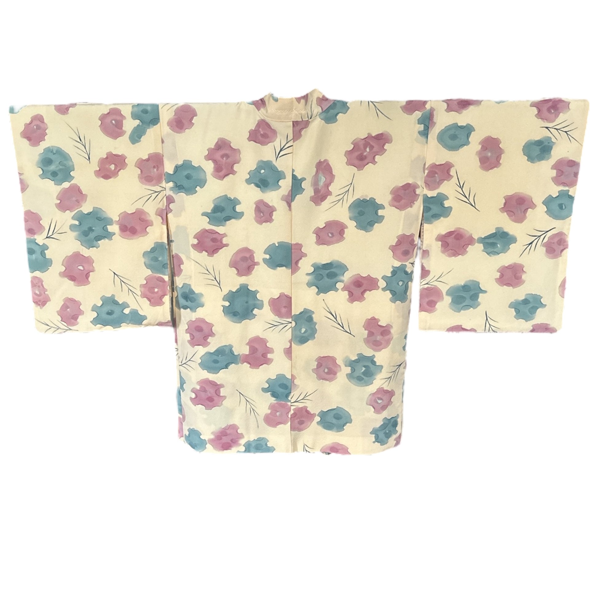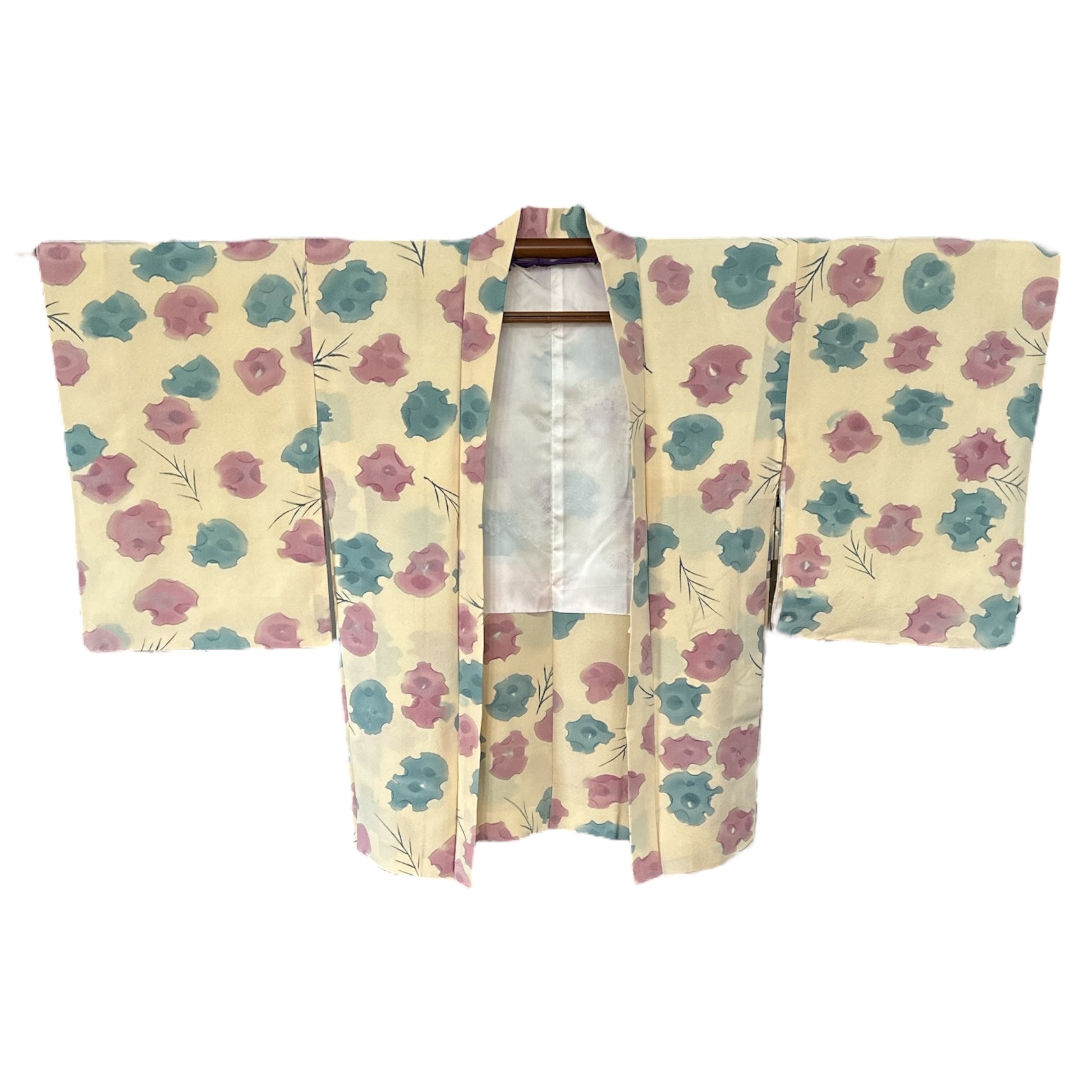 Description: This elegant vintage women’s haori features a soft light cream background adorned with a repeating pattern of stylised flowers. The flowers, rendered in muted dusty rose and soft blue-green, have a delicate, almost blurred effect, giving them a beautiful watercolor appearance that adds to the piece's airy, ethereal charm.