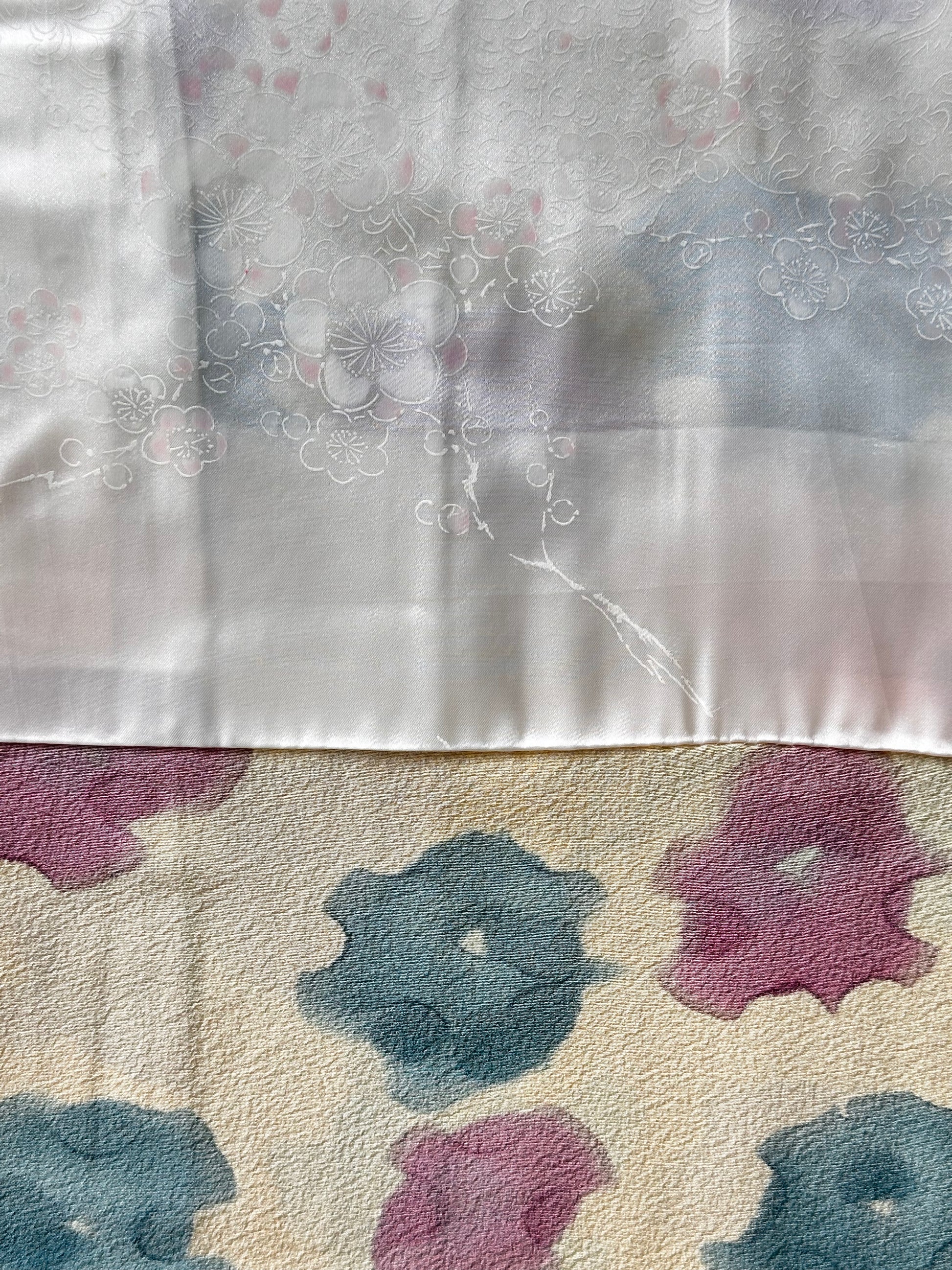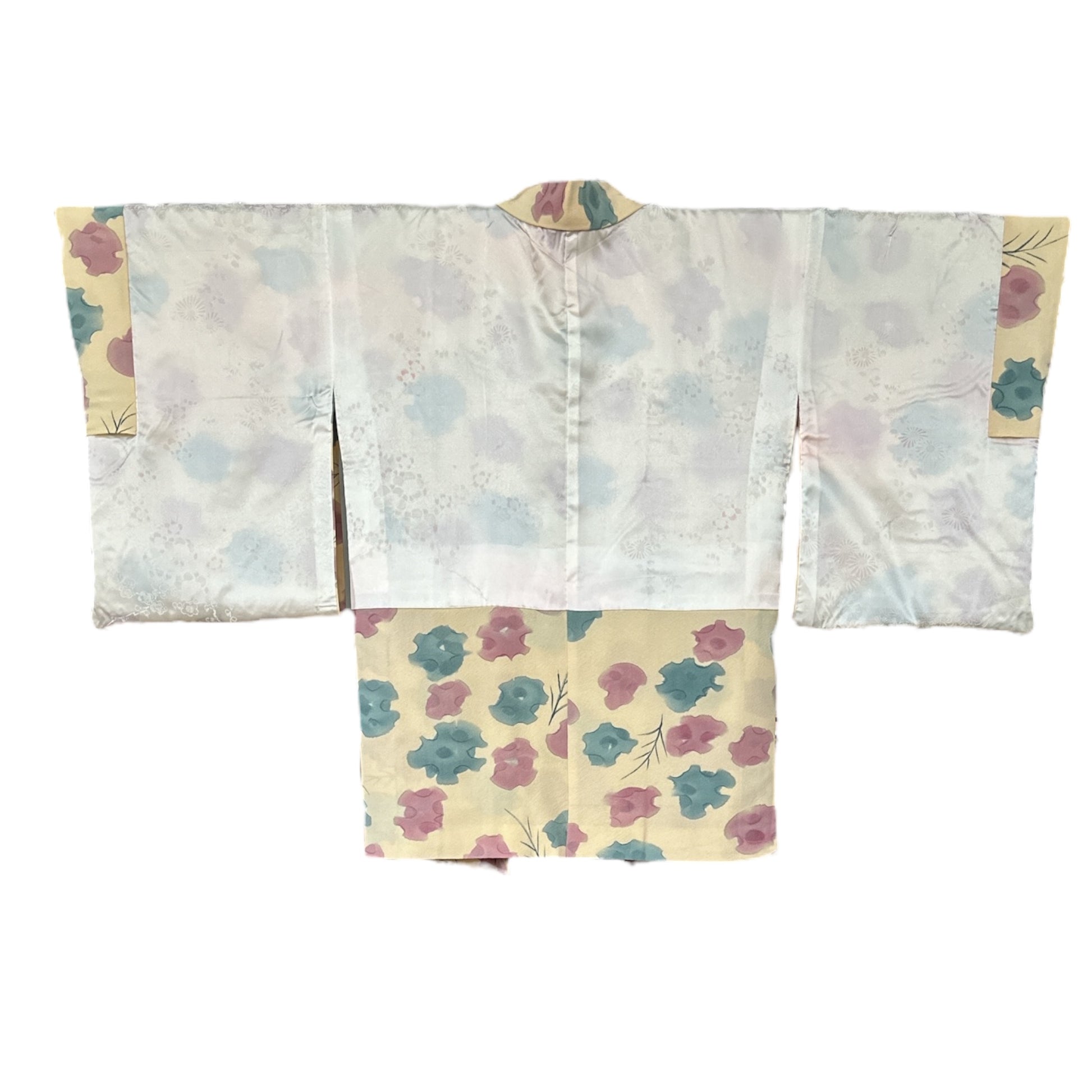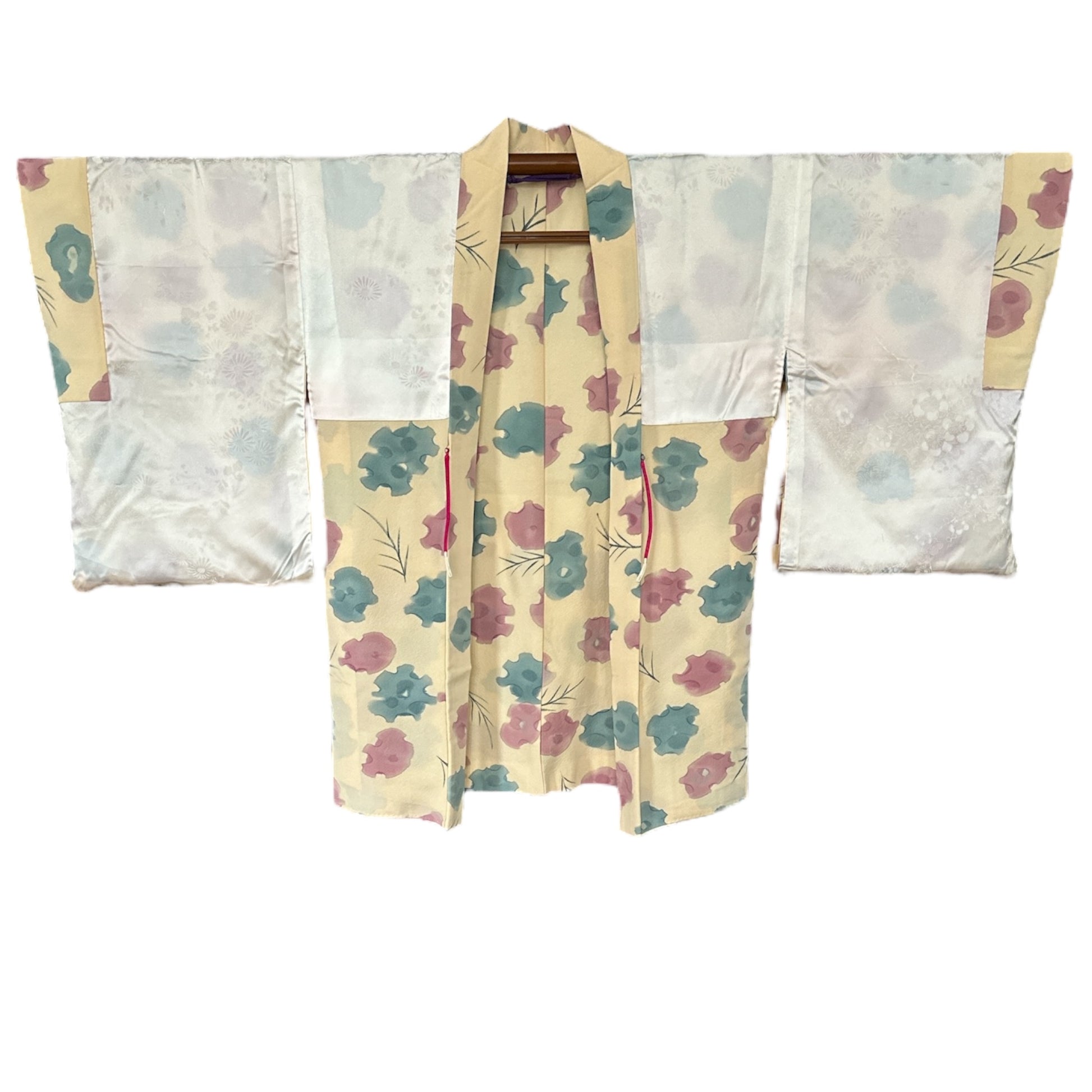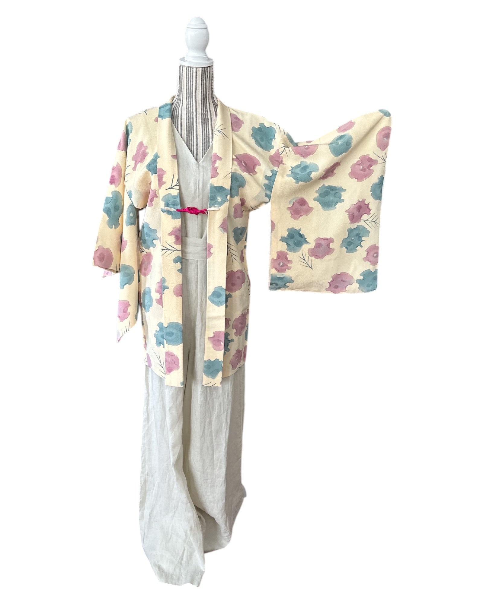 Description: This elegant vintage women’s haori features a soft light cream background adorned with a repeating pattern of stylised flowers. The flowers, rendered in muted dusty rose and soft blue-green, have a delicate, almost blurred effect, giving them a beautiful watercolor appearance that adds to the piece's airy, ethereal charm.