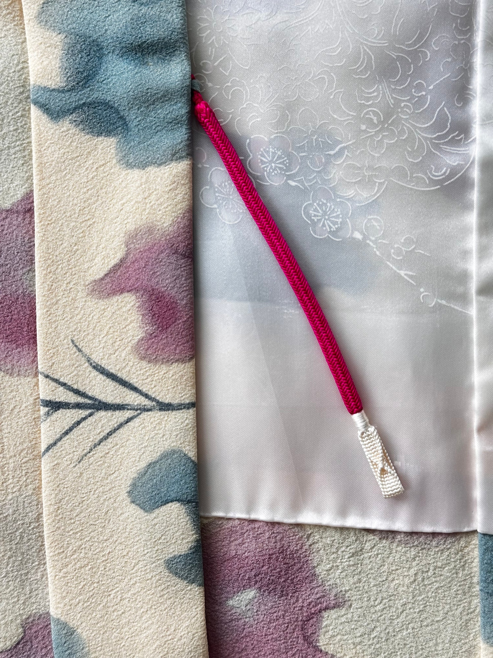 Style: The haori includes haori himo (decorative braided ties), completing the traditional open-front style. Its tranquil color palette and graceful design make it perfect for layering over a variety of outfits, offering a touch of understated elegance.