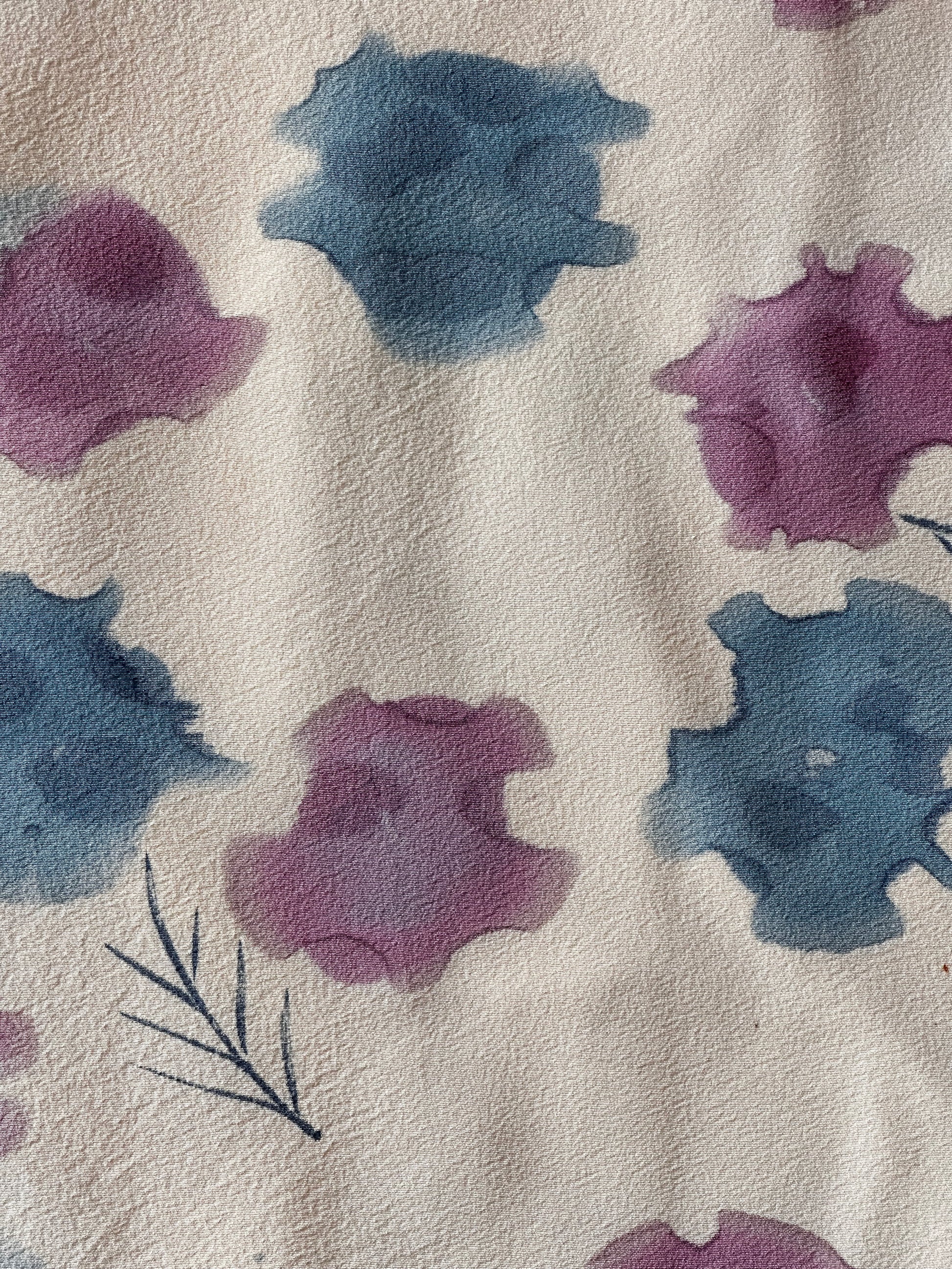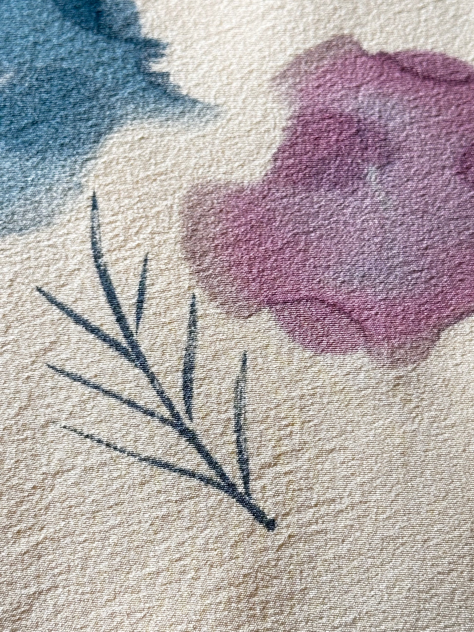 Fabric: Crafted from silk, the fabric has a smooth, luxurious texture, and the watercolor effect of the flowers adds a soft, artistic dimension. The muted color and gentle design make it a versatile, timeless garment.
