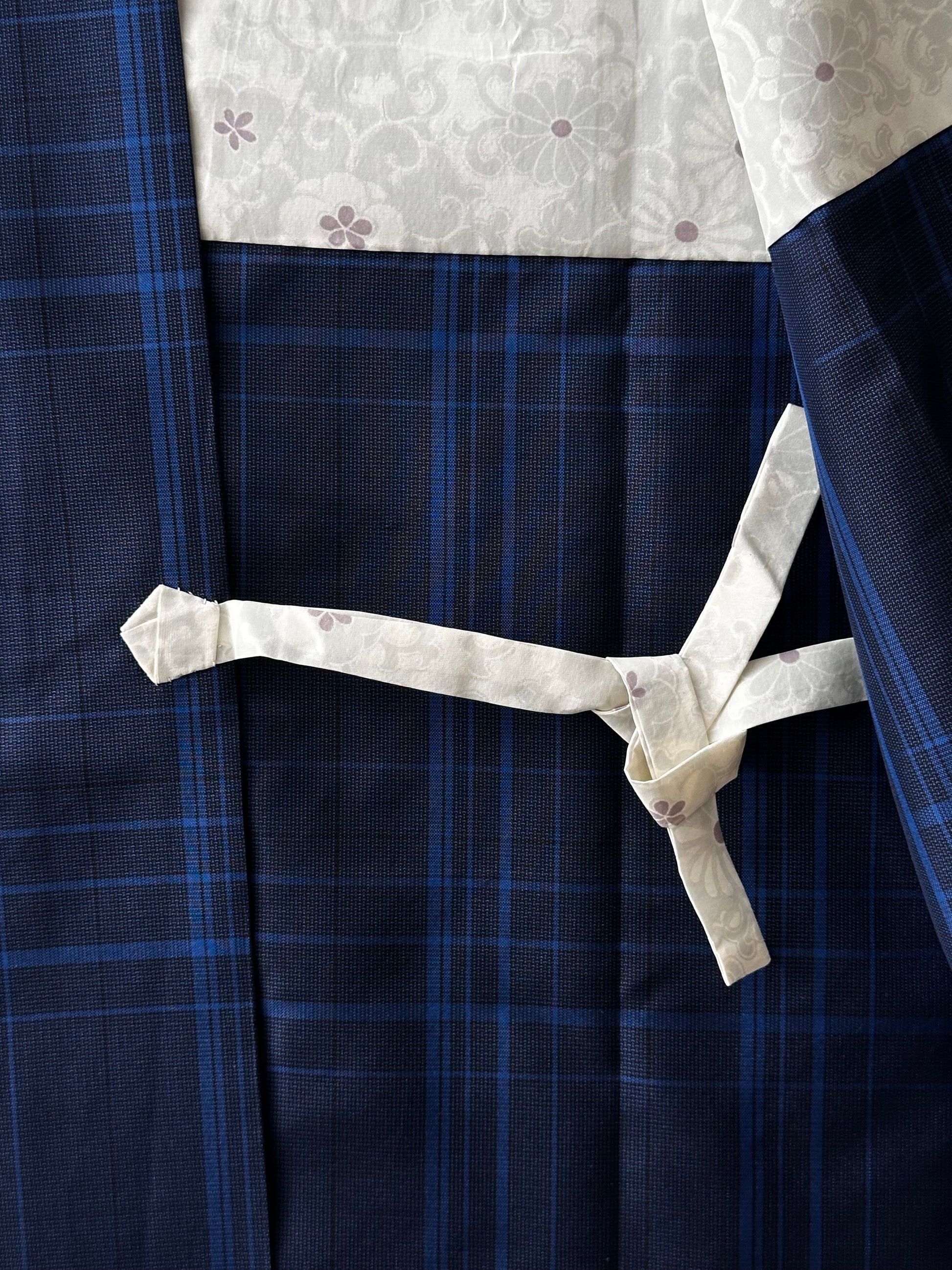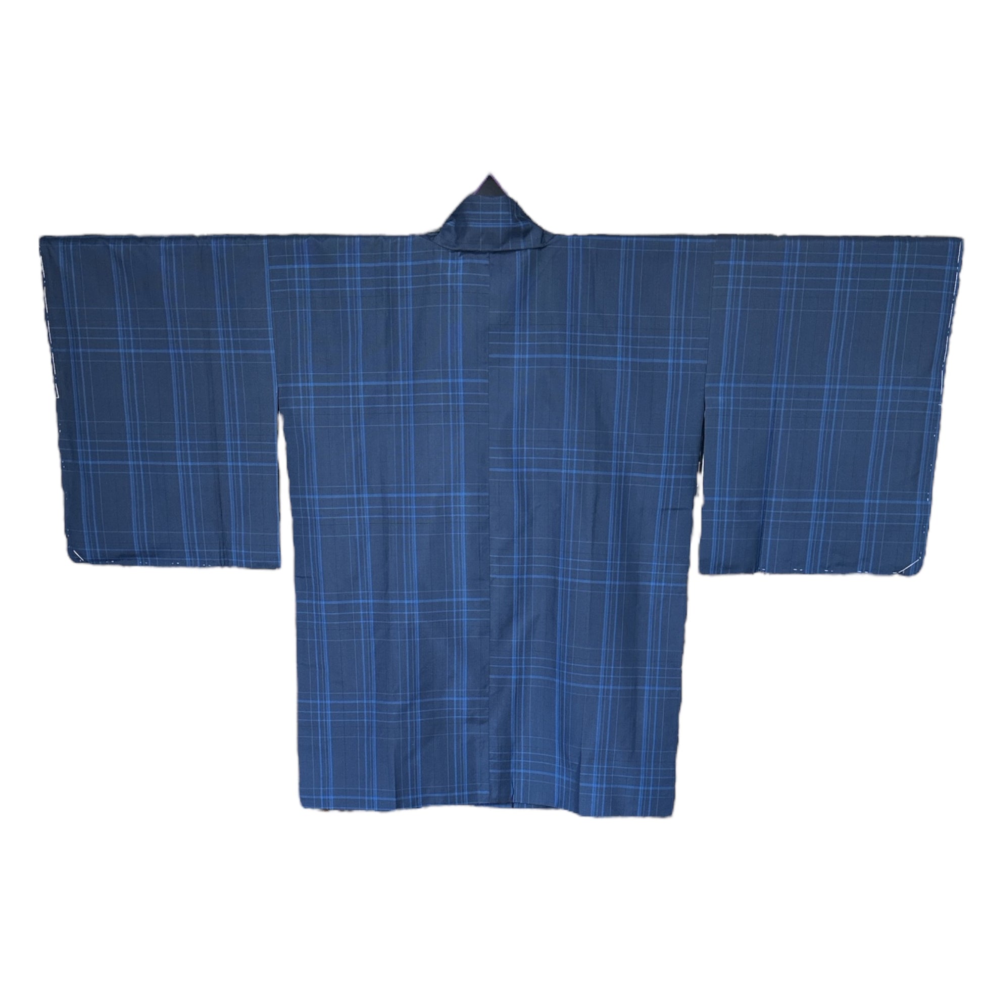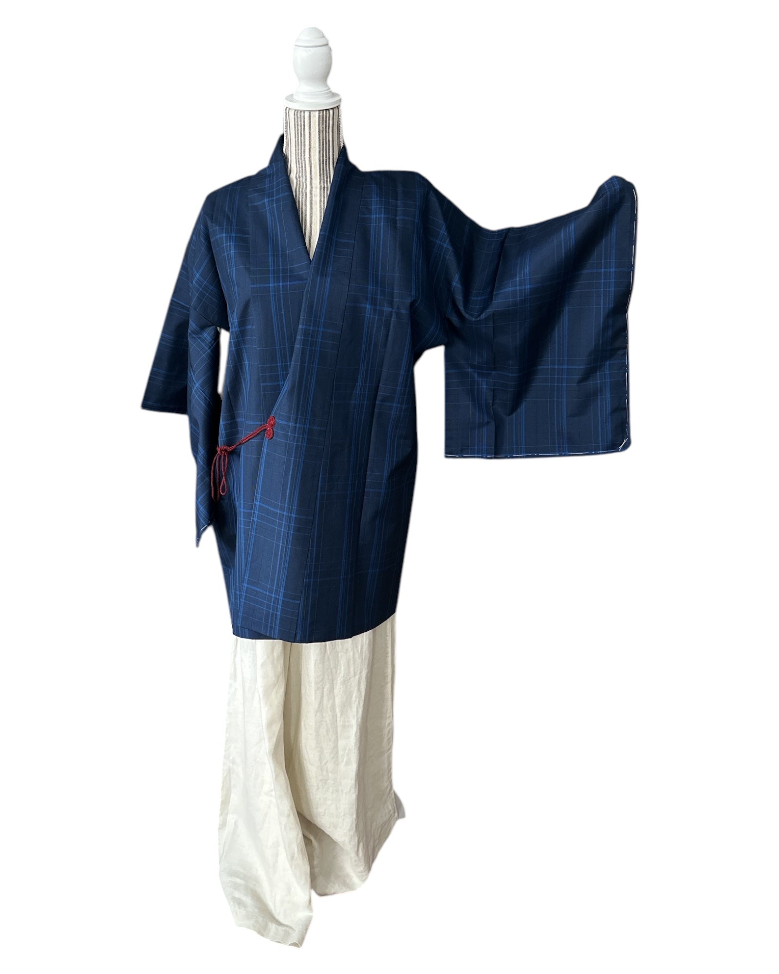 Description: This stylish women’s dochugi is crafted from pongee silk in a striking dark blue indigo base, complemented by bold black stripes that form a contemporary checkered pattern. The design is modern yet rooted in traditional craft, making it a standout piece for any wardrobe.