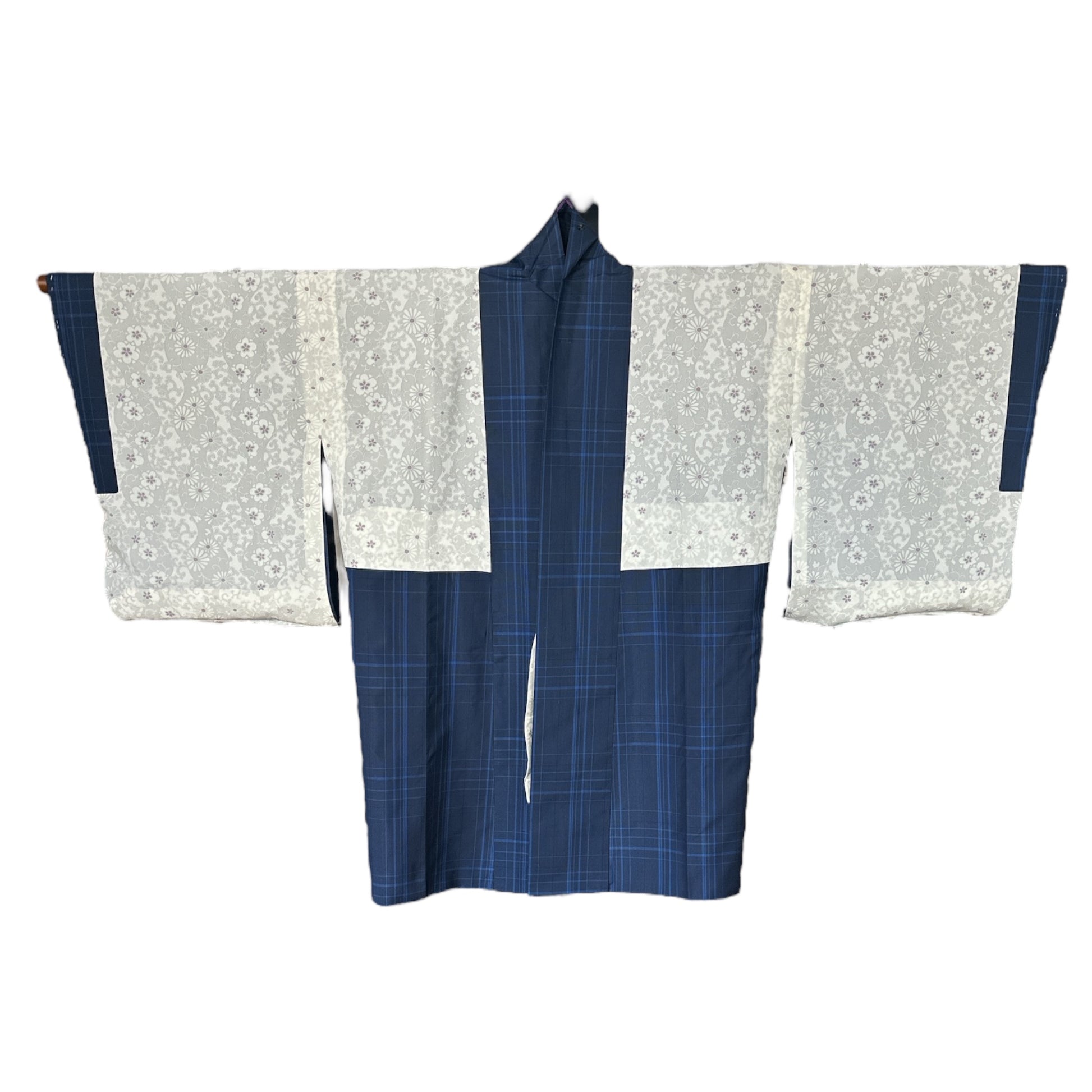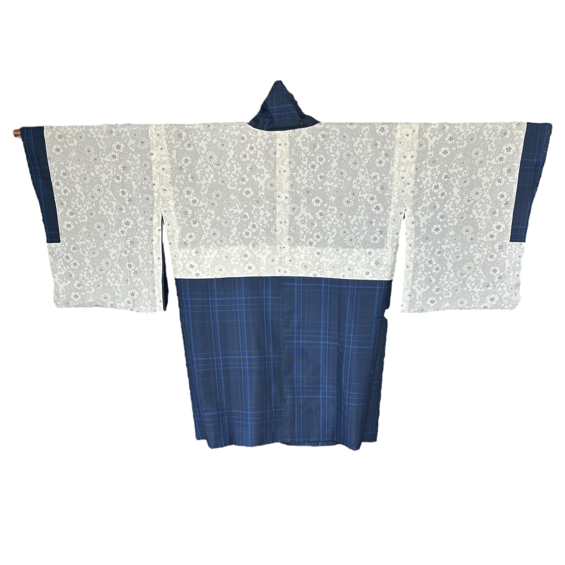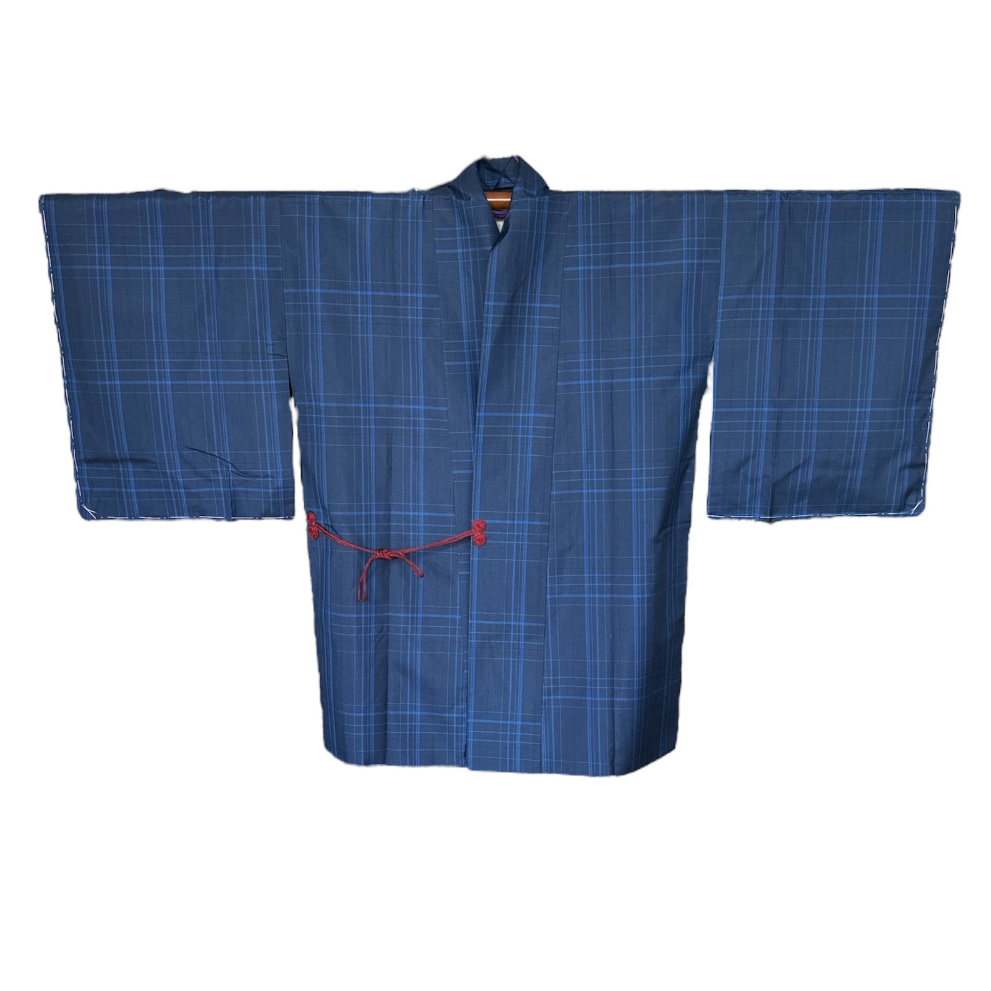 Description: This stylish women’s dochugi is crafted from pongee silk in a striking dark blue indigo base, complemented by bold black stripes that form a contemporary checkered pattern. The design is modern yet rooted in traditional craft, making it a standout piece for any wardrobe.