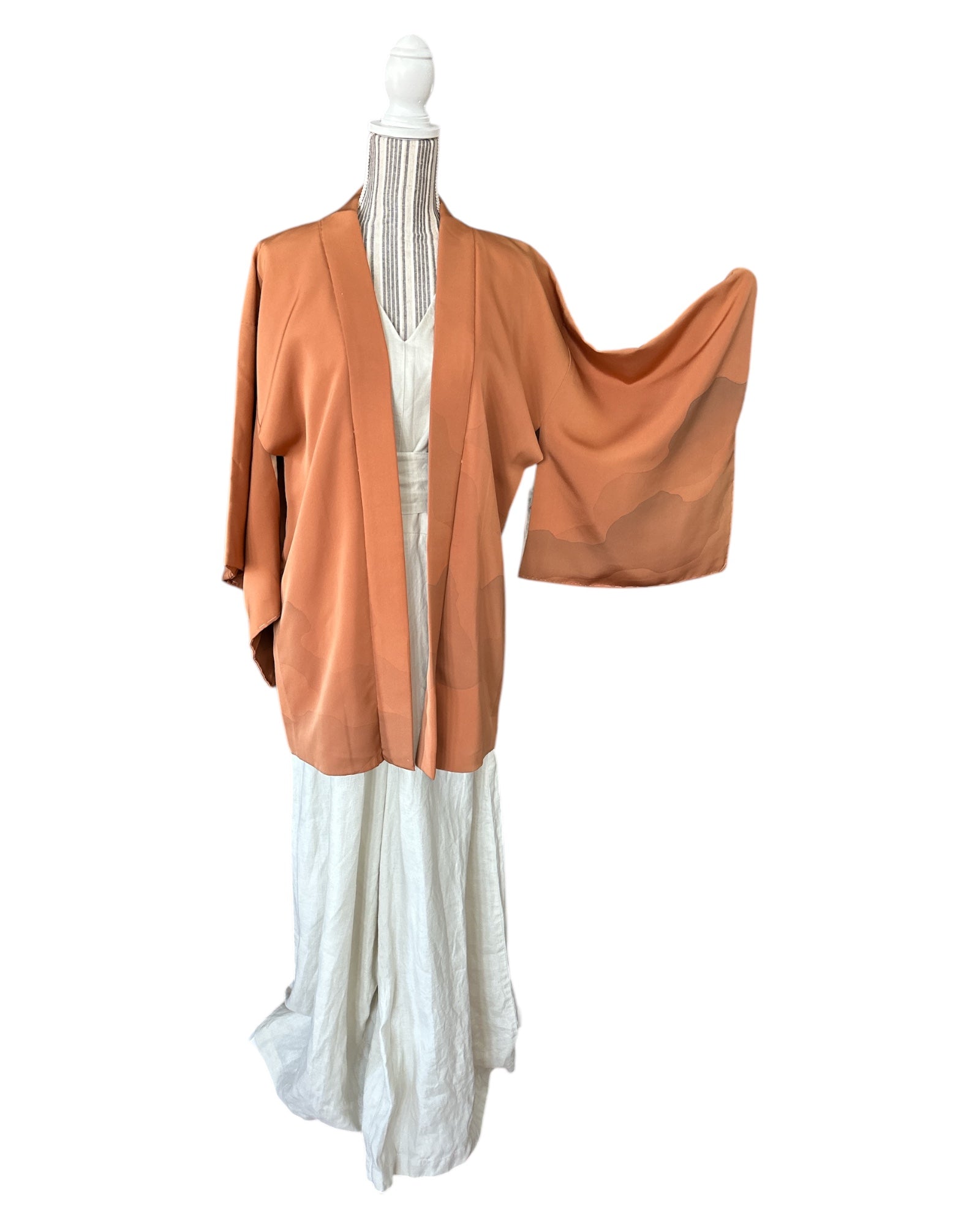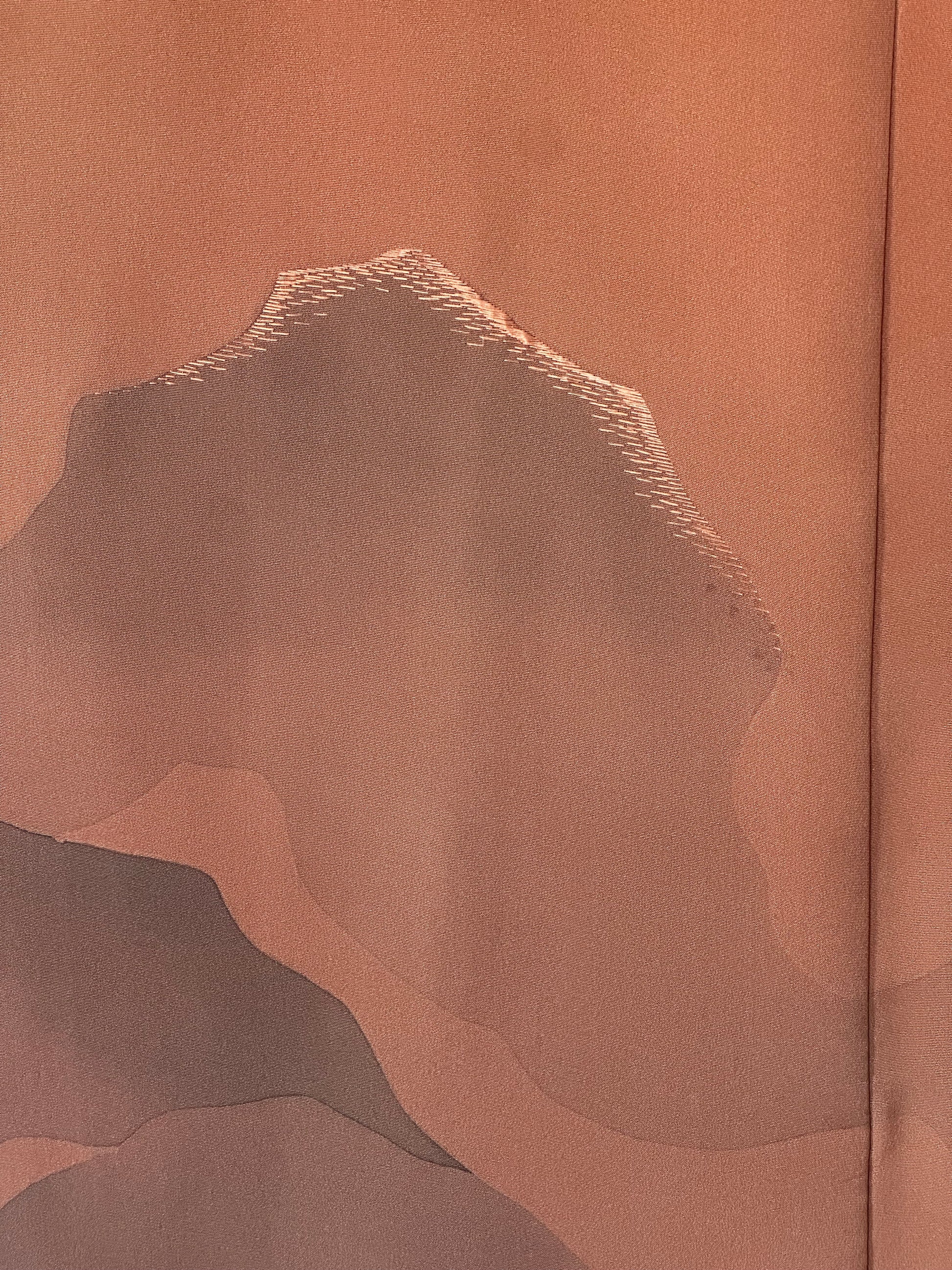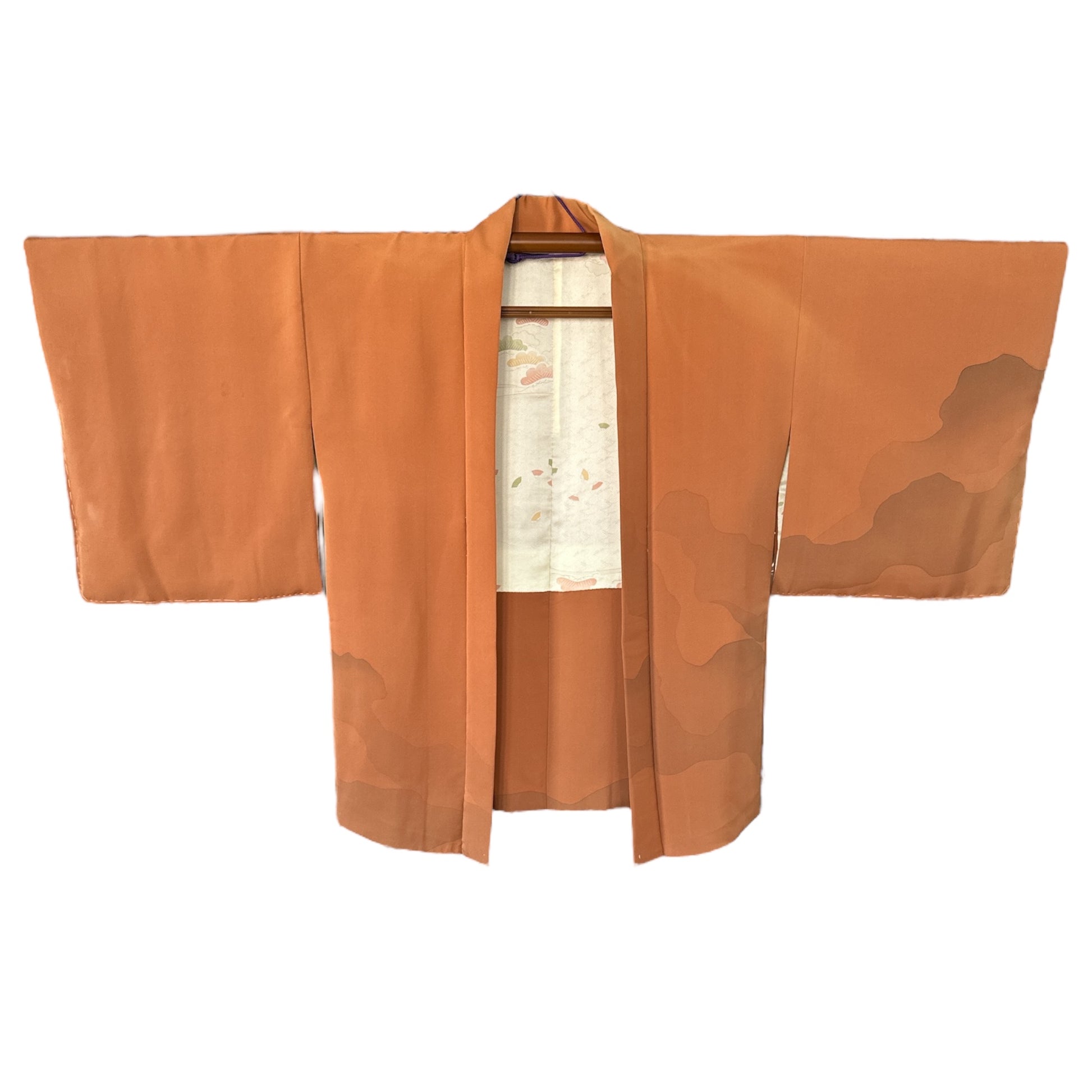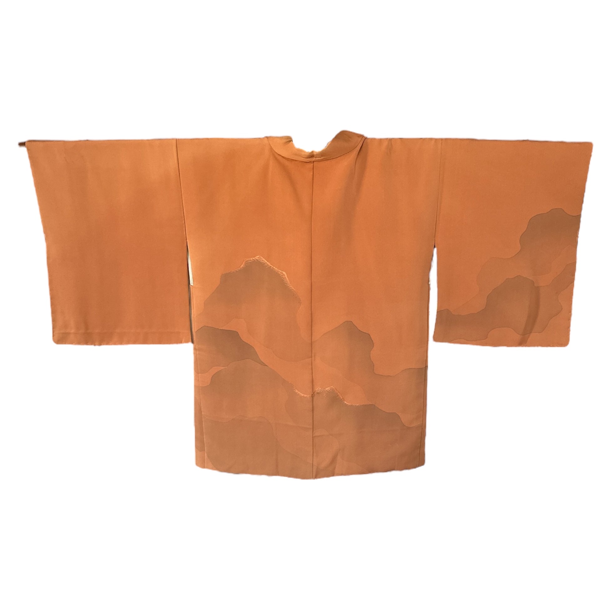 Design: This exquisite vintage haori showcases a breathtaking ombre mountain motif, fading gracefully across the fabric. The base color is Kaba (a warm terracotta brown), evoking the natural beauty of sunlit earth and aged wood. On the back, the mountain peaks are delicately embroidered, adding depth and a subtle shimmer that enhances the flowing gradient. This balance of soft transitions and fine detailing creates a serene yet striking aesthetic. The haori is completed with haori himo, preserving its traditional charm.