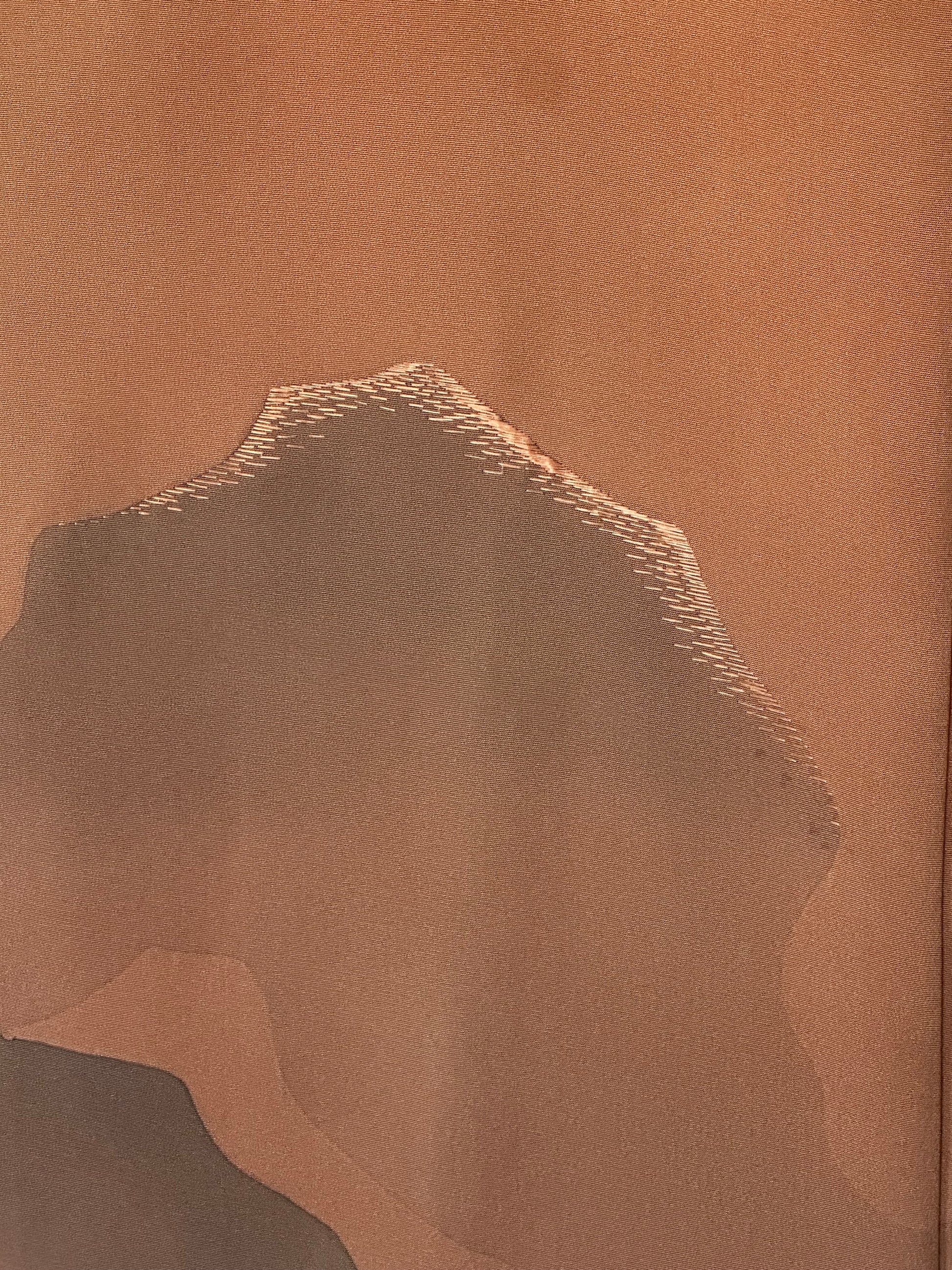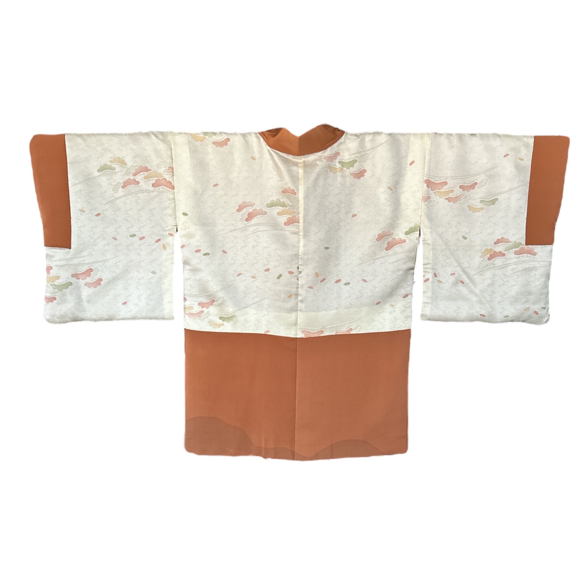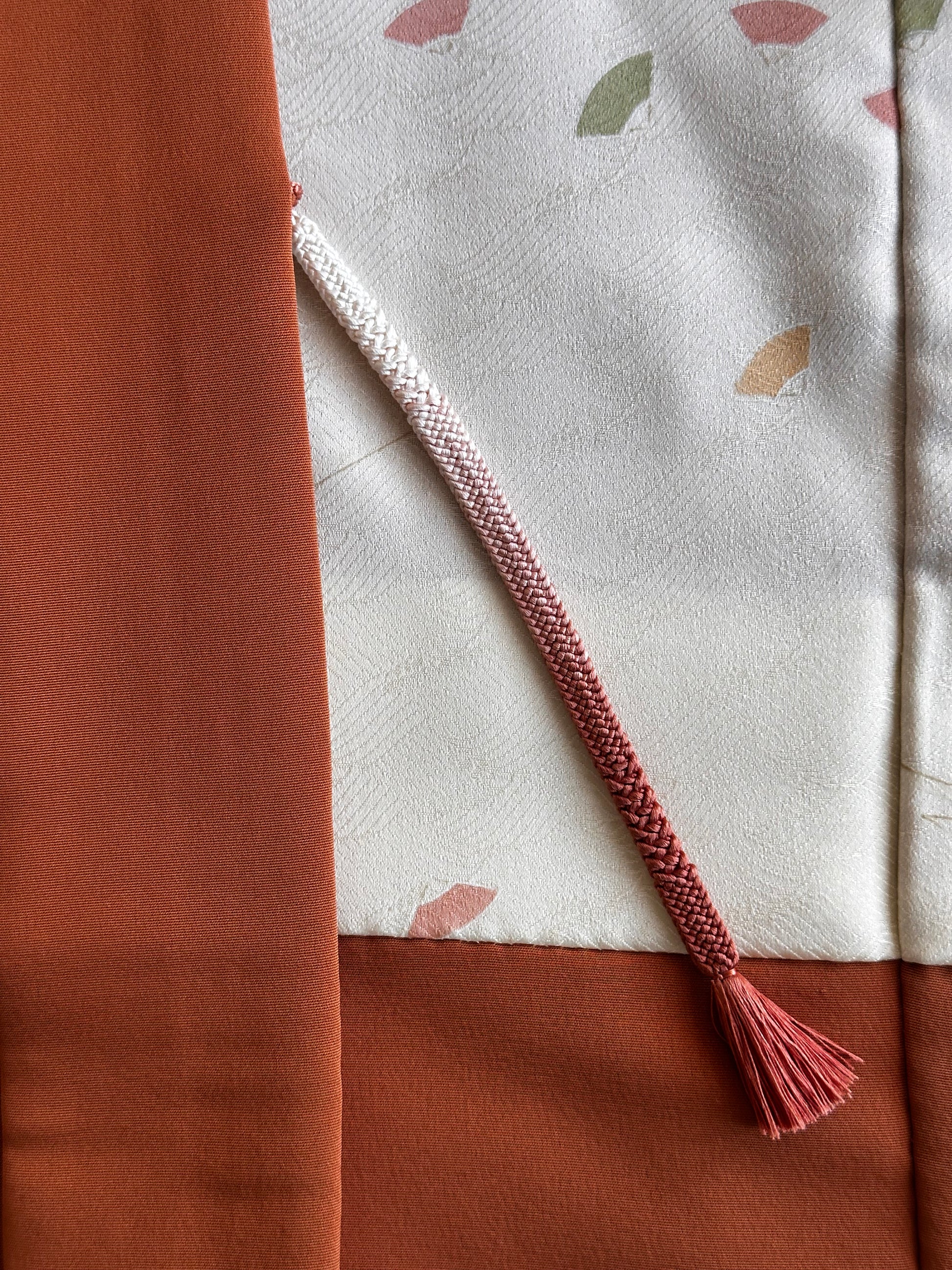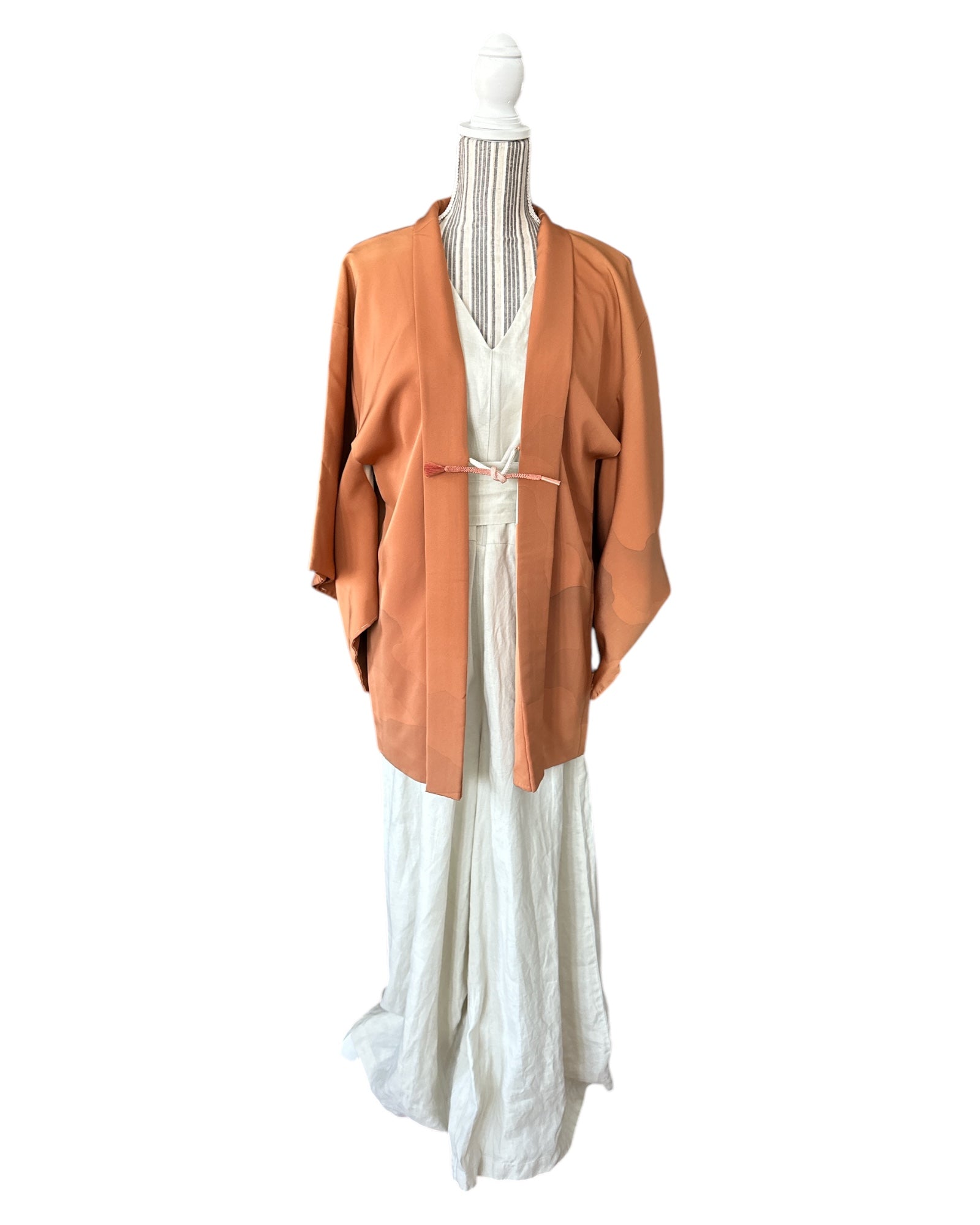 Design: This exquisite vintage haori showcases a breathtaking ombre mountain motif, fading gracefully across the fabric. The base color is Kaba (a warm terracotta brown), evoking the natural beauty of sunlit earth and aged wood. On the back, the mountain peaks are delicately embroidered, adding depth and a subtle shimmer that enhances the flowing gradient. This balance of soft transitions and fine detailing creates a serene yet striking aesthetic. The haori is completed with haori himo, preserving its traditional charm.