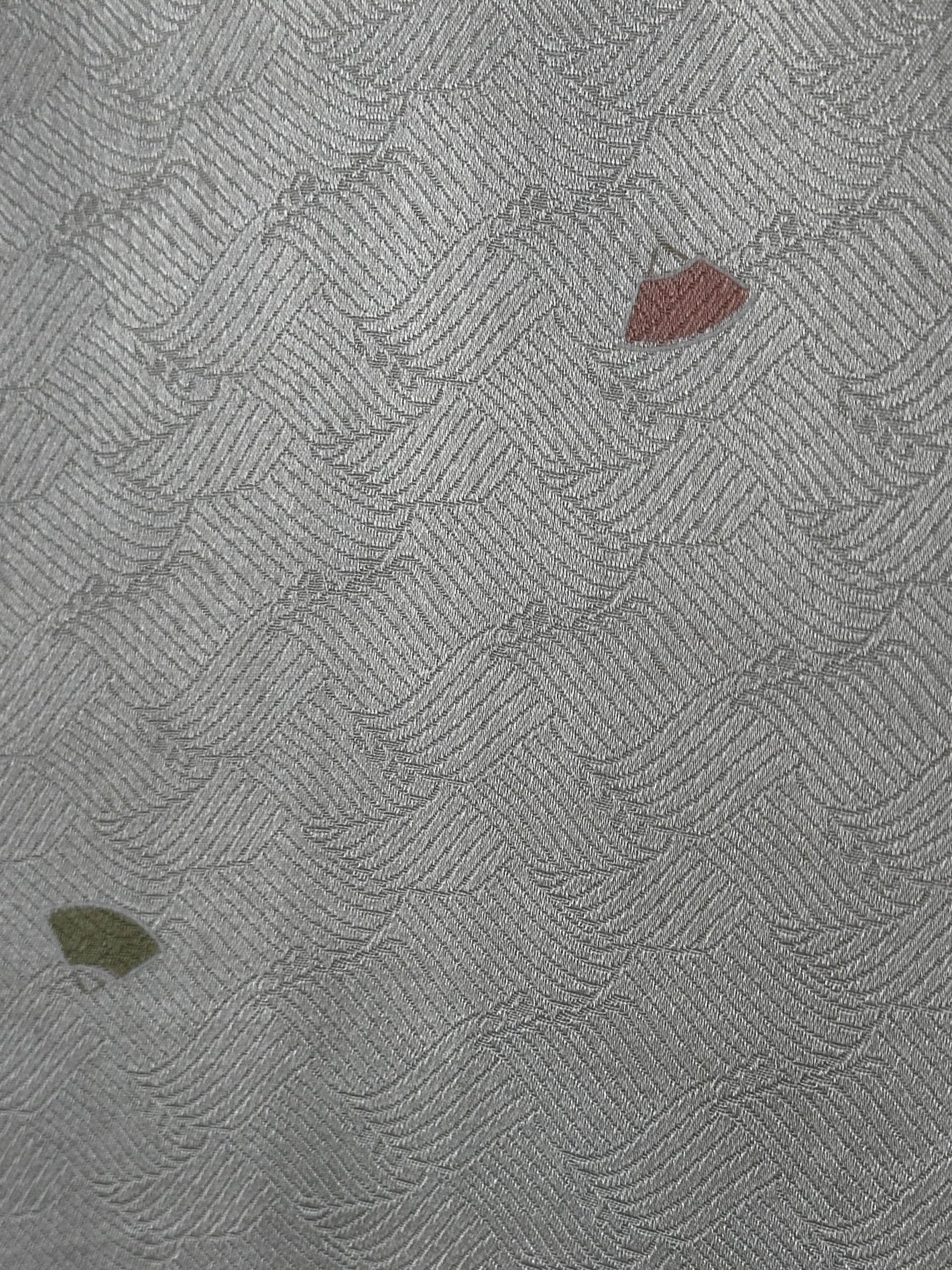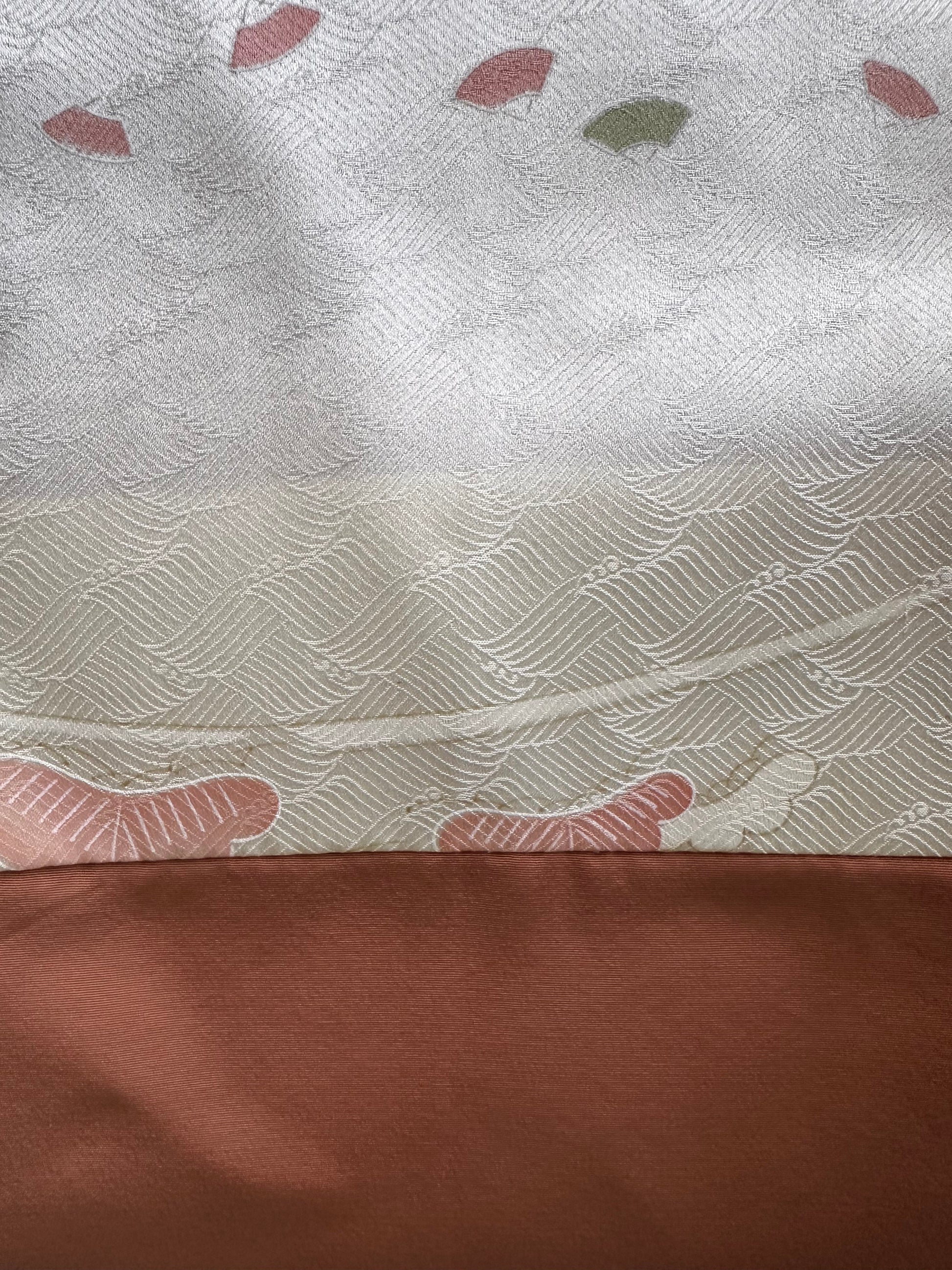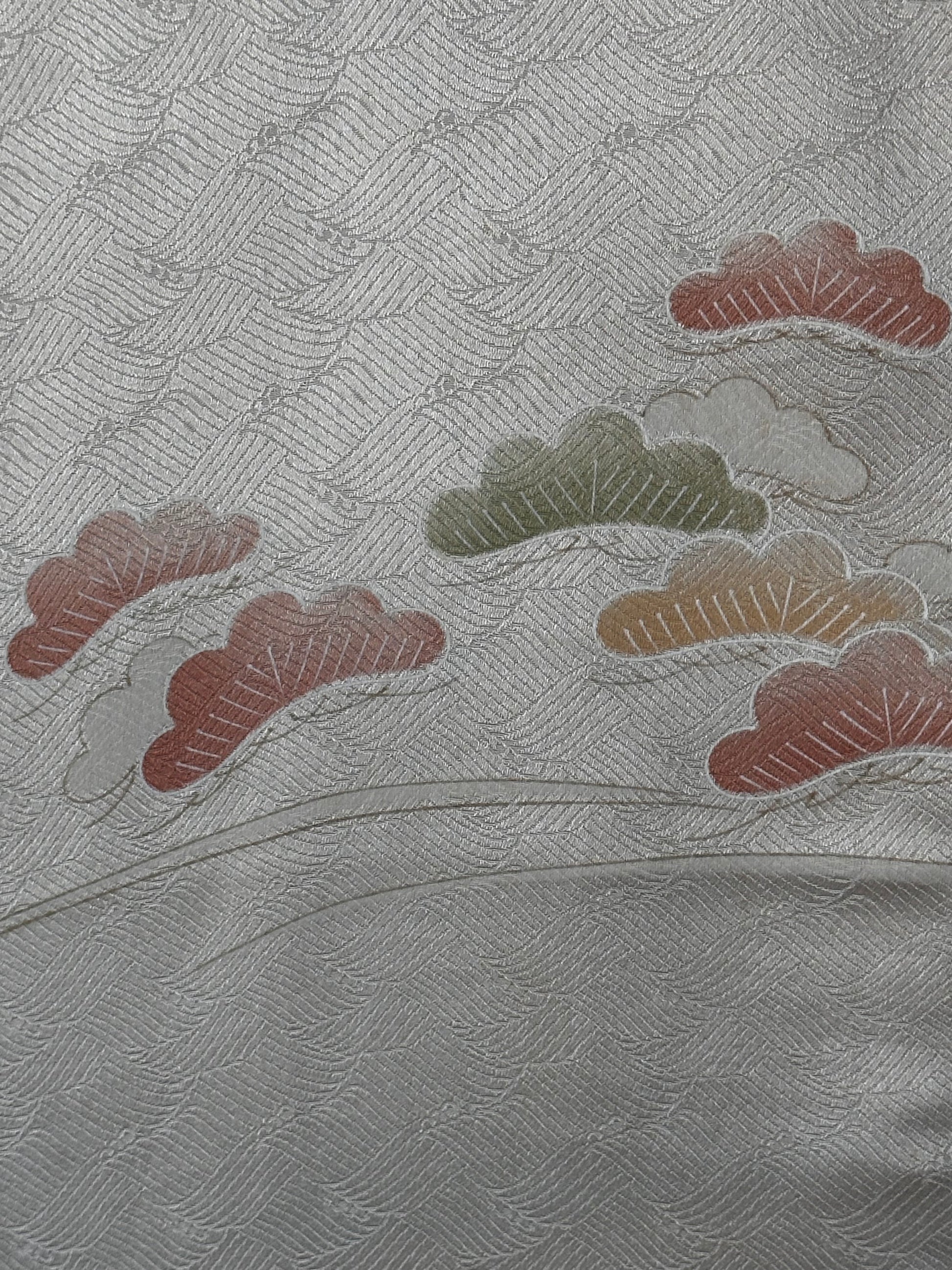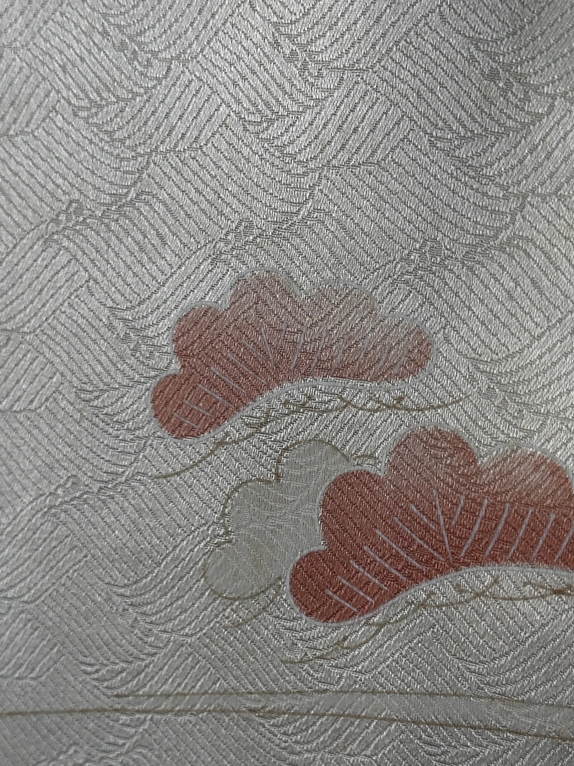 Fabric: Crafted from luxurious silk, the fabric has a smooth, refined texture that enhances the ombre shading. The inner lining is rinzu silk, woven with intricate patterns of matsu (pine trees) and fans, symbols of longevity, resilience, and celebration. This hidden detail adds an extra layer of depth and elegance to the garment.