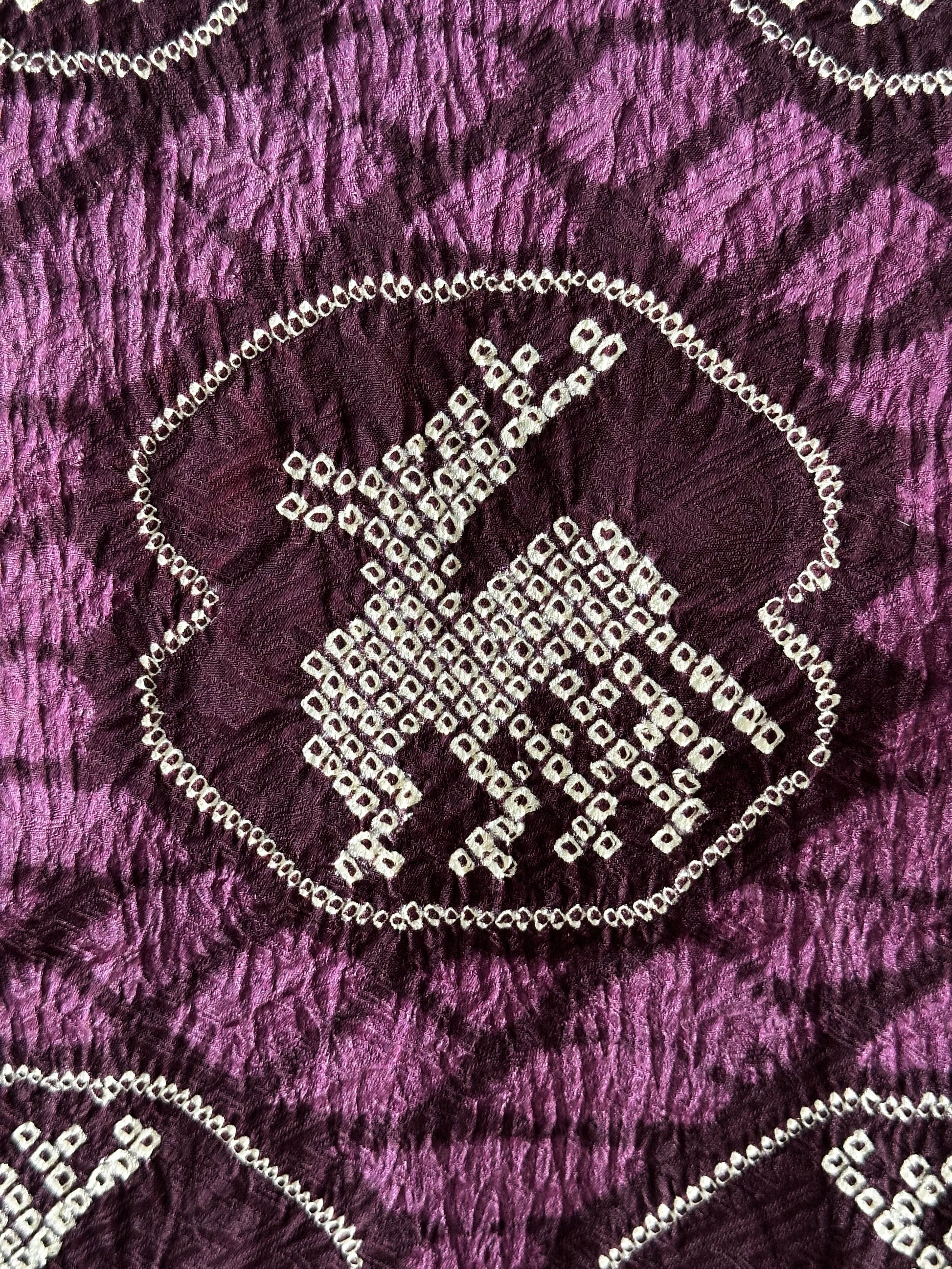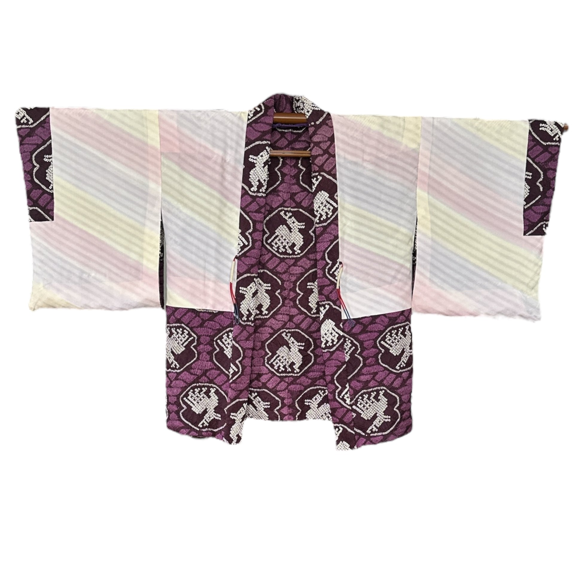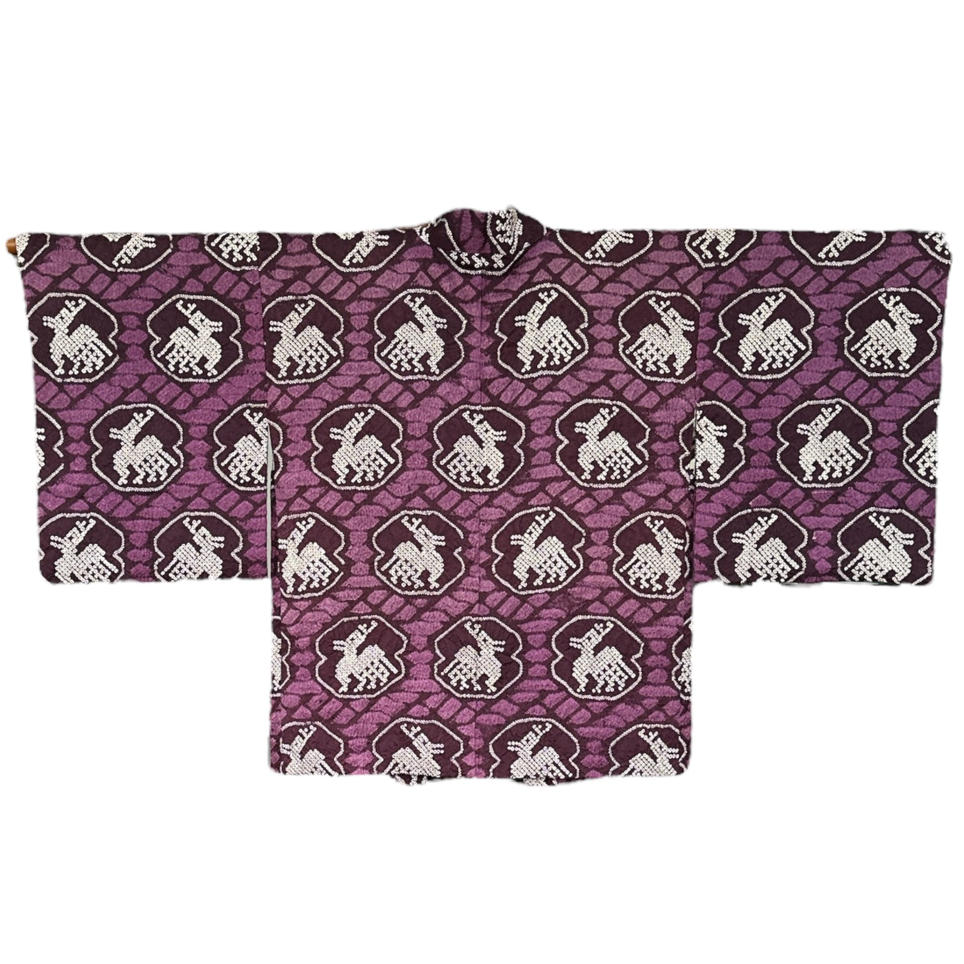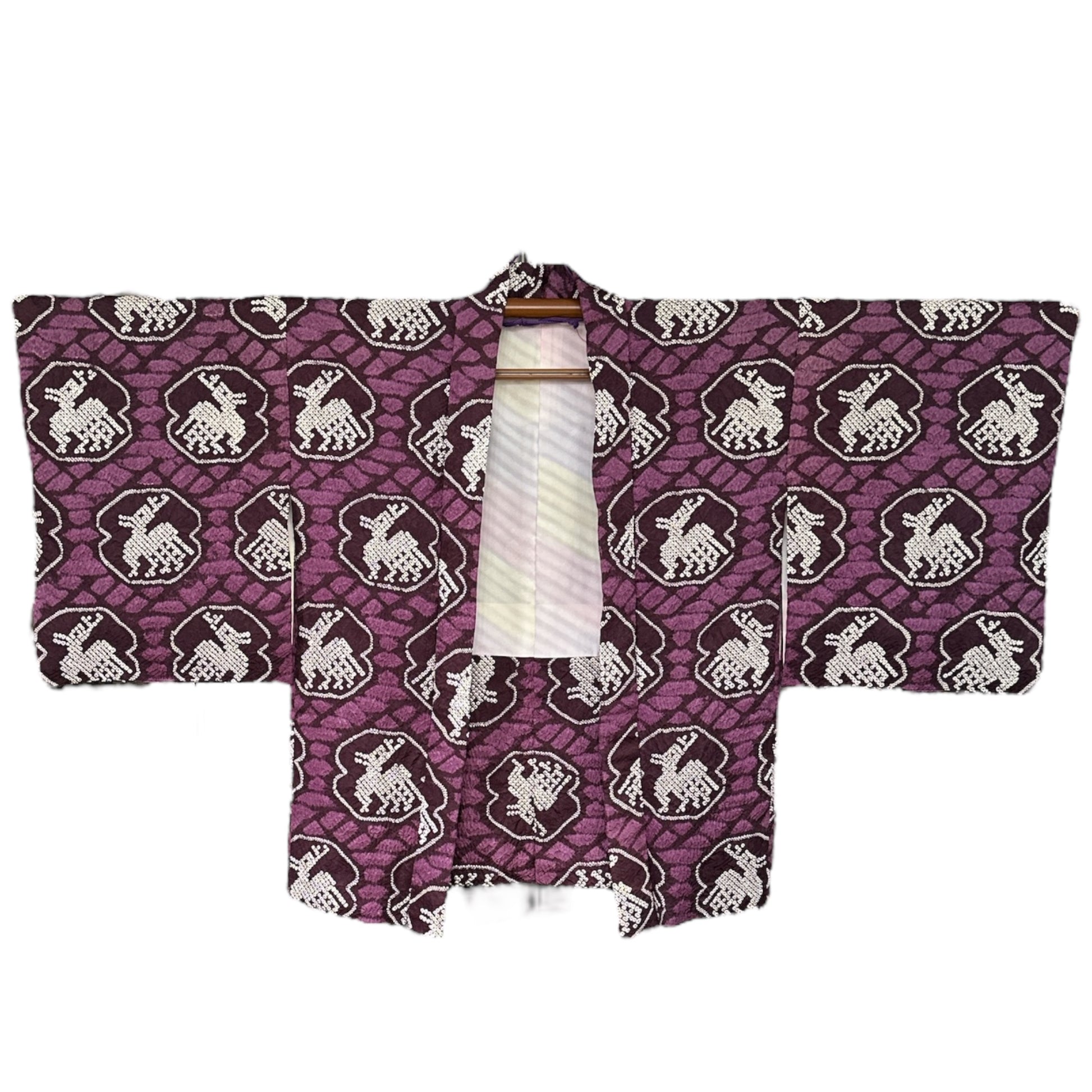 Description: This captivating vintage women’s haori is crafted from fine silk in a rich deep purplish-red (plum) hue, showcasing an intricate all-over shibori dyeing pattern. The design features a stylised mythical creature, possibly a deer or spirit-like animal, rendered in the organic softness that only traditional shibori can create.